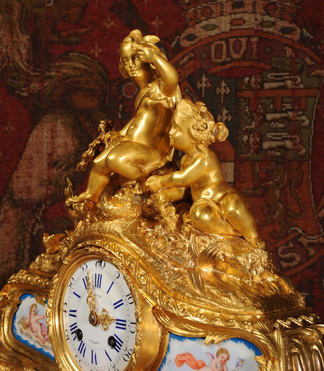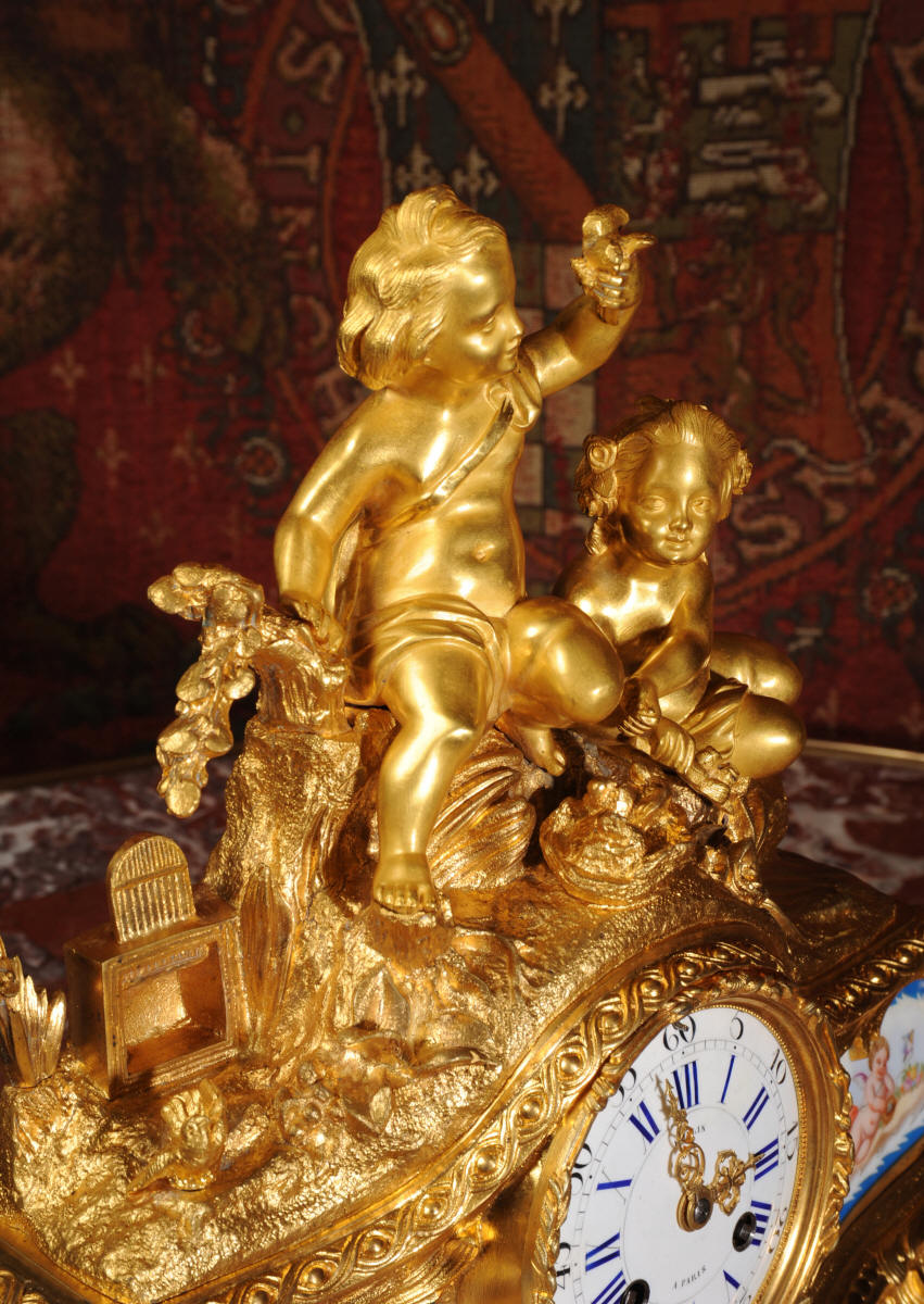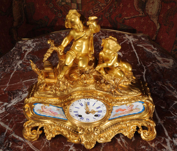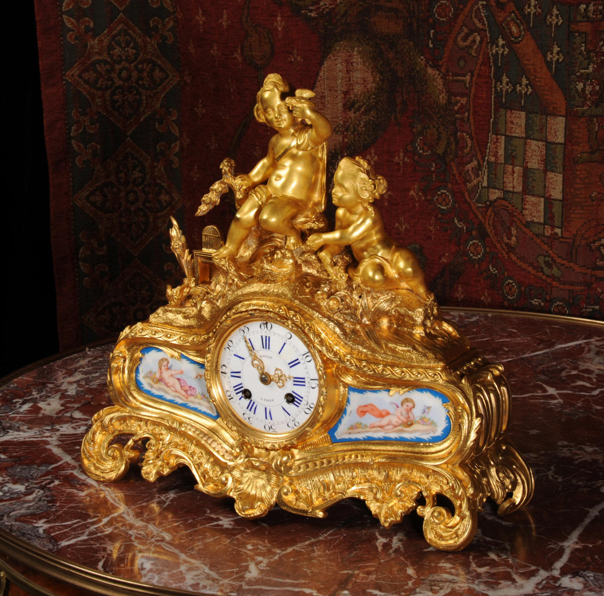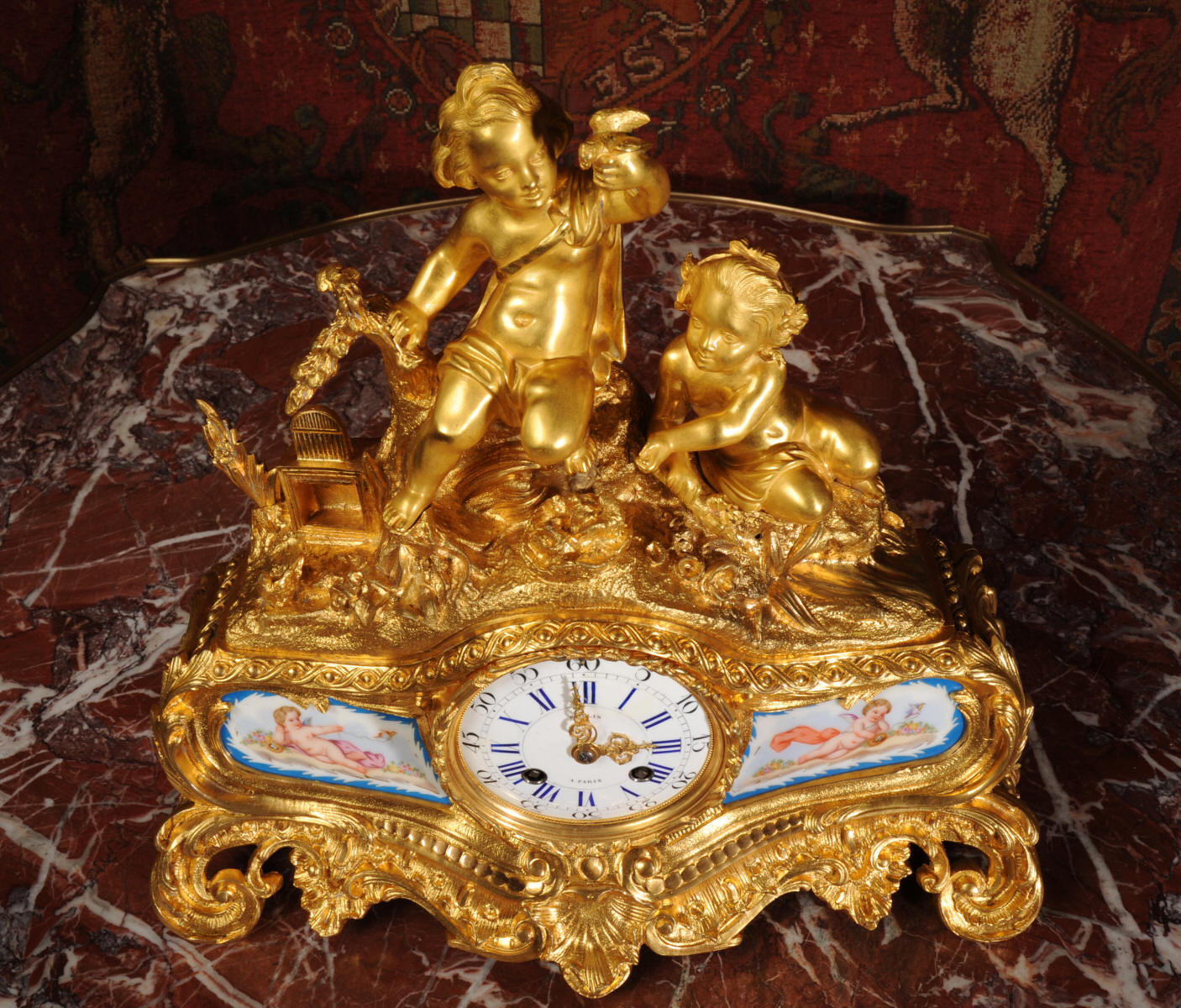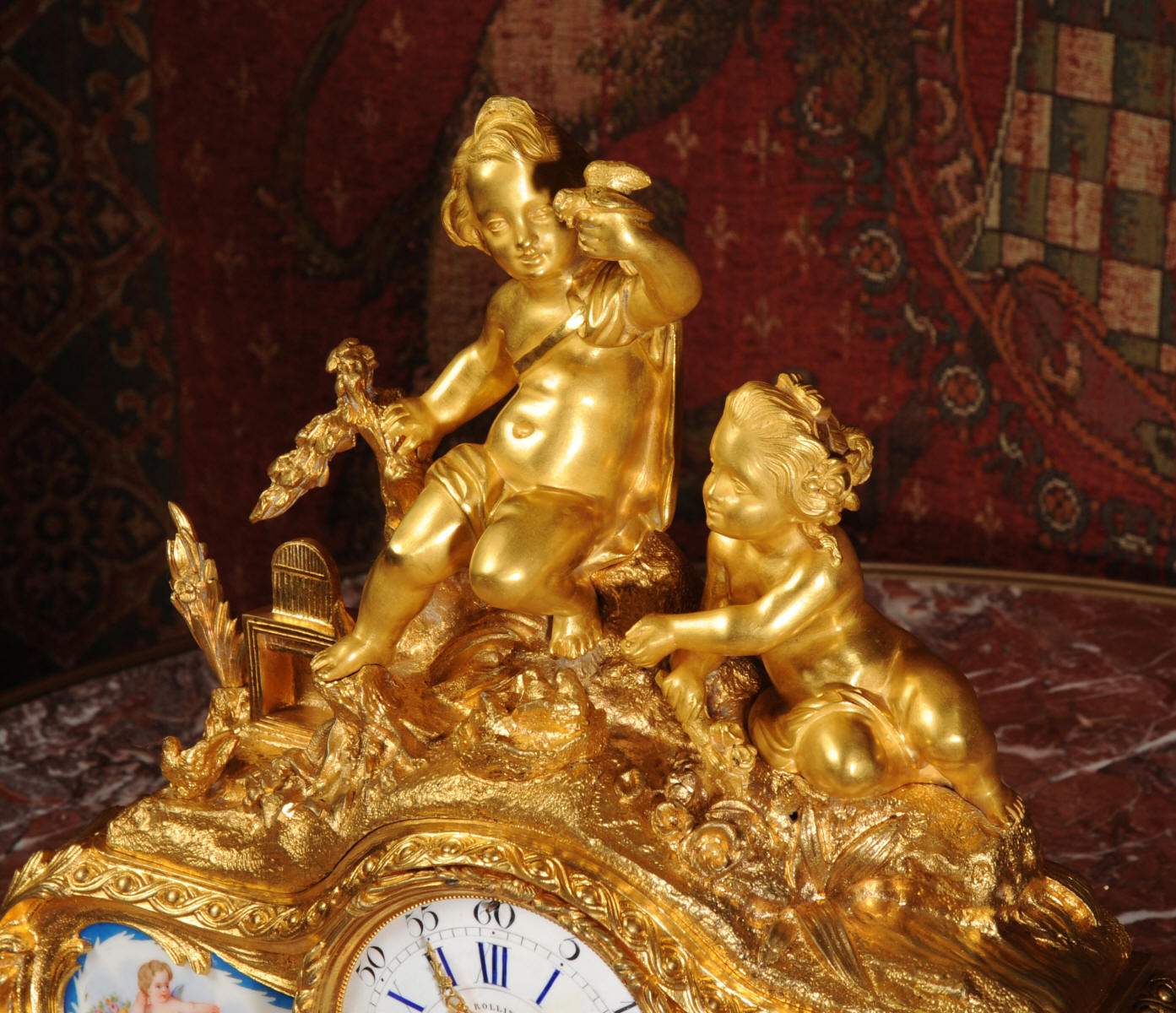 ~ French - Circa 1860 ~ ~~ Excellent condition, fully overhauled ~~ A fine and early original antique French ormolu (fire gilded bronze or bronze doré) clock by Japy Freres and retailed by Rollin of Paris. The clock depicts a charming scene of children playing with their pet birds, beautifully modelled with finely chased detail. It is mounted with exquisite Serves style porcelain panels, finely painted with scenes of children on a pompadour blue back ground. It is exquisitely detailed and of excellent quality, being gilded bronze rather then the more usual gilt spelter. The original gilding is in stunning condition with hardly any wear and has a lovely bright and clean finish.