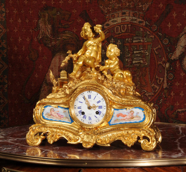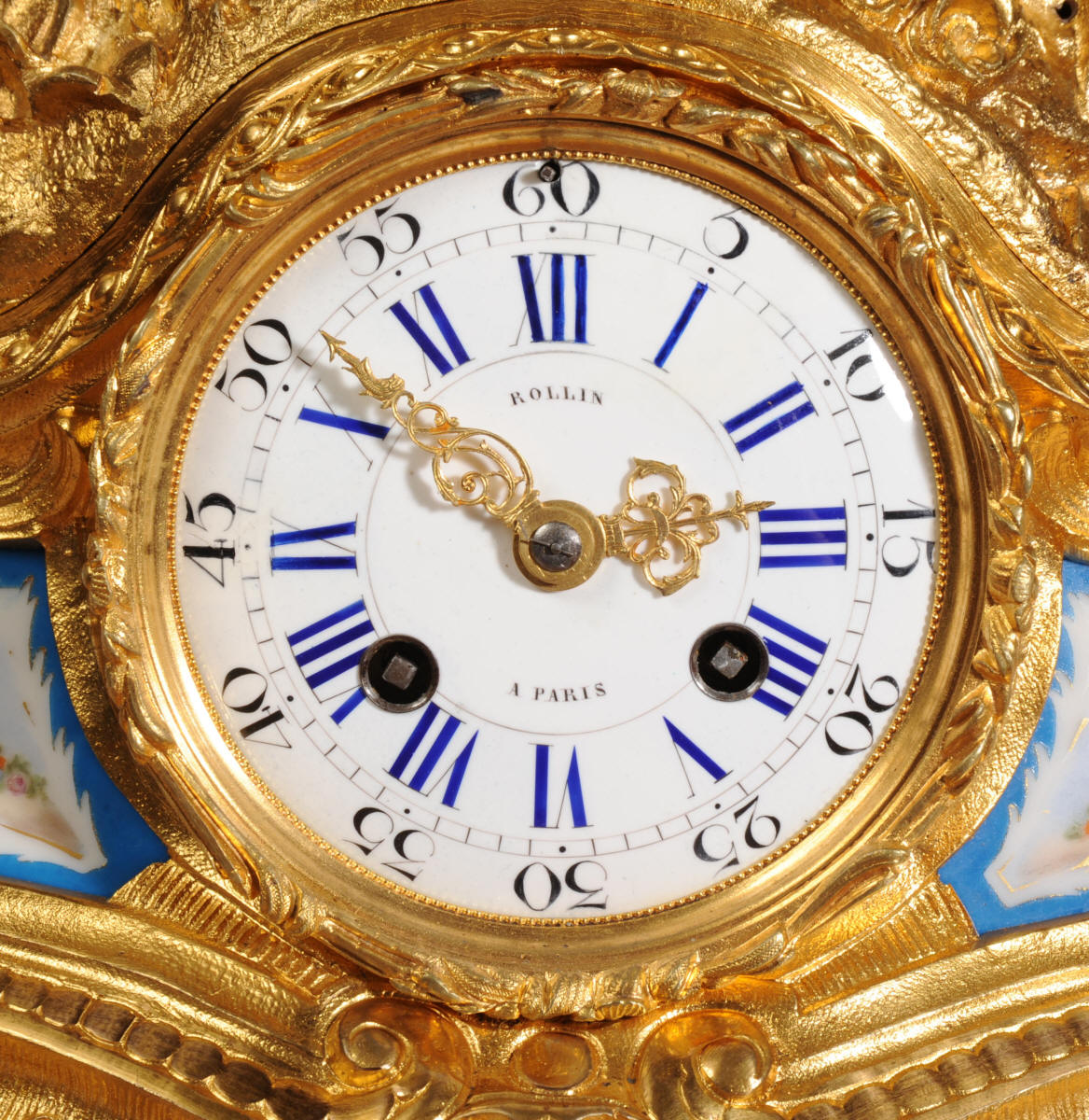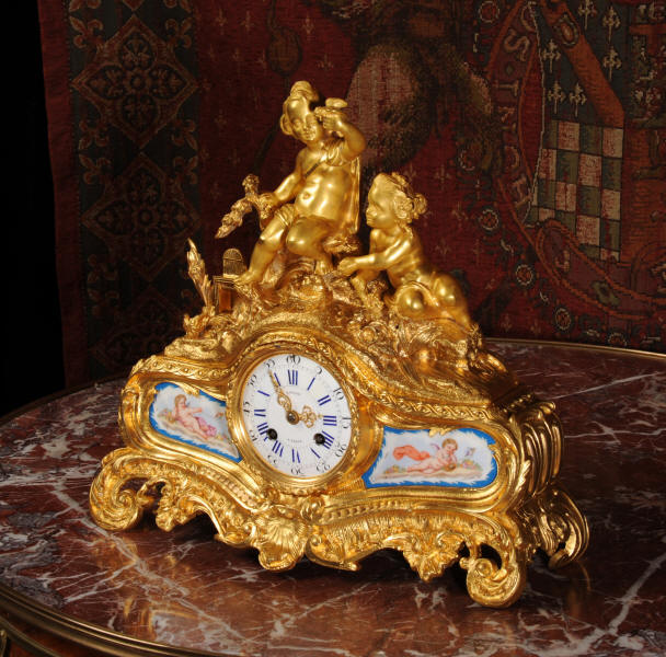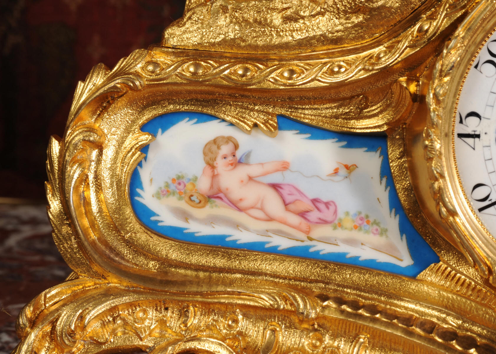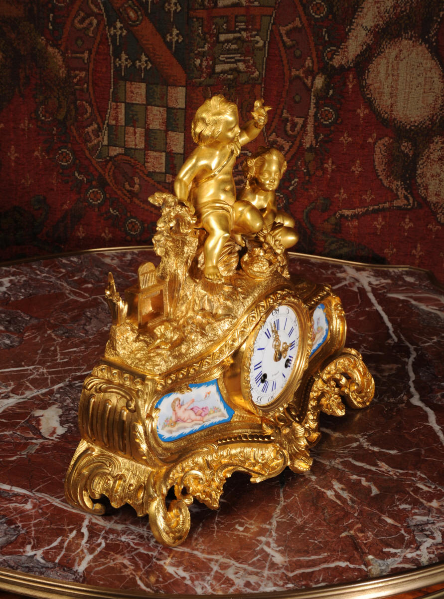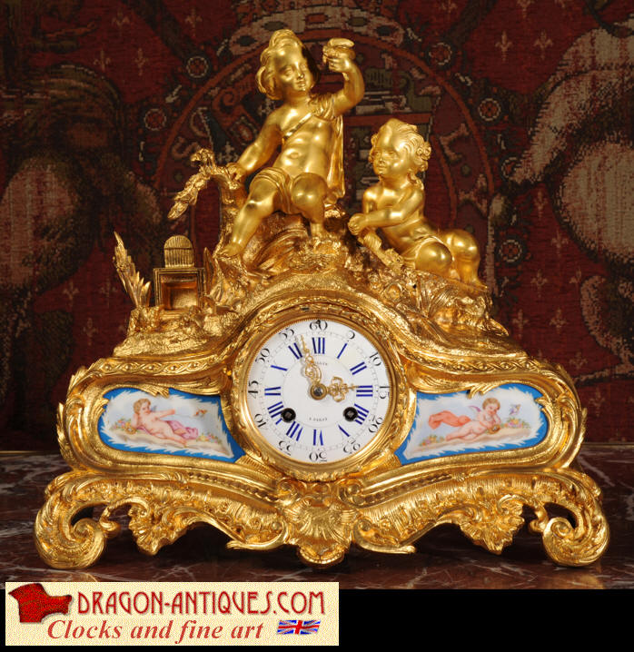 ~ French - Circa 1860 ~ ~~ Excellent condition, fully overhauled ~~ A fine and early original antique French ormolu (fire gilded bronze or bronze doré) clock by Japy Freres and retailed by Rollin of Paris. The clock depicts a charming scene of children playing with their pet birds, beautifully modelled with finely chased detail. It is mounted with exquisite Serves style porcelain panels, finely painted with scenes of children on a pompadour blue back ground. It is exquisitely detailed and of excellent quality, being gilded bronze rather then the more usual gilt spelter. The original gilding is in stunning condition with hardly any wear and has a lovely bright and clean finish.