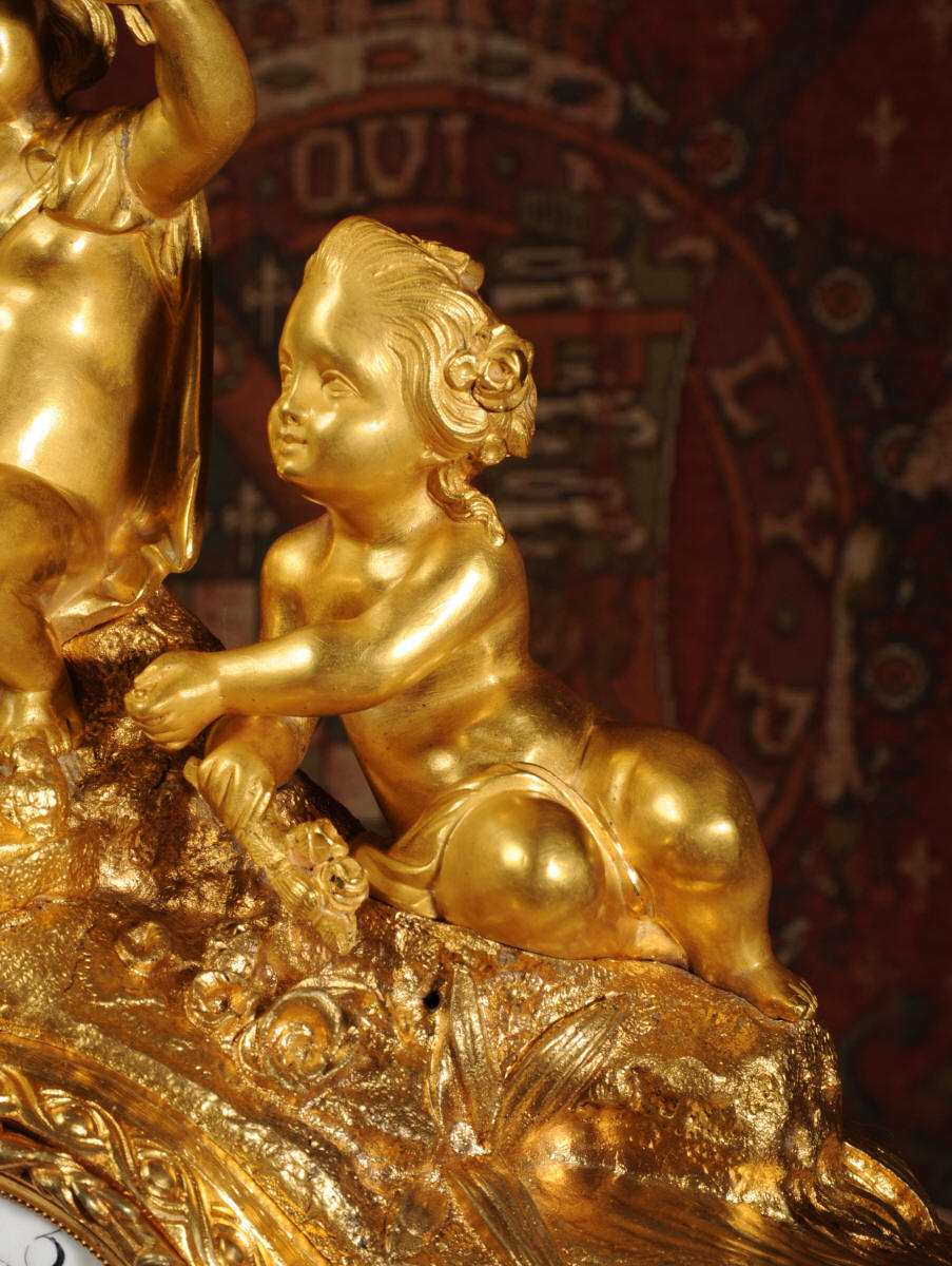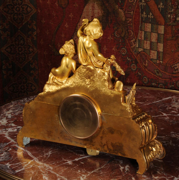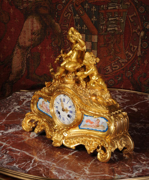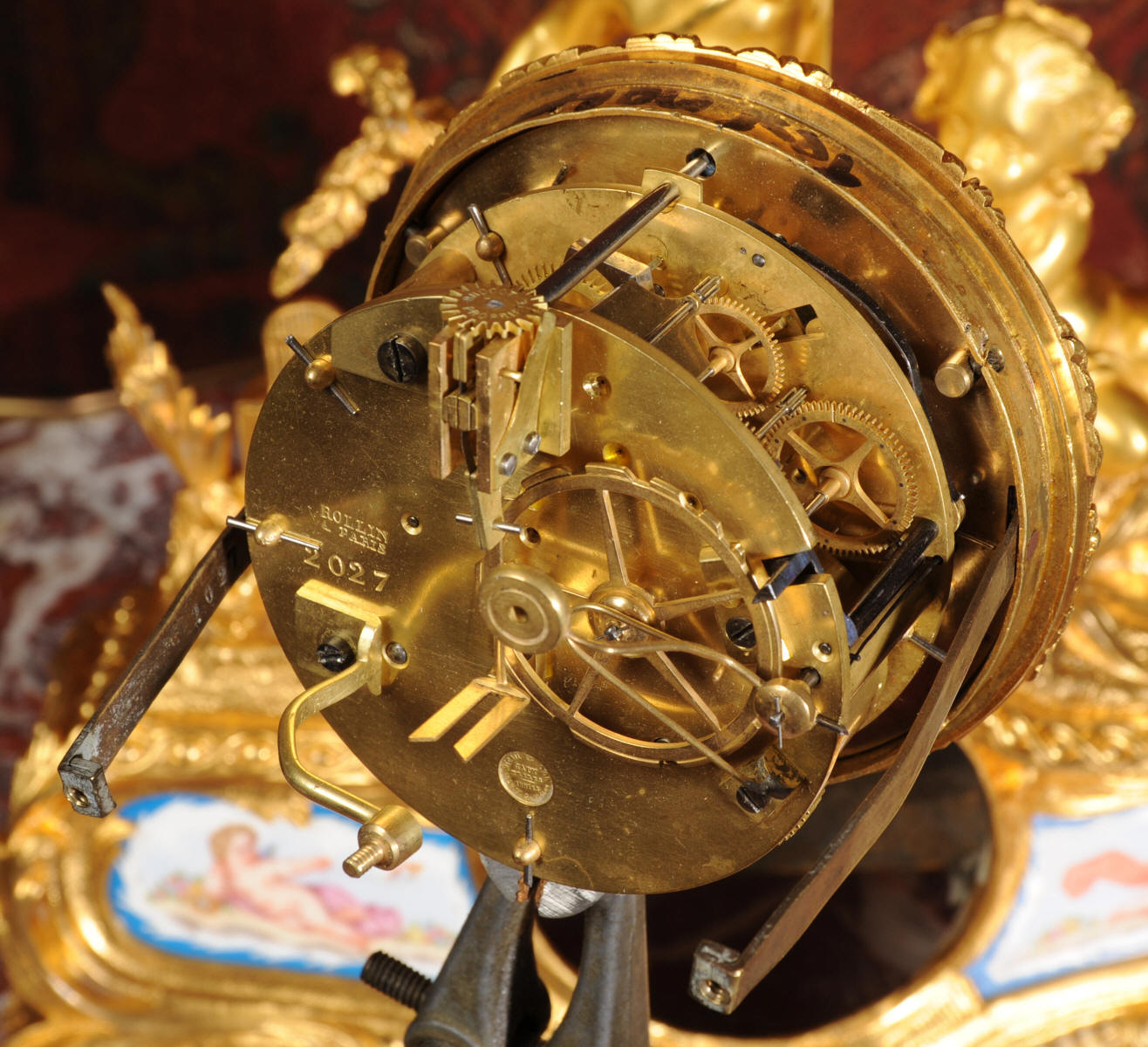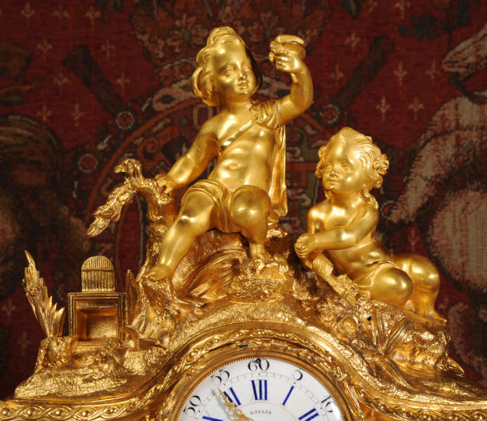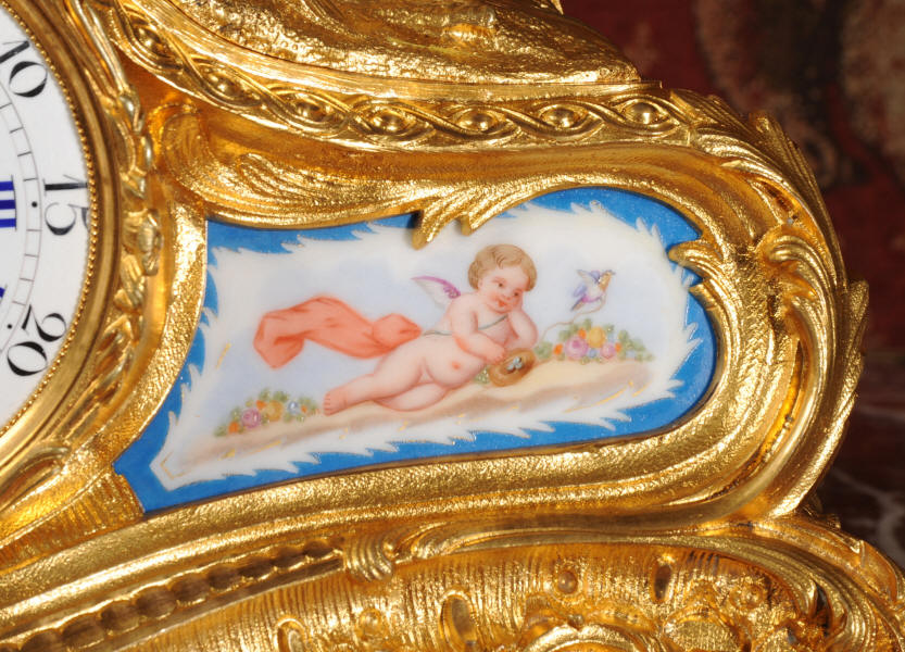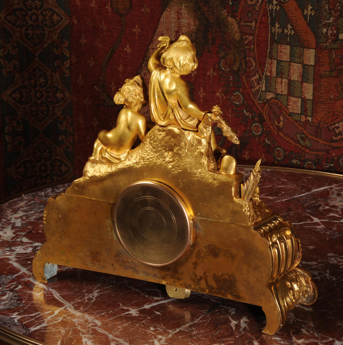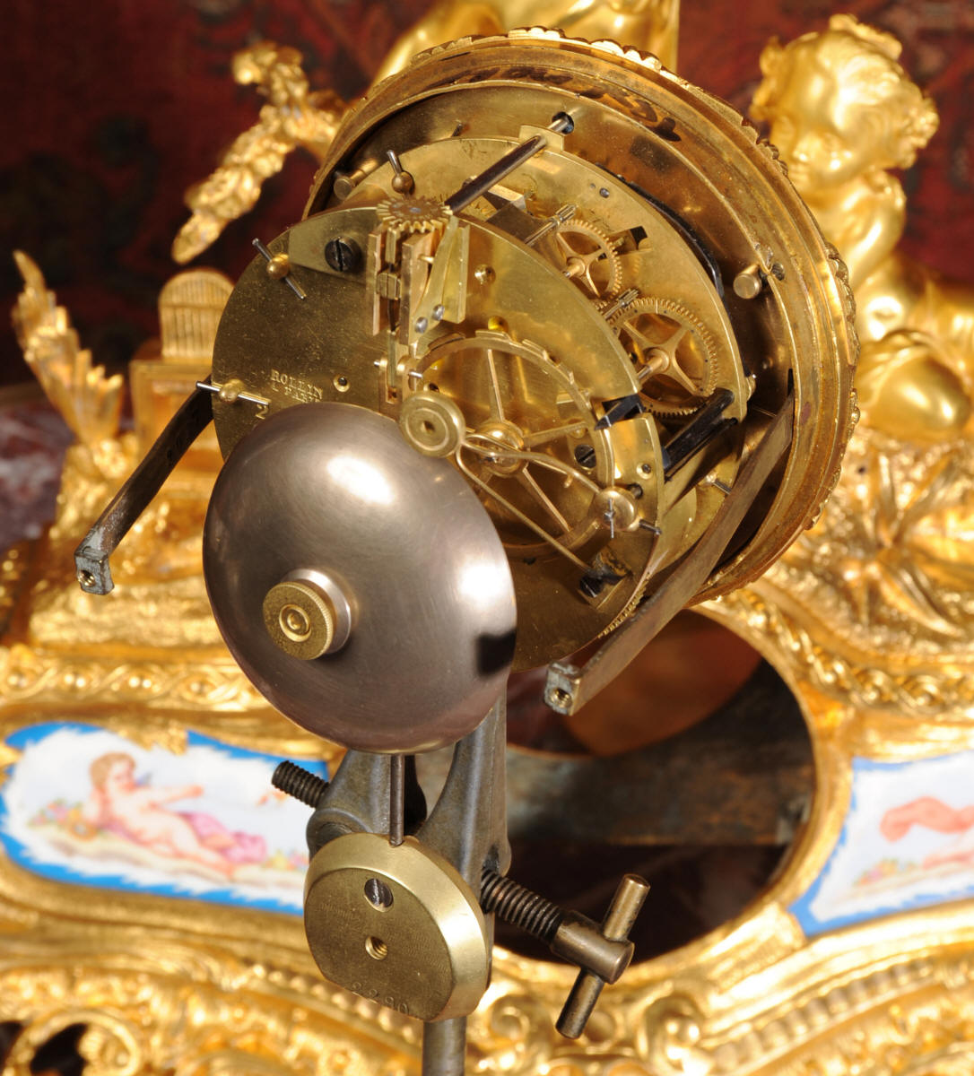 ~ French - Circa 1860 ~ ~~ Excellent condition, fully overhauled ~~ A fine and early original antique French ormolu (fire gilded bronze or bronze doré) clock by Japy Freres and retailed by Rollin of Paris. The clock depicts a charming scene of children playing with their pet birds, beautifully modelled with finely chased detail. It is mounted with exquisite Serves style porcelain panels, finely painted with scenes of children on a pompadour blue back ground. It is exquisitely detailed and of excellent quality, being gilded bronze rather then the more usual gilt spelter. The original gilding is in stunning condition with hardly any wear and has a lovely bright and clean finish.