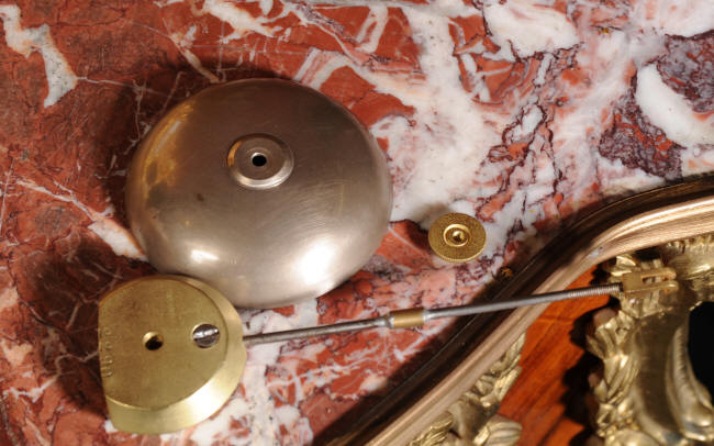 The dial is enamel on copper with a blue hour ring and a separate black minute ring. The original hands are finely fretted gilt brass and the bezel is cast as a floral swag. This type of clock does not have a glazed bezel. The French movement is of high quality and has both the early Japy Freres 'Gold medal' clockmaker's mark and also the retailer's mark of Rollin Paris on the backplate. It is the earlier version of Pendule De Paris movement with outside hammer return spring. The clock case unusually has the movement serial number stamped into it confirming the case and movement to be original to each other. It is in excellent clean and running condition having been fully overhauled by our clockmaker. Pendulum is an old replacement. It runs for 8 days and strikes the hours and halves on a bell. Click the video clip below to hear the bell and watch the clock running! Condition of the case is stunning, the original gilding is beautifully clean and bright with hardly any wear or discolouration and there are no losses. We have gently removed years of grime to reveal the original gilding beneath. The dial is also in excellent condition there is some slight restoration that is only visible on very close inspection. A stunning, original, early ormolu clock to add to your collection!