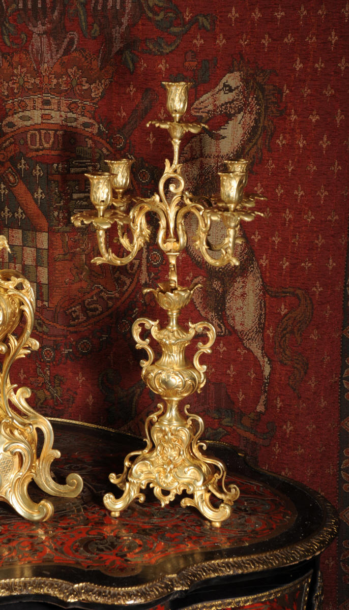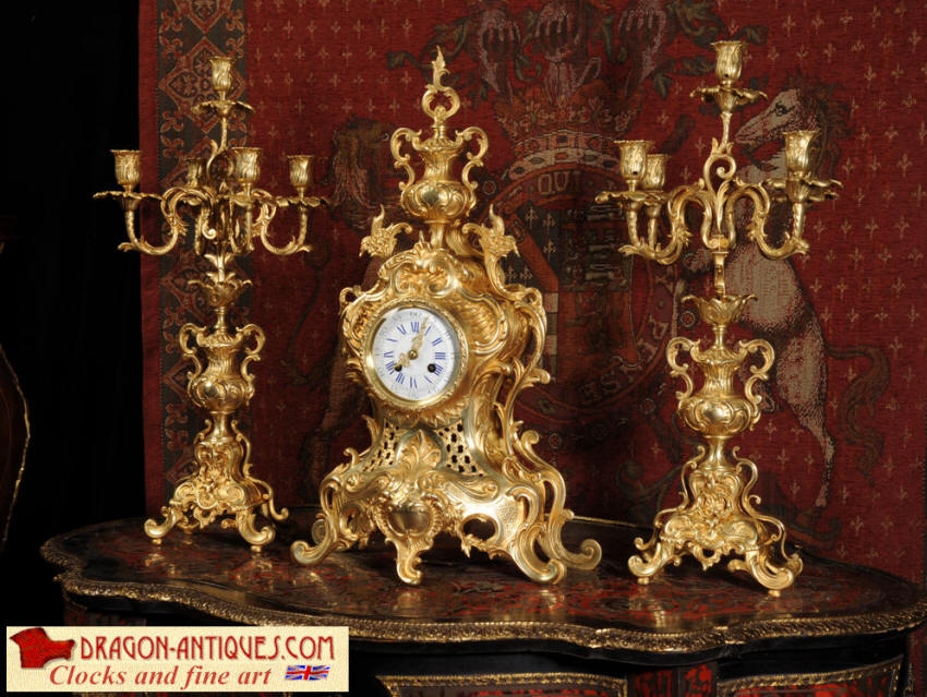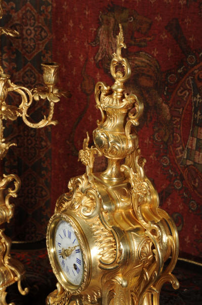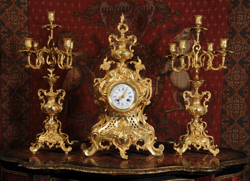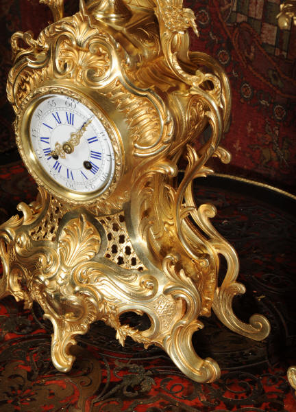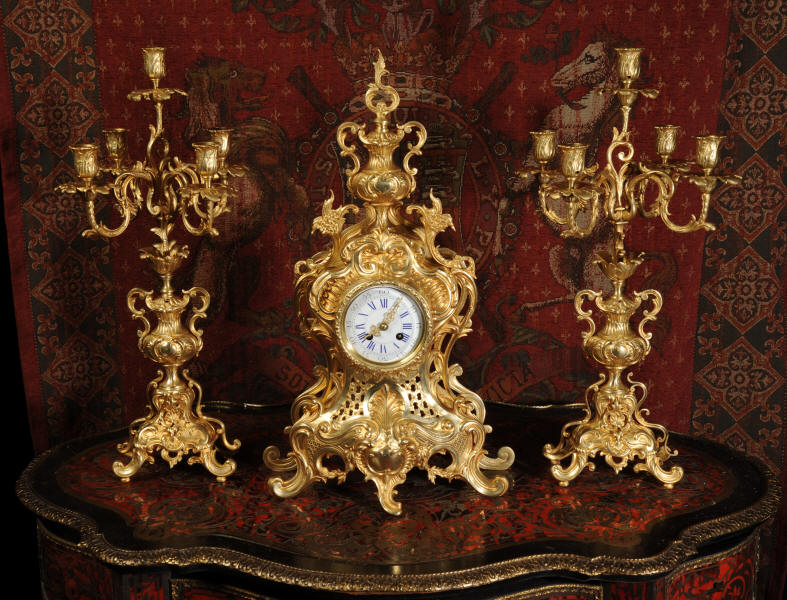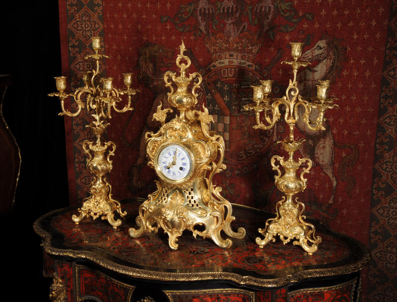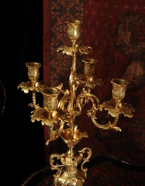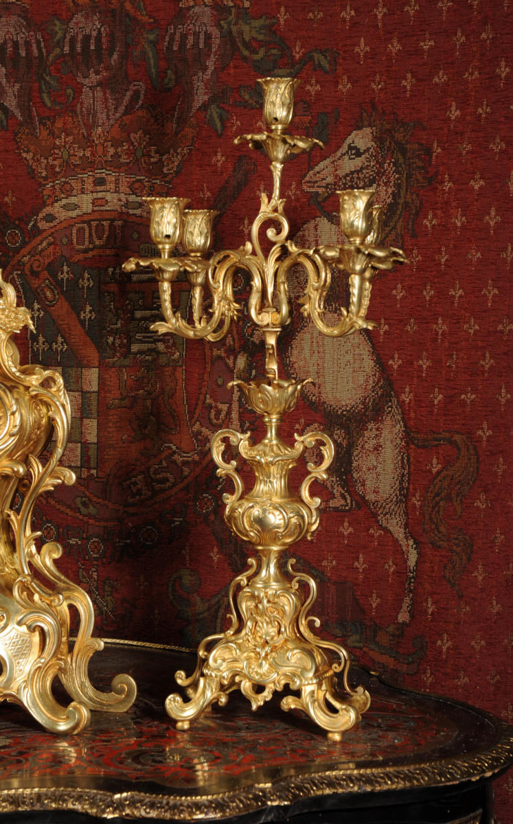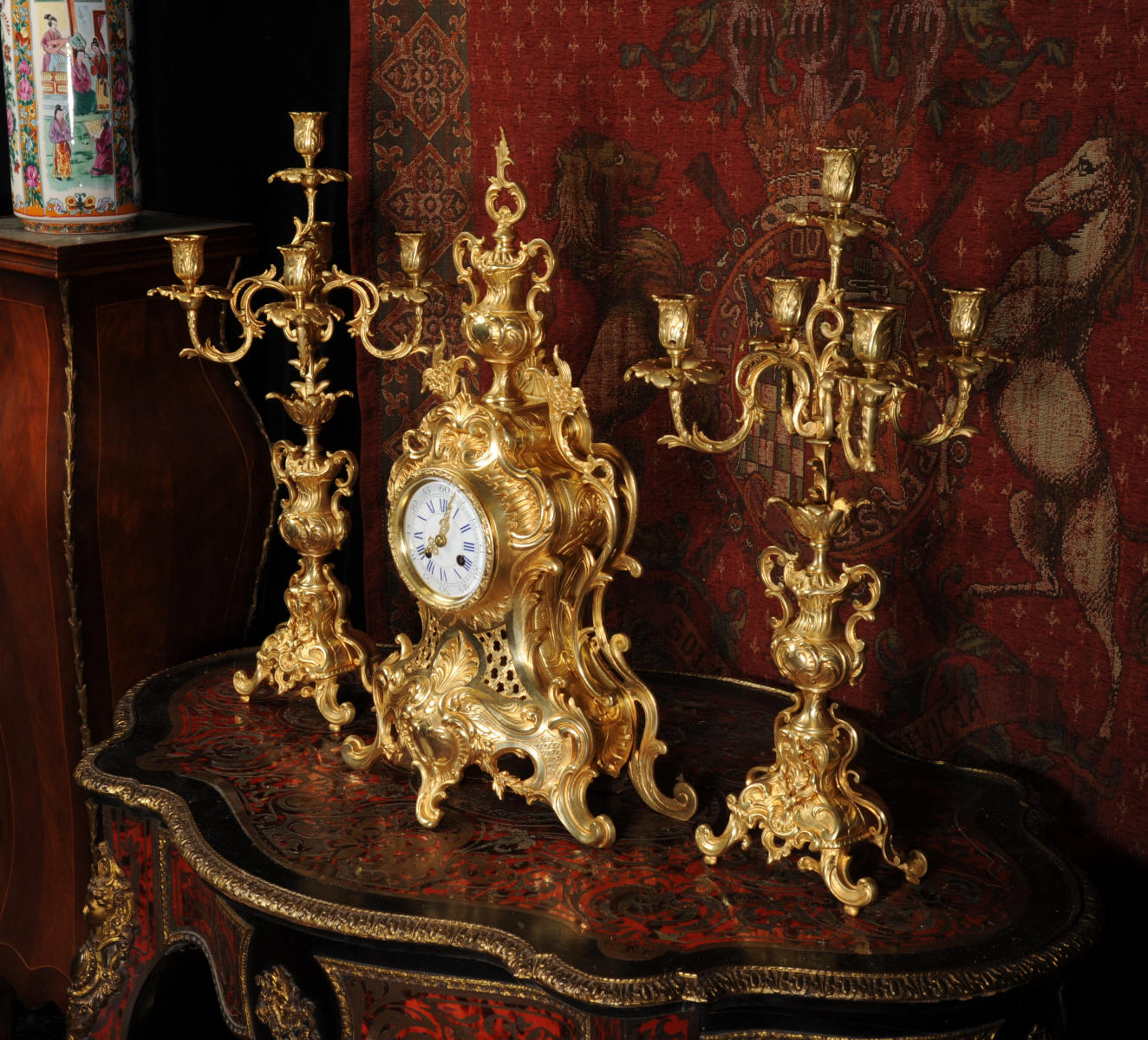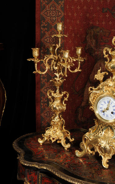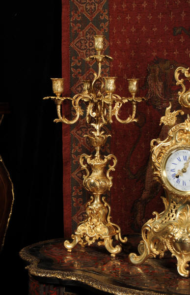 The beautiful dial is enamel on copper with blue lettering and a separate outside minute ring. It has a Rococo bezel and finely fretted gilt brass hands. The rear door is also glazed to allow the movement to be seen. The French movement is by Louis Japy and is of high quality and has the superior Brocot designed pin-pallet escapement. It is in excellent clean and running condition having been fully overhauled by our clockmaker. Pendulum is a replacement. It runs for 8 days and strikes the hours and halves on a bell. Click the video clip below to hear the bell and watch the clock running! Condition of the case is excellent, the original gilding is beautifully clean and bright with hardly any wear or discolouration. The dial is also in excellent condition just some tiny nibbles to the next to the winding hole. Candelabra are slightly distorted and there are some holes where the set has been wired for electric candles at some point. One scroll on the base of one candelabra has been replaced in the past, see the picture below. The set makes a stunning display as you can see below.