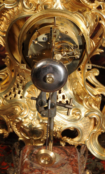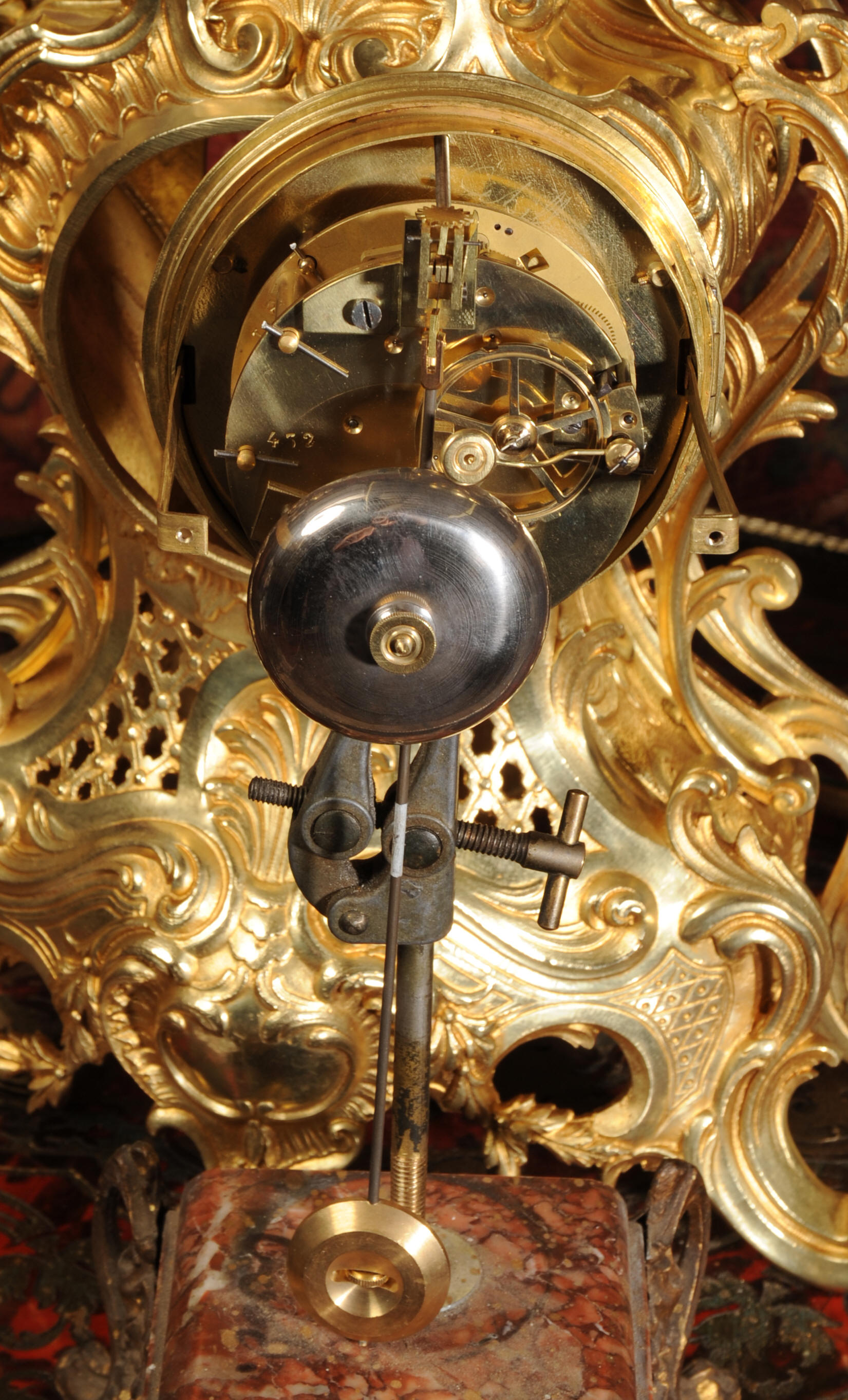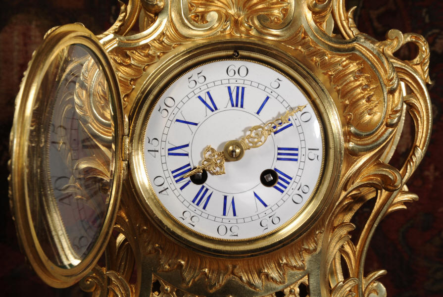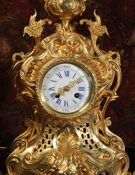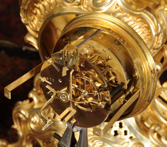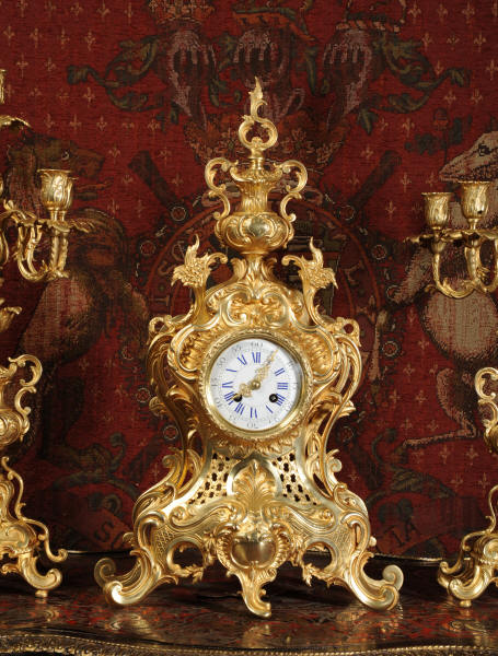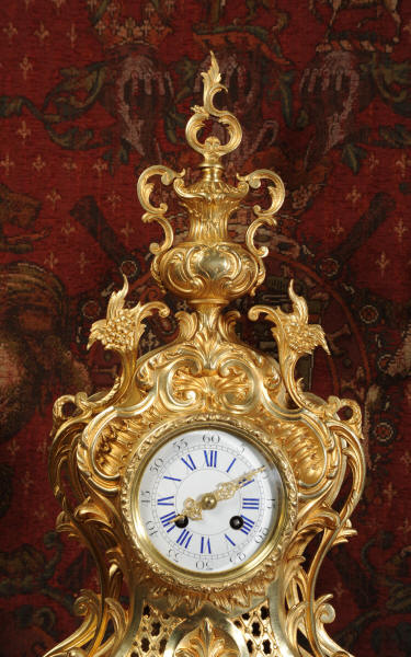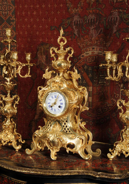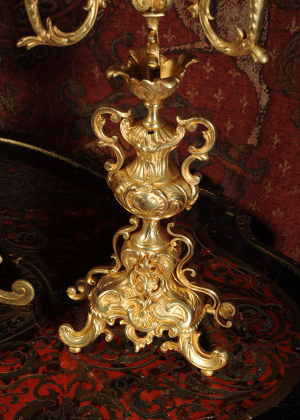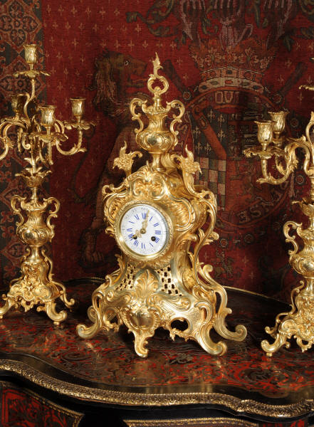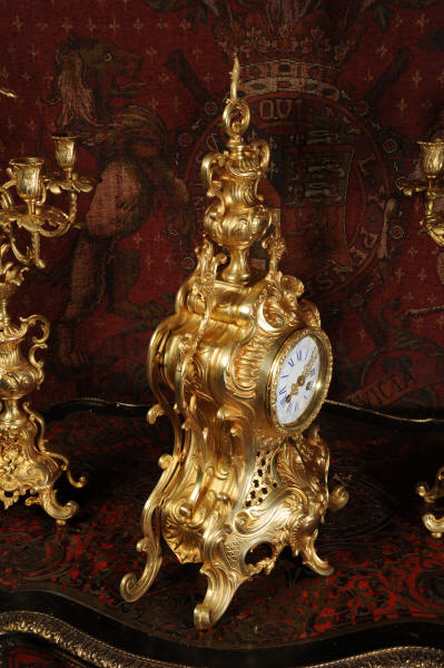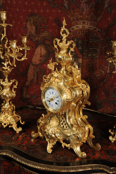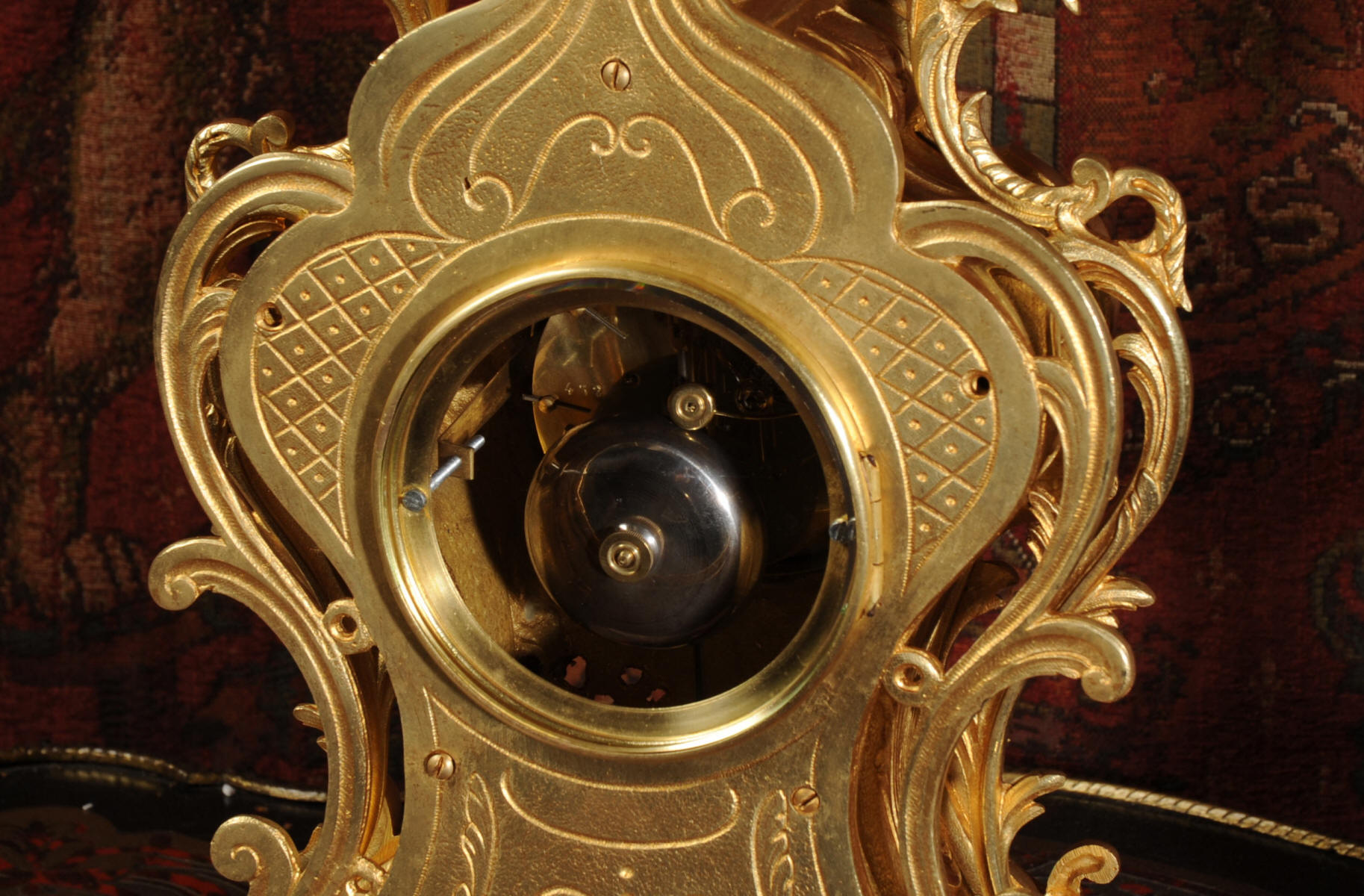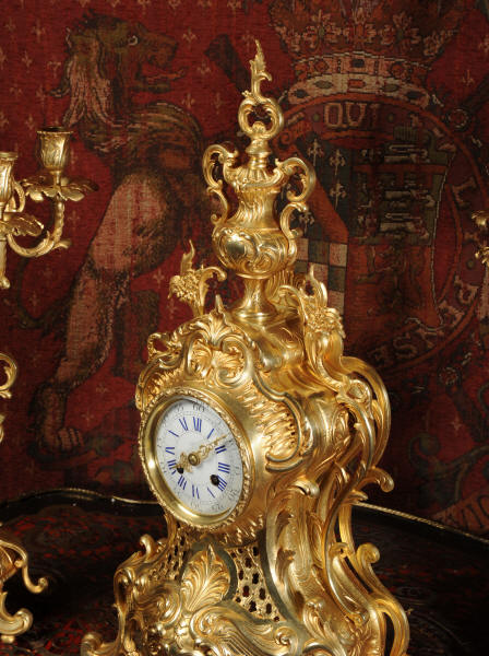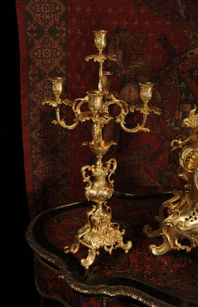 The beautiful dial is enamel on copper with blue lettering and a separate outside minute ring. It has a Rococo bezel and finely fretted gilt brass hands. The rear door is also glazed to allow the movement to be seen. The French movement is by Louis Japy and is of high quality and has the superior Brocot designed pin-pallet escapement. It is in excellent clean and running condition having been fully overhauled by our clockmaker. Pendulum is a replacement. It runs for 8 days and strikes the hours and halves on a bell. Click the video clip below to hear the bell and watch the clock running! Condition of the case is excellent, the original gilding is beautifully clean and bright with hardly any wear or discolouration. The dial is also in excellent condition just some tiny nibbles to the next to the winding hole. Candelabra are slightly distorted and there are some holes where the set has been wired for electric candles at some point. One scroll on the base of one candelabra has been replaced in the past, see the picture below. The set makes a stunning display as you can see below.