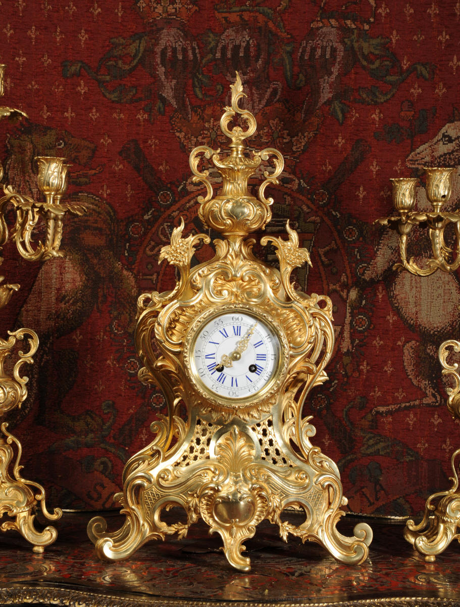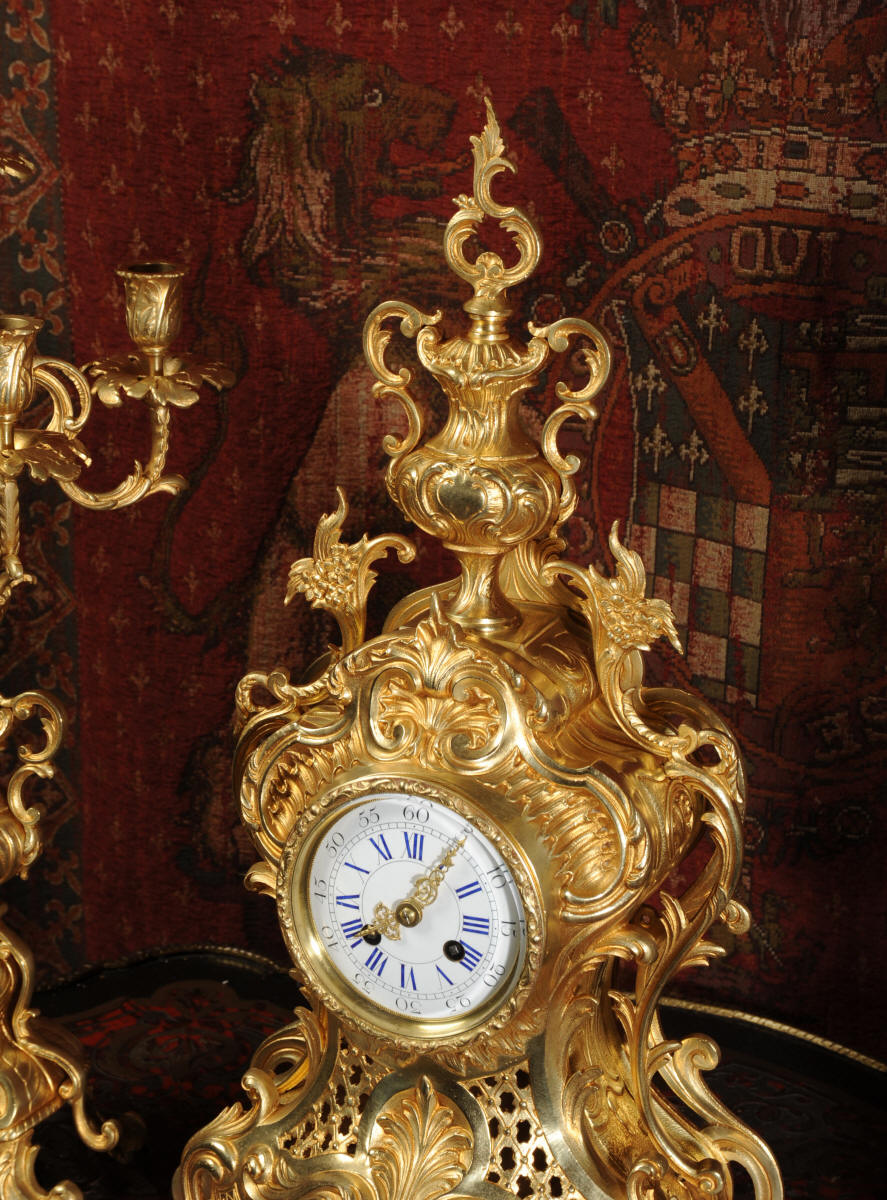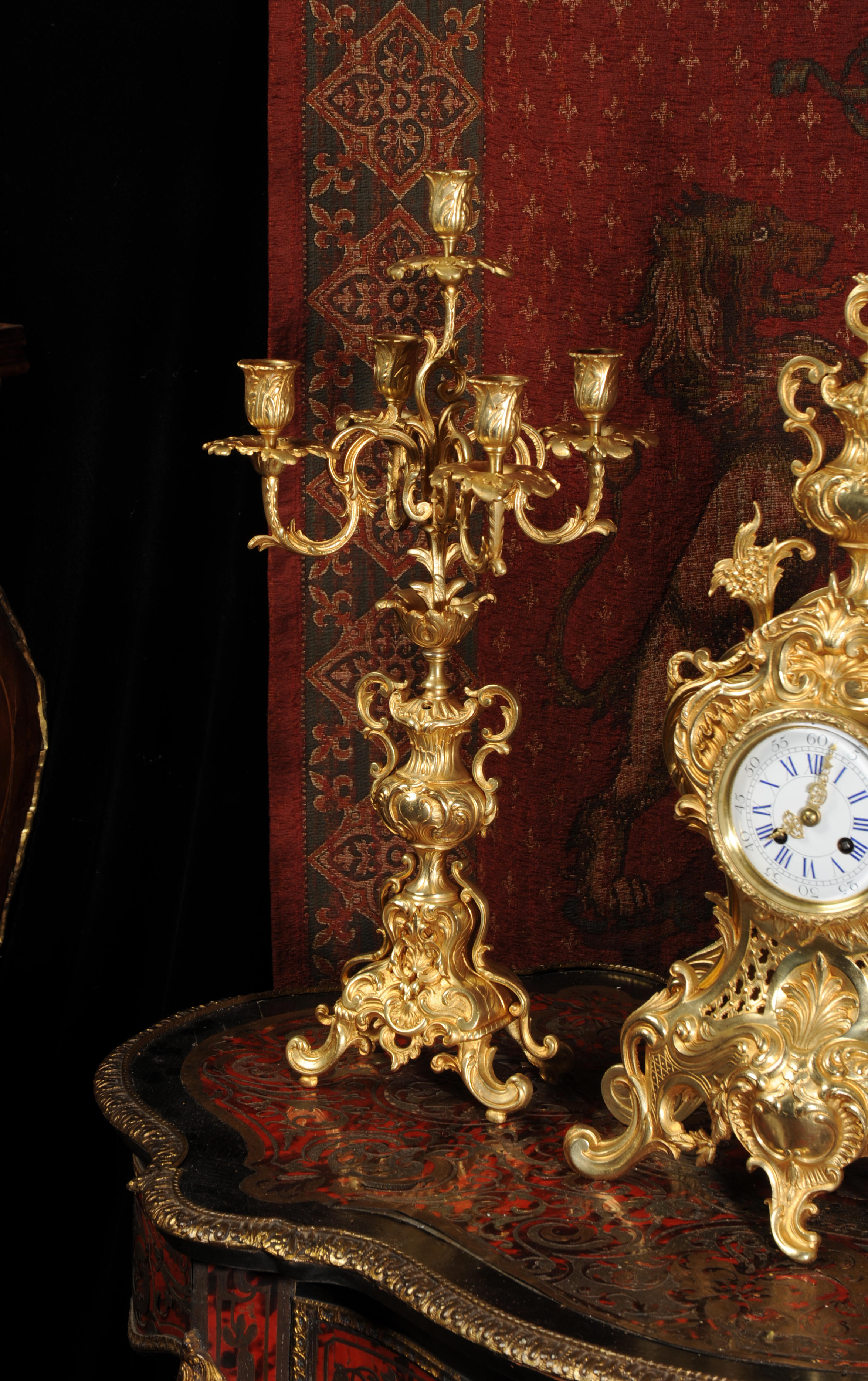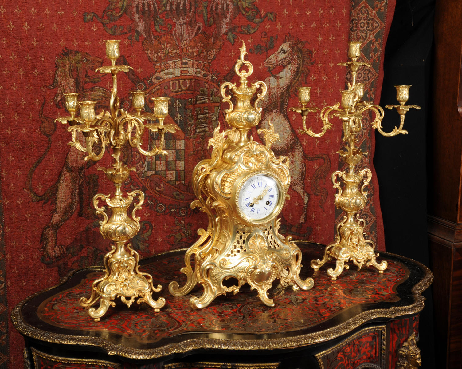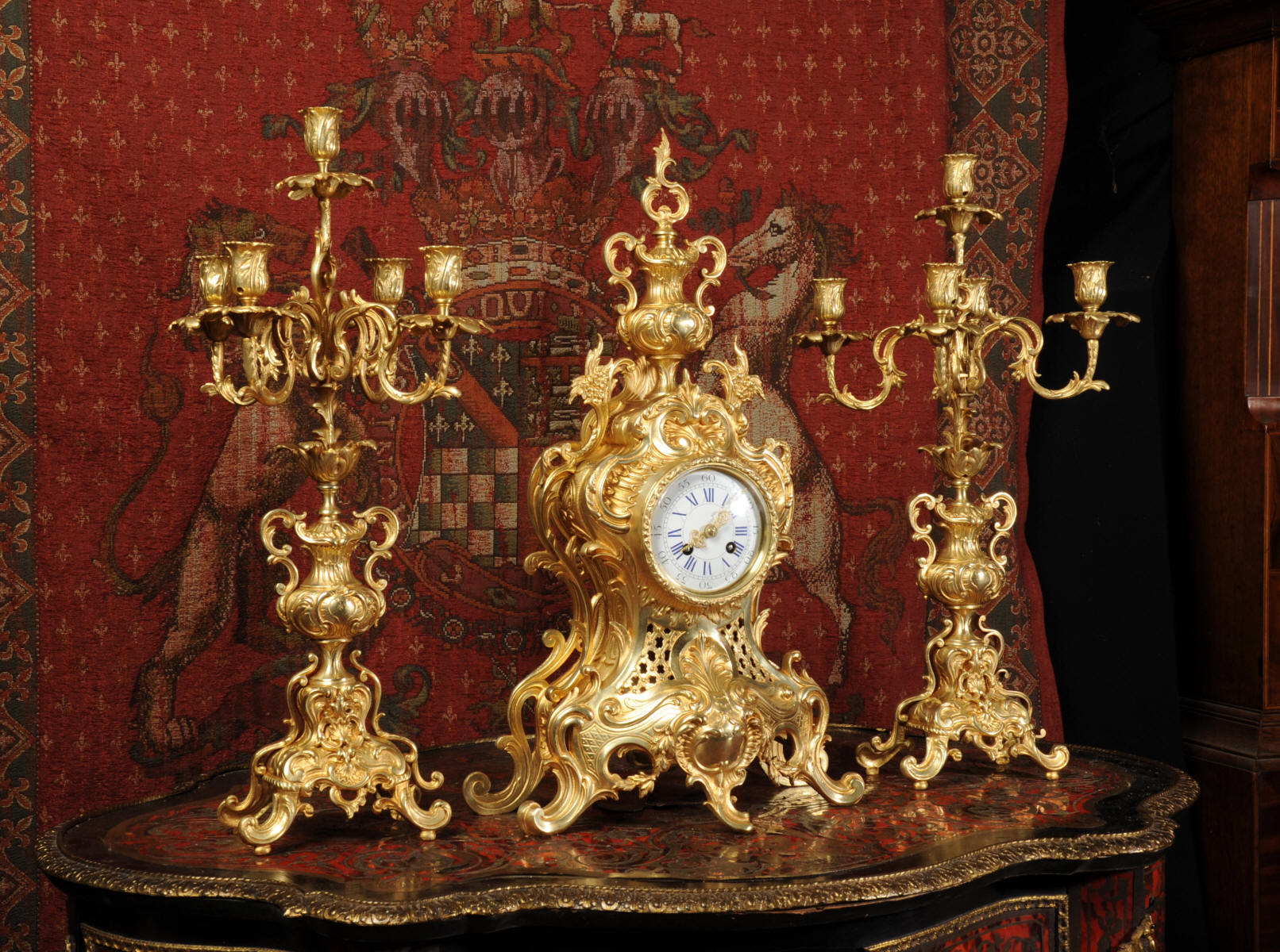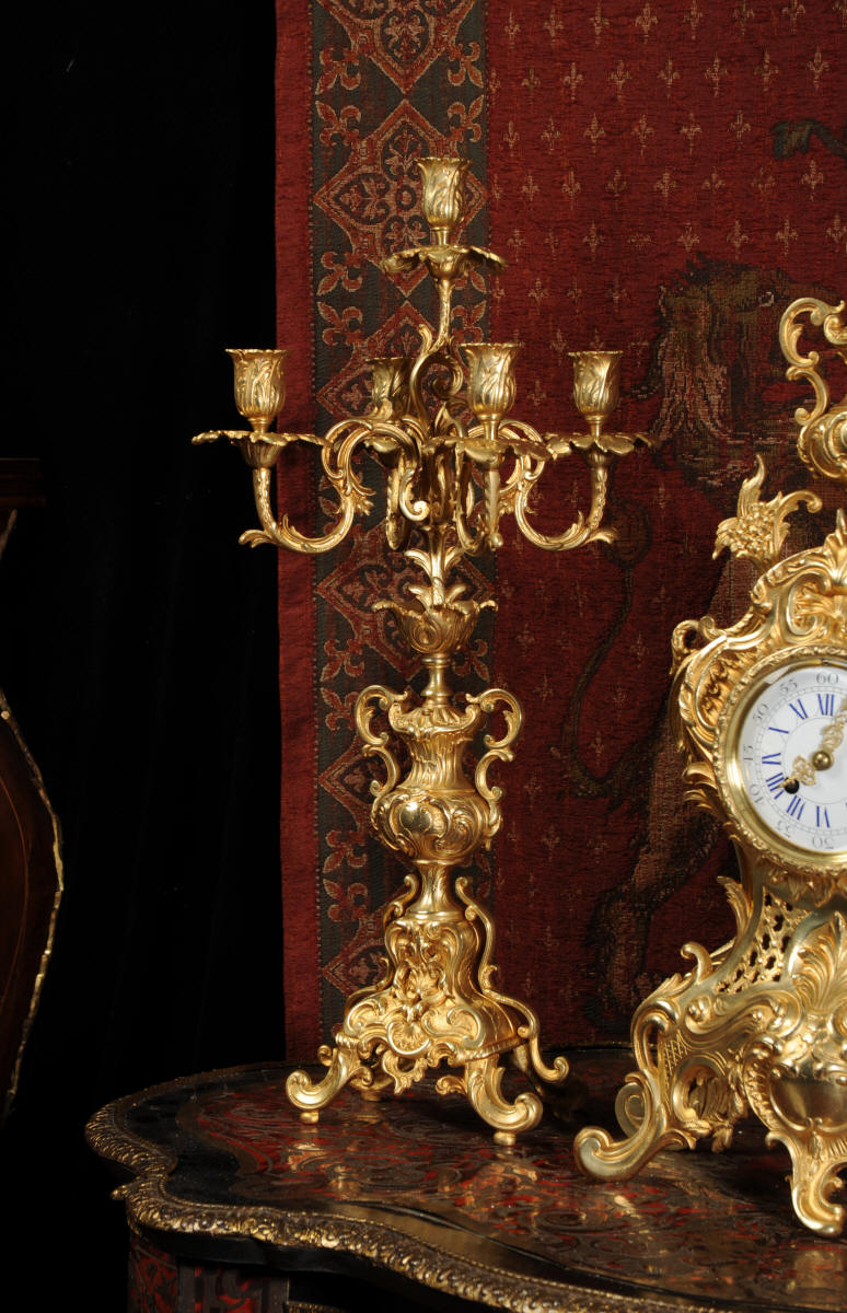 ~ French - Circa 1880 ~ ~~ Excellent condition, fully overhauled ~~ A stunning, tall and majestic original antique French Rococo clock and candelabra set. Beautiful Louis XV waisted shape with "C" scrolls, shells and floral swags. The front of the clock is fretted to lighten the design and also to allow the pendulum to be glimpsed swinging within the case. Candelabra have four branches modelled as entwining foliage, standing above urns with scroll handles. The set is of very good quality with crisp, sharp and finely detailed modelling and the gilding has a lovely clean and bright finish.