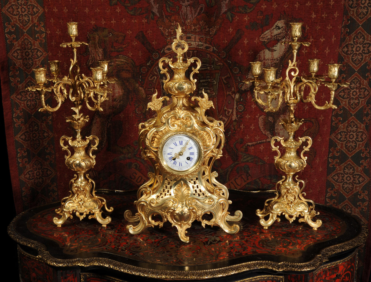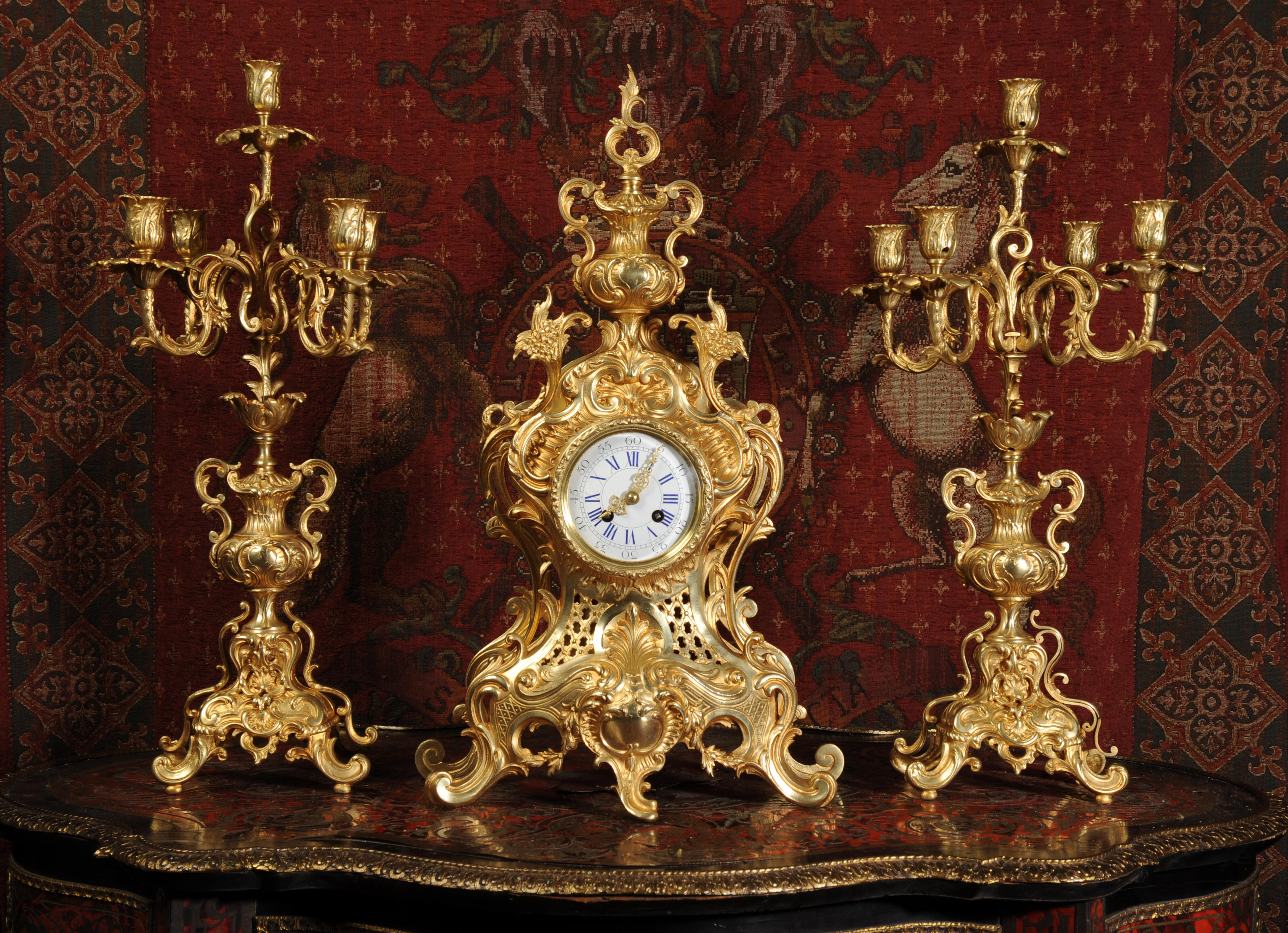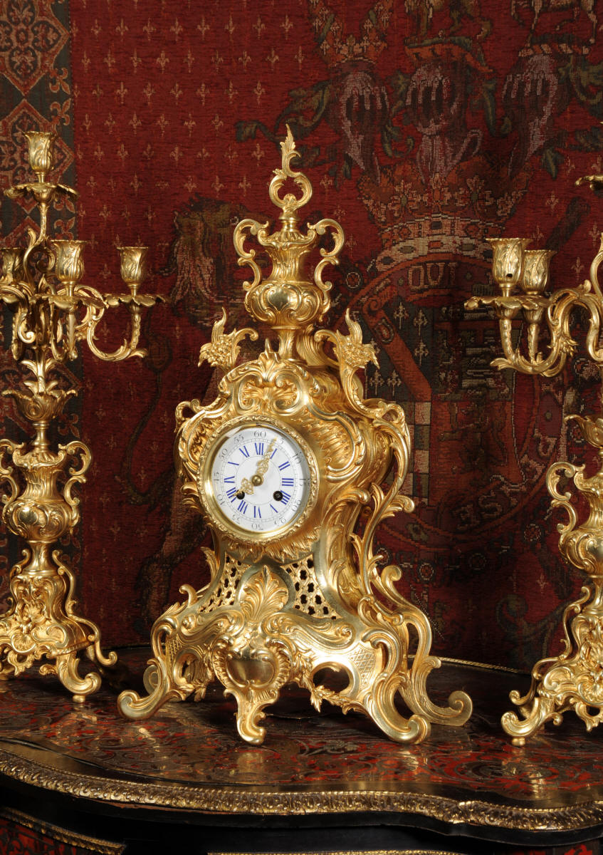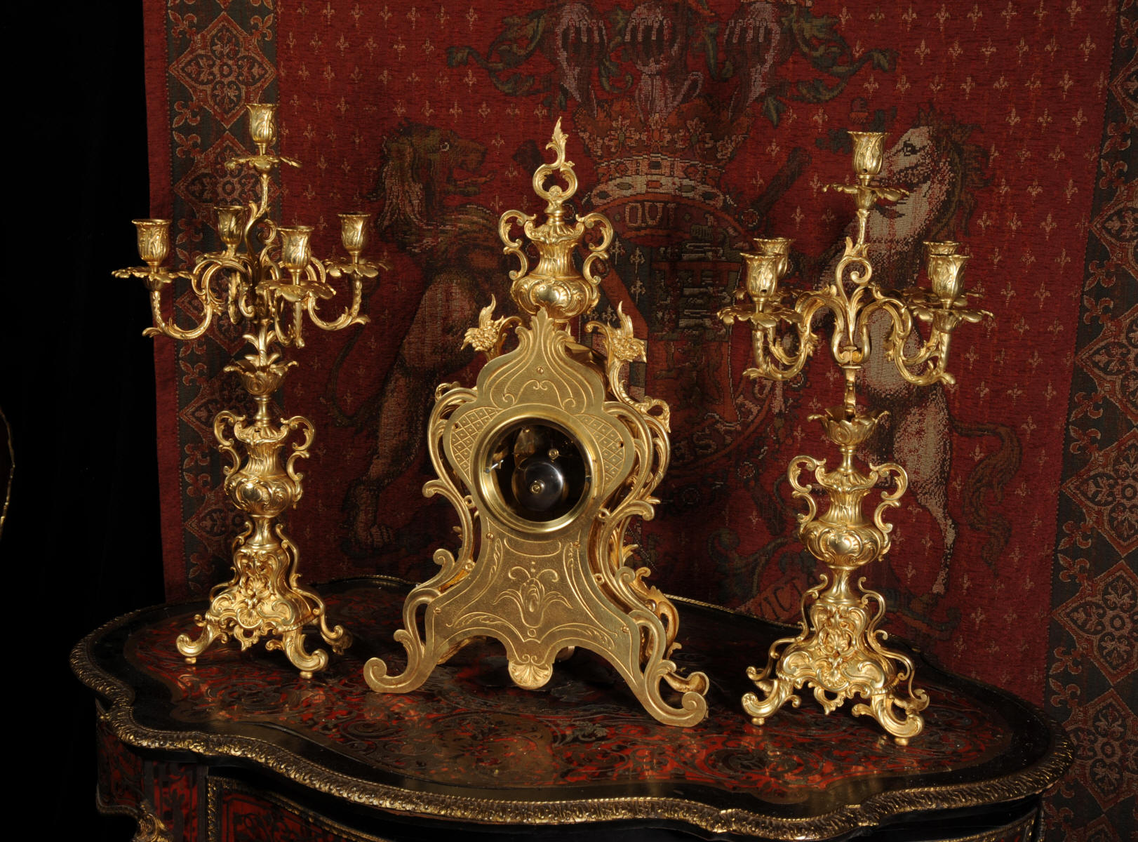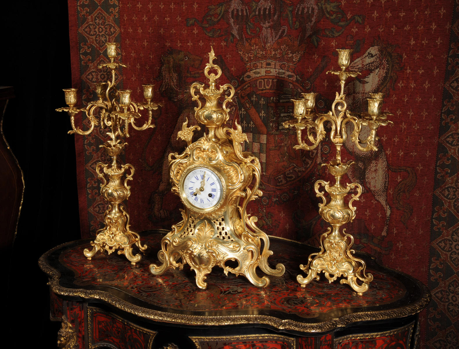 ~ French - Circa 1880 ~ ~~ Excellent condition, fully overhauled ~~ A stunning, tall and majestic original antique French Rococo clock and candelabra set. Beautiful Louis XV waisted shape with "C" scrolls, shells and floral swags. The front of the clock is fretted to lighten the design and also to allow the pendulum to be glimpsed swinging within the case. Candelabra have four branches modelled as entwining foliage, standing above urns with scroll handles. The set is of very good quality with crisp, sharp and finely detailed modelling and the gilding has a lovely clean and bright finish.