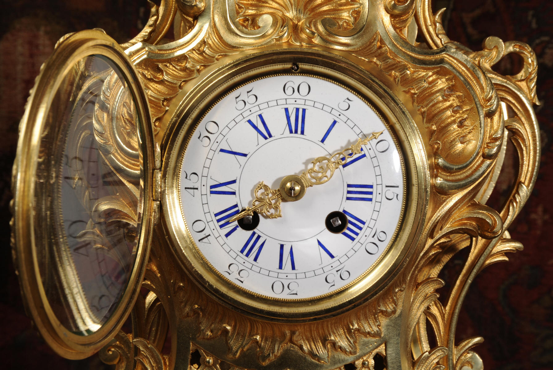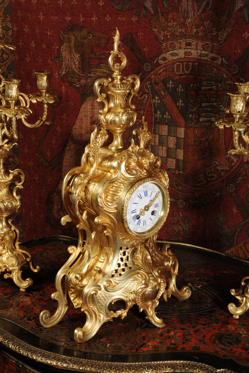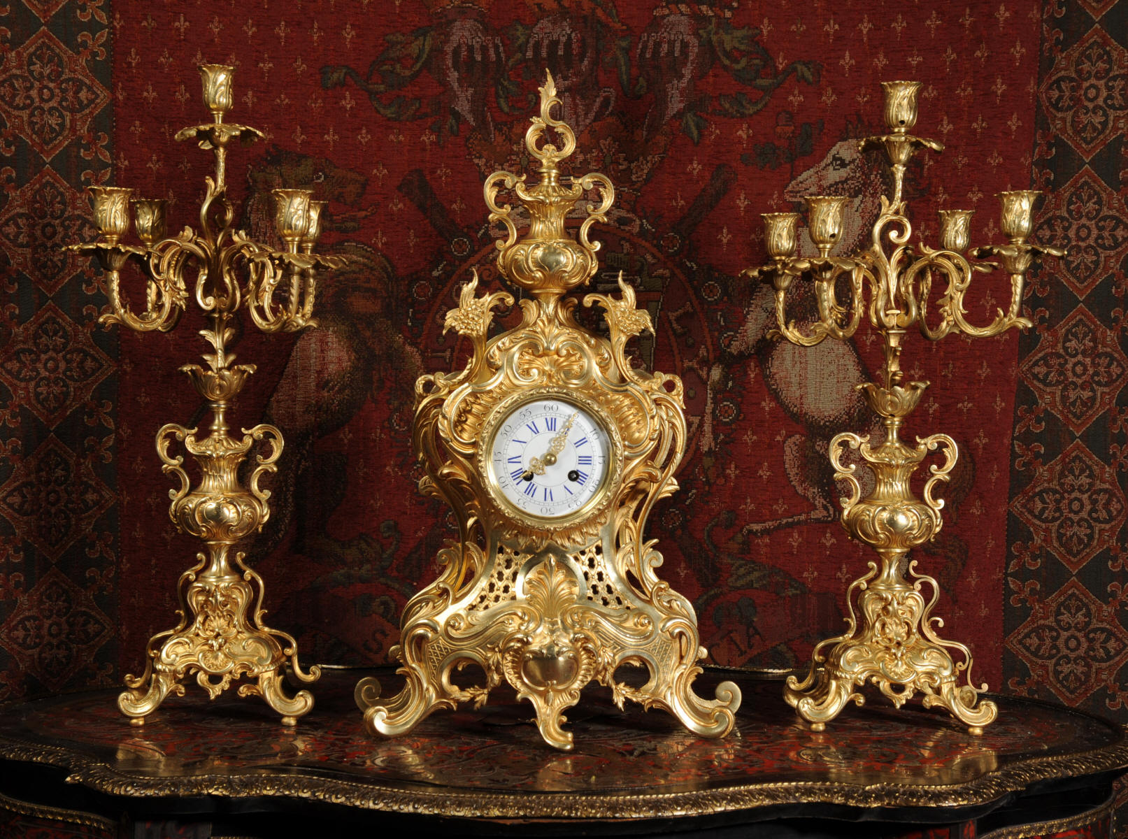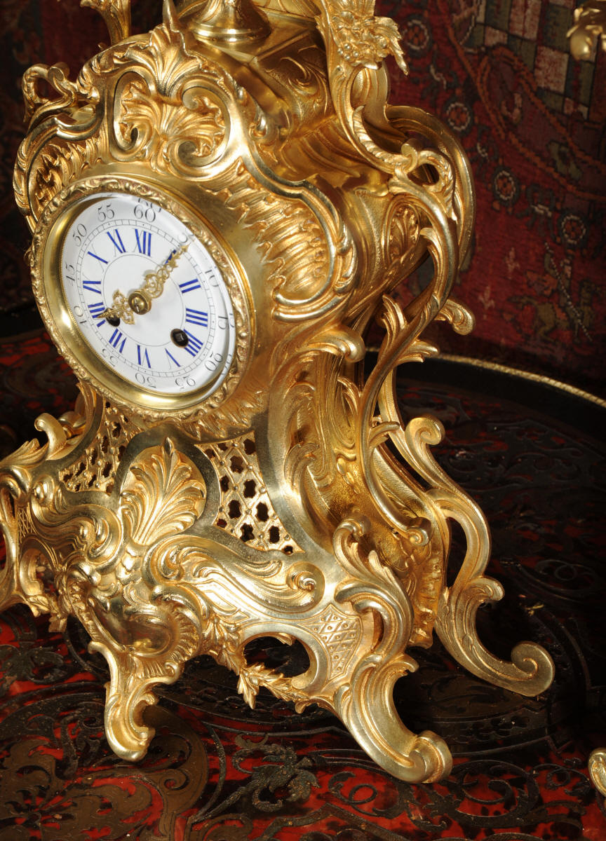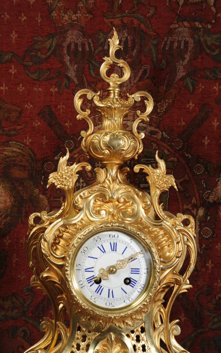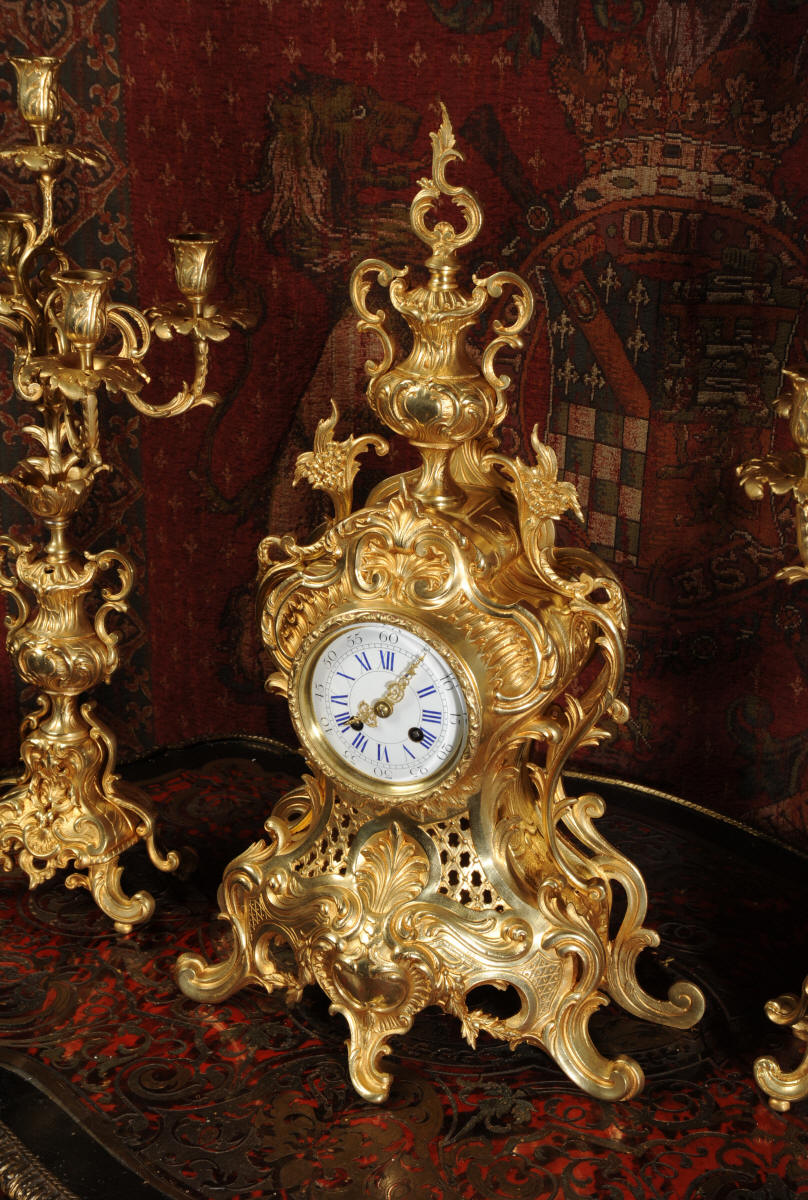 ~ French - Circa 1880 ~ ~~ Excellent condition, fully overhauled ~~ A stunning, tall and majestic original antique French Rococo clock and candelabra set. Beautiful Louis XV waisted shape with "C" scrolls, shells and floral swags. The front of the clock is fretted to lighten the design and also to allow the pendulum to be glimpsed swinging within the case. Candelabra have four branches modelled as entwining foliage, standing above urns with scroll handles. The set is of very good quality with crisp, sharp and finely detailed modelling and the gilding has a lovely clean and bright finish.