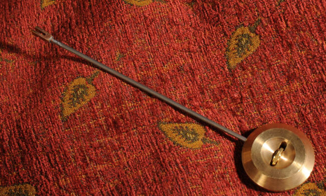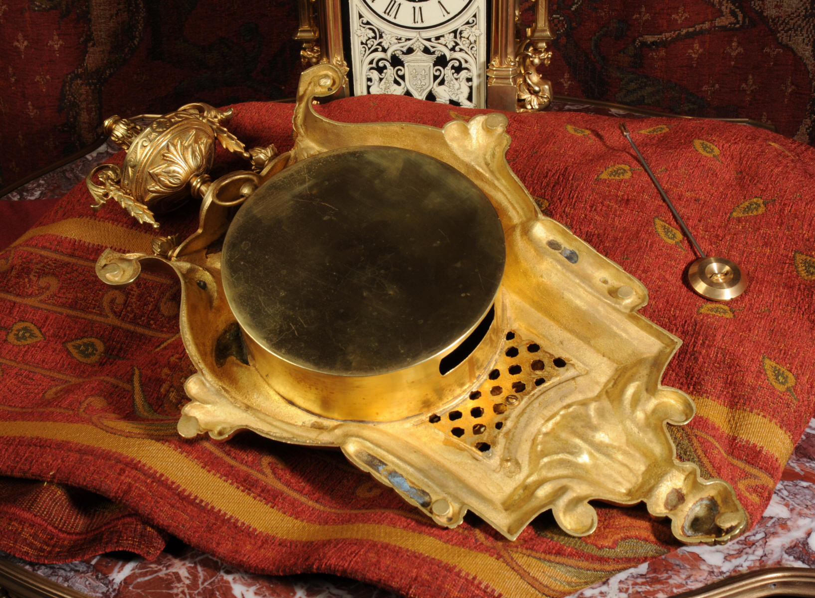 fretted panel below the dial allows the pendulum to be seen swinging within the