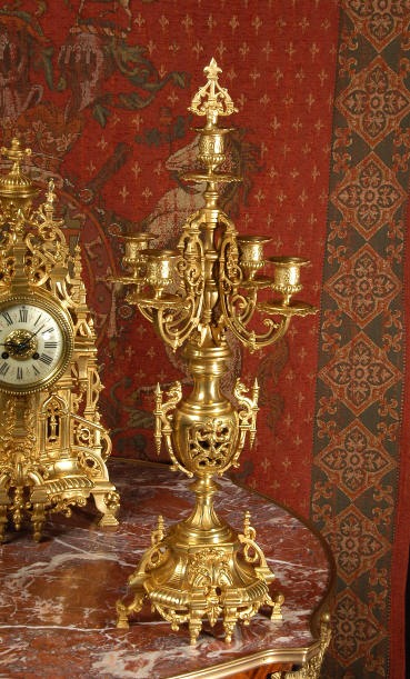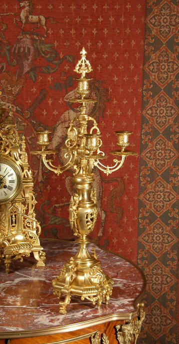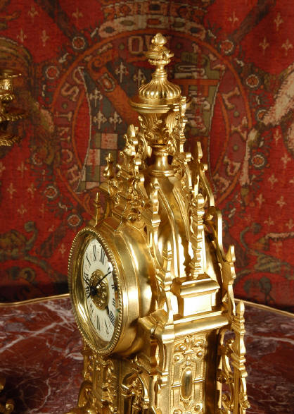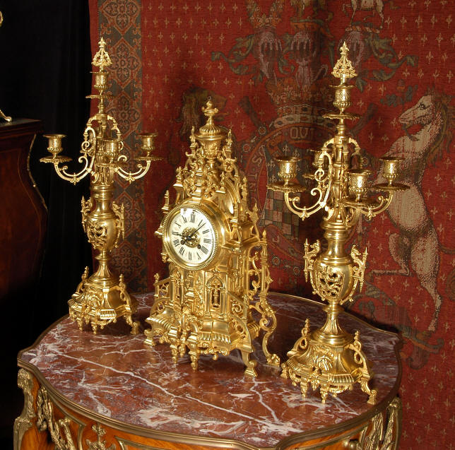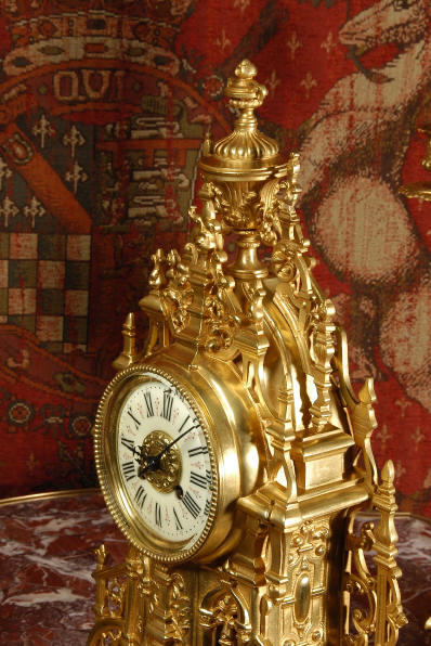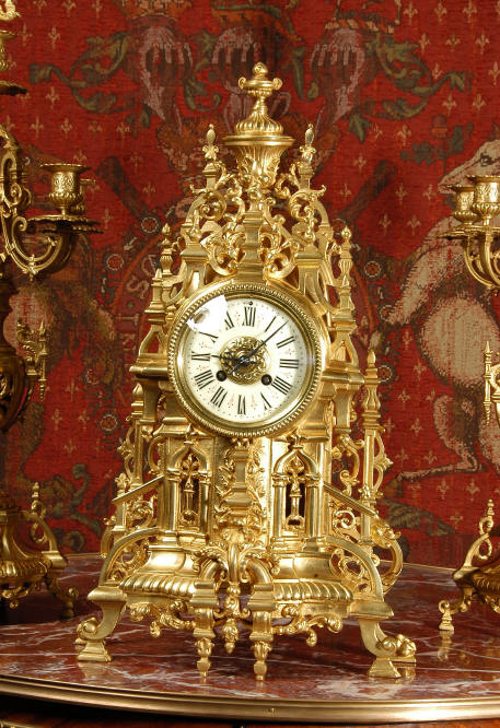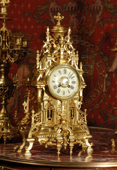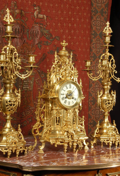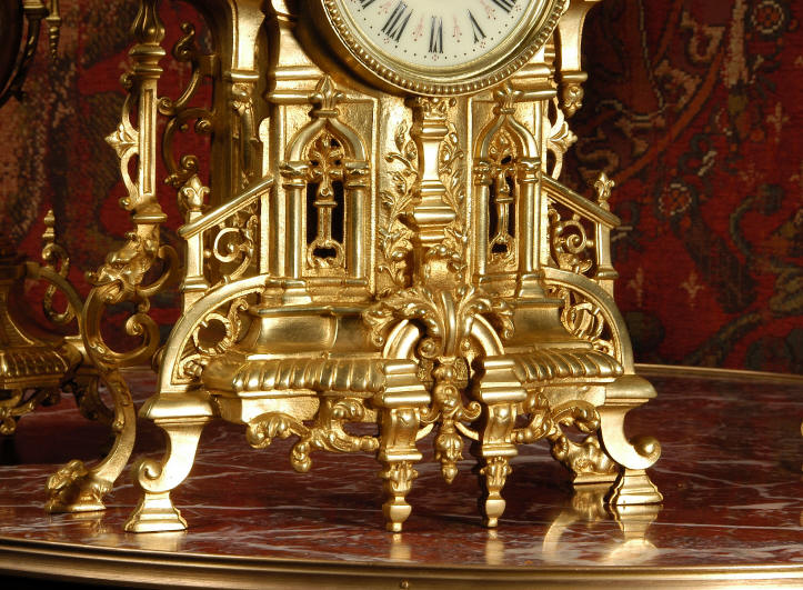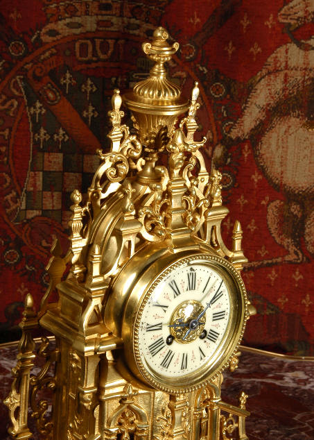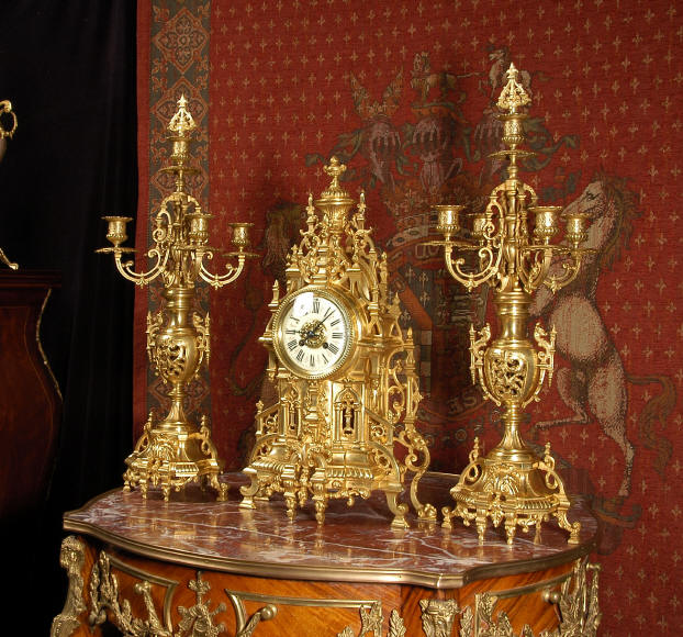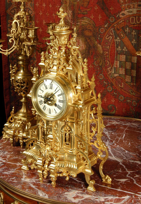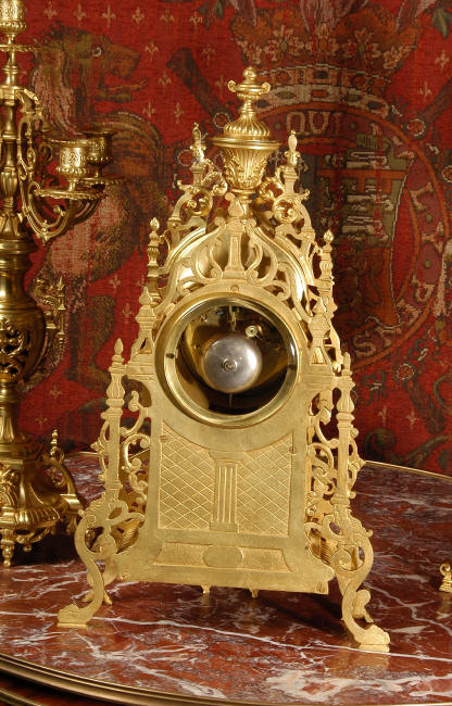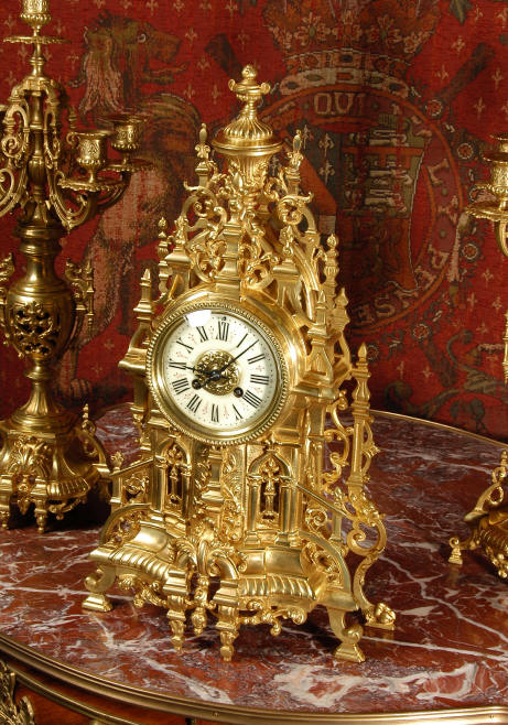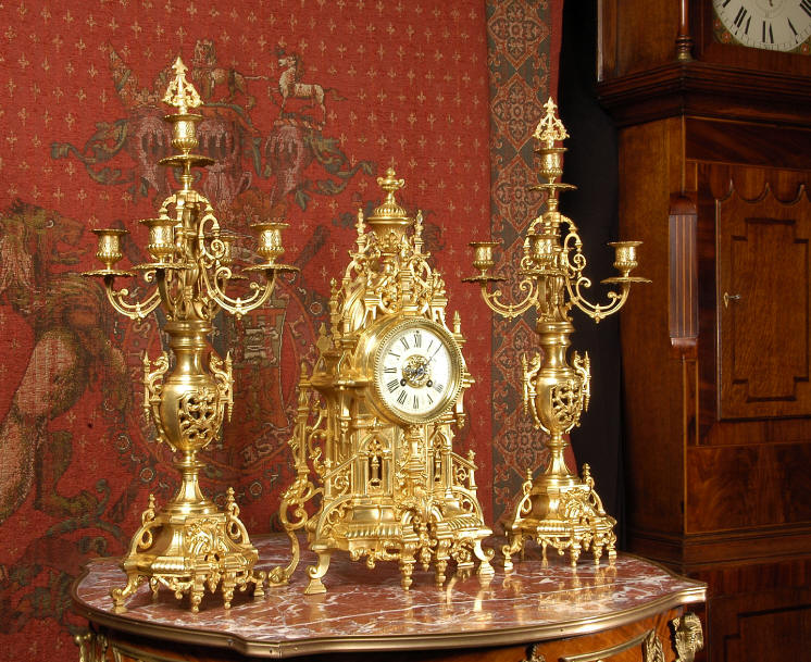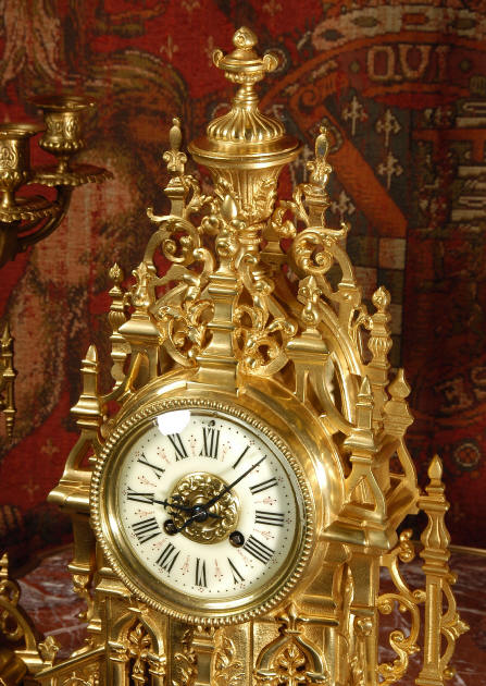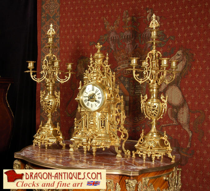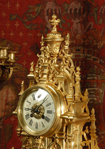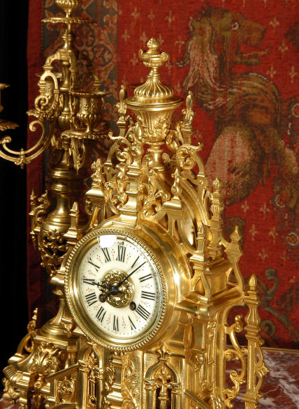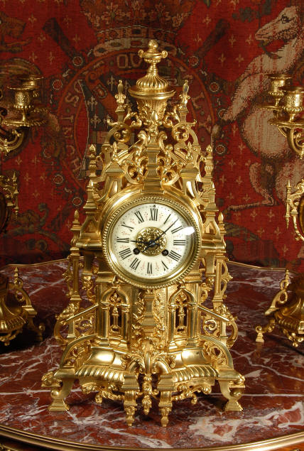 ~ French - Circa 1880 ~ ~~ Fully overhauled and working ~~ A very large and well made French clock set with modelling of high quality in brass; beautifully sharp edges and crisp detail. The style is French gothic, formed as a romantic ruin with flowing foliage, and mythical creatures. The front of the clock features a pair of Gothic tracery windows through which the pendulum can be glimpsed swinging inside the case. Candelabra have pieced urns with decorative handles formed with stylised mythical creatures and are surmounted by four branches. The set is complete with its pair of snuffers which sit in the central sconces as finials. This is a large heavy and impressive clock set in lovely clean and bright condition. Dial is enamel on copper with a brass centre and is complete with the original blued steel hands. Hobnail bezel is glazed with convex, bevelled glass. The back door of the clock is glazed with bevelled glass, allowing the movement to be seen. The French movement is of excellent quality runs for 8 days, striking half-hourly on a bell. We have replaced the missing pendulum with one faithful to the original design. Our clockmaker has fully overhauled the movement, fitted two fresh springs and test run it until satisfied of trouble free running; it is in excellent clean and running condition. The video clip below show the clock running and striking! Condition of the case is