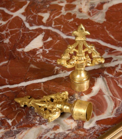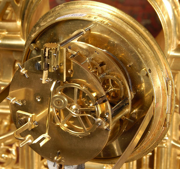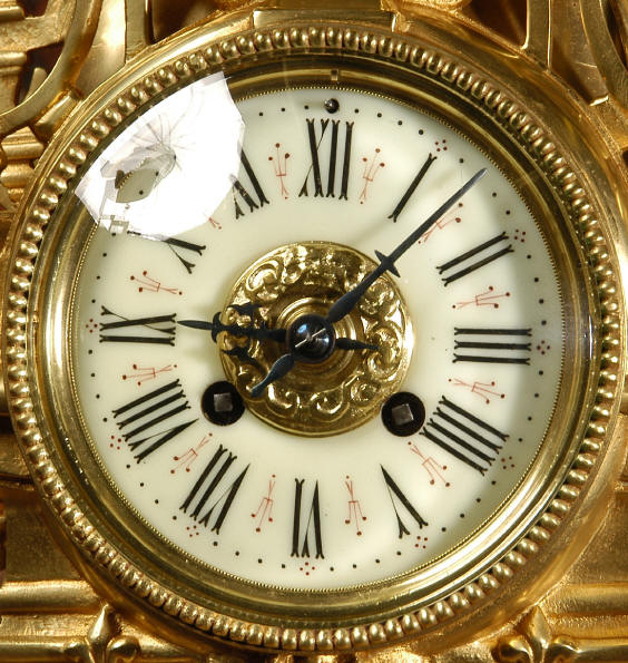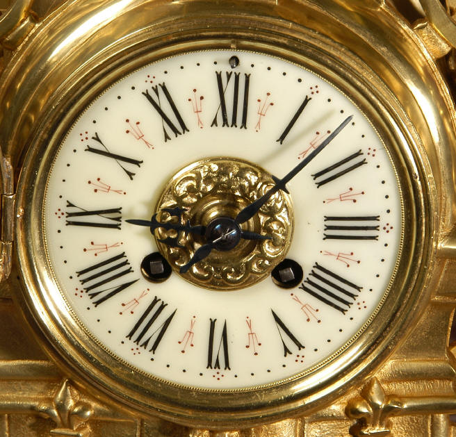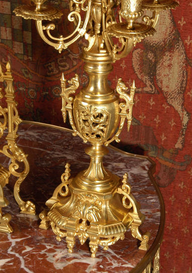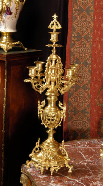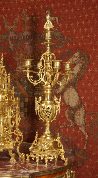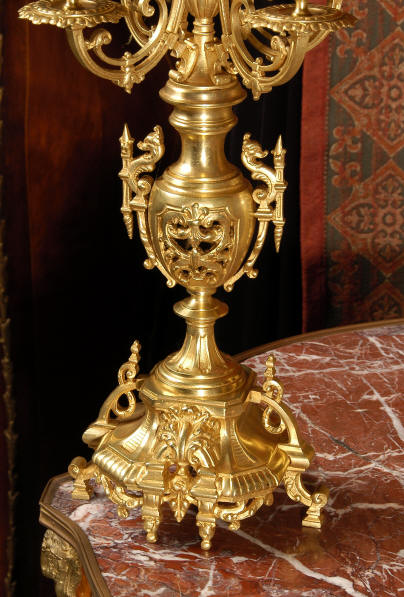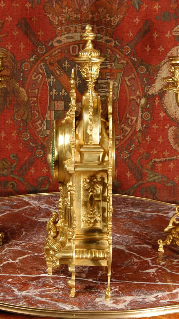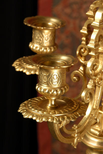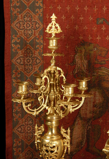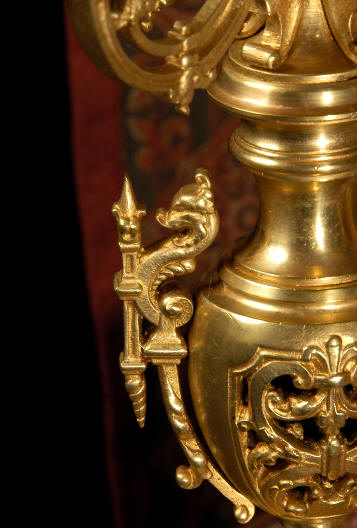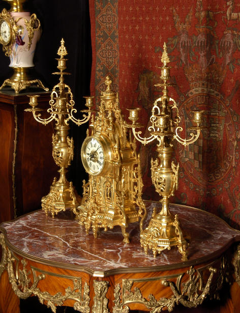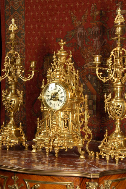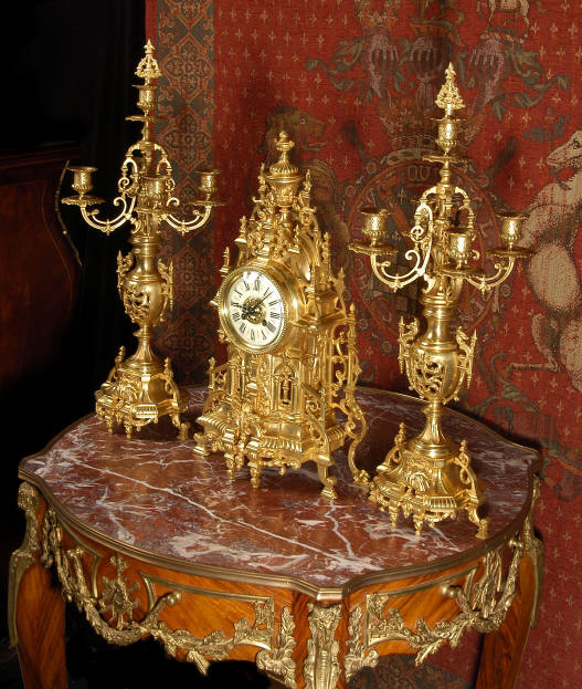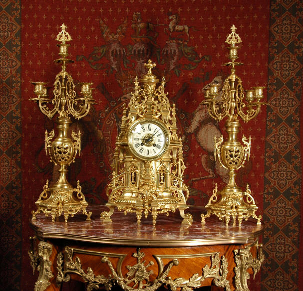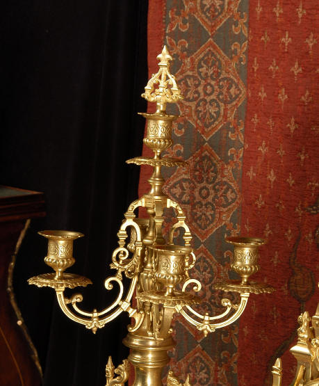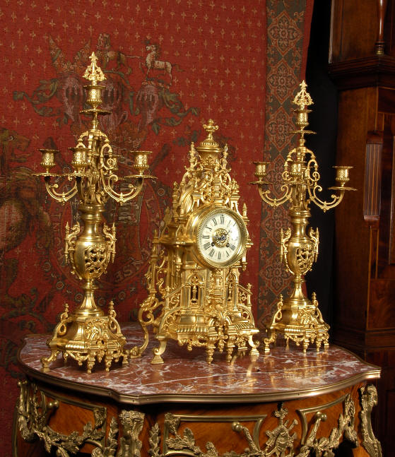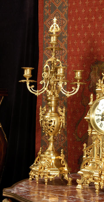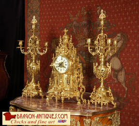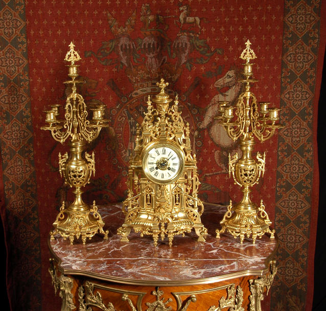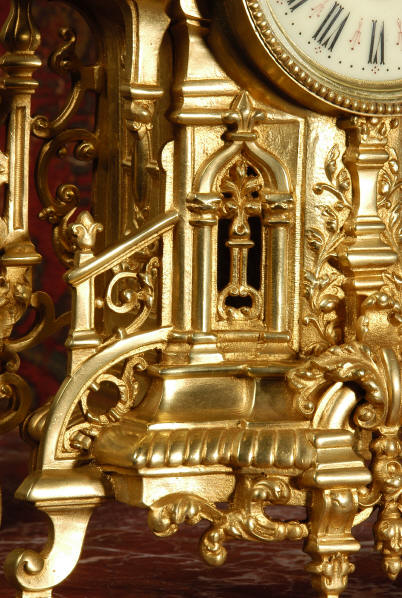 ~ French - Circa 1880 ~ ~~ Fully overhauled and working ~~ A very large and well made French clock set with modelling of high quality in brass; beautifully sharp edges and crisp detail. The style is French gothic, formed as a romantic ruin with flowing foliage, and mythical creatures. The front of the clock features a pair of Gothic tracery windows through which the pendulum can be glimpsed swinging inside the case. Candelabra have pieced urns with decorative handles formed with stylised mythical creatures and are surmounted by four branches. The set is complete with its pair of snuffers which sit in the central sconces as finials. This is a large heavy and impressive clock set in lovely clean and bright condition. Dial is enamel on copper with a brass centre and is complete with the original blued steel hands. Hobnail bezel is glazed with convex, bevelled glass. The back door of the clock is glazed with bevelled glass, allowing the movement to be seen. The French movement is of excellent quality runs for 8 days, striking half-hourly on a bell. We have replaced the missing pendulum with one faithful to the original design. Our clockmaker has fully overhauled the movement, fitted two fresh springs and test run it until satisfied of trouble free running; it is in excellent clean and running condition. The video clip below show the clock running and striking! Condition of the case is