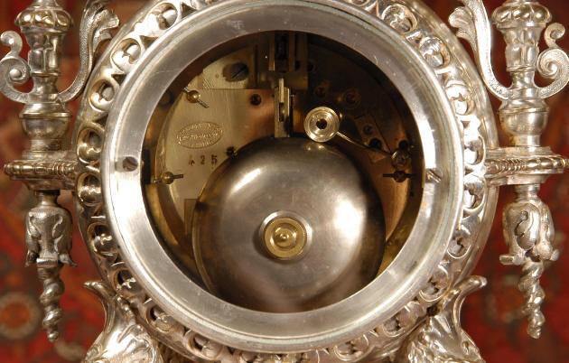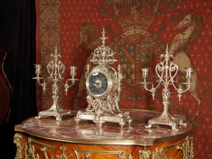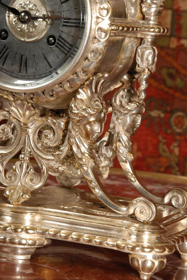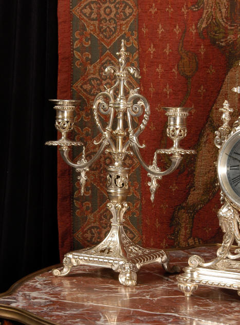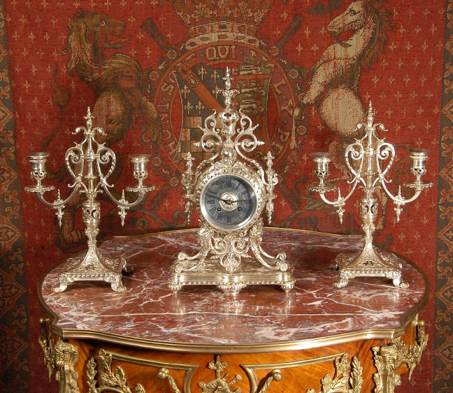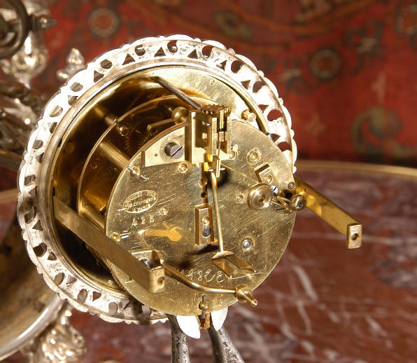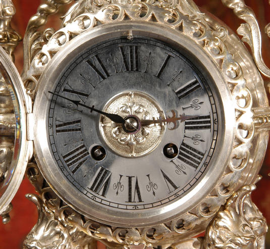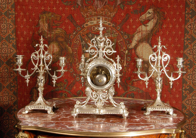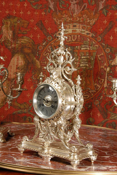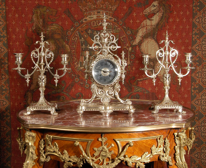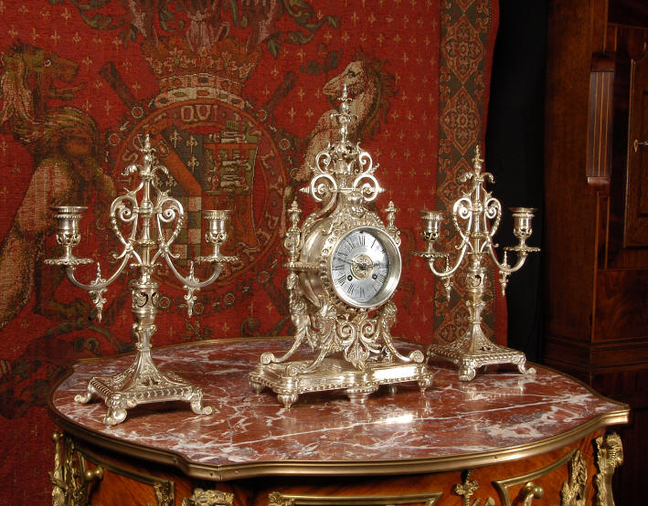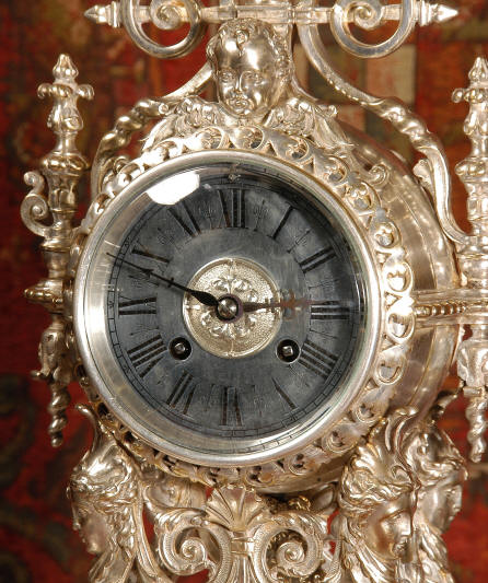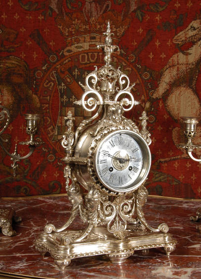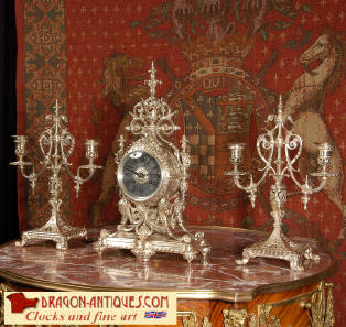 ~ French - Circa 1870 ~ ~~ Very good condition ~~ A very rare and particularly chic silver plated bronze/brass clock set. It is classical in style; the clock is mounted in a drum which is supported by 4 goddesses carrying the clock on stylised waves. The top of the clock has an intricately fretted vase surrounded by scrolls. The silvered 'basket of flowers' pendulum swings beneath and can be seen from all sides. Above the dial is a beautifully depicted Reynold's angel. Candelabra stand on fretted, square bases surmounted by 2 branches, styled with elaborate scrolls. Decoration is beautifully sharp and detailed, with fine fret work to the urns and bases. The clock and candelabra are modelled all around and the back door of the clock is glazed to allow the movement to be seen. The set displays beautifully, both on a mantle or side table or in the middle of a room. The dial is engraved and silvered and is complete with blued steel hands. The French movement is of excellent quality. The backplate of the movement has the original Paris retailers mark "Bocquet Fils". It is in beautifully clean and running condition having been fully stripped down, cleaned and serviced by our clockmaker. We have replaced the pendulum with a specially silvered one to match the clock and we have fitted a replacement minute hand to match the original hour. It runs for 8 days and strikes the hours and halves on a bell. Click the movie below see this actual clock running! Condition of the case is