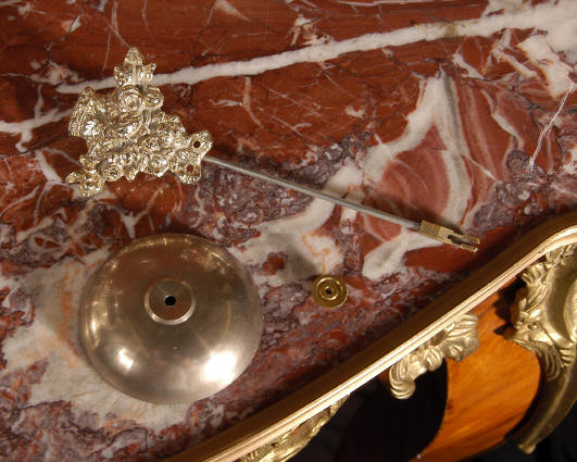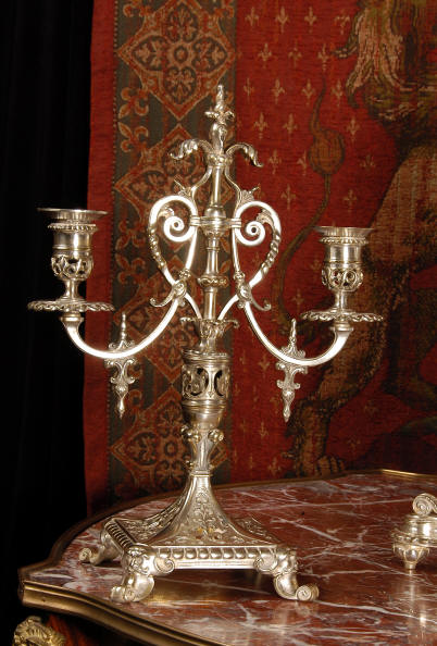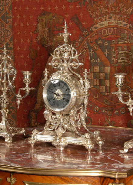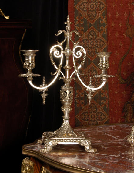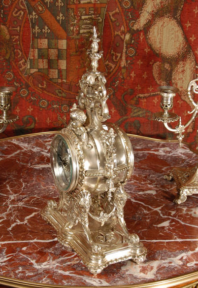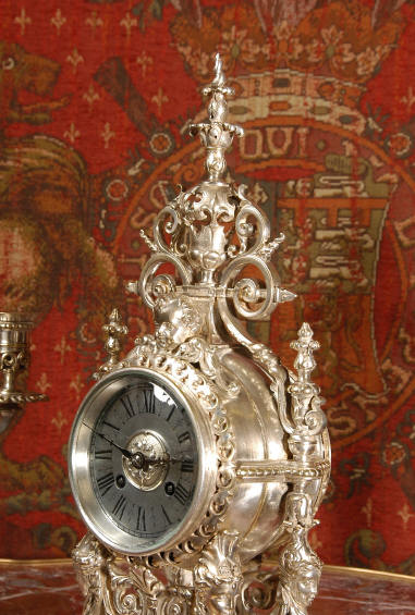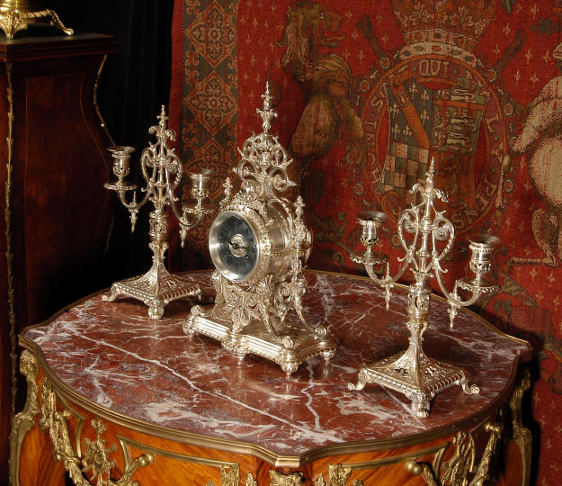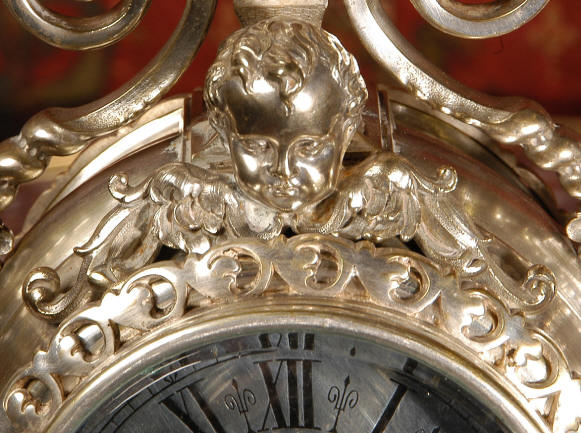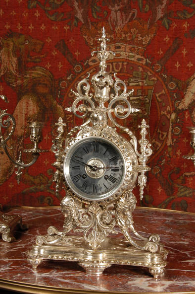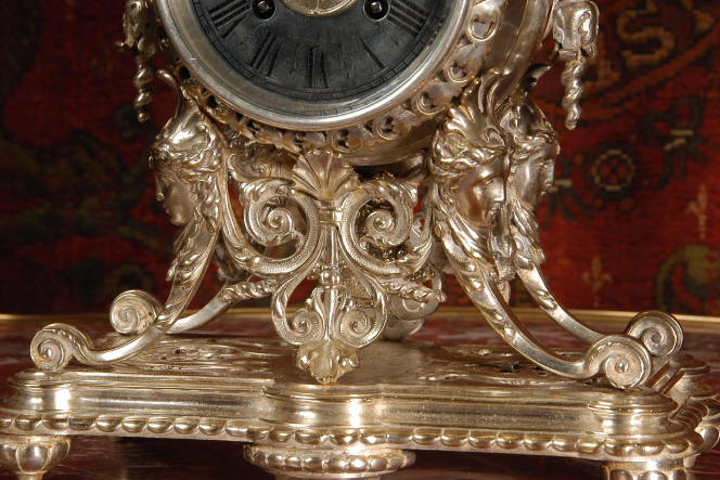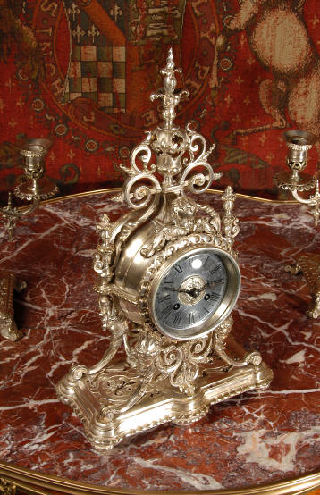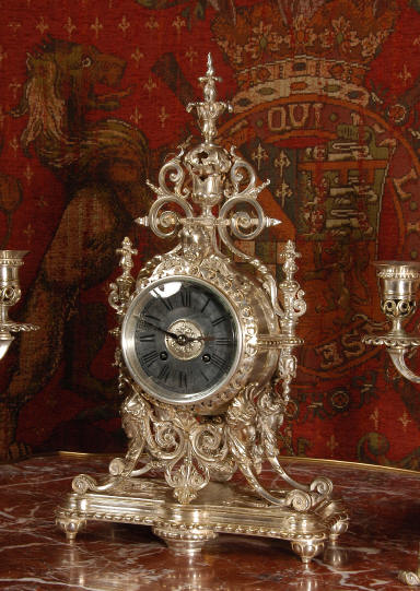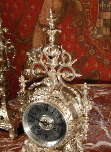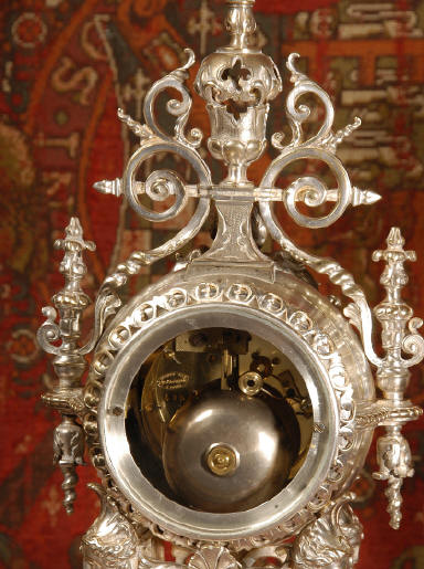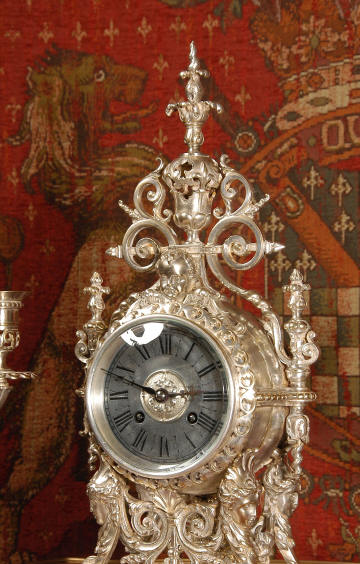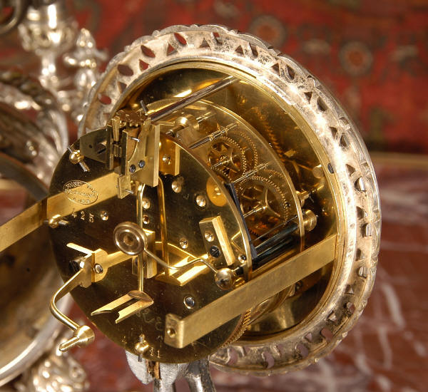~ French - Circa 1870 ~ ~~ Very good condition ~~ A very rare and particularly chic silver plated bronze/brass clock set. It is classical in style; the clock is mounted in a drum which is supported by 4 goddesses carrying the clock on stylised waves. The top of the clock has an intricately fretted vase surrounded by scrolls. The silvered 'basket of flowers' pendulum swings beneath and can be seen from all sides. Above the dial is a beautifully depicted Reynold's angel. Candelabra stand on fretted, square bases surmounted by 2 branches, styled with elaborate scrolls. Decoration is beautifully sharp and detailed, with fine fret work to the urns and bases. The clock and candelabra are modelled all around and the back door of the clock is glazed to allow the movement to be seen. The set displays beautifully, both on a mantle or side table or in the middle of a room. The dial is engraved and silvered and is complete with blued steel hands. The French movement is of excellent quality. The backplate of the movement has the original Paris retailers mark "Bocquet Fils". It is in beautifully clean and running condition having been fully stripped down, cleaned and serviced by our clockmaker. We have replaced the pendulum with a specially silvered one to match the clock and we have fitted a replacement minute hand to match the original hour. It runs for 8 days and strikes the hours and halves on a bell. Click the movie below see this actual clock running! Condition of the case is