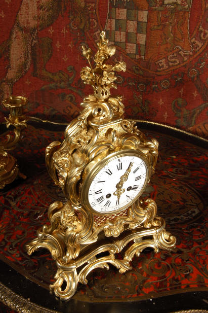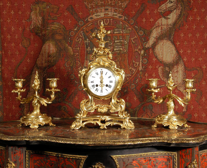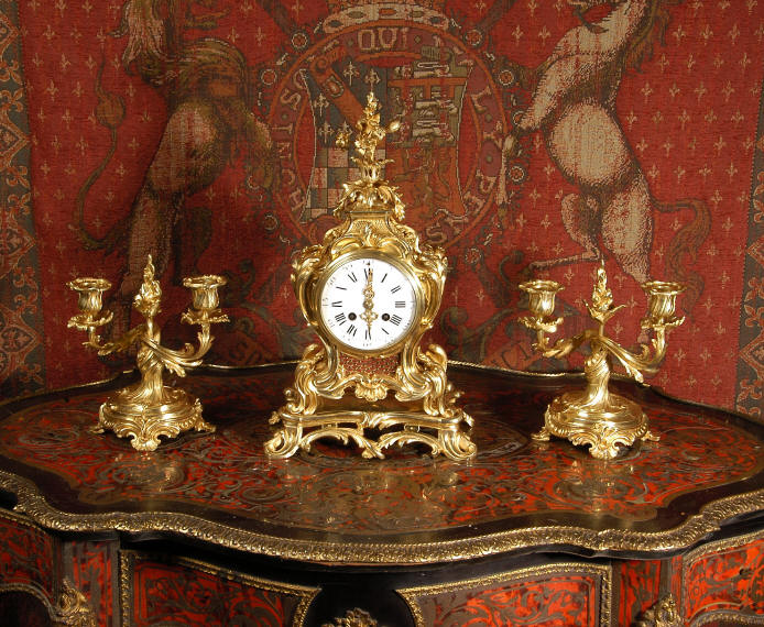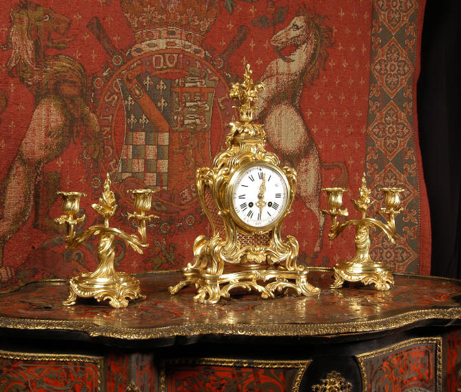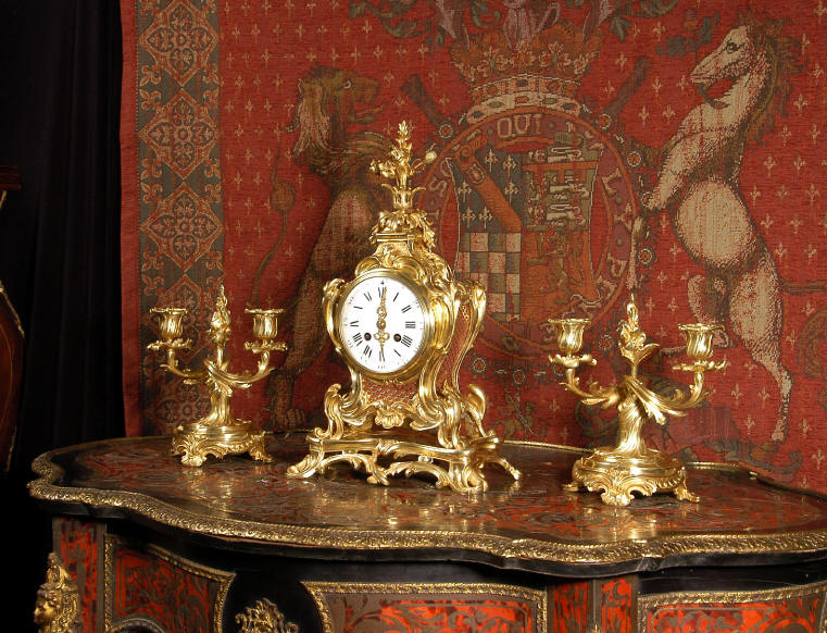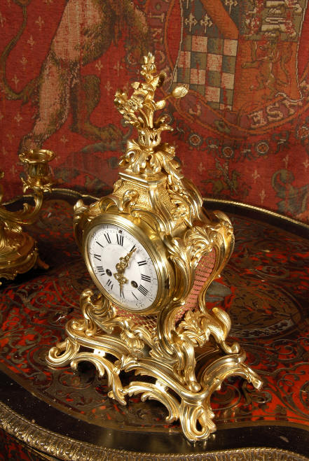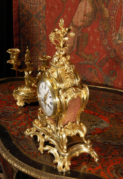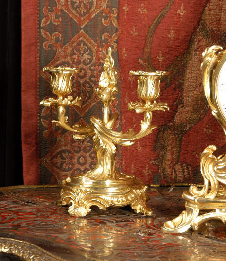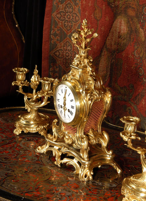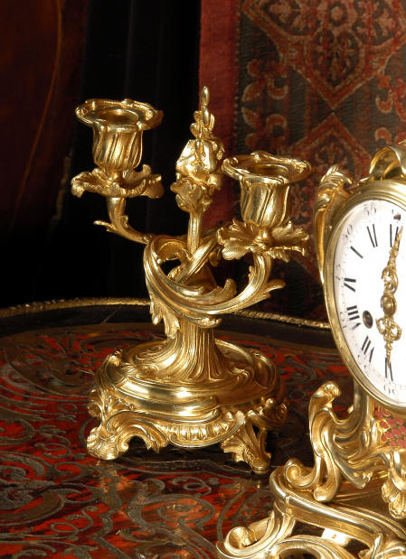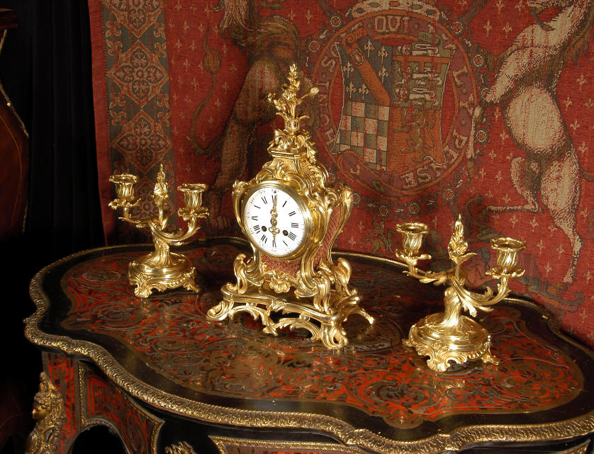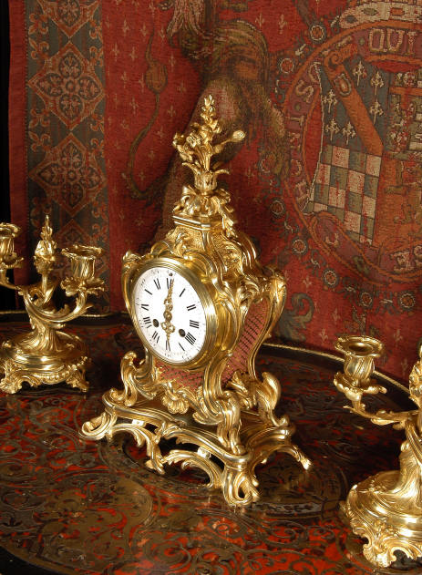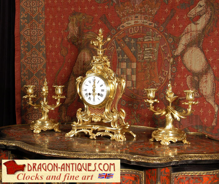 ~ French - Circa 1880 ~ ~~ Excellent condition ~~ A beautiful Rococo clock set by the famous maker Japy Freres. It is stunning in its original fine gilding which is bright and clean. The case is of classic Rococo design, waisted, keyhole shape with acanthus leaf shoulders, 'C' scroll feet standing on a serpentine base and surmounted by a floral finial. Candelabra have branches of stylised acanthus leafs with a floral finial and standing on round bases. The front, rear and sides of the the clock have velvet lined fretted panels and the rear door is glazed with frosted glass. The design is beautifully bold and heavily moulded in gilded brass, well chased and finished. It is modelled in the round and so would display very well on a table. Dial is a beautiful enamel on copper with the hours in Roman numerals, and an Arabic minute ring, it is faintly signed for the retailer. It is complete with its original delicately fretted brass hands. The French movement is by Japy Freres and is of this makers usual high quality, their mark is on the movement backplate along with that of the retailer's mark. It features superior pin-pallet escapement and rack striking. It is in clean and fully working condition and is complete with a replacement pendulum. It runs for 8 days and strikes the hours and halves on a bell, the video clip below shows the clock running and striking. The finish of the set is excellent - bright and