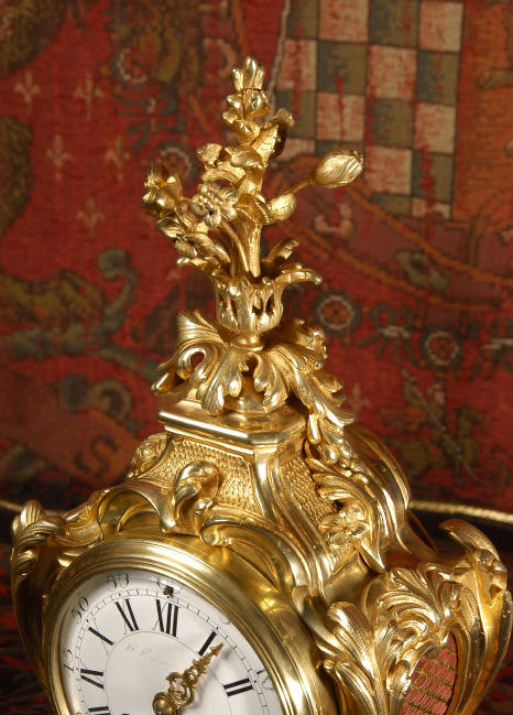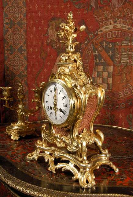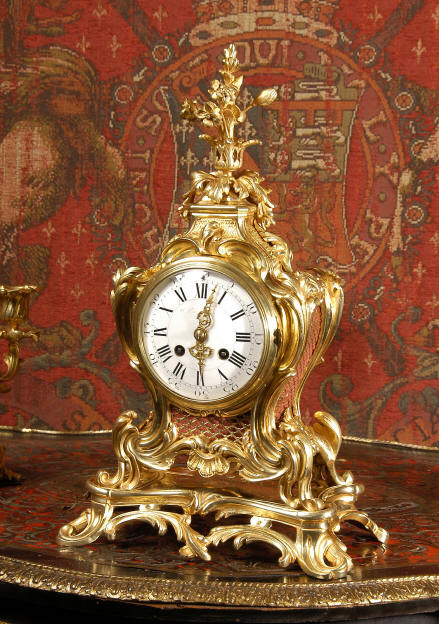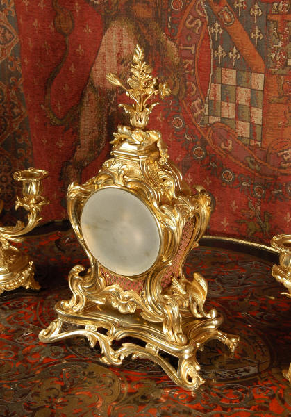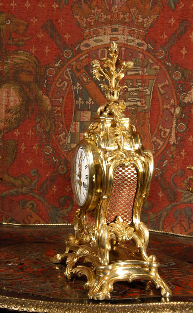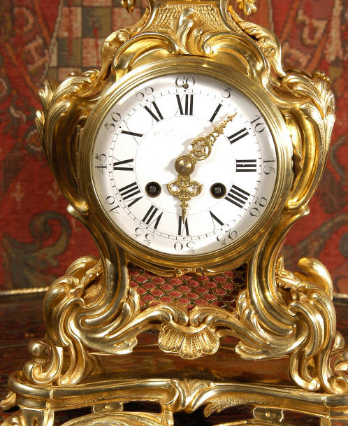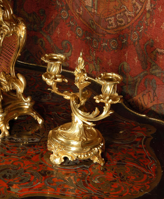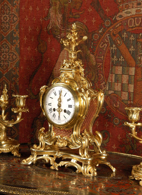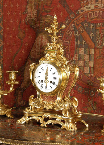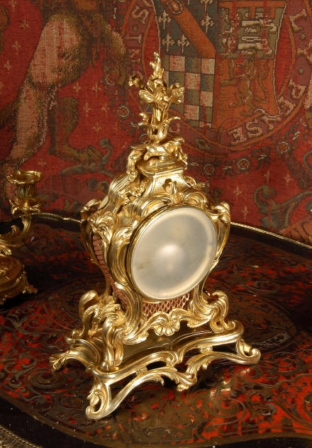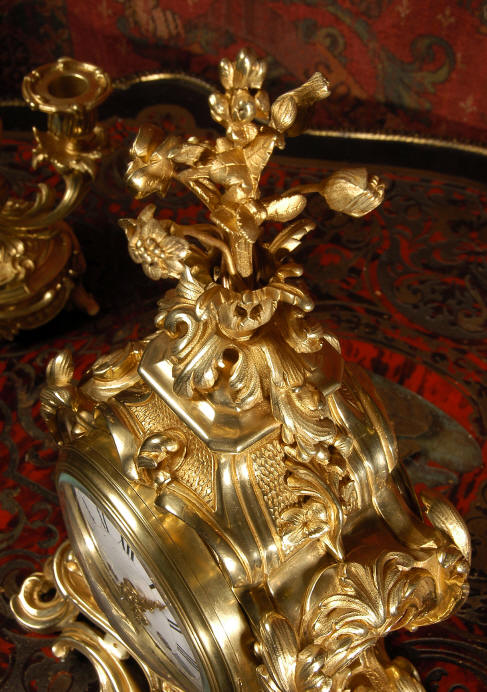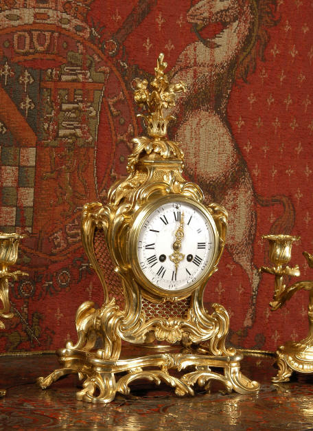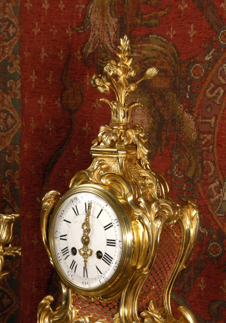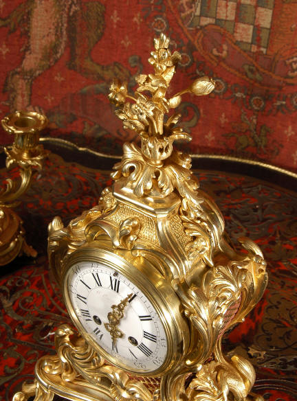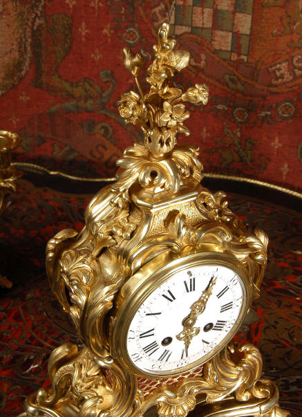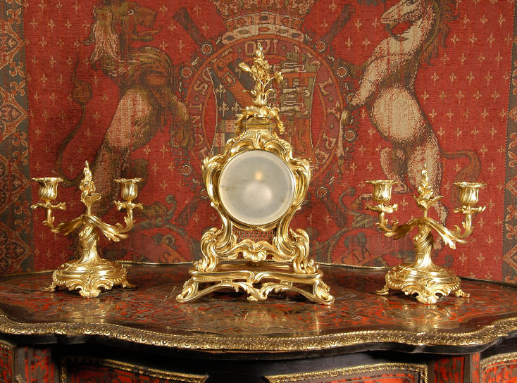 ~ French - Circa 1880 ~ ~~ Excellent condition ~~ A beautiful Rococo clock set by the famous maker Japy Freres. It is stunning in its original fine gilding which is bright and clean. The case is of classic Rococo design, waisted, keyhole shape with acanthus leaf shoulders, 'C' scroll feet standing on a serpentine base and surmounted by a floral finial. Candelabra have branches of stylised acanthus leafs with a floral finial and standing on round bases. The front, rear and sides of the the clock have velvet lined fretted panels and the rear door is glazed with frosted glass. The design is beautifully bold and heavily moulded in gilded brass, well chased and finished. It is modelled in the round and so would display very well on a table. Dial is a beautiful enamel on copper with the hours in Roman numerals, and an Arabic minute ring, it is faintly signed for the retailer. It is complete with its original delicately fretted brass hands. The French movement is by Japy Freres and is of this makers usual high quality, their mark is on the movement backplate along with that of the retailer's mark. It features superior pin-pallet escapement and rack striking. It is in clean and fully working condition and is complete with a replacement pendulum. It runs for 8 days and strikes the hours and halves on a bell, the video clip below shows the clock running and striking. The finish of the set is excellent - bright and
