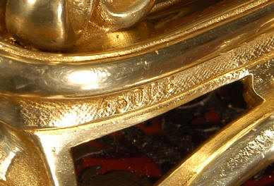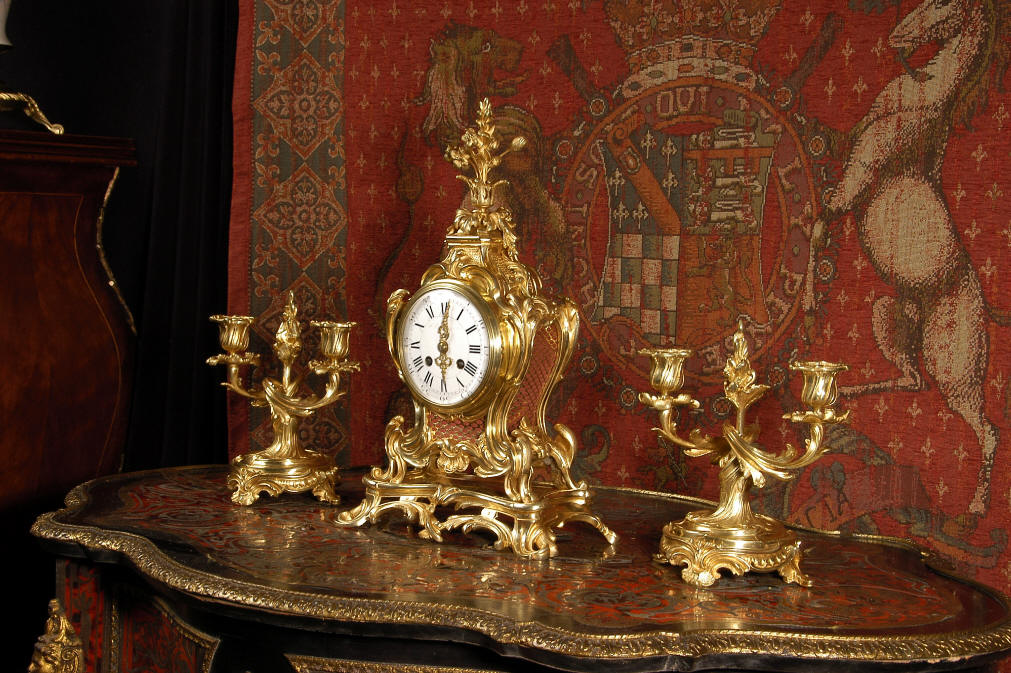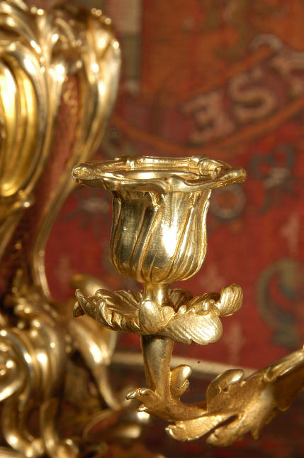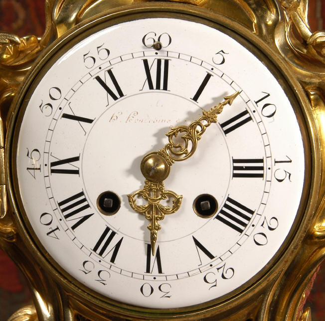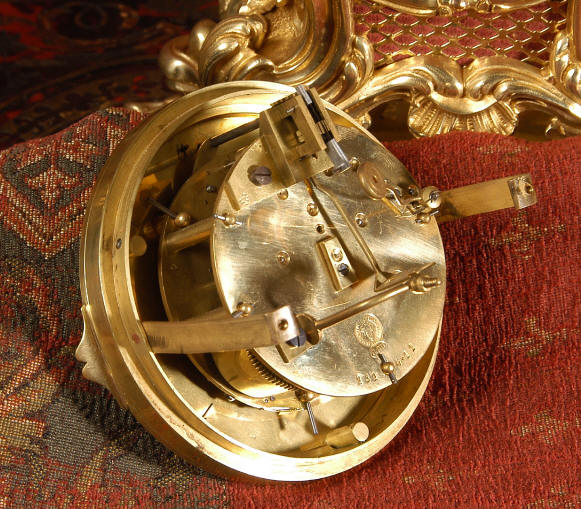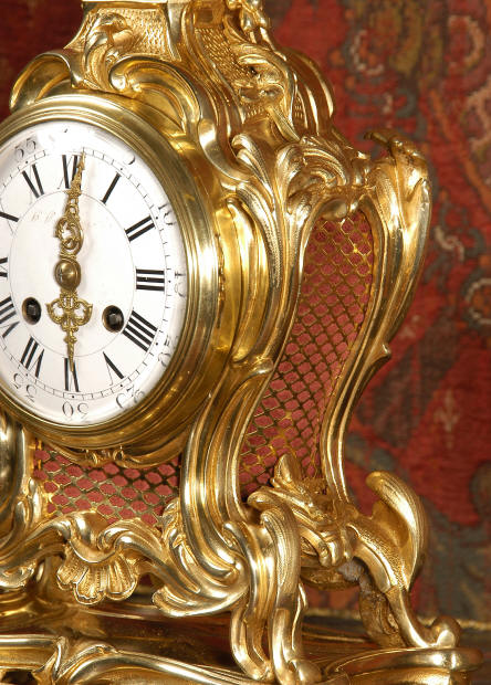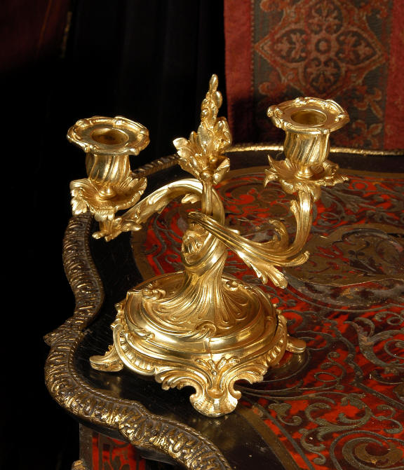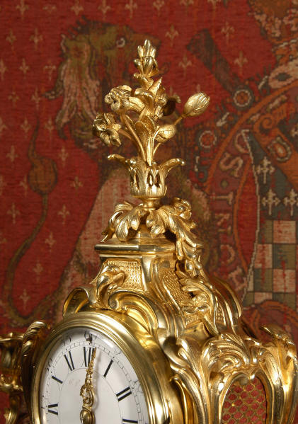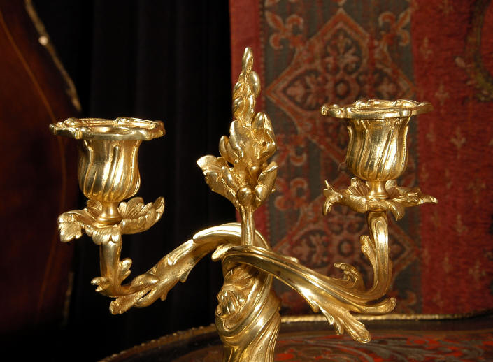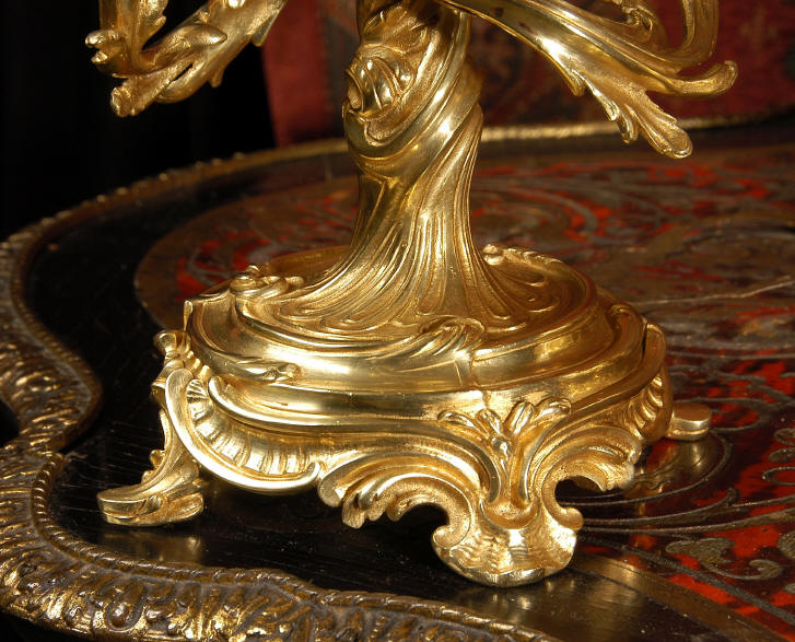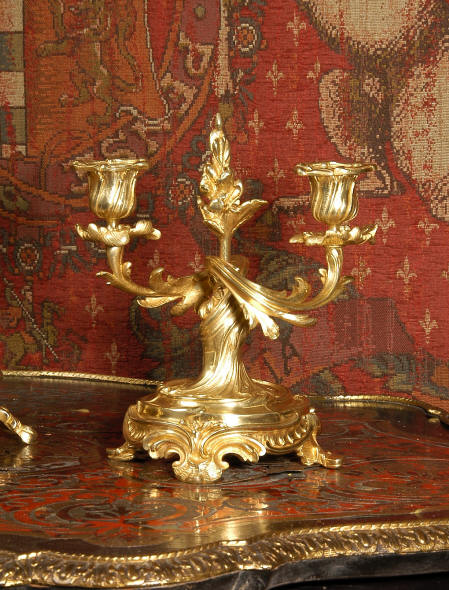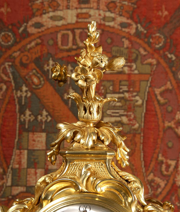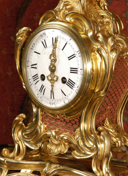 ~ French - Circa 1880 ~ ~~ Excellent condition ~~ A beautiful Rococo clock set by the famous maker Japy Freres. It is stunning in its original fine gilding which is bright and clean. The case is of classic Rococo design, waisted, keyhole shape with acanthus leaf shoulders, 'C' scroll feet standing on a serpentine base and surmounted by a floral finial. Candelabra have branches of stylised acanthus leafs with a floral finial and standing on round bases. The front, rear and sides of the the clock have velvet lined fretted panels and the rear door is glazed with frosted glass. The design is beautifully bold and heavily moulded in gilded brass, well chased and finished. It is modelled in the round and so would display very well on a table. Dial is a beautiful enamel on copper with the hours in Roman numerals, and an Arabic minute ring, it is faintly signed for the retailer. It is complete with its original delicately fretted brass hands. The French movement is by Japy Freres and is of this makers usual high quality, their mark is on the movement backplate along with that of the retailer's mark. It features superior pin-pallet escapement and rack striking. It is in clean and fully working condition and is complete with a replacement pendulum. It runs for 8 days and strikes the hours and halves on a bell, the video clip below shows the clock running and striking. The finish of the set is excellent - bright and
