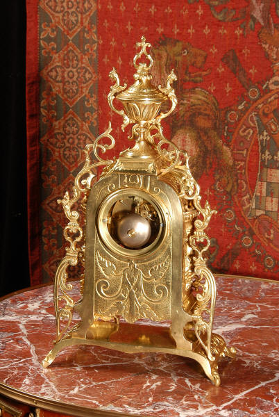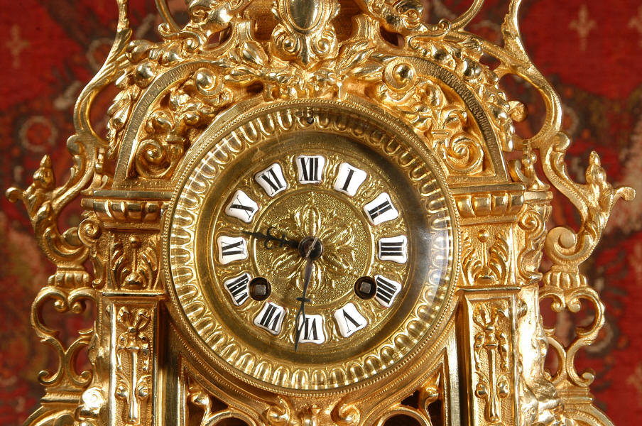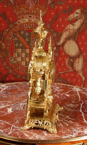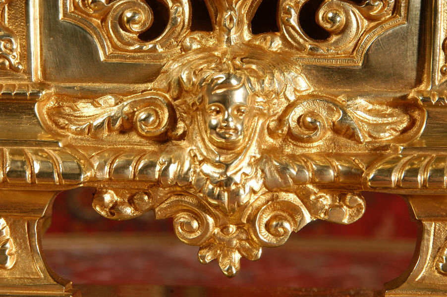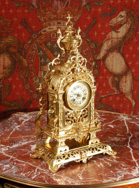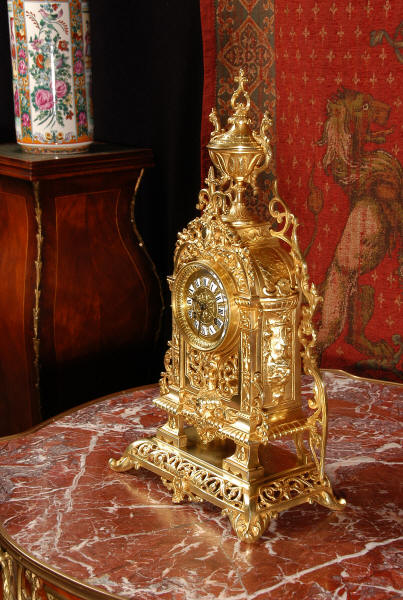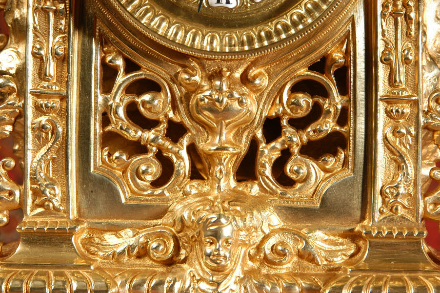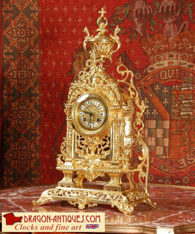 ~ French - Circa 1880 ~ ~~ Excellent condition ~~ A stunning gilt brass table clock in excellent original condition and of a small size. The original gilding is very good, clean and bright. It is classically modelled with columns to each side of the dial decorated with dolphins. The panel between the columns is fretted allowing the pendulum to be seen swinging within the case. Below this is a Reynold's angel. There are also Mythical creatures and elaborate flowing foliage. The clock stands on a base which is also finely pierced with scrolling foliage and acanthus leaf feet and the clock is surmounted by an urn with mythical creatures. The dial is also brass and is mounted with 12 individual enamel cartouches. the rear door is glazed to allow the movement to be seen. The French movement is of high quality and runs for 8 days on one wind. It strikes half hourly on a bell and is complete with original pendulum and bell. It has been fully overhauled by our clock maker and is in excellent working order. Click the video below to hear the bell and watch the clock running! Condition is