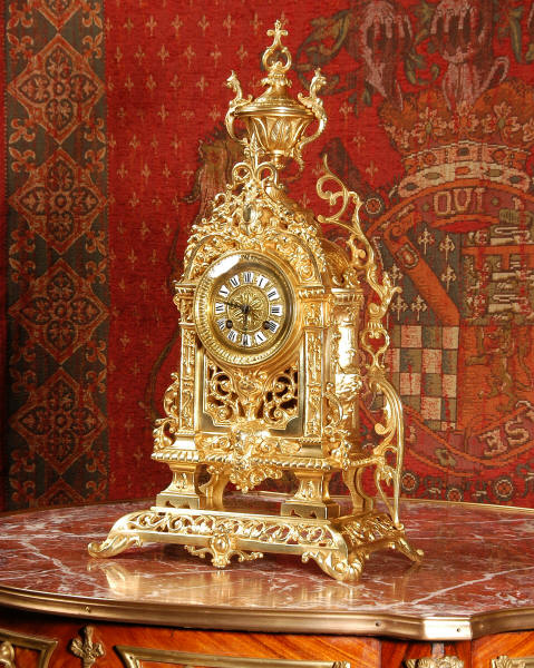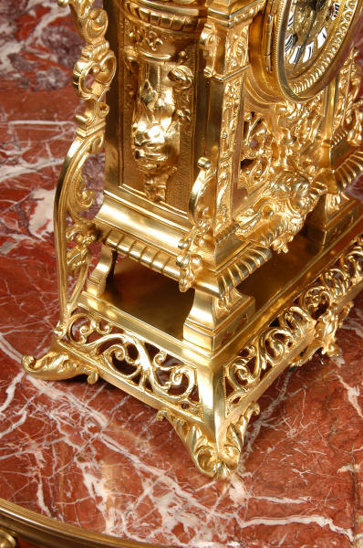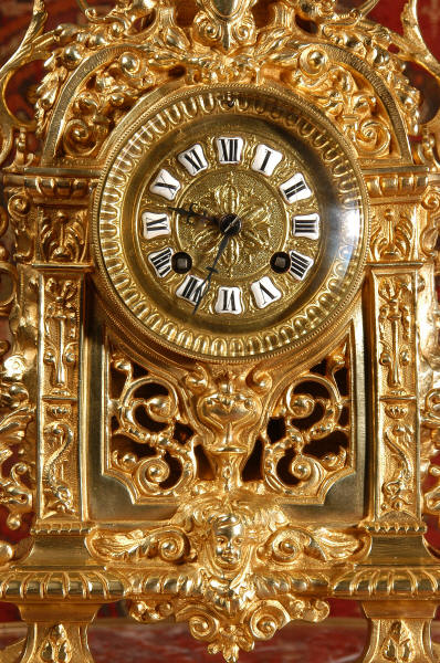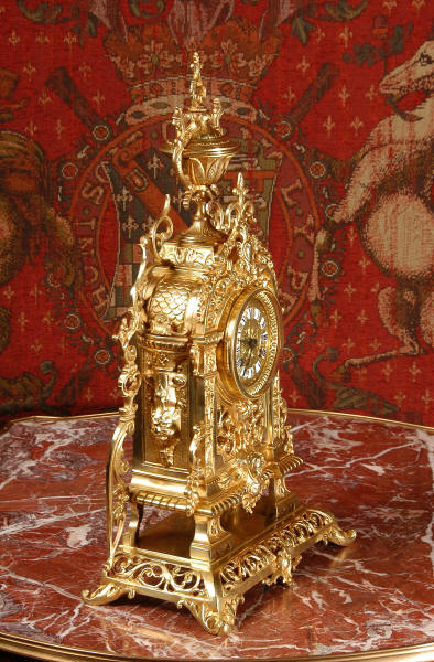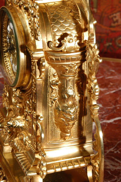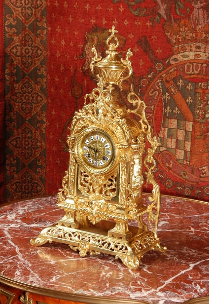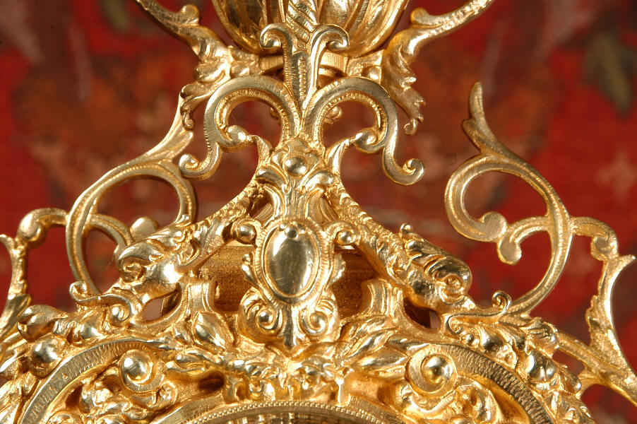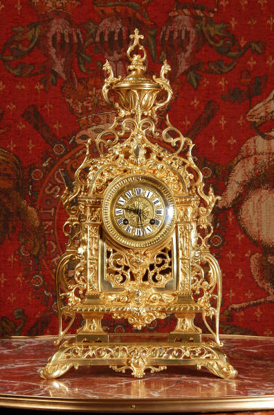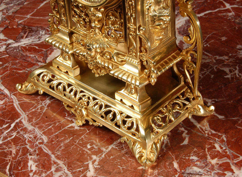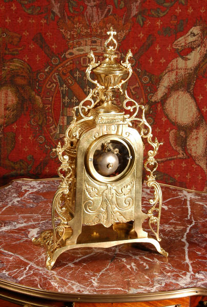 ~ French - Circa 1880 ~ ~~ Excellent condition ~~ A stunning gilt brass table clock in excellent original condition and of a small size. The original gilding is very good, clean and bright. It is classically modelled with columns to each side of the dial decorated with dolphins. The panel between the columns is fretted allowing the pendulum to be seen swinging within the case. Below this is a Reynold's angel. There are also Mythical creatures and elaborate flowing foliage. The clock stands on a base which is also finely pierced with scrolling foliage and acanthus leaf feet and the clock is surmounted by an urn with mythical creatures. The dial is also brass and is mounted with 12 individual enamel cartouches. the rear door is glazed to allow the movement to be seen. The French movement is of high quality and runs for 8 days on one wind. It strikes half hourly on a bell and is complete with original pendulum and bell. It has been fully overhauled by our clock maker and is in excellent working order. Click the video below to hear the bell and watch the clock running! Condition is