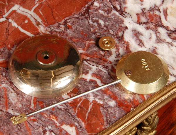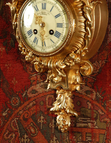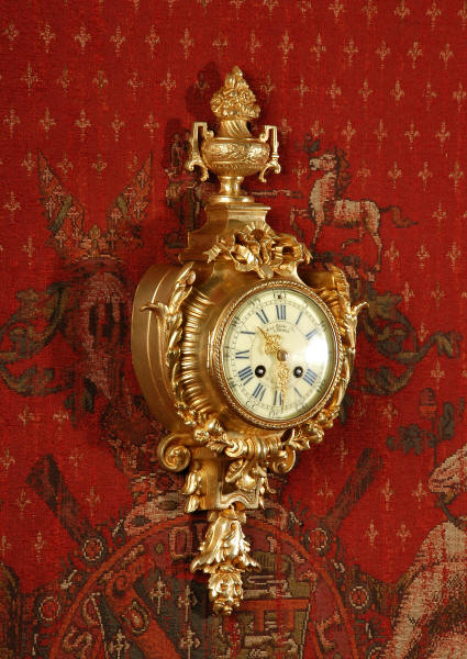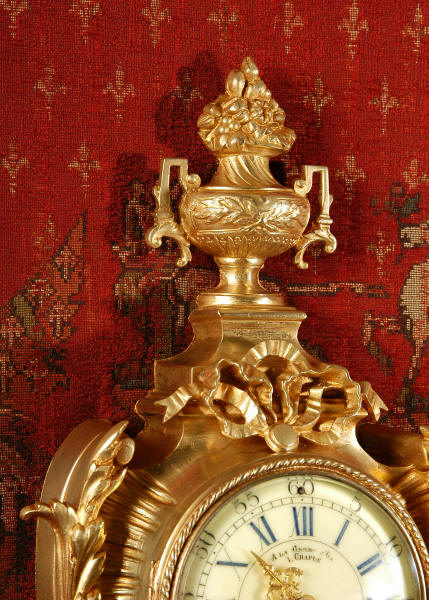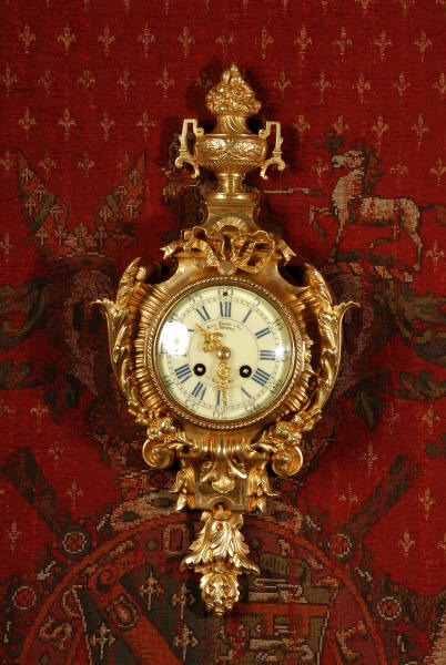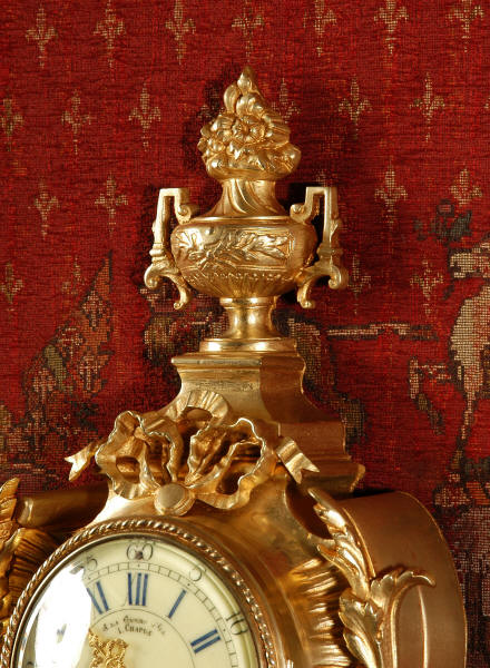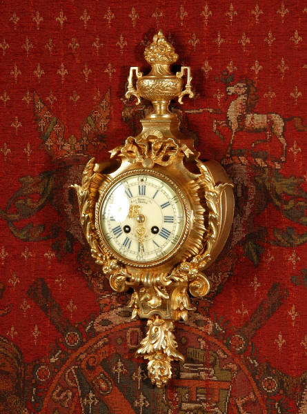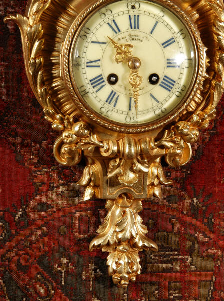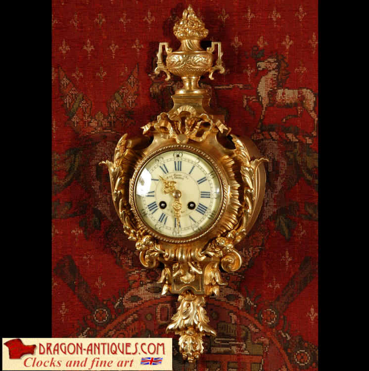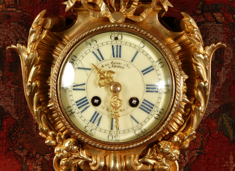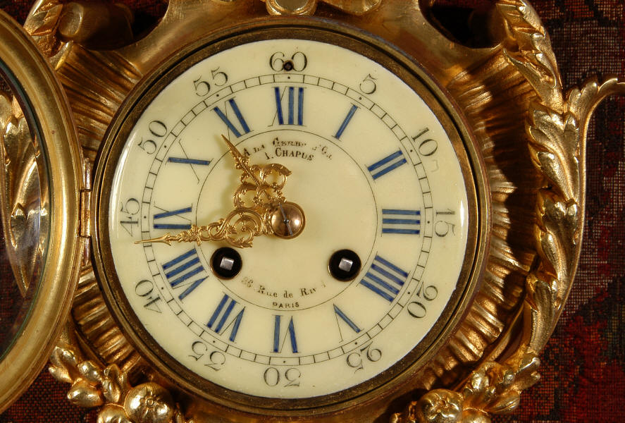 ~ Antique French - Circa 1890 ~ ~~ Excellent condition, fully overhauled ~~ A lovely decorative Cartel wall clock. It is in the style of Louis XVI and is beautifully modelled in brass. It is modelled as an acanthus wreath in which the dial is placed with a bow above. The top of the case has a handled urn with a floral finial. A bunch of acanthus leaves hang down from the base of the clock. The dial is a beautiful convex, cream enamel dial with blue lettering and is complete with the original fretted gilt brass hands and convex glass. It is signed by the retailer A Chapus who is listed as working from 86 Rue De Rivolli, Paris from 1880 to 1915. The movement is by Samuel Marti and has the clockmakers mark on the backplate along with the retailers mark A Chapus. It is of excellent quality as you would expect from this maker and is in excellent condition having been completely overhauled by our clock maker - click the video clip below to hear the bell strike and see the clock running. It runs for 8 days on one wind and strikes half hourly on a bell and is complete with original pendulum. Condition of the case is