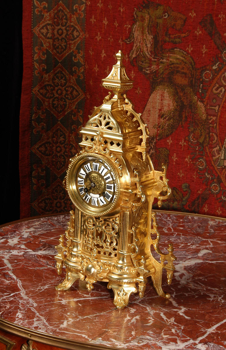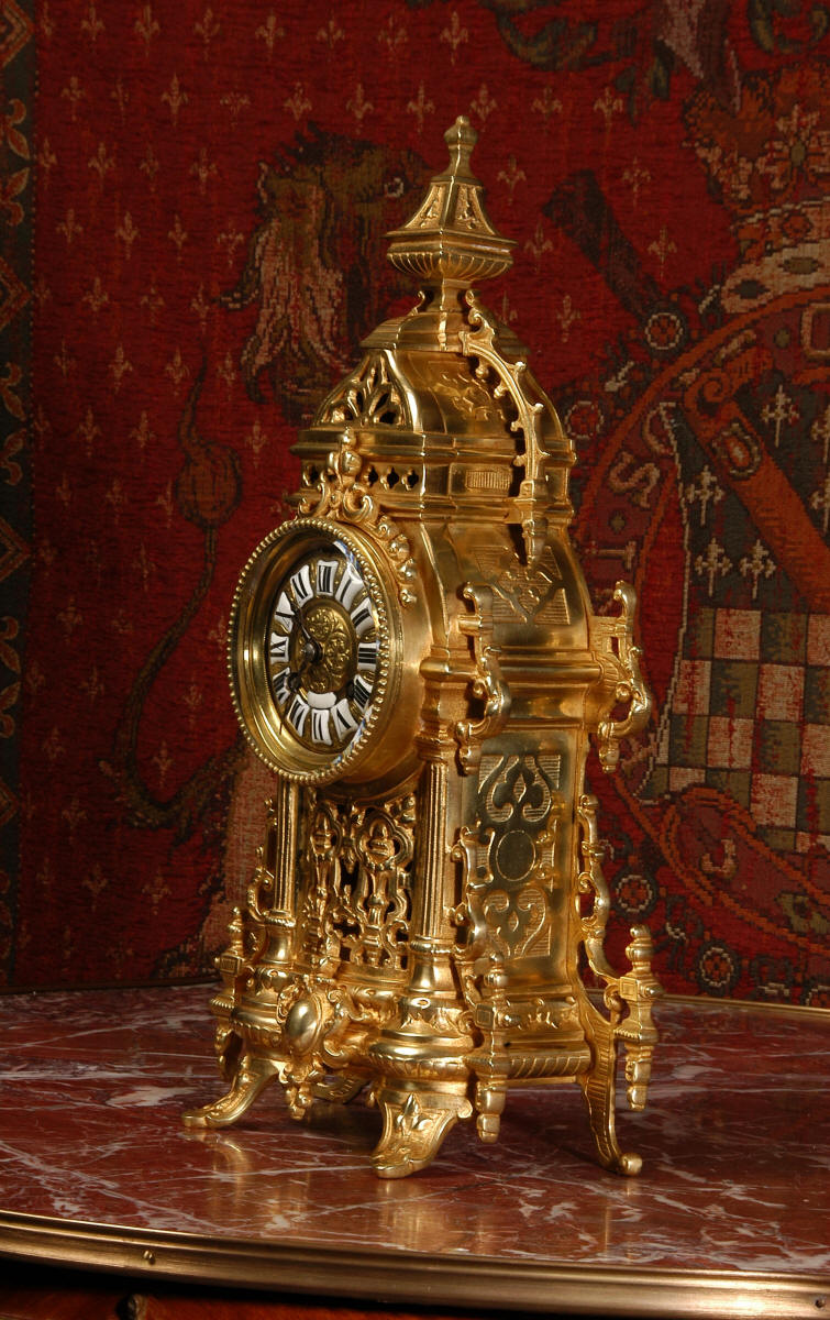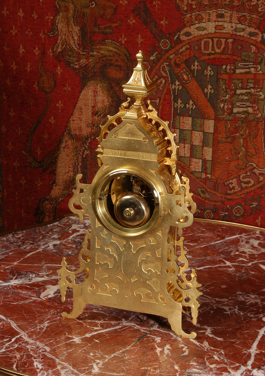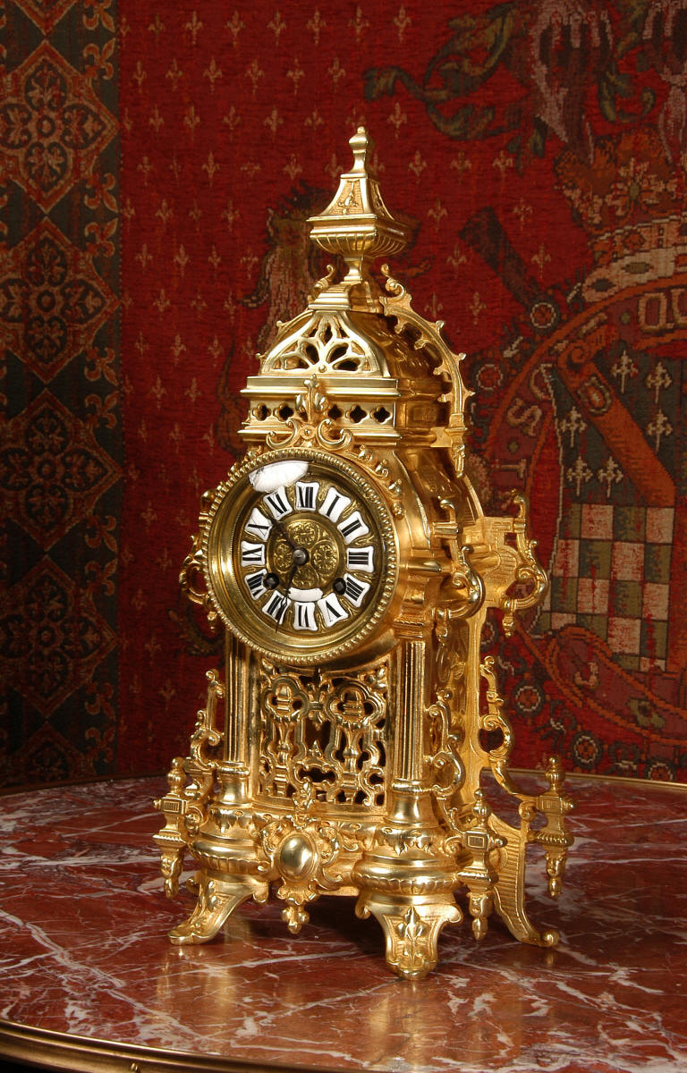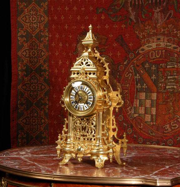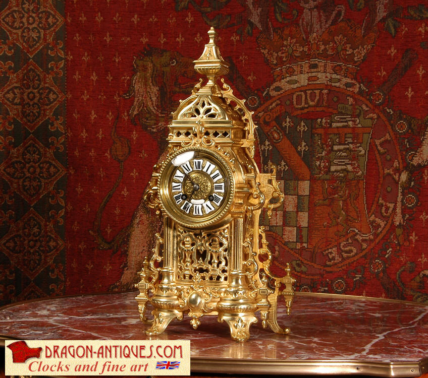 ~ French - Circa 1880 ~ ~~ Excellent condition, fully overhauled ~~ A lovely and very decorative clock of gilded brass. It is shallow enough to fit on most mantles but could also be displayed as a table clock. It is modelled in the Gothic style and has a fretted panel to the front to allow the pendulum to be seen swinging within the case. To each side of the fretted panel are reeded columns and above the dial is a pierced top with a finial. Please scroll down for more pictures The dial is also brass and is mounted with 12 individual enamel cartouches and is covered by convex glass. There is also a retailers cartouche with the signature rubbed. It is complete with original fretted, blued steel hands. The rear door of the clock is also glazed to allow the movement to be seen. The French movement is by Samuel Marti and has the makers mark on the backplate. It is of high quality and is in excellent clean and running condition having been fully overhauled by our clockmaker. Pendulum is a replacement. It runs for 8 days on one wind and strikes the hours and halves on a bell. Click the video clip below to hear the bell and watch the clock running! Condition of the case is excellent with clean and bright finish and there are no losses. There is some minor wear and discolouration. The dial has some slight chipping around the winding holes.