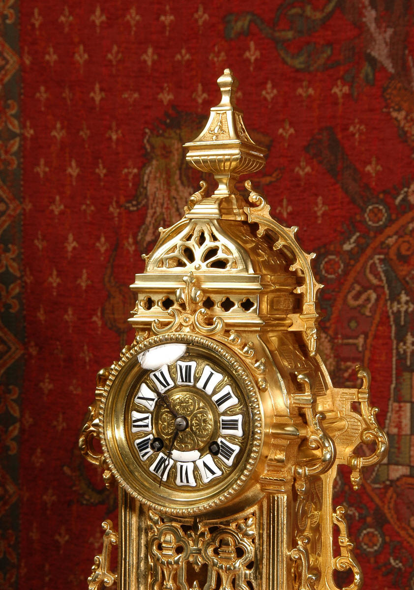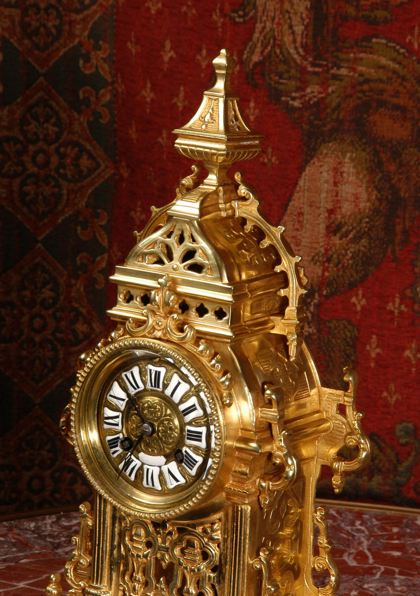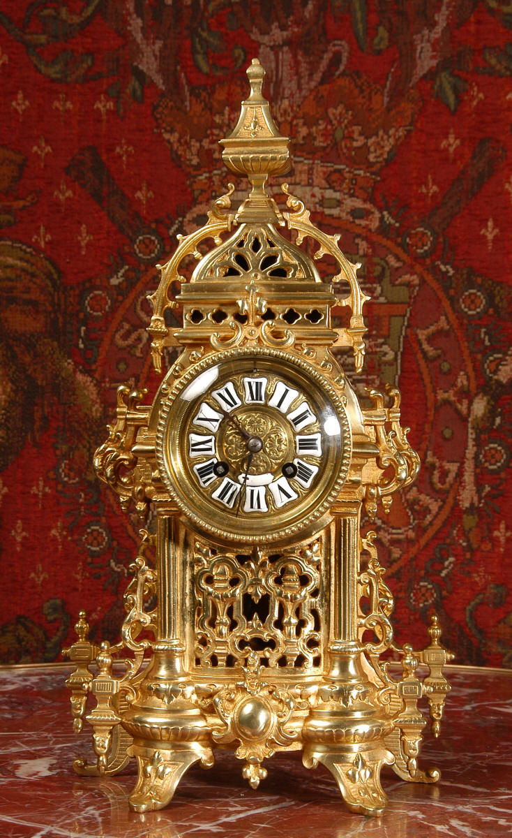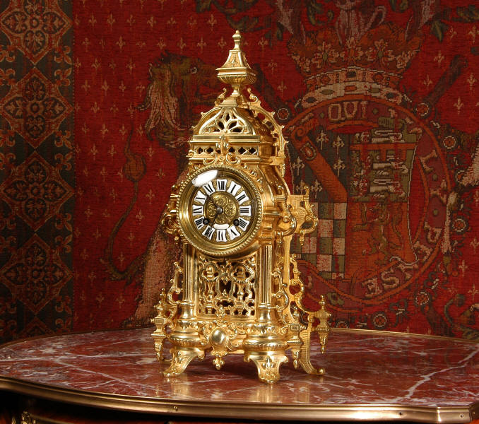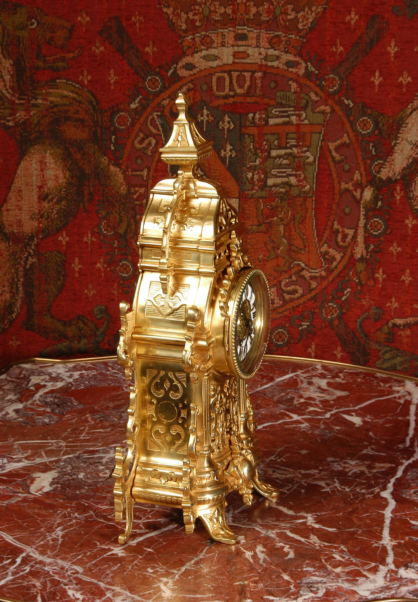 ~ French - Circa 1880 ~ ~~ Excellent condition, fully overhauled ~~ A lovely and very decorative clock of gilded brass. It is shallow enough to fit on most mantles but could also be displayed as a table clock. It is modelled in the Gothic style and has a fretted panel to the front to allow the pendulum to be seen swinging within the case. To each side of the fretted panel are reeded columns and above the dial is a pierced top with a finial. Please scroll down for more pictures The dial is also brass and is mounted with 12 individual enamel cartouches and is covered by convex glass. There is also a retailers cartouche with the signature rubbed. It is complete with original fretted, blued steel hands. The rear door of the clock is also glazed to allow the movement to be seen. The French movement is by Samuel Marti and has the makers mark on the backplate. It is of high quality and is in excellent clean and running condition having been fully overhauled by our clockmaker. Pendulum is a replacement. It runs for 8 days on one wind and strikes the hours and halves on a bell. Click the video clip below to hear the bell and watch the clock running! Condition of the case is excellent with clean and bright finish and there are no losses. There is some minor wear and discolouration. The dial has some slight chipping around the winding holes.