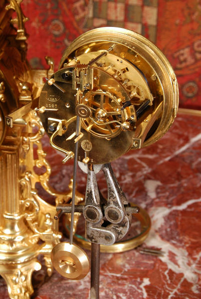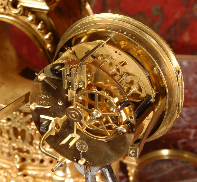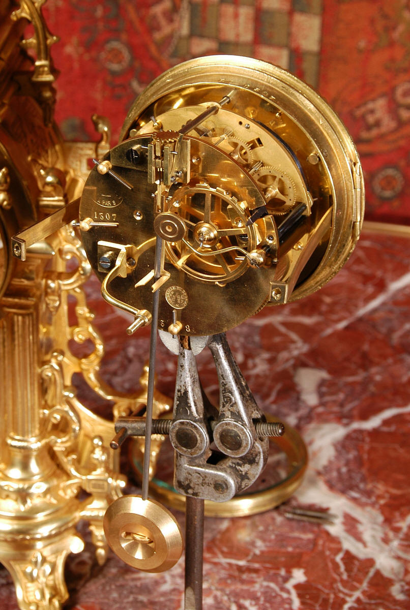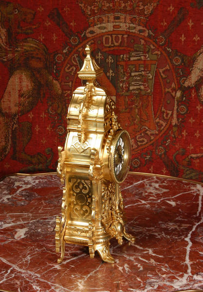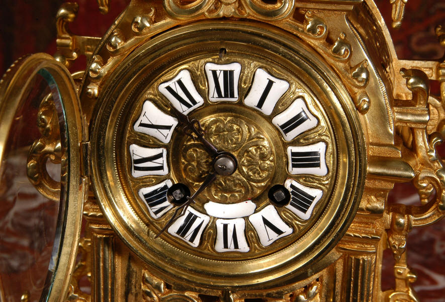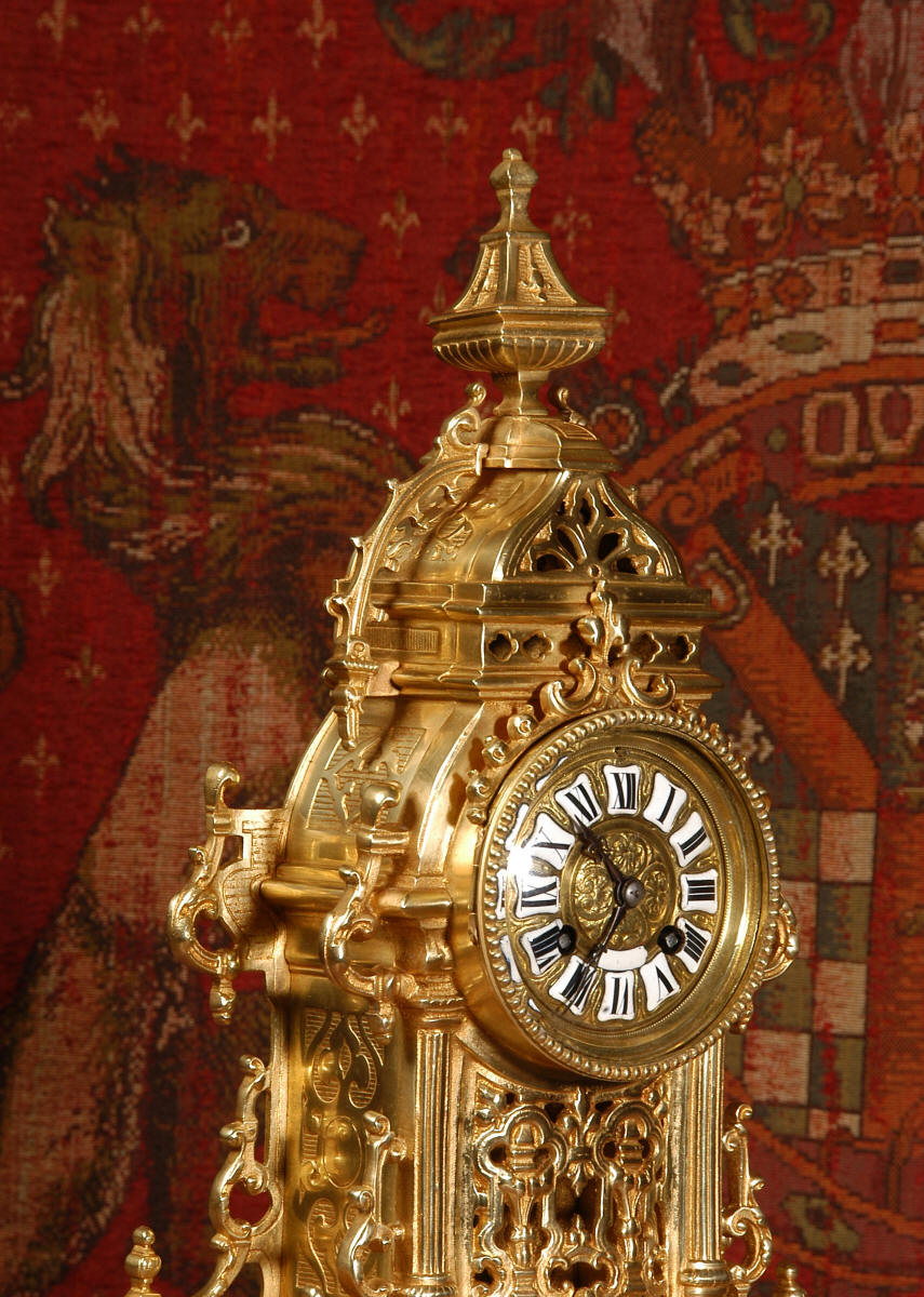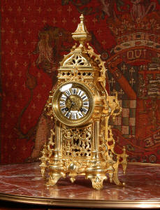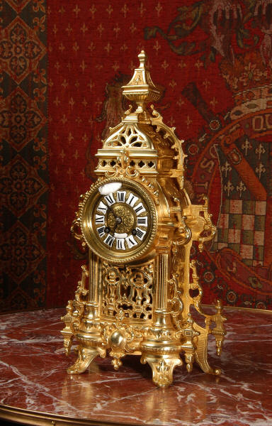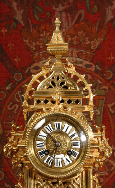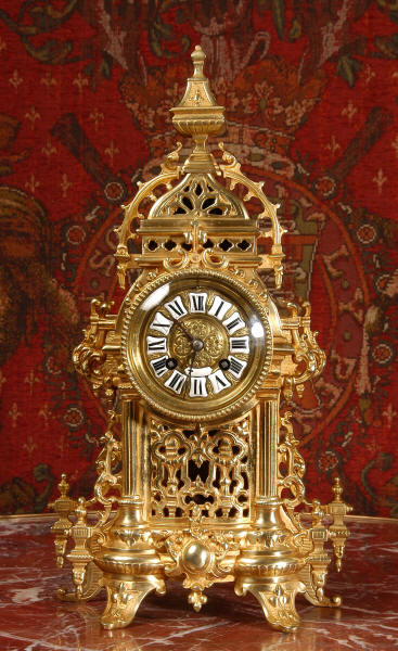 ~ French - Circa 1880 ~ ~~ Excellent condition, fully overhauled ~~ A lovely and very decorative clock of gilded brass. It is shallow enough to fit on most mantles but could also be displayed as a table clock. It is modelled in the Gothic style and has a fretted panel to the front to allow the pendulum to be seen swinging within the case. To each side of the fretted panel are reeded columns and above the dial is a pierced top with a finial. Please scroll down for more pictures The dial is also brass and is mounted with 12 individual enamel cartouches and is covered by convex glass. There is also a retailers cartouche with the signature rubbed. It is complete with original fretted, blued steel hands. The rear door of the clock is also glazed to allow the movement to be seen. The French movement is by Samuel Marti and has the makers mark on the backplate. It is of high quality and is in excellent clean and running condition having been fully overhauled by our clockmaker. Pendulum is a replacement. It runs for 8 days on one wind and strikes the hours and halves on a bell. Click the video clip below to hear the bell and watch the clock running! Condition of the case is excellent with clean and bright finish and there are no losses. There is some minor wear and discolouration. The dial has some slight chipping around the winding holes.
