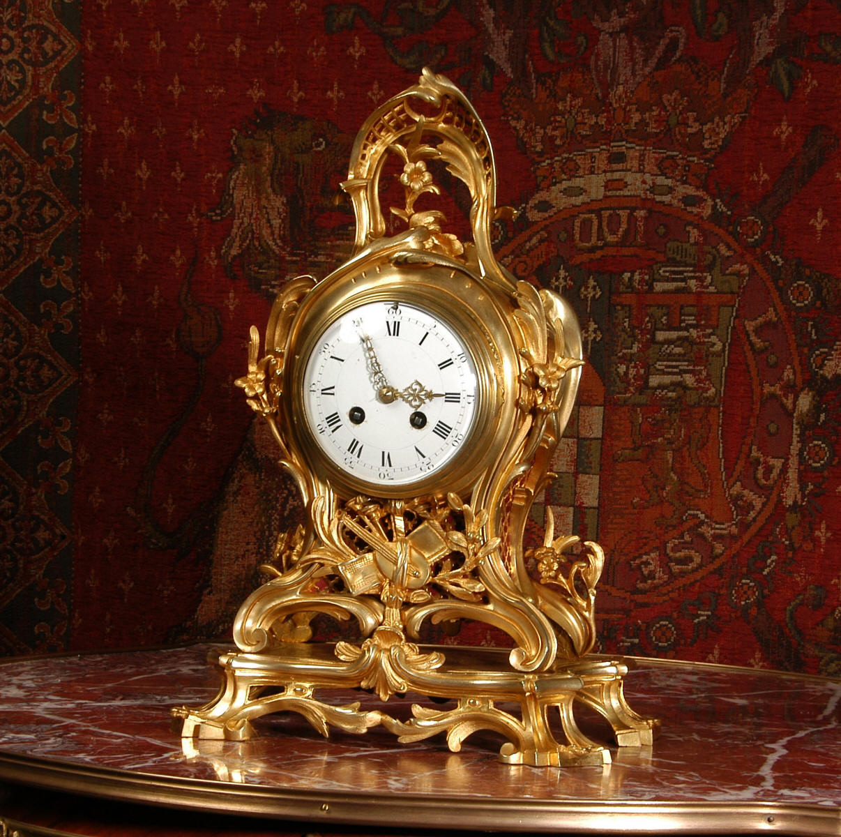 ~ French - Circa 1900 ~ ~~ Excellent condition, fully overhauled ~~ A large and stunning original antique French brass table clock in lovely condition. The style is Rococo, waisted keyhole shape with acanthus leaf shoulders, 'C' scroll bracket feet an elaborate fretted arch with flowers to the top. It stands on its original integral base, heavily modelled with splayed feet and acanthus leaves. The dial is enamel on copper and features beautiful Louis XV style finely fretted hands. The heavy bezel is fitted with convex glass.