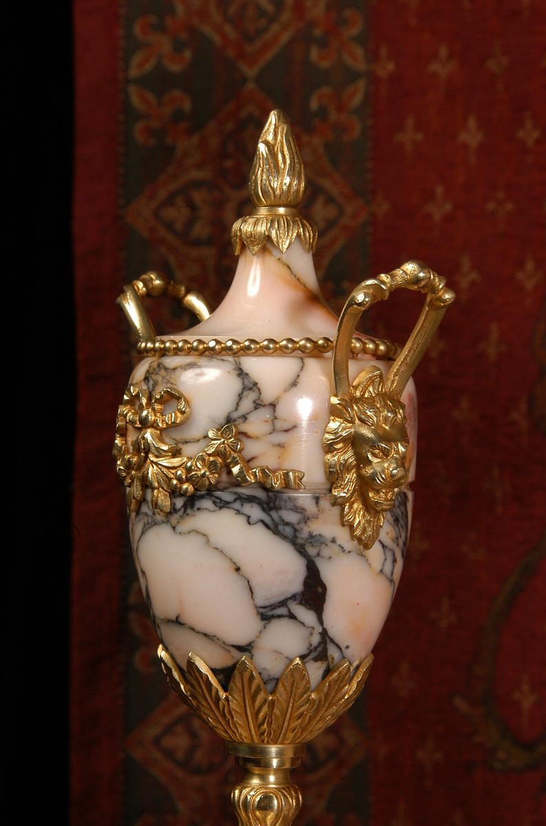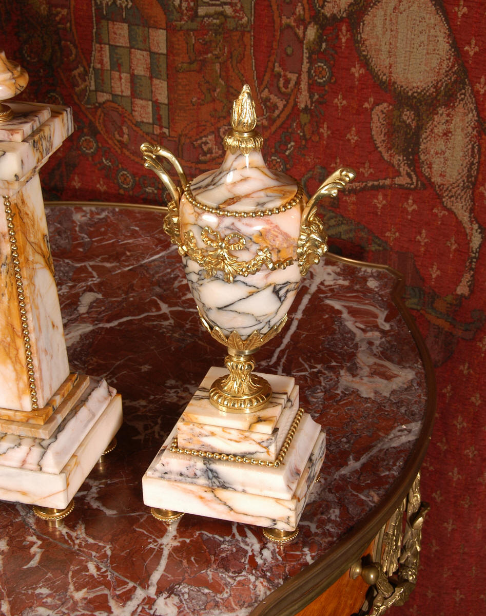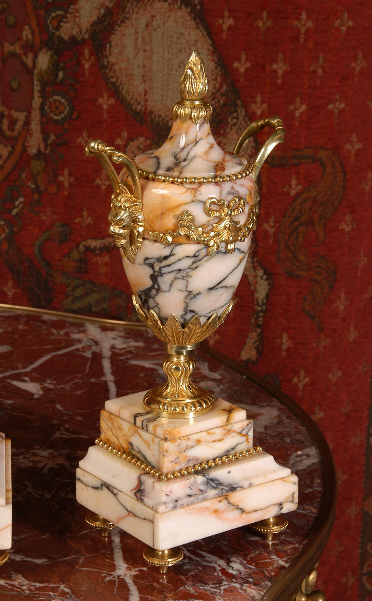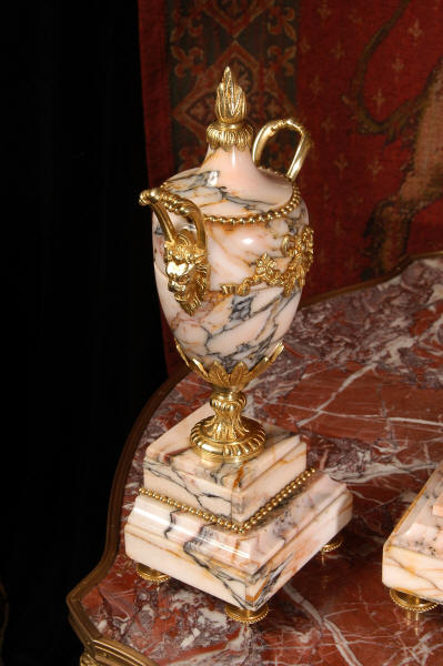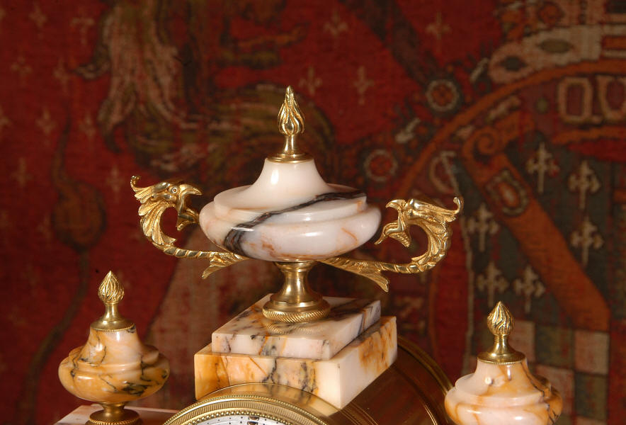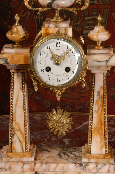 Pendulum depicts the sun god and is also ormolu. The clock is surmounted by a large marble urn with handles of mythical creatures and the side urns have lions mask handles and flame finials. The dial is enamel on copper, exquisitely decorated with floral swags delicately painted between the numbers of the dial. Hands are gilded, fretted brass. The French movement is of the highest quality and has the Japy Freres mark on the movement backplate. It is in excellent clean and running condition having been fully overhauled by our clockmaker. Ormolu pendulum is original. It runs for 8 days and strikes the hours and halves on a bell. Click the video clip below to hear the bell and watch the clock running! Condition of the case is excellent, marble has a very good polish with no major chips or scratches, just the usual tiny nibbles to the edges and a very small chip to the corner of the base of one urn. Ormolu is also in very good condition with a bright and clean finish. Dial is in very good condition with no chips or scratches.