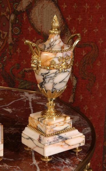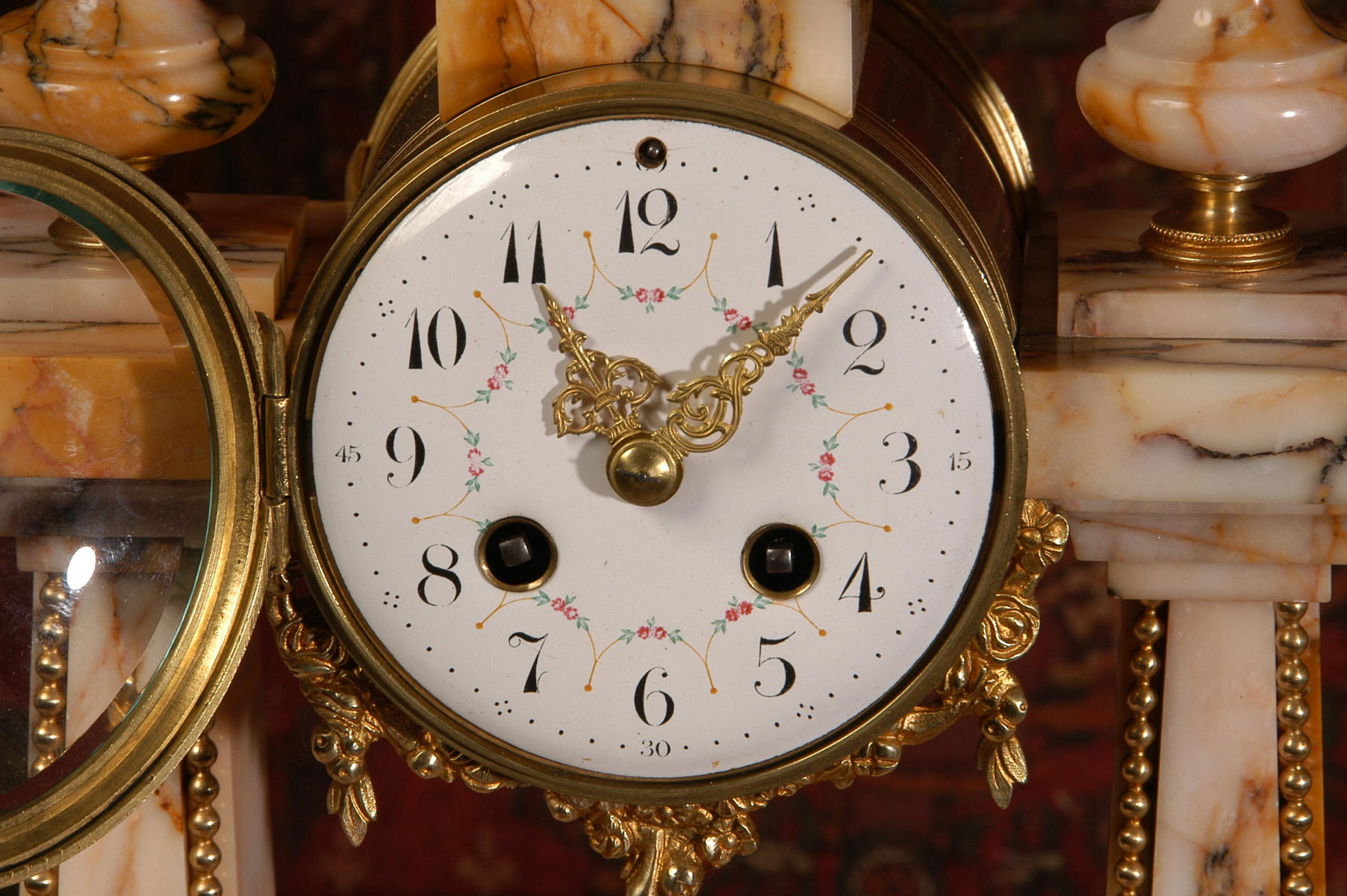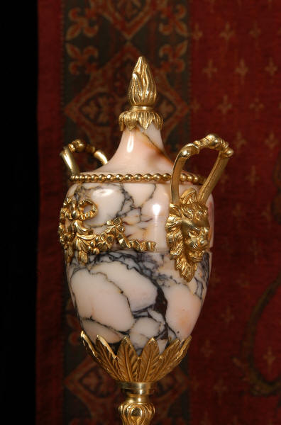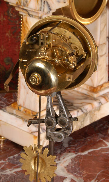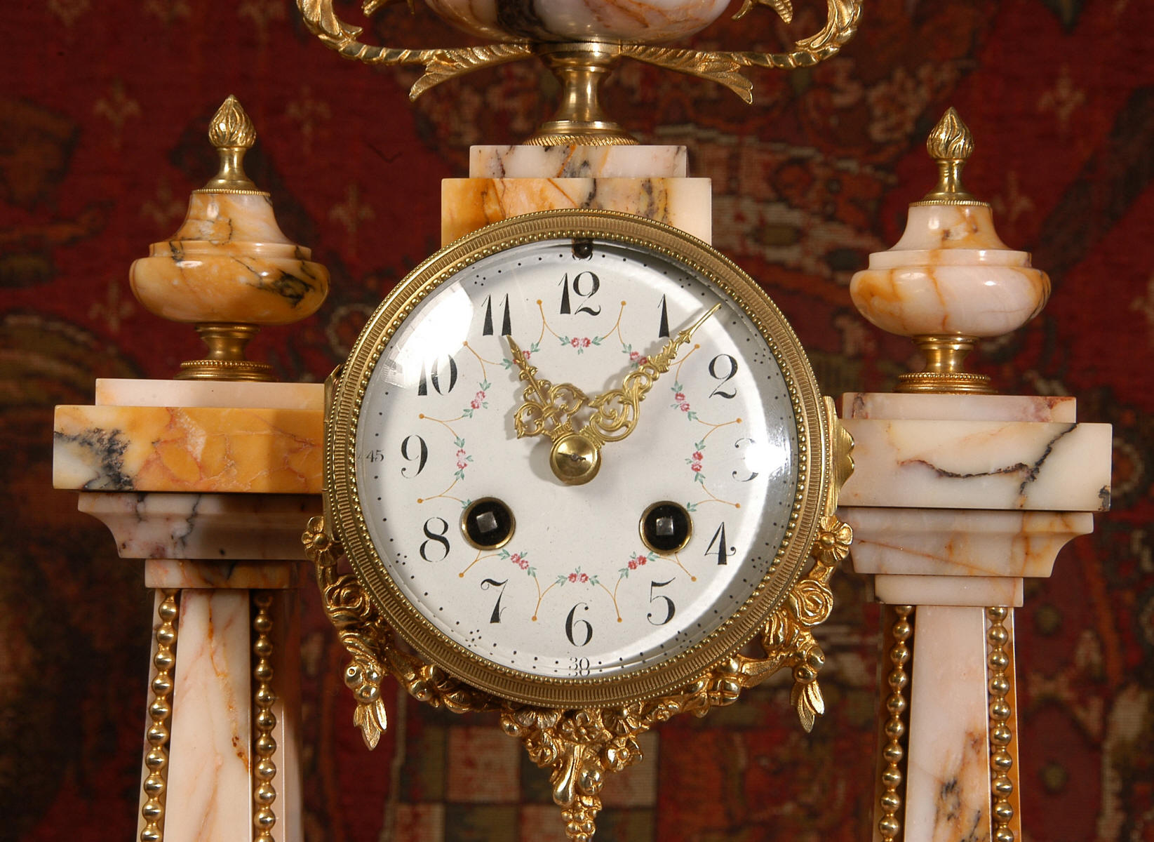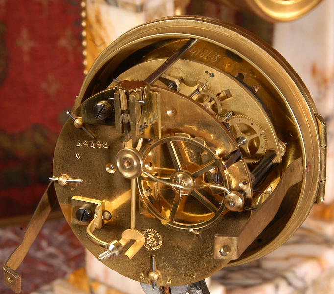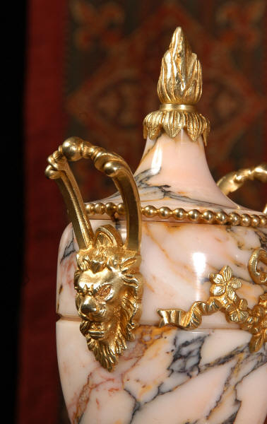 Pendulum depicts the sun god and is also ormolu. The clock is surmounted by a large marble urn with handles of mythical creatures and the side urns have lions mask handles and flame finials. The dial is enamel on copper, exquisitely decorated with floral swags delicately painted between the numbers of the dial. Hands are gilded, fretted brass. The French movement is of the highest quality and has the Japy Freres mark on the movement backplate. It is in excellent clean and running condition having been fully overhauled by our clockmaker. Ormolu pendulum is original. It runs for 8 days and strikes the hours and halves on a bell. Click the video clip below to hear the bell and watch the clock running! Condition of the case is excellent, marble has a very good polish with no major chips or scratches, just the usual tiny nibbles to the edges and a very small chip to the corner of the base of one urn. Ormolu is also in very good condition with a bright and clean finish. Dial is in very good condition with no chips or scratches.