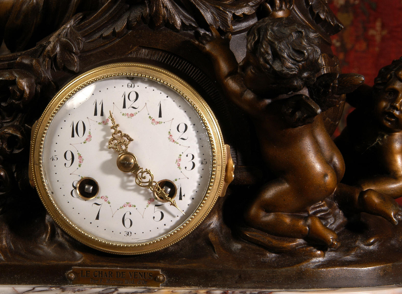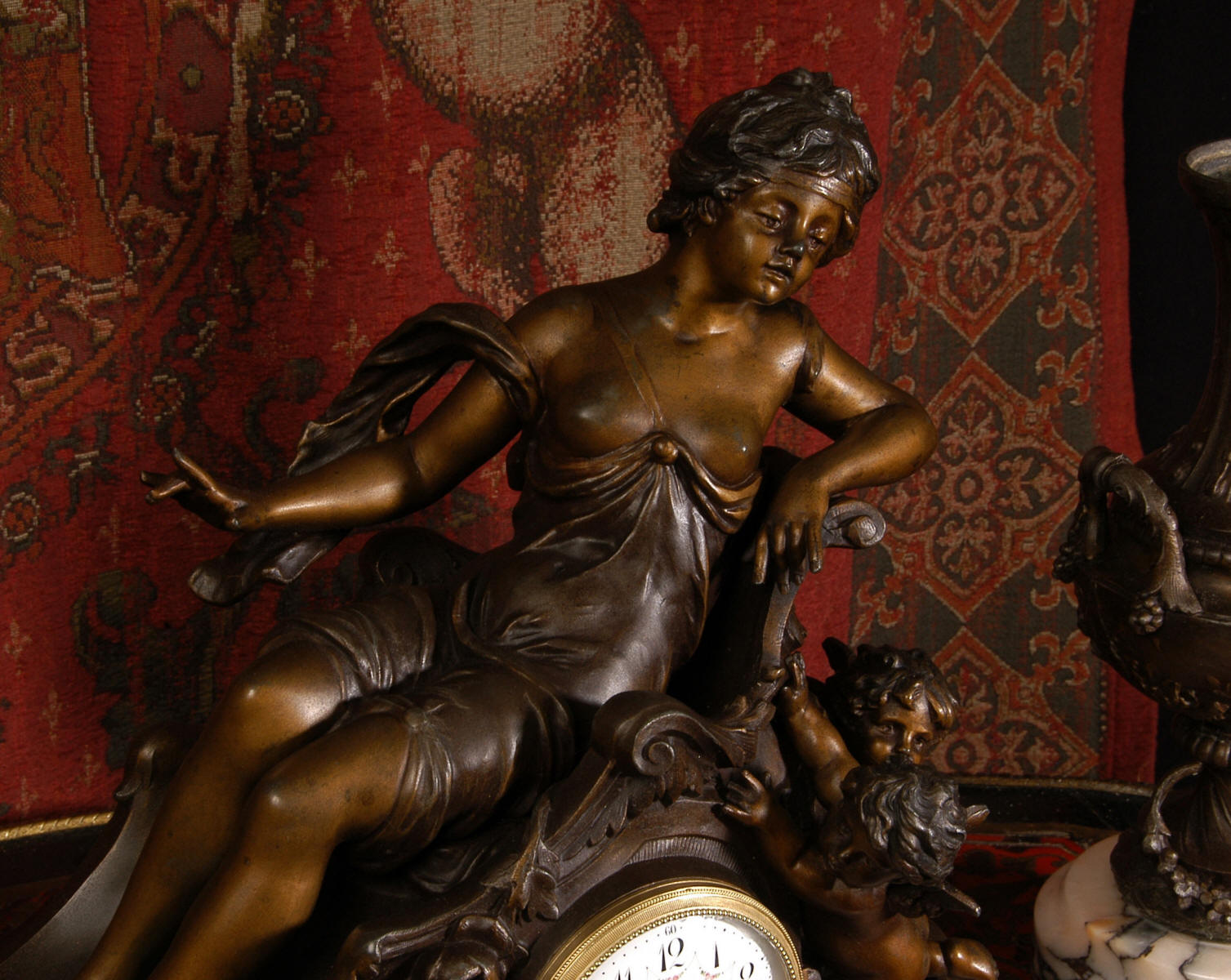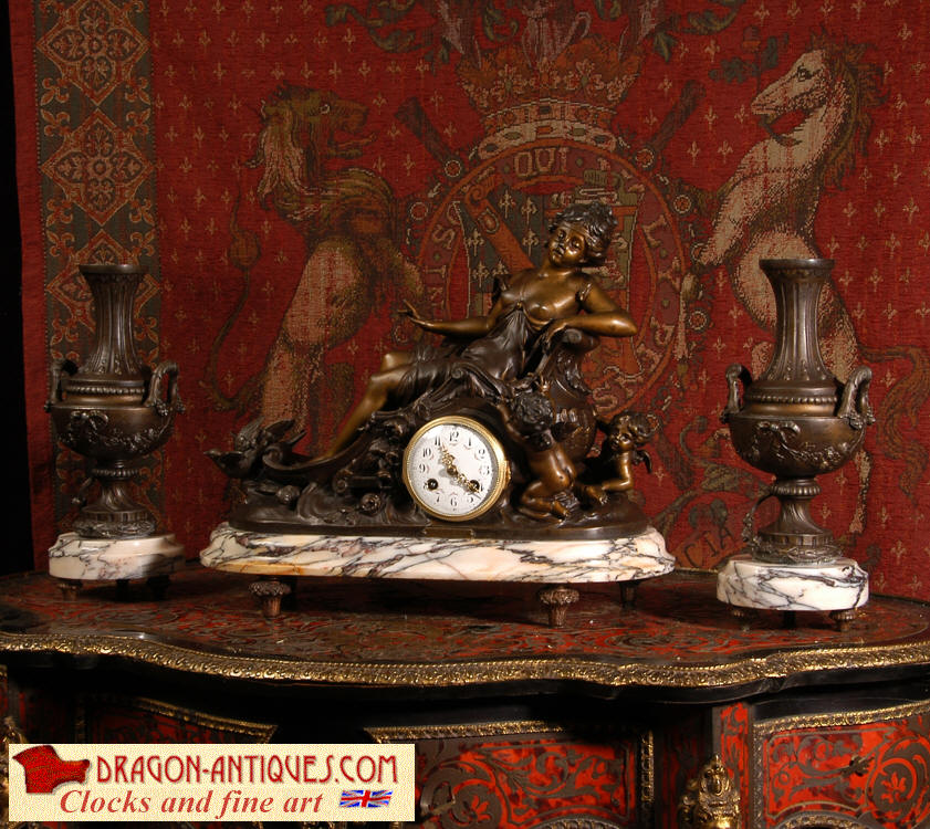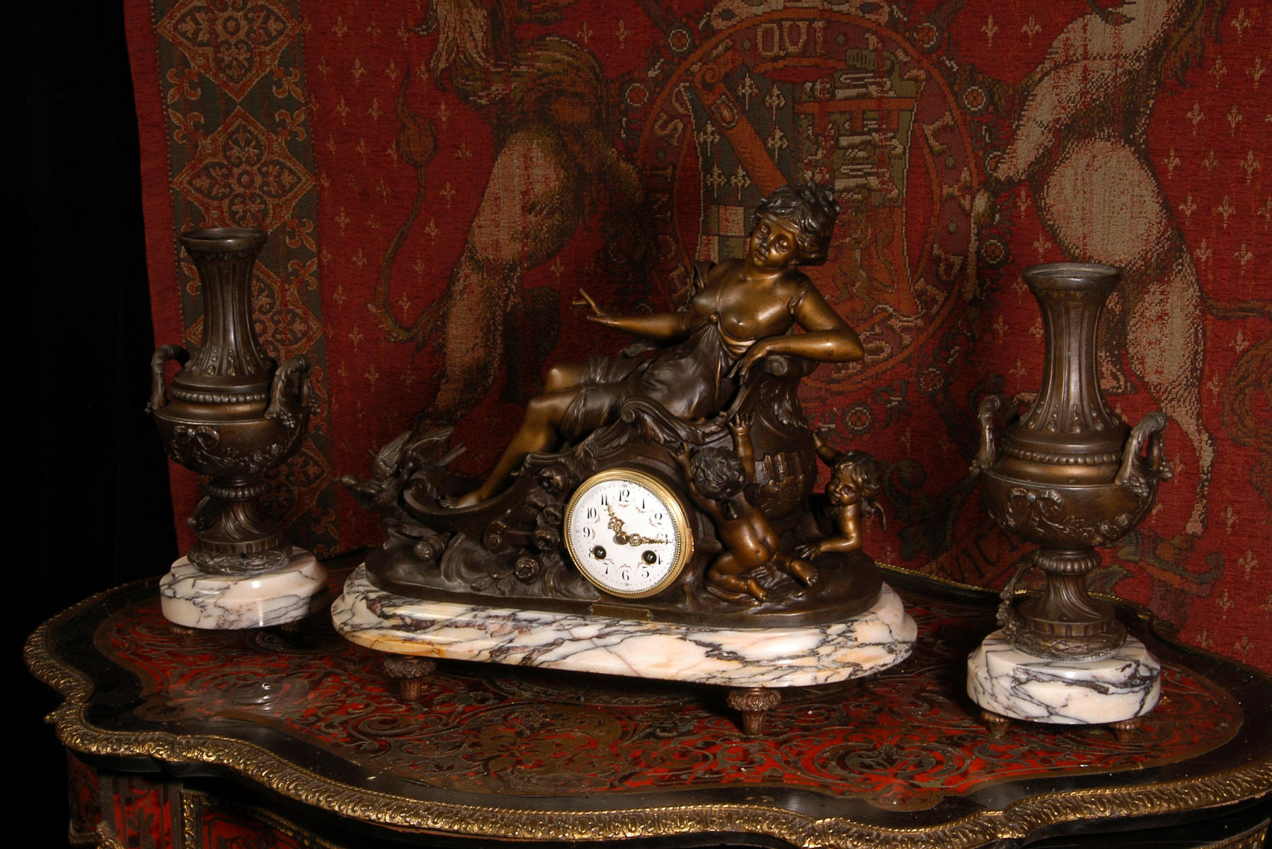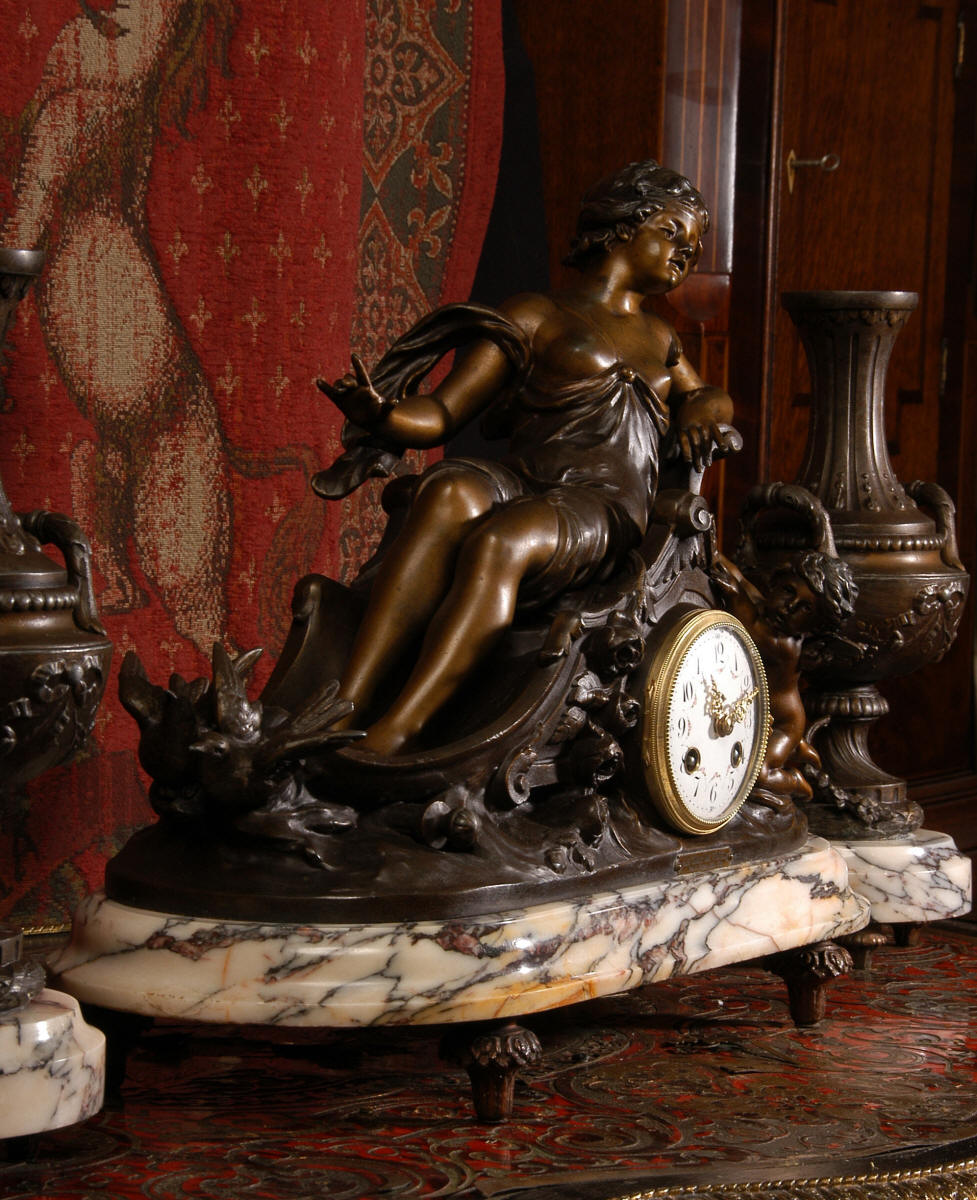 ~ French - Circa 1880 ~ ~~ Excellent condition, fully overhauled ~~ A Stunning, Large Antique French clock set by the sculptor Hippolyte François Moreau entitled Le Char De Venus(The Chariot of Venus). It features a beautifully modelled figure of Venus reclining in her chariot drawn by a pair of Erotes or winged Love-Gods through the clouds. A pair of cherubs cling to the rear of the Chariot. The side vases are classical in style with laurel handles, swags of flowers and bows and are mounted on matching marble bases. The set is beautifully made in patinated bronzed metal mounted on variegated specimen marble bases, it is in very good condition. A plaque is mounted on the front of the case with the artist and the title of the piece. It is modelled in the round and so would display beautifully in the centre of a room. Hippolyte François Moreau (1832-1927) was the second son of Jean-Baptiste Moreau, Hippolyte Moreau went to work in Paris under the direction of Jouffroy and exhibited his first work at the Salon in 1859. The best of his work includes charming full figures of children and young women, mostly allegorical, often with the same subjects as used by Hippolyte's brother Auguste. He is well listed and known, see the Artprice database for more information. The French movement is of by Japy Freres and has the makers mark on the movement backplate. It is of the makers usual high quality and is in excellent clean and running condition having been fully overhauled by our clockmaker. Pendulum is a replacement. It runs for 8 days and strikes the hours and halves on a bell. Click the video clip below to hear the bell and watch the clock running! Condition of the case is excellent with clean and bright finish and there are no losses. There is some wear on the high spots and a few minor areas of discolouration or marks to the original patination, particularly to the vases. Marble is in excellent condition with just some minor nibbles on the edges. It has a good polish. Dial is also in excellent condition with just slight chip to the edge that is not noticeable with the bezel closed. A stunning clock set, a centrepiece for your room and collection!