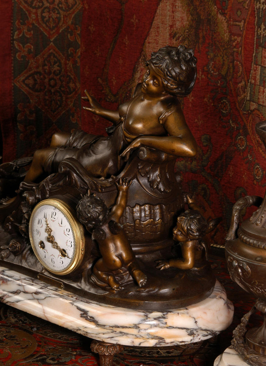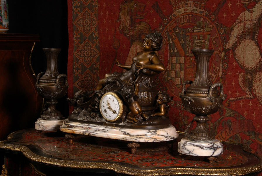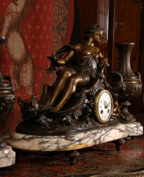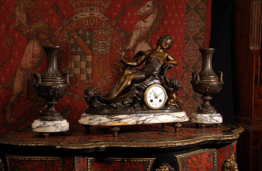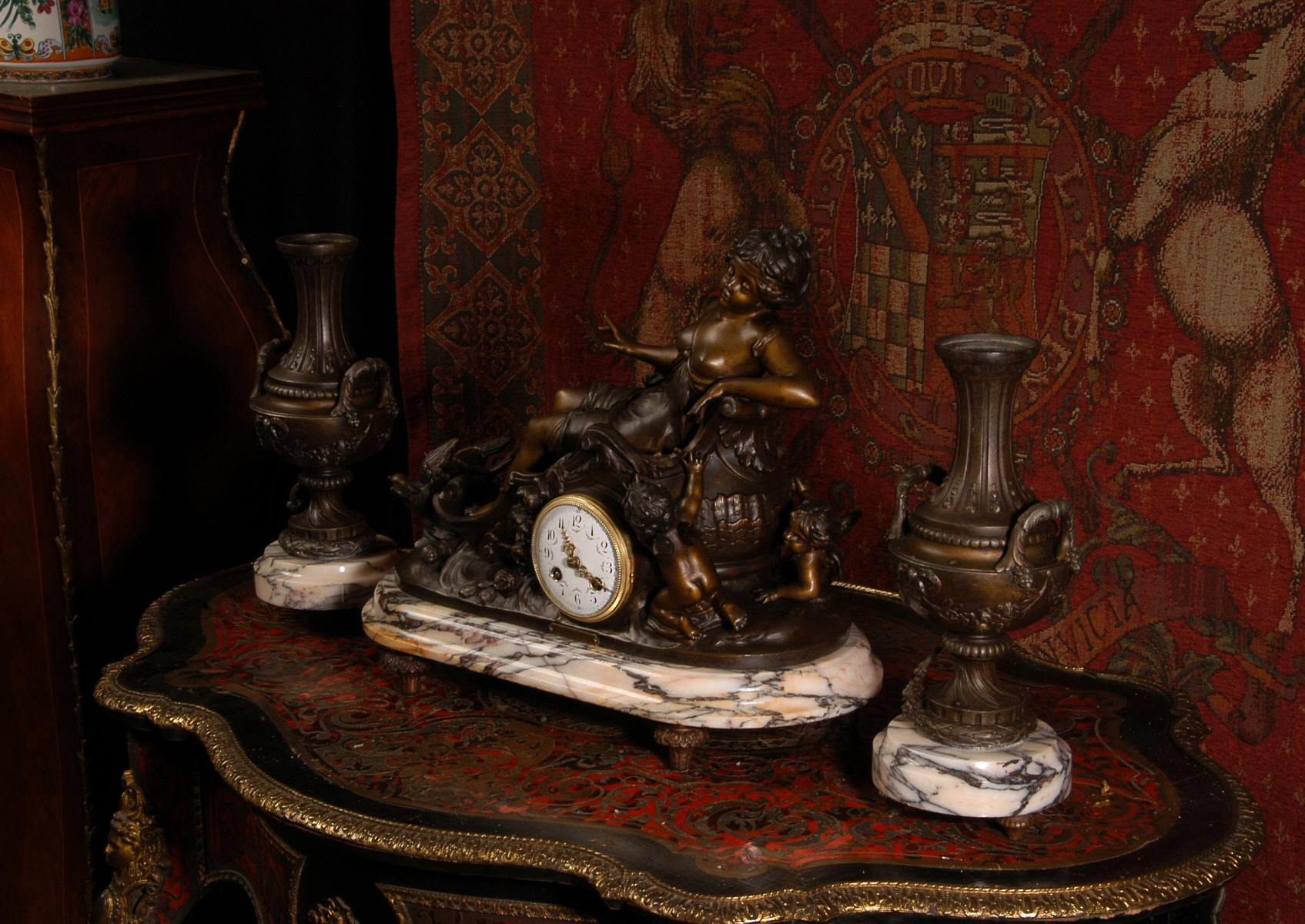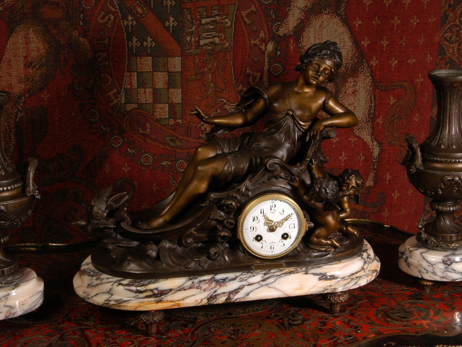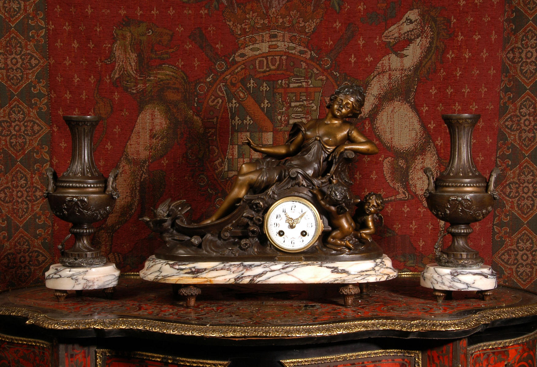 ~ French - Circa 1880 ~ ~~ Excellent condition, fully overhauled ~~ A Stunning, Large Antique French clock set by the sculptor Hippolyte François Moreau entitled Le Char De Venus(The Chariot of Venus). It features a beautifully modelled figure of Venus reclining in her chariot drawn by a pair of Erotes or winged Love-Gods through the clouds. A pair of cherubs cling to the rear of the Chariot. The side vases are classical in style with laurel handles, swags of flowers and bows and are mounted on matching marble bases. The set is beautifully made in patinated bronzed metal mounted on variegated specimen marble bases, it is in very good condition. A plaque is mounted on the front of the case with the artist and the title of the piece. It is modelled in the round and so would display beautifully in the centre of a room. Hippolyte François Moreau (1832-1927) was the second son of Jean-Baptiste Moreau, Hippolyte Moreau went to work in Paris under the direction of Jouffroy and exhibited his first work at the Salon in 1859. The best of his work includes charming full figures of children and young women, mostly allegorical, often with the same subjects as used by Hippolyte's brother Auguste. He is well listed and known, see the Artprice database for more information. The French movement is of by Japy Freres and has the makers mark on the movement backplate. It is of the makers usual high quality and is in excellent clean and running condition having been fully overhauled by our clockmaker. Pendulum is a replacement. It runs for 8 days and strikes the hours and halves on a bell. Click the video clip below to hear the bell and watch the clock running! Condition of the case is excellent with clean and bright finish and there are no losses. There is some wear on the high spots and a few minor areas of discolouration or marks to the original patination, particularly to the vases. Marble is in excellent condition with just some minor nibbles on the edges. It has a good polish. Dial is also in excellent condition with just slight chip to the edge that is not noticeable with the bezel closed. A stunning clock set, a centrepiece for your room and collection!