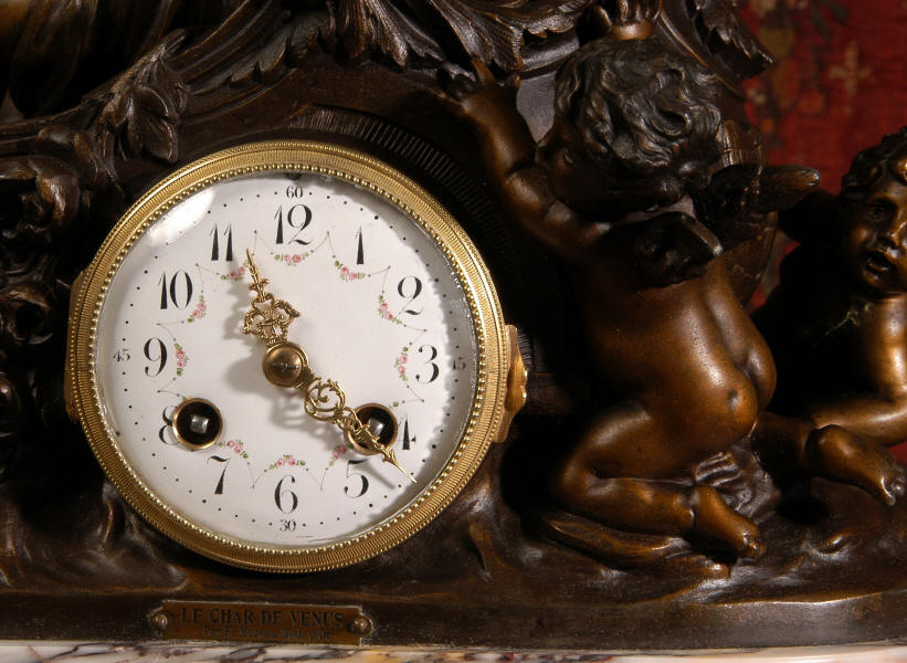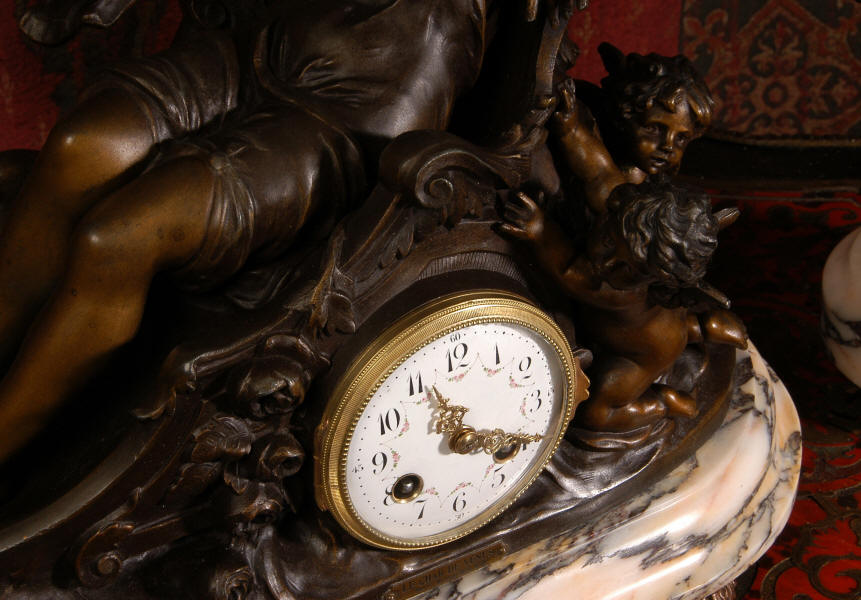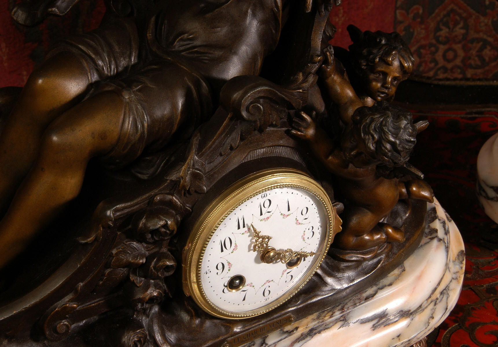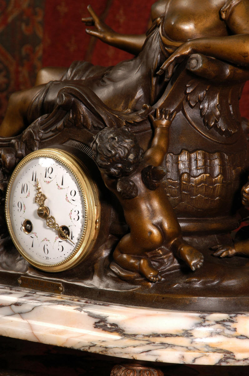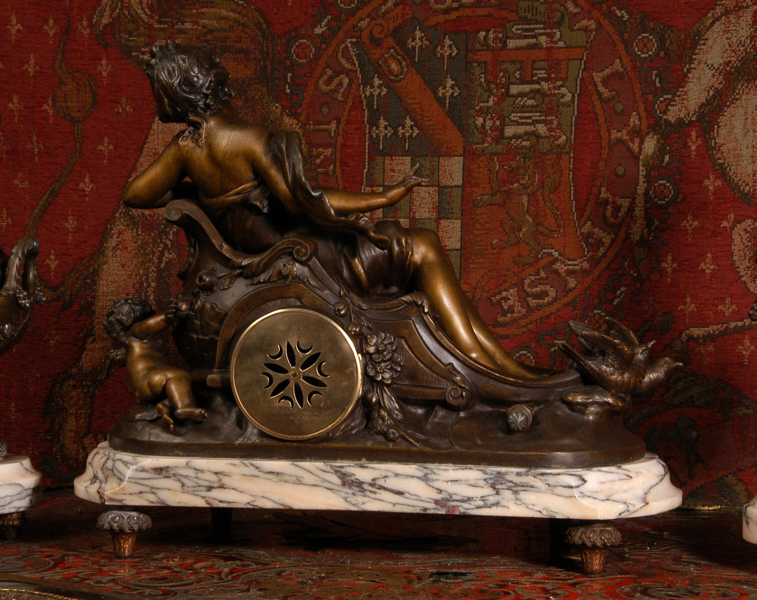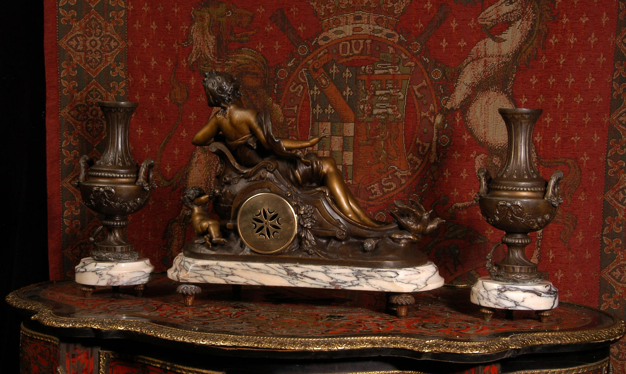 ~ French - Circa 1880 ~ ~~ Excellent condition, fully overhauled ~~ A Stunning, Large Antique French clock set by the sculptor Hippolyte François Moreau entitled Le Char De Venus(The Chariot of Venus). It features a beautifully modelled figure of Venus reclining in her chariot drawn by a pair of Erotes or winged Love-Gods through the clouds. A pair of cherubs cling to the rear of the Chariot. The side vases are classical in style with laurel handles, swags of flowers and bows and are mounted on matching marble bases. The set is beautifully made in patinated bronzed metal mounted on variegated specimen marble bases, it is in very good condition. A plaque is mounted on the front of the case with the artist and the title of the piece. It is modelled in the round and so would display beautifully in the centre of a room. Hippolyte François Moreau (1832-1927) was the second son of Jean-Baptiste Moreau, Hippolyte Moreau went to work in Paris under the direction of Jouffroy and exhibited his first work at the Salon in 1859. The best of his work includes charming full figures of children and young women, mostly allegorical, often with the same subjects as used by Hippolyte's brother Auguste. He is well listed and known, see the Artprice database for more information. The French movement is of by Japy Freres and has the makers mark on the movement backplate. It is of the makers usual high quality and is in excellent clean and running condition having been fully overhauled by our clockmaker. Pendulum is a replacement. It runs for 8 days and strikes the hours and halves on a bell. Click the video clip below to hear the bell and watch the clock running! Condition of the case is excellent with clean and bright finish and there are no losses. There is some wear on the high spots and a few minor areas of discolouration or marks to the original patination, particularly to the vases. Marble is in excellent condition with just some minor nibbles on the edges. It has a good polish. Dial is also in excellent condition with just slight chip to the edge that is not noticeable with the bezel closed. A stunning clock set, a centrepiece for your room and collection!
