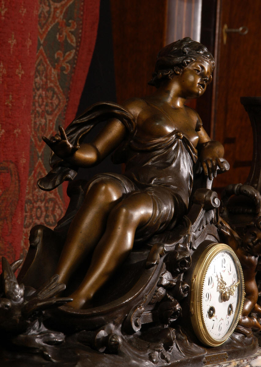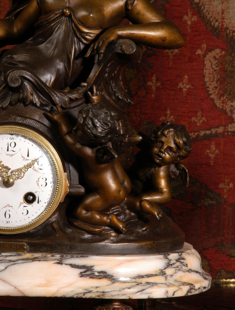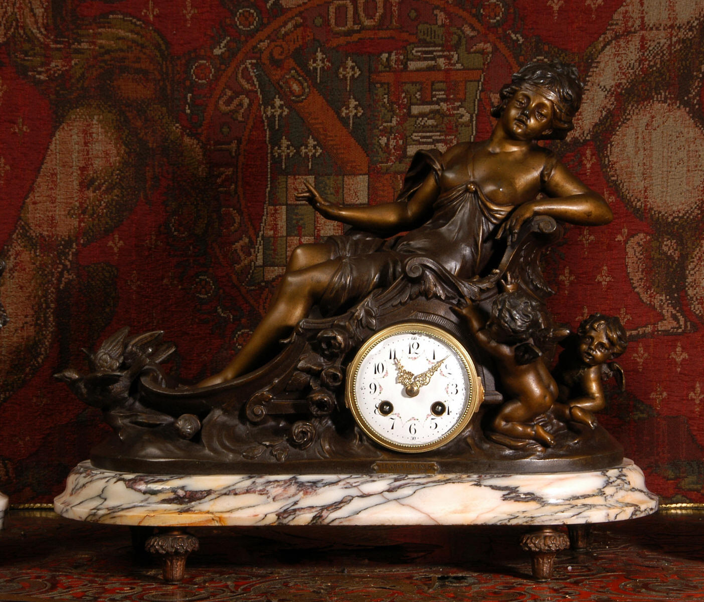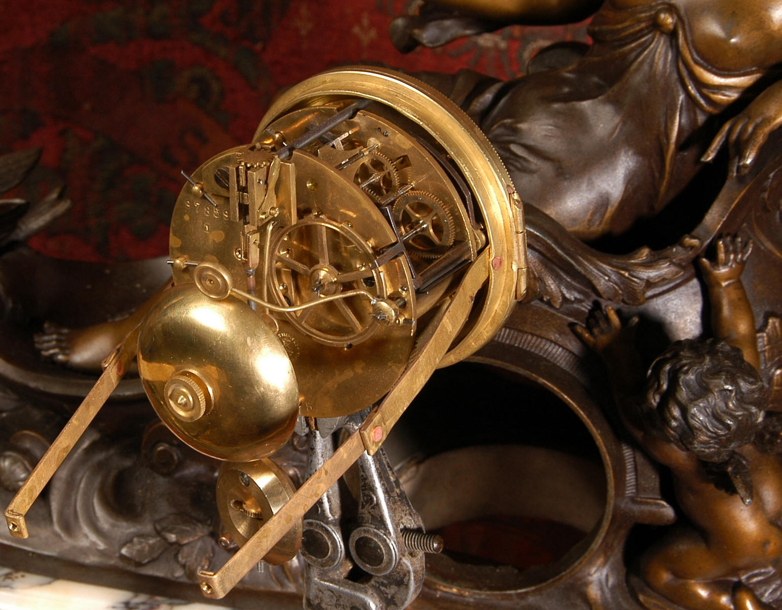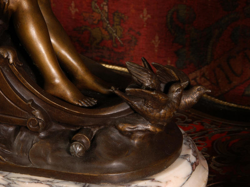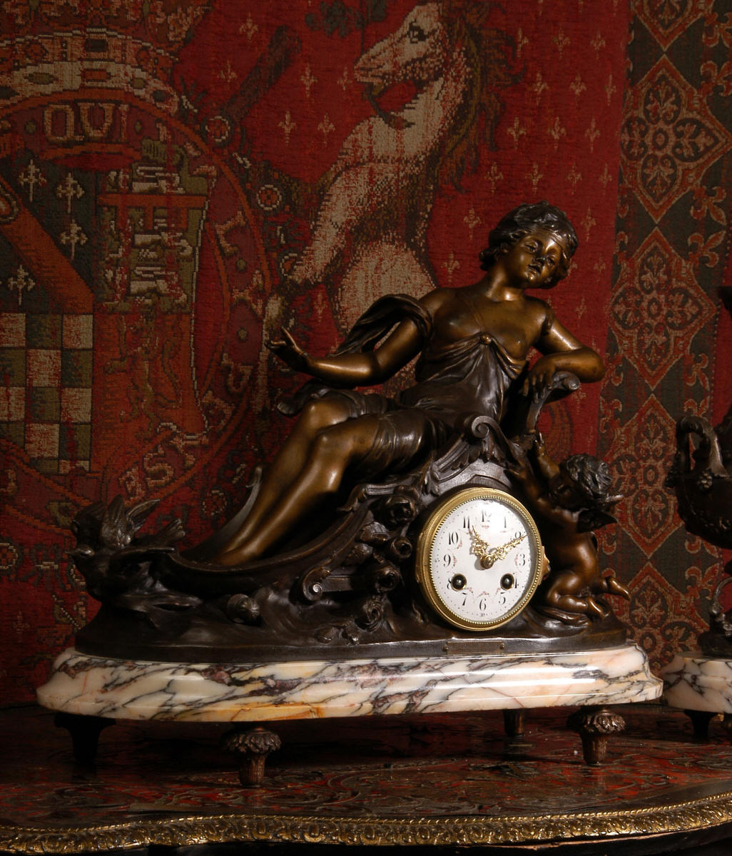 ~ French - Circa 1880 ~ ~~ Excellent condition, fully overhauled ~~ A Stunning, Large Antique French clock set by the sculptor Hippolyte François Moreau entitled Le Char De Venus(The Chariot of Venus). It features a beautifully modelled figure of Venus reclining in her chariot drawn by a pair of Erotes or winged Love-Gods through the clouds. A pair of cherubs cling to the rear of the Chariot. The side vases are classical in style with laurel handles, swags of flowers and bows and are mounted on matching marble bases. The set is beautifully made in patinated bronzed metal mounted on variegated specimen marble bases, it is in very good condition. A plaque is mounted on the front of the case with the artist and the title of the piece. It is modelled in the round and so would display beautifully in the centre of a room. Hippolyte François Moreau (1832-1927) was the second son of Jean-Baptiste Moreau, Hippolyte Moreau went to work in Paris under the direction of Jouffroy and exhibited his first work at the Salon in 1859. The best of his work includes charming full figures of children and young women, mostly allegorical, often with the same subjects as used by Hippolyte's brother Auguste. He is well listed and known, see the Artprice database for more information. The French movement is of by Japy Freres and has the makers mark on the movement backplate. It is of the makers usual high quality and is in excellent clean and running condition having been fully overhauled by our clockmaker. Pendulum is a replacement. It runs for 8 days and strikes the hours and halves on a bell. Click the video clip below to hear the bell and watch the clock running! Condition of the case is excellent with clean and bright finish and there are no losses. There is some wear on the high spots and a few minor areas of discolouration or marks to the original patination, particularly to the vases. Marble is in excellent condition with just some minor nibbles on the edges. It has a good polish. Dial is also in excellent condition with just slight chip to the edge that is not noticeable with the bezel closed. A stunning clock set, a centrepiece for your room and collection!