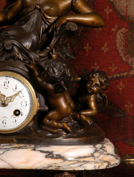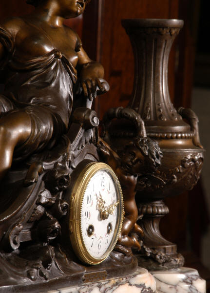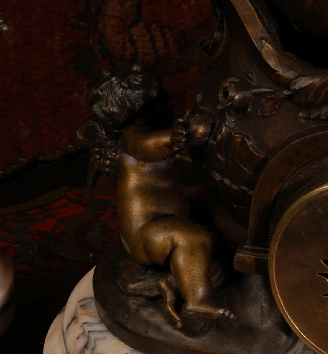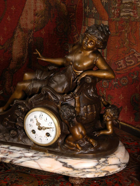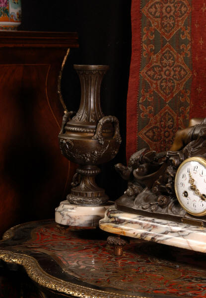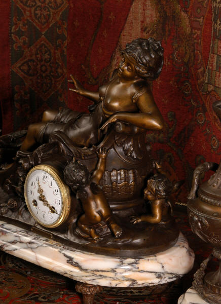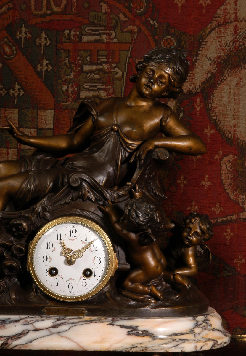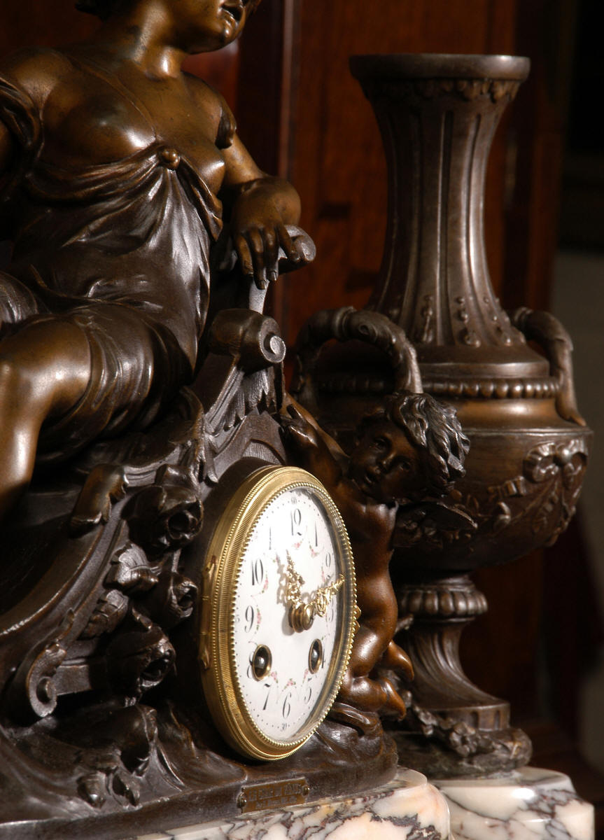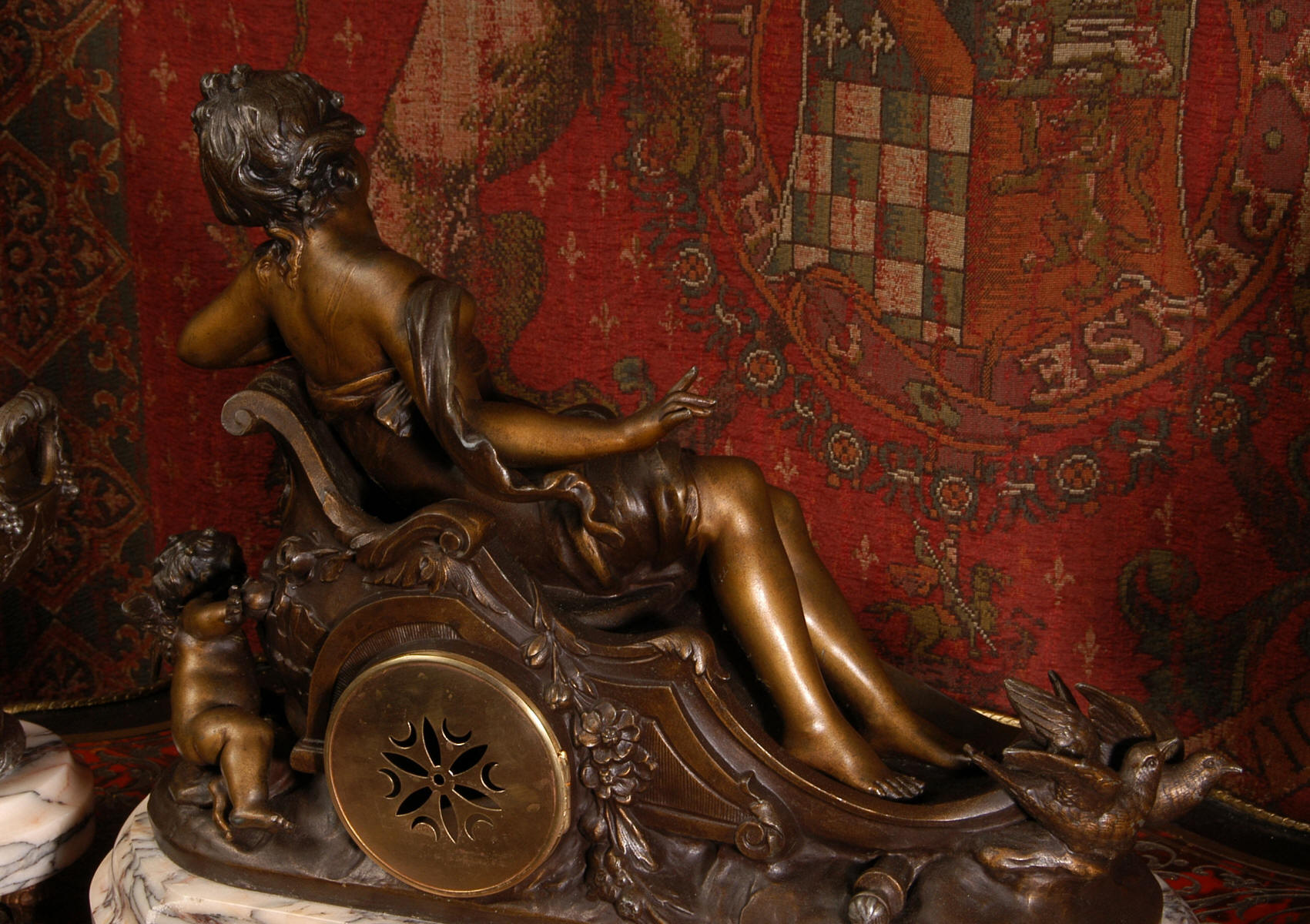 ~ French - Circa 1880 ~ ~~ Excellent condition, fully overhauled ~~ A Stunning, Large Antique French clock set by the sculptor Hippolyte François Moreau entitled Le Char De Venus(The Chariot of Venus). It features a beautifully modelled figure of Venus reclining in her chariot drawn by a pair of Erotes or winged Love-Gods through the clouds. A pair of cherubs cling to the rear of the Chariot. The side vases are classical in style with laurel handles, swags of flowers and bows and are mounted on matching marble bases. The set is beautifully made in patinated bronzed metal mounted on variegated specimen marble bases, it is in very good condition. A plaque is mounted on the front of the case with the artist and the title of the piece. It is modelled in the round and so would display beautifully in the centre of a room. Hippolyte François Moreau (1832-1927) was the second son of Jean-Baptiste Moreau, Hippolyte Moreau went to work in Paris under the direction of Jouffroy and exhibited his first work at the Salon in 1859. The best of his work includes charming full figures of children and young women, mostly allegorical, often with the same subjects as used by Hippolyte's brother Auguste. He is well listed and known, see the Artprice database for more information. The French movement is of by Japy Freres and has the makers mark on the movement backplate. It is of the makers usual high quality and is in excellent clean and running condition having been fully overhauled by our clockmaker. Pendulum is a replacement. It runs for 8 days and strikes the hours and halves on a bell. Click the video clip below to hear the bell and watch the clock running! Condition of the case is excellent with clean and bright finish and there are no losses. There is some wear on the high spots and a few minor areas of discolouration or marks to the original patination, particularly to the vases. Marble is in excellent condition with just some minor nibbles on the edges. It has a good polish. Dial is also in excellent condition with just slight chip to the edge that is not noticeable with the bezel closed. A stunning clock set, a centrepiece for your room and collection!