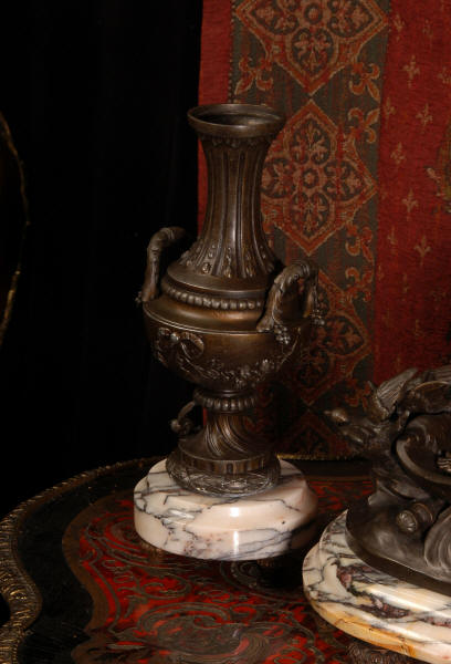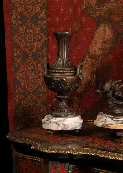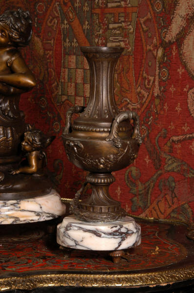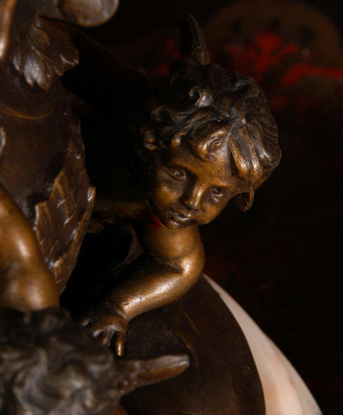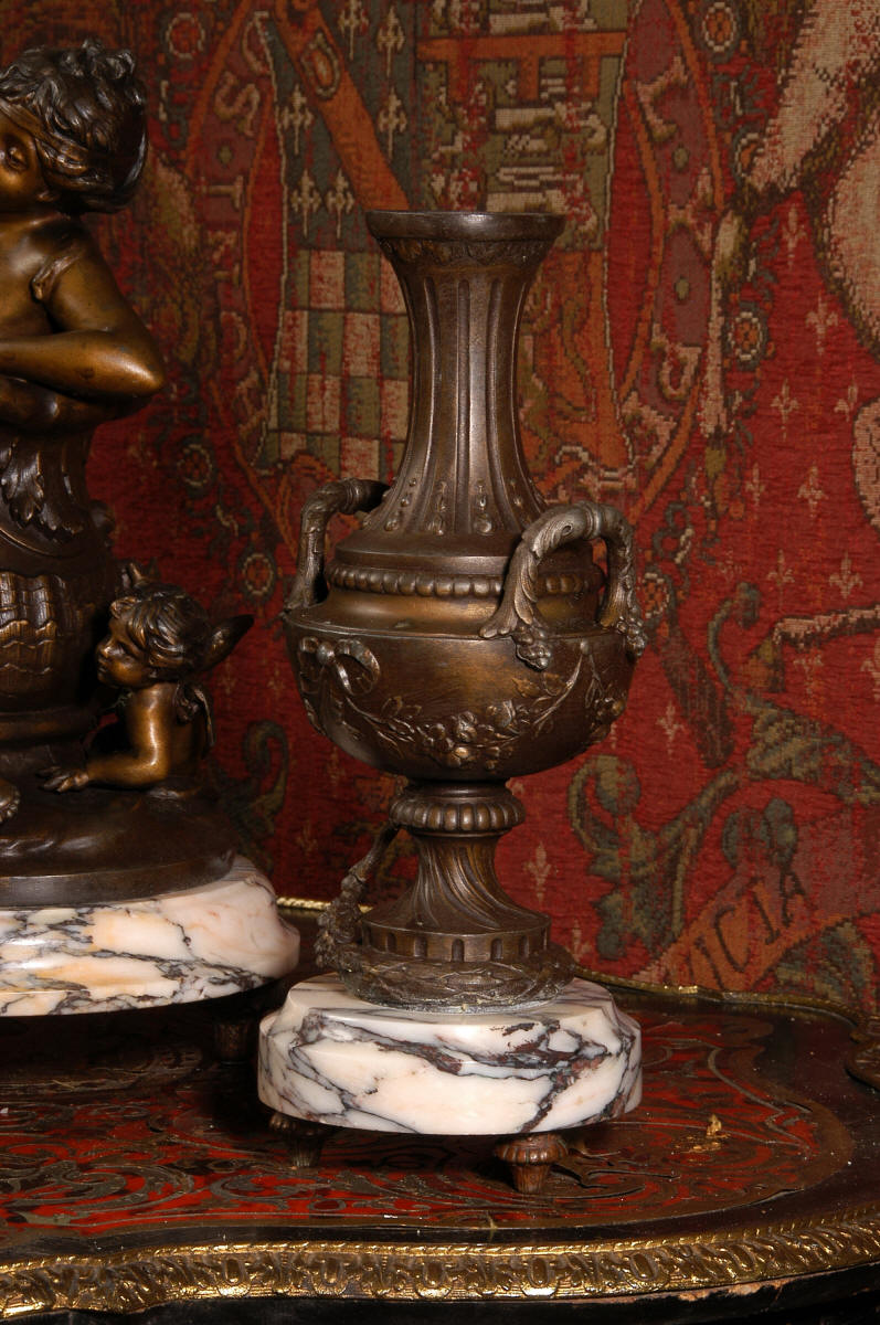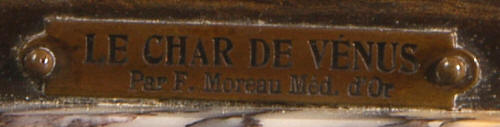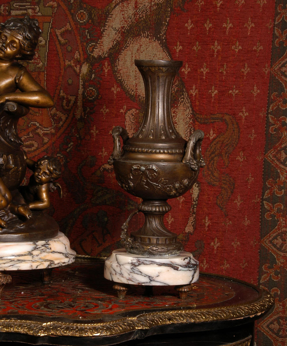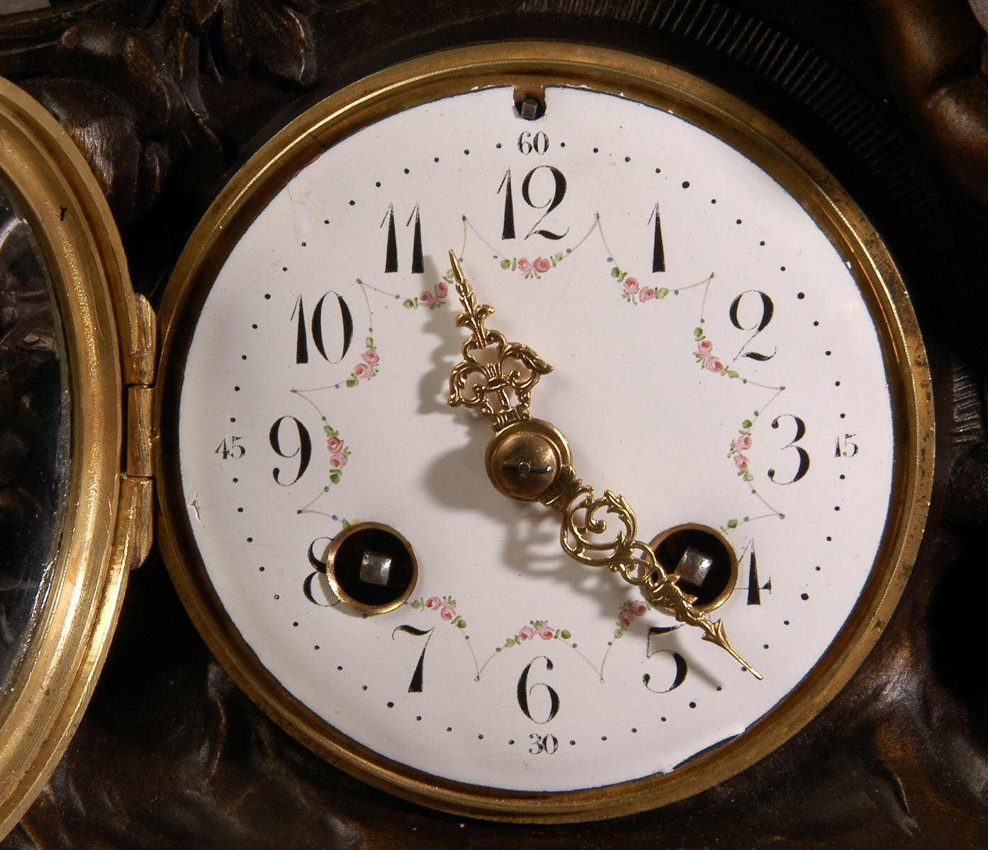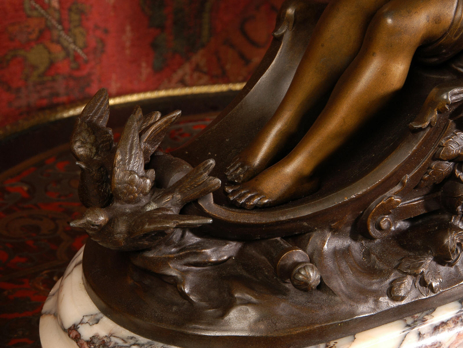 ~ French - Circa 1880 ~ ~~ Excellent condition, fully overhauled ~~ A Stunning, Large Antique French clock set by the sculptor Hippolyte François Moreau entitled Le Char De Venus(The Chariot of Venus). It features a beautifully modelled figure of Venus reclining in her chariot drawn by a pair of Erotes or winged Love-Gods through the clouds. A pair of cherubs cling to the rear of the Chariot. The side vases are classical in style with laurel handles, swags of flowers and bows and are mounted on matching marble bases. The set is beautifully made in patinated bronzed metal mounted on variegated specimen marble bases, it is in very good condition. A plaque is mounted on the front of the case with the artist and the title of the piece. It is modelled in the round and so would display beautifully in the centre of a room. Hippolyte François Moreau (1832-1927) was the second son of Jean-Baptiste Moreau, Hippolyte Moreau went to work in Paris under the direction of Jouffroy and exhibited his first work at the Salon in 1859. The best of his work includes charming full figures of children and young women, mostly allegorical, often with the same subjects as used by Hippolyte's brother Auguste. He is well listed and known, see the Artprice database for more information. The French movement is of by Japy Freres and has the makers mark on the movement backplate. It is of the makers usual high quality and is in excellent clean and running condition having been fully overhauled by our clockmaker. Pendulum is a replacement. It runs for 8 days and strikes the hours and halves on a bell. Click the video clip below to hear the bell and watch the clock running! Condition of the case is excellent with clean and bright finish and there are no losses. There is some wear on the high spots and a few minor areas of discolouration or marks to the original patination, particularly to the vases. Marble is in excellent condition with just some minor nibbles on the edges. It has a good polish. Dial is also in excellent condition with just slight chip to the edge that is not noticeable with the bezel closed. A stunning clock set, a centrepiece for your room and collection!