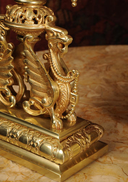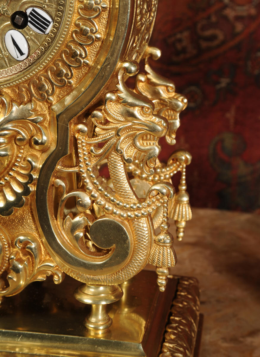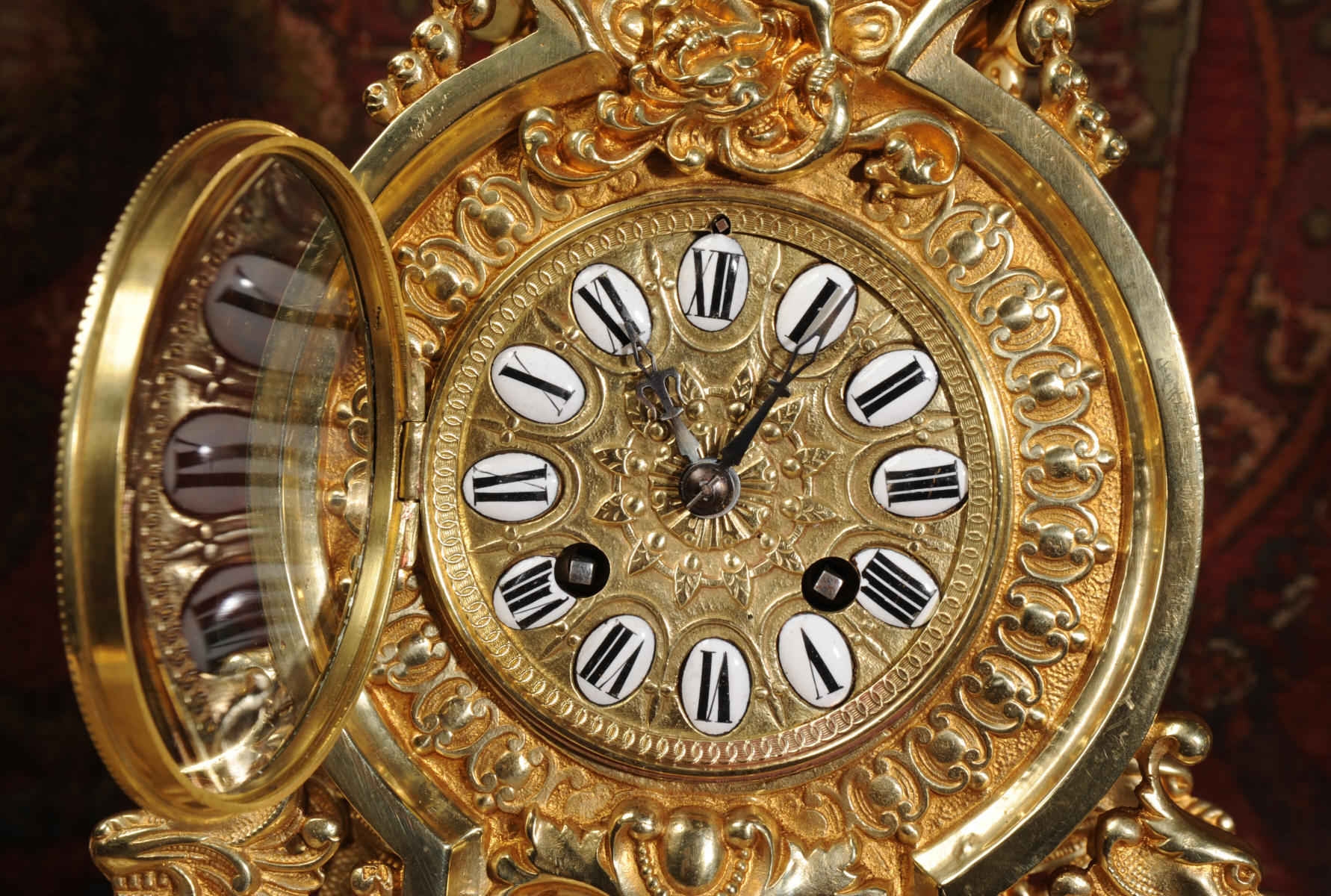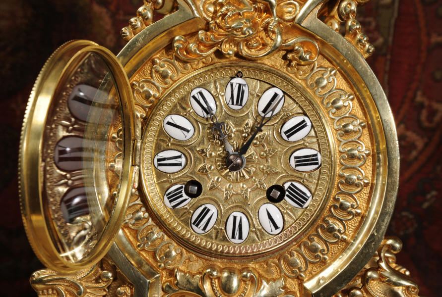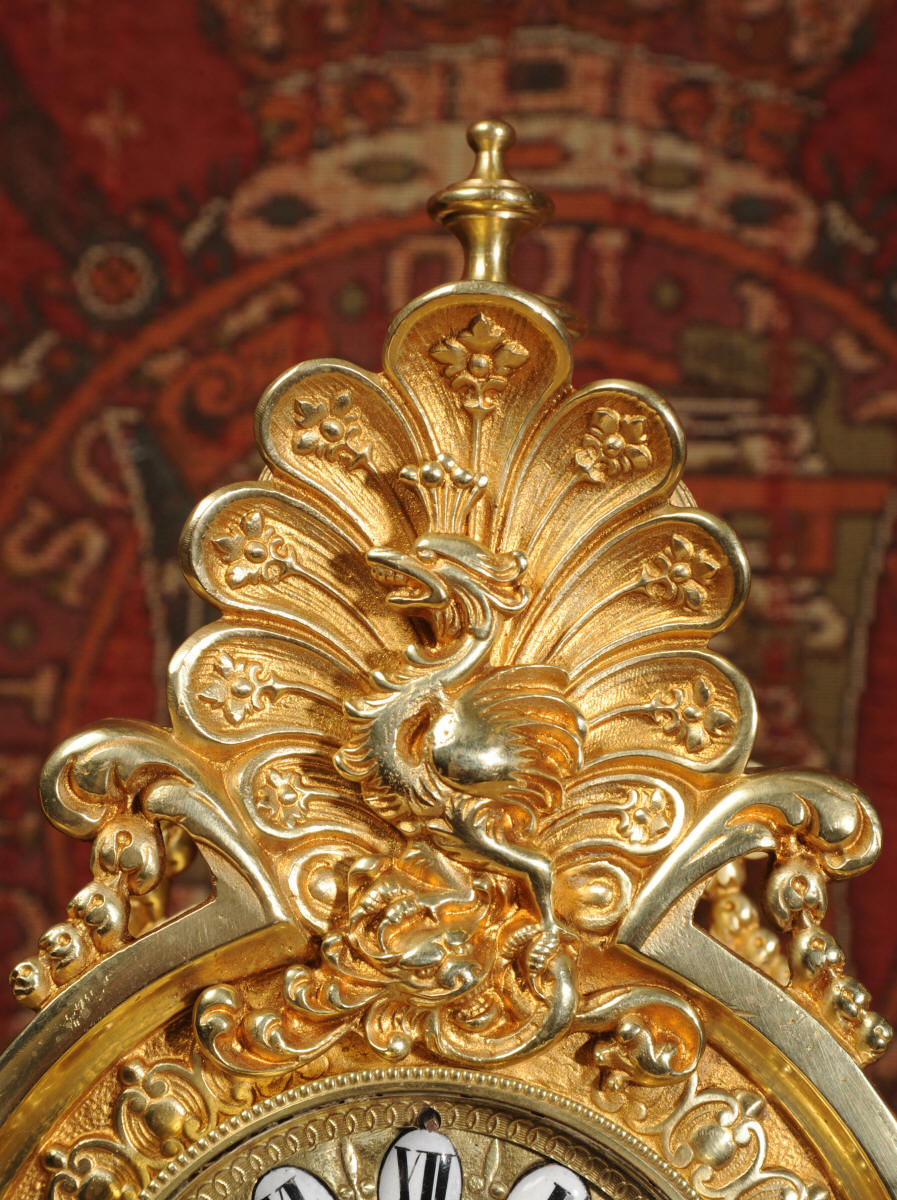 The dial is also gilt brass and has 12 individual enamel cartouche letters. It has finely fretted blued steel hands and convex glass.