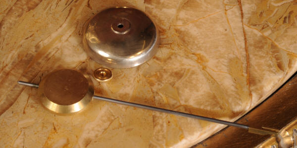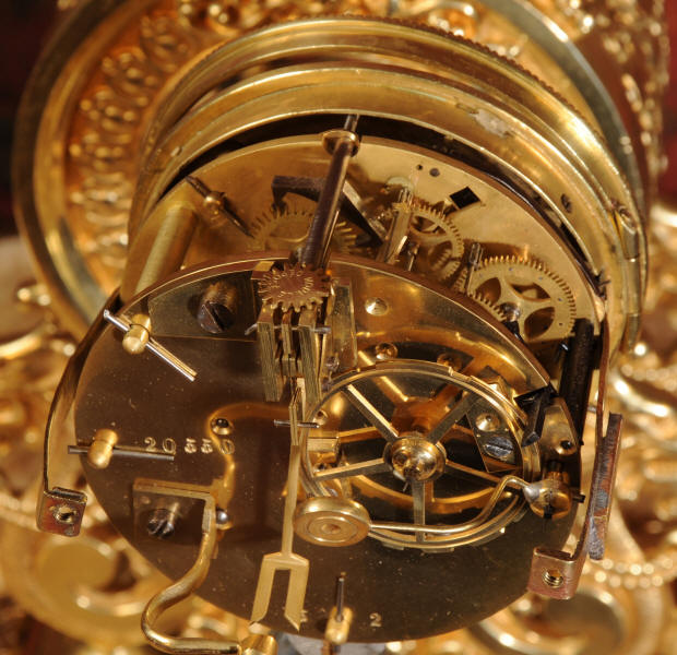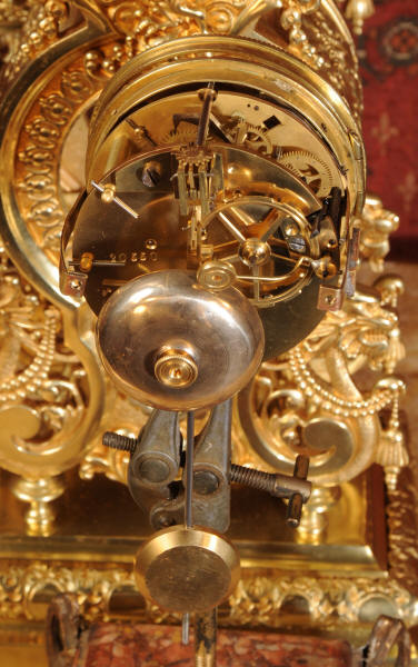 The French movement is of high quality and is in excellent clean and running condition having been fully overhauled by our clockmaker. Pendulum is a replacement. It runs for 8 days and strikes the hours and halves on a bell. Click the video clip below to hear the bell and watch the clock running!