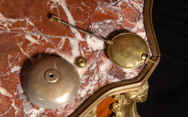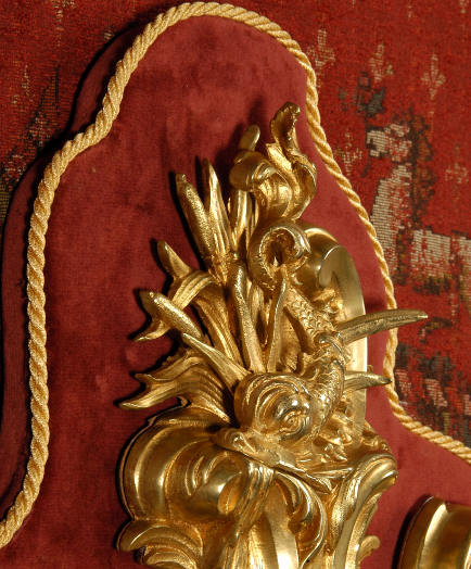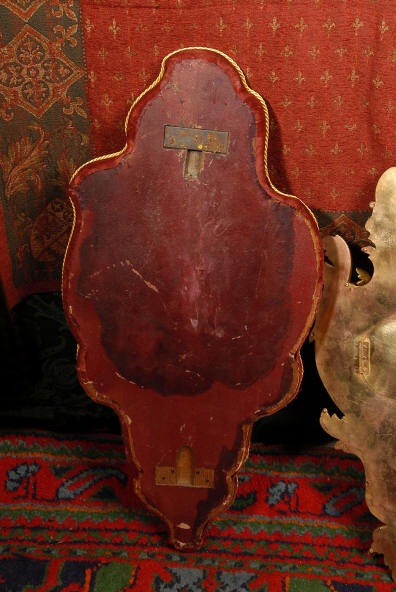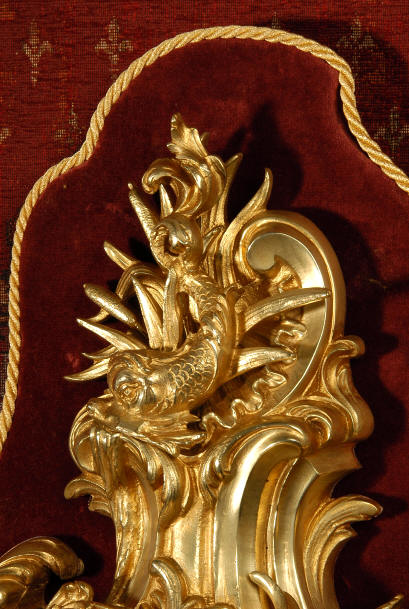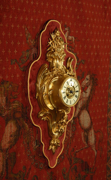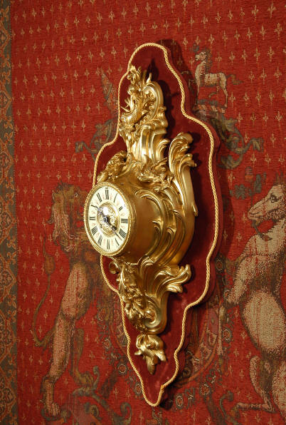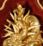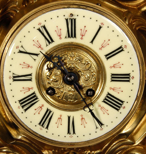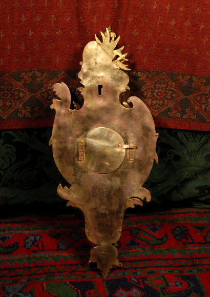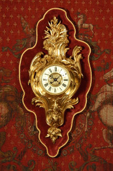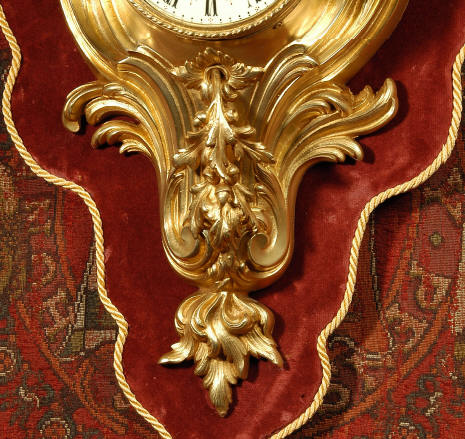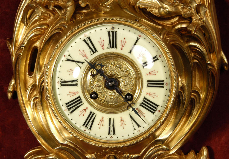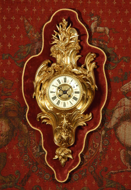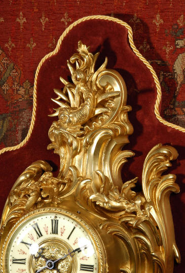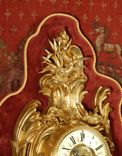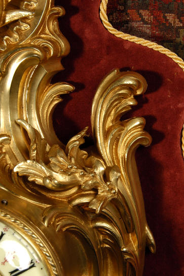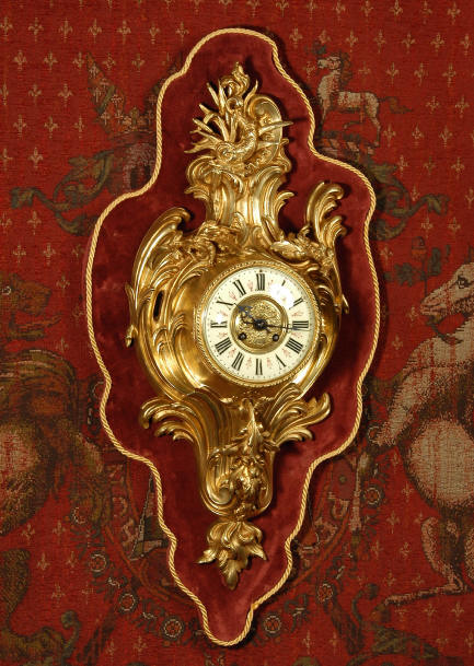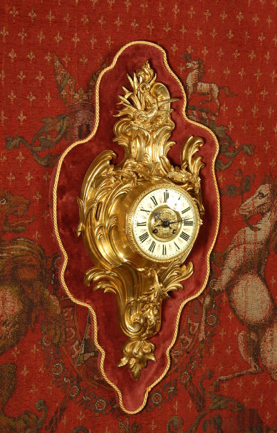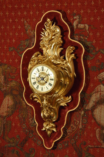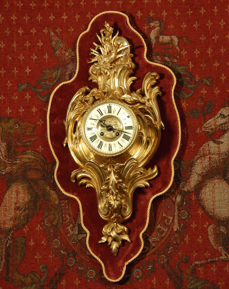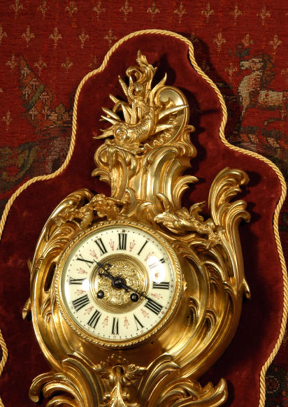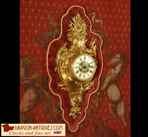 ~ French - Circa 1880 ~ ~~ Excellent condition, movement fully working ~~ A large and very finely detailed antique French, brass cased, cartel wall clock. It is modelled in the Rococo style with sweeping asymmetric acanthus leaves, floral swags and crowned by a mythical dolphin sitting in a 'C' scroll. It is of lovely quality with a clean and bright finish ready to grace any room. A rare feature is the original oak back board, finished with red velvet, which beautifully frames the clock. The dial is enamel on copper with a cast brass centre and is complete with original blued steel hands and convex, bevelled glass. The mark of the Paris retailer Maison Henri Riondet, Comptoir General, Boulevard Poissonni�re is on the movement backplate, together with the clockmakers mark of Samuel Marti The Samuel Marti movement is of this makers usual high quality and is in excellent clean and running condition having been fully serviced by our clockmaker. Pendulum is an old replacement. On one wind, the clock runs for 8 days and strikes every hour and half-hour on a bell. The video clip below shows the clock running and striking the bell. Condition of the case is