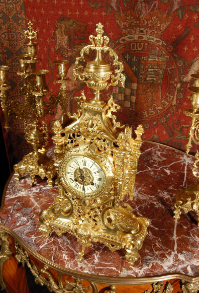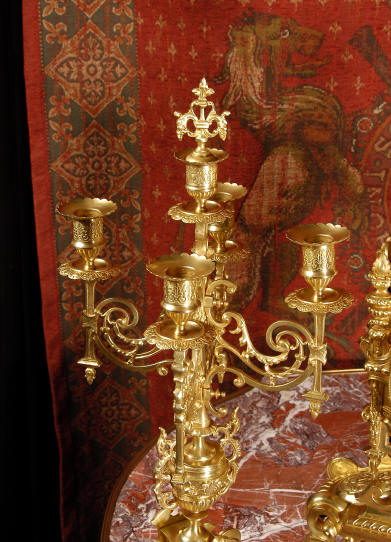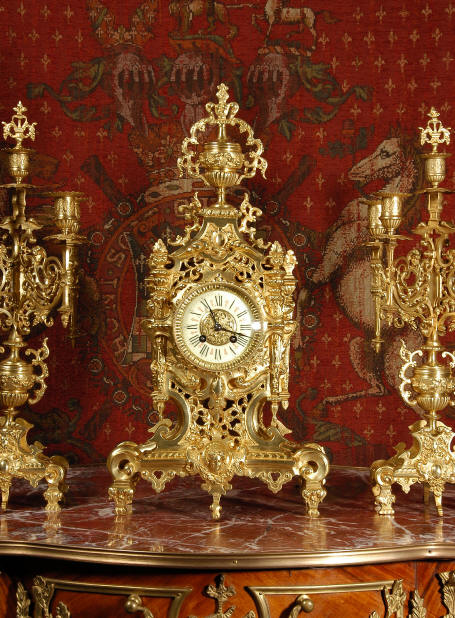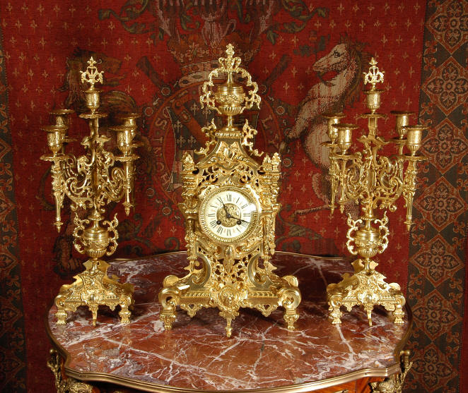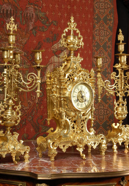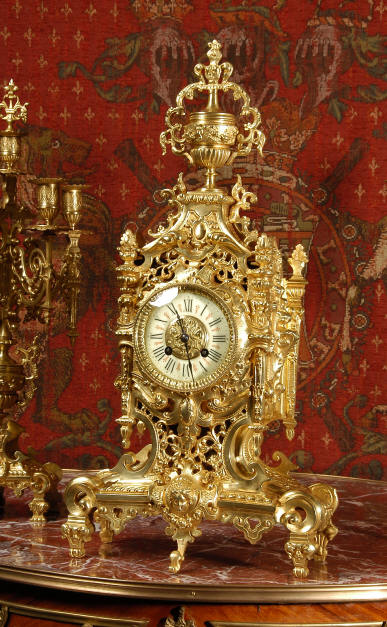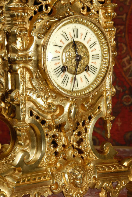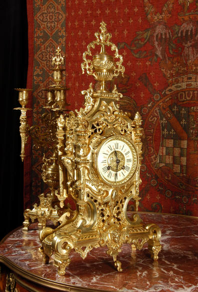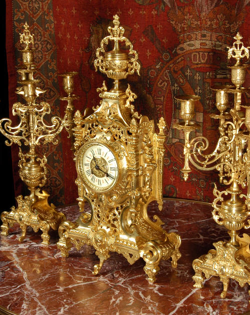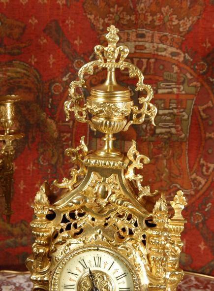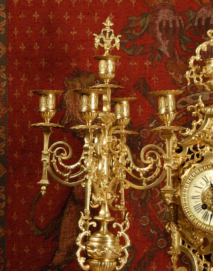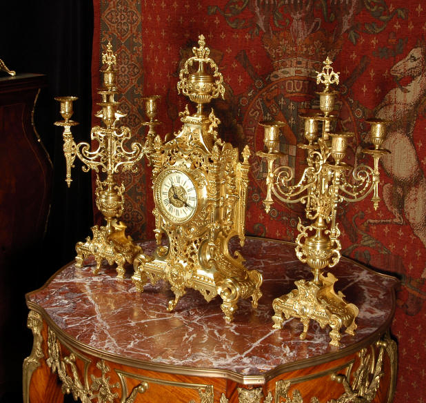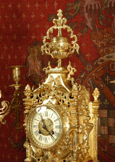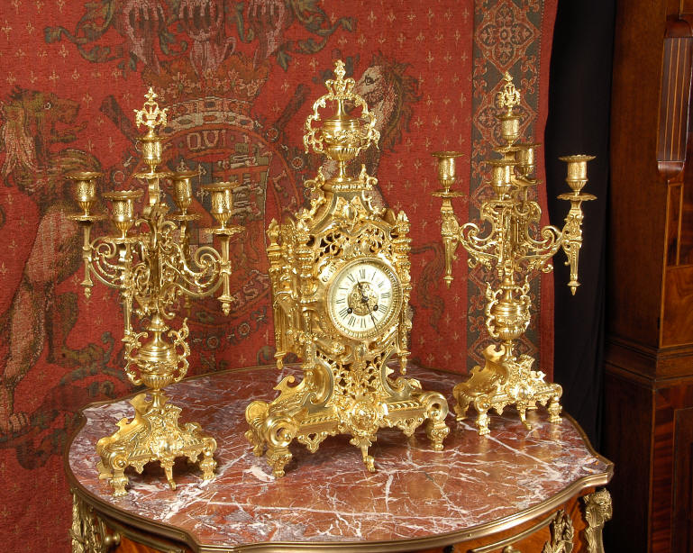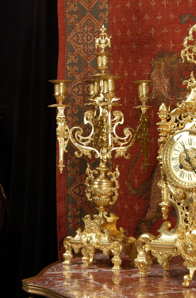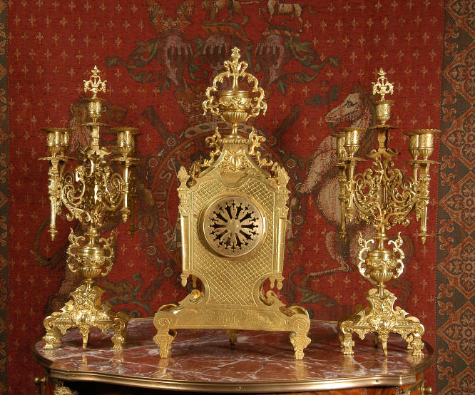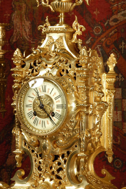 ~ French - Circa 1880 ~ ~~ Excellent condition ~~ A Stunning French gilt brass clock set by Louis Japy, beautiful, clean and bright original gilding. The style is French gothic with C scrolls, flowing foliage, a goddess mask and shields with vacant cartouches. To the side of the dial there are stylised flaming torches. Clock case is of waisted shape with fretted front, broken arch above the dial and sitting on a base with scroll feet. Pendulum can be seen through the fret work, swinging inside the case. Five light candelabra are conforming in style and are complete with snuffers. The dial is enamel on copper, lettered with Roman numerals and red half-hour markers. It has a cast brass centre, convex glass and is complete with original blued steel hands. The French movement is of the highest quality and has the L. P. Japy mark on the movement backplate. It is in excellent clean and running condition having been fully serviced by our clockmaker; it has been completely dismantled, cleaned, serviced and two new springs fitted. The movement was then test run until we were satisfied of problem free running. Pendulum has been replaced. It runs for 8 days on one wind and strikes the hours and halves on a bell. The video clip below shows the clock running and striking. Condition of the case is