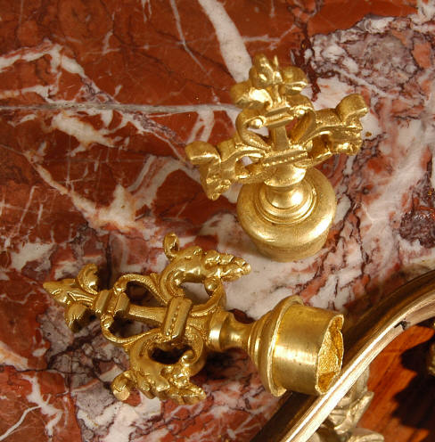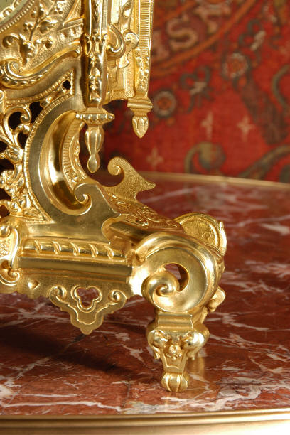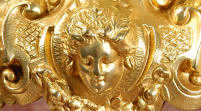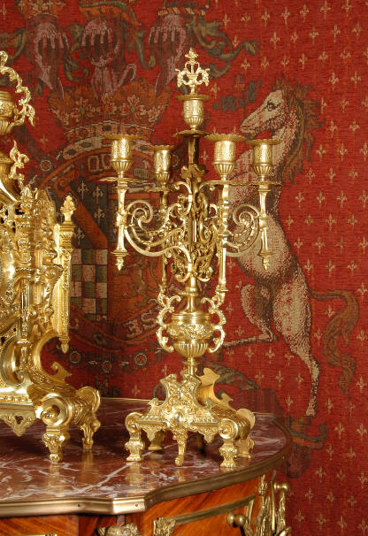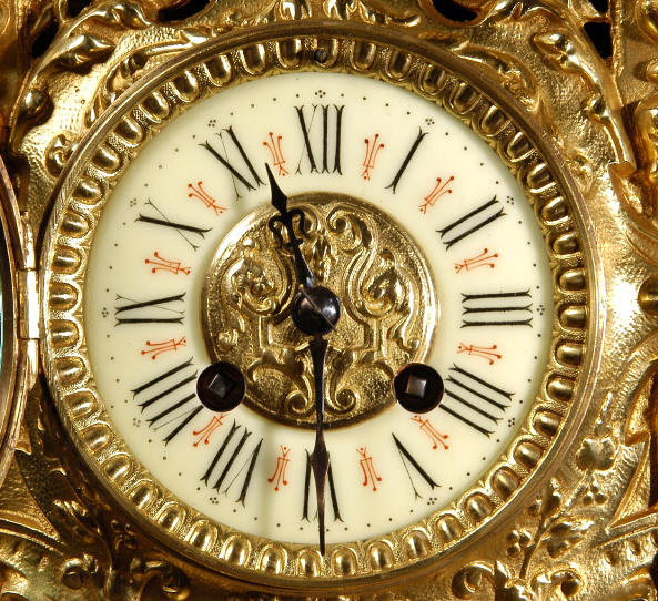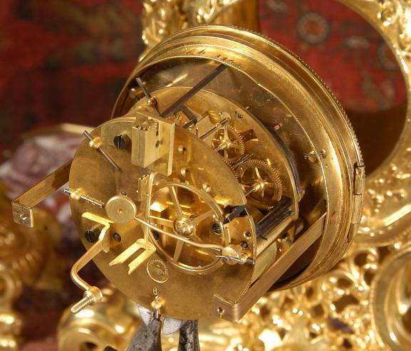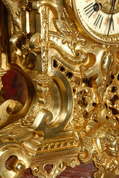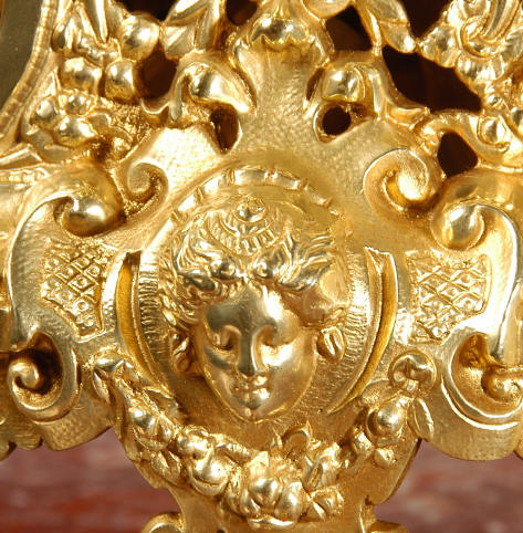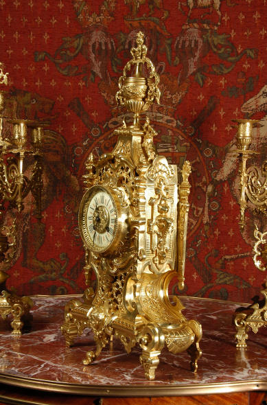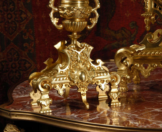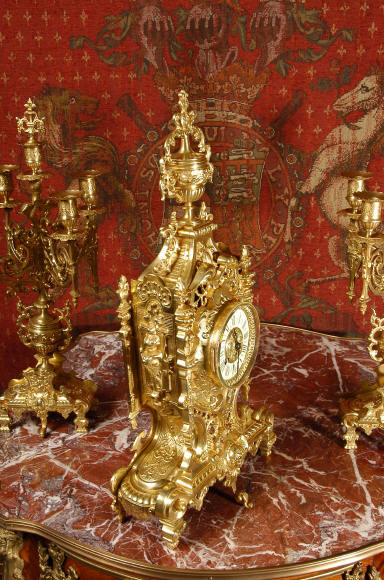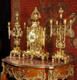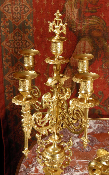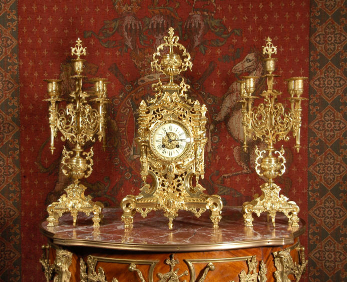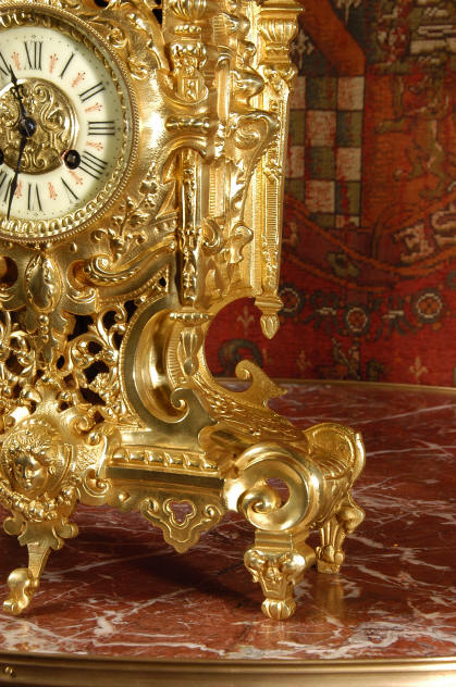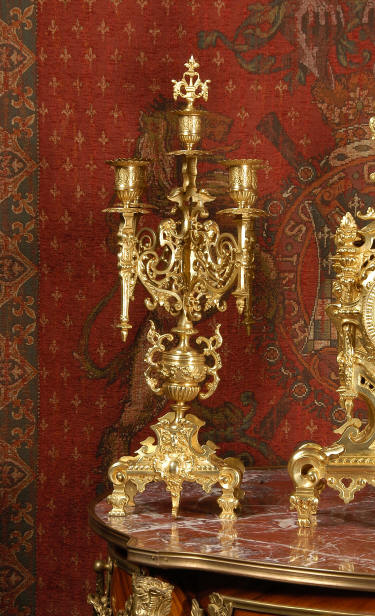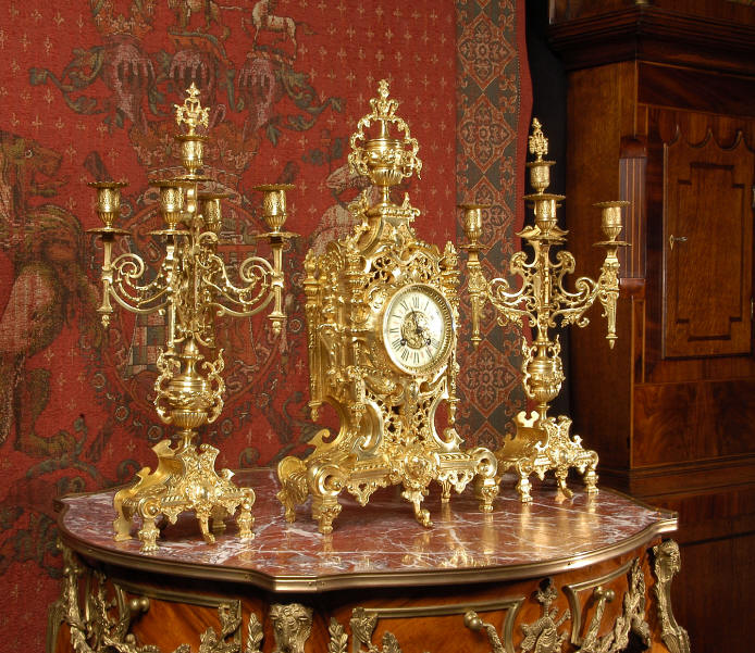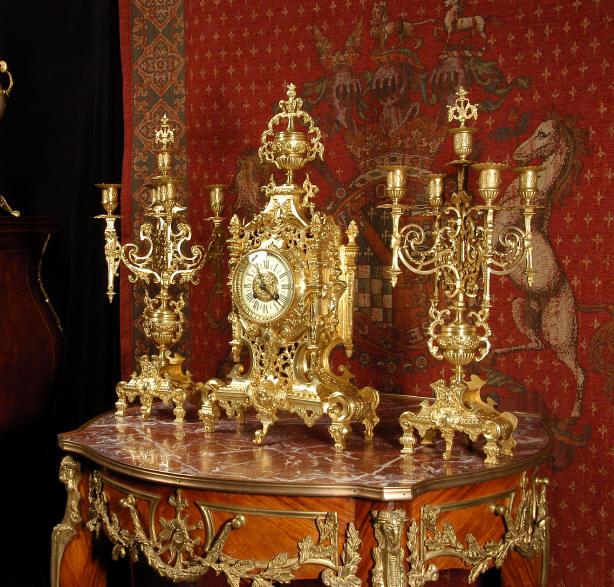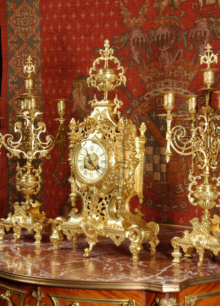 ~ French - Circa 1880 ~ ~~ Excellent condition ~~ A Stunning French gilt brass clock set by Louis Japy, beautiful, clean and bright original gilding. The style is French gothic with C scrolls, flowing foliage, a goddess mask and shields with vacant cartouches. To the side of the dial there are stylised flaming torches. Clock case is of waisted shape with fretted front, broken arch above the dial and sitting on a base with scroll feet. Pendulum can be seen through the fret work, swinging inside the case. Five light candelabra are conforming in style and are complete with snuffers. The dial is enamel on copper, lettered with Roman numerals and red half-hour markers. It has a cast brass centre, convex glass and is complete with original blued steel hands. The French movement is of the highest quality and has the L. P. Japy mark on the movement backplate. It is in excellent clean and running condition having been fully serviced by our clockmaker; it has been completely dismantled, cleaned, serviced and two new springs fitted. The movement was then test run until we were satisfied of problem free running. Pendulum has been replaced. It runs for 8 days on one wind and strikes the hours and halves on a bell. The video clip below shows the clock running and striking. Condition of the case is
