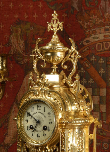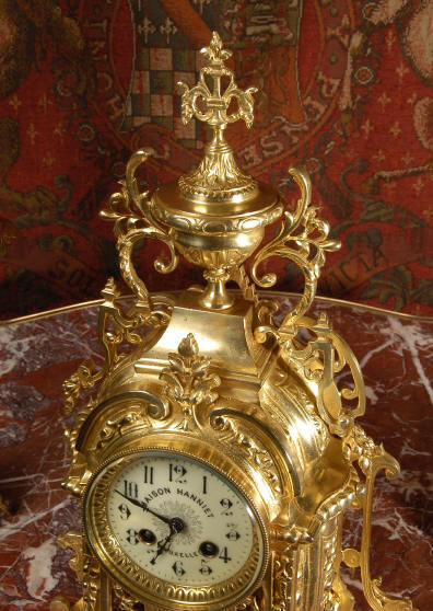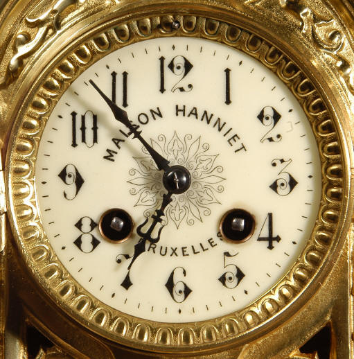 ~ French - Circa 1890 ~ ~~ Excellent condition ~~ A very decorative clock set by the famous maker Japy Freres. It is Louis XVI in style, classically architectural and decorated with flowing foliage and flowers. The front of the clock is fretted which allows a glimpse of the pendulum swinging inside the case. The dial is enamel on copper with and is signed by the retailer Maison Hanniet, Brussels. It is complete with the original blued steel hands. The Japy Freres French movement is of the highest quality and is in excellent clean and running condition having been fully serviced by our clockmaker. Pendulum is original. It runs for 8 days and strikes the hours and halves on a bell. Click the movie below to hear the bell and watch the clock running! Condition of the case is