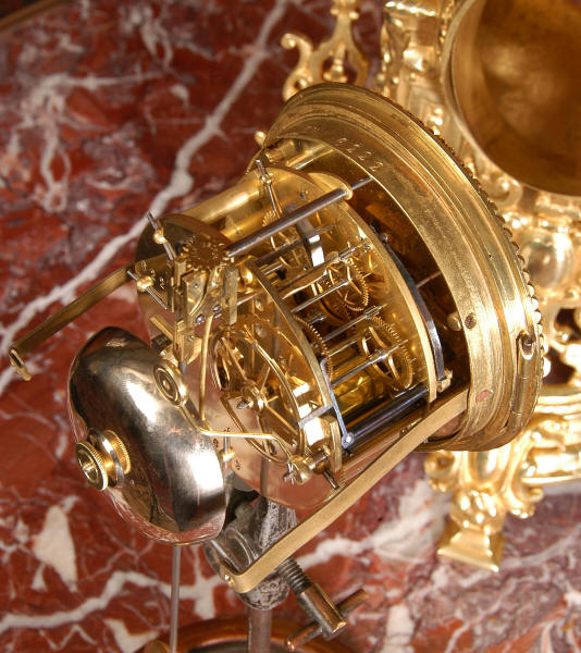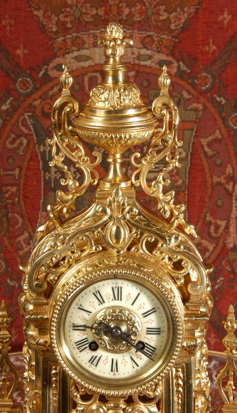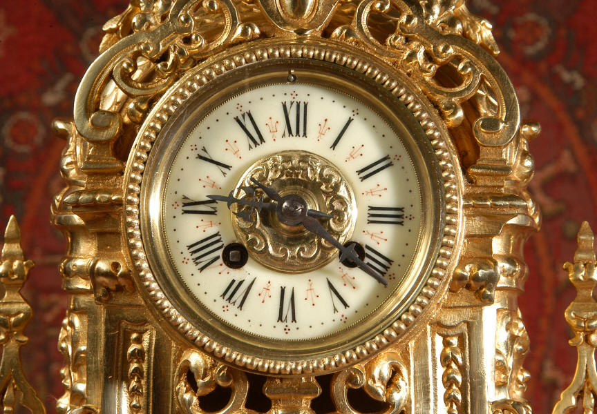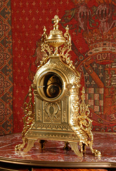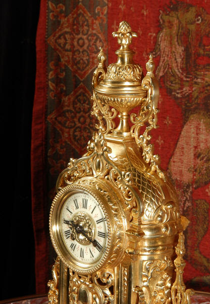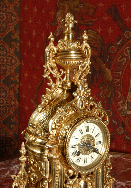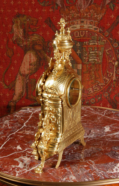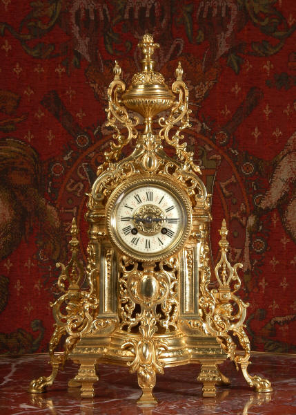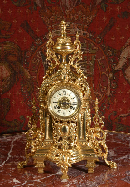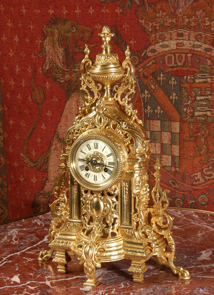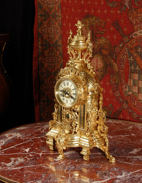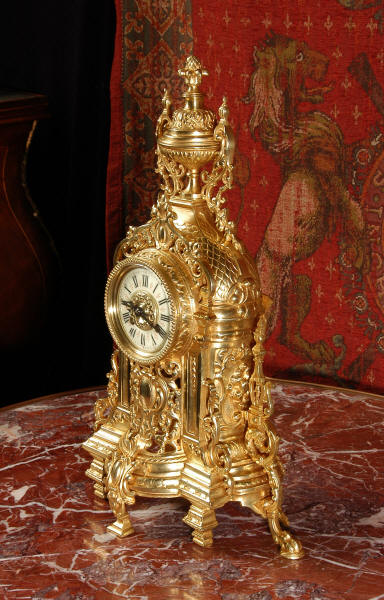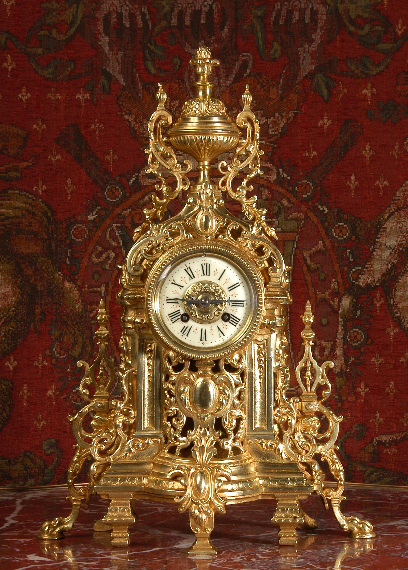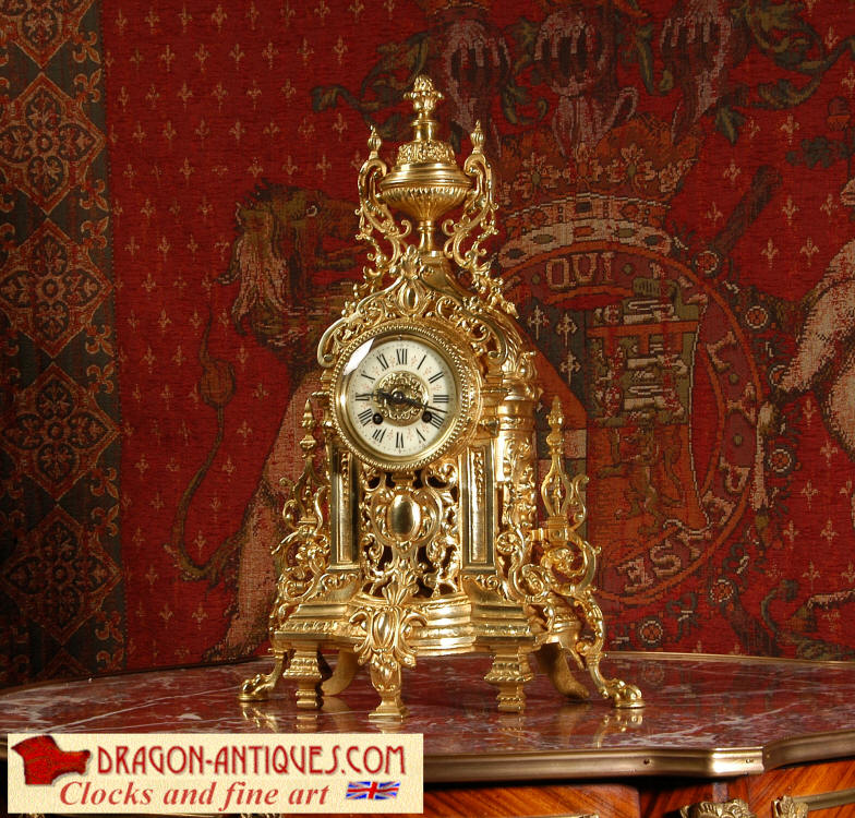 ~ French - Circa 1880 ~ ~~ Excellent condition ~~ A beautiful Louis XVI style, original antique French boudoir clock. It is very well modelled in gilded brass which is in lovely bright and clean condition. The case is architecturally shaped, profusely decorated with floral swags and surmounted by an urn with pineapple finial. Mythical creatures with hairy paw feet form the legs tot he sides. The front of the case is fretted to allow the pendulum to be glimpsed swinging inside the case and the back door is glazed to allow the movement to be seen. The dial is enamel on copper with a cast brass centre and is complete with original blued steel hands. Bezel is glazed with convex glass. The French movement is of excellent quality and is in excellent clean and running condition having been fully cleaned and overhauled by our clockmaker. We have also replaced the pendulum. It runs for 8 days one one wind and strikes the hours and halves on a bell. Click the video clip below to hear the bell and watch the clock running! Condition of the case is