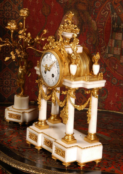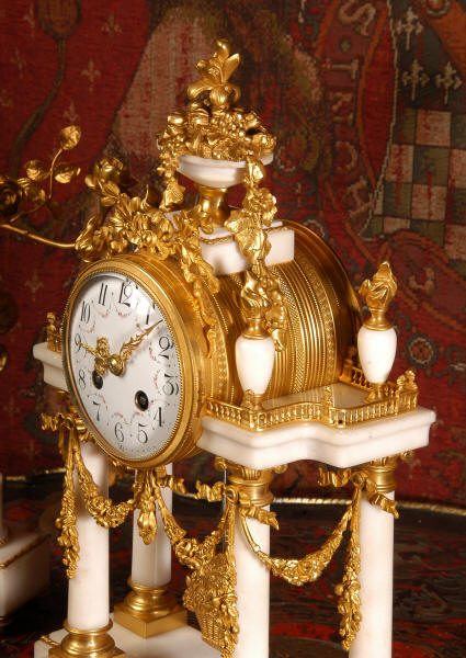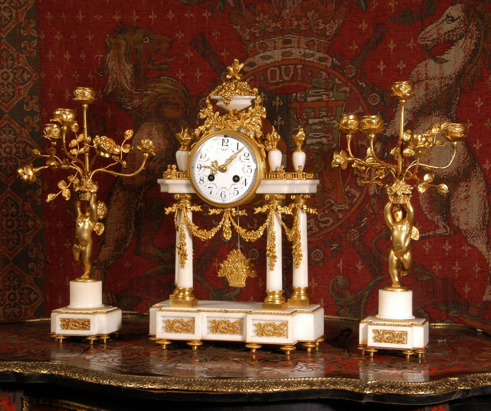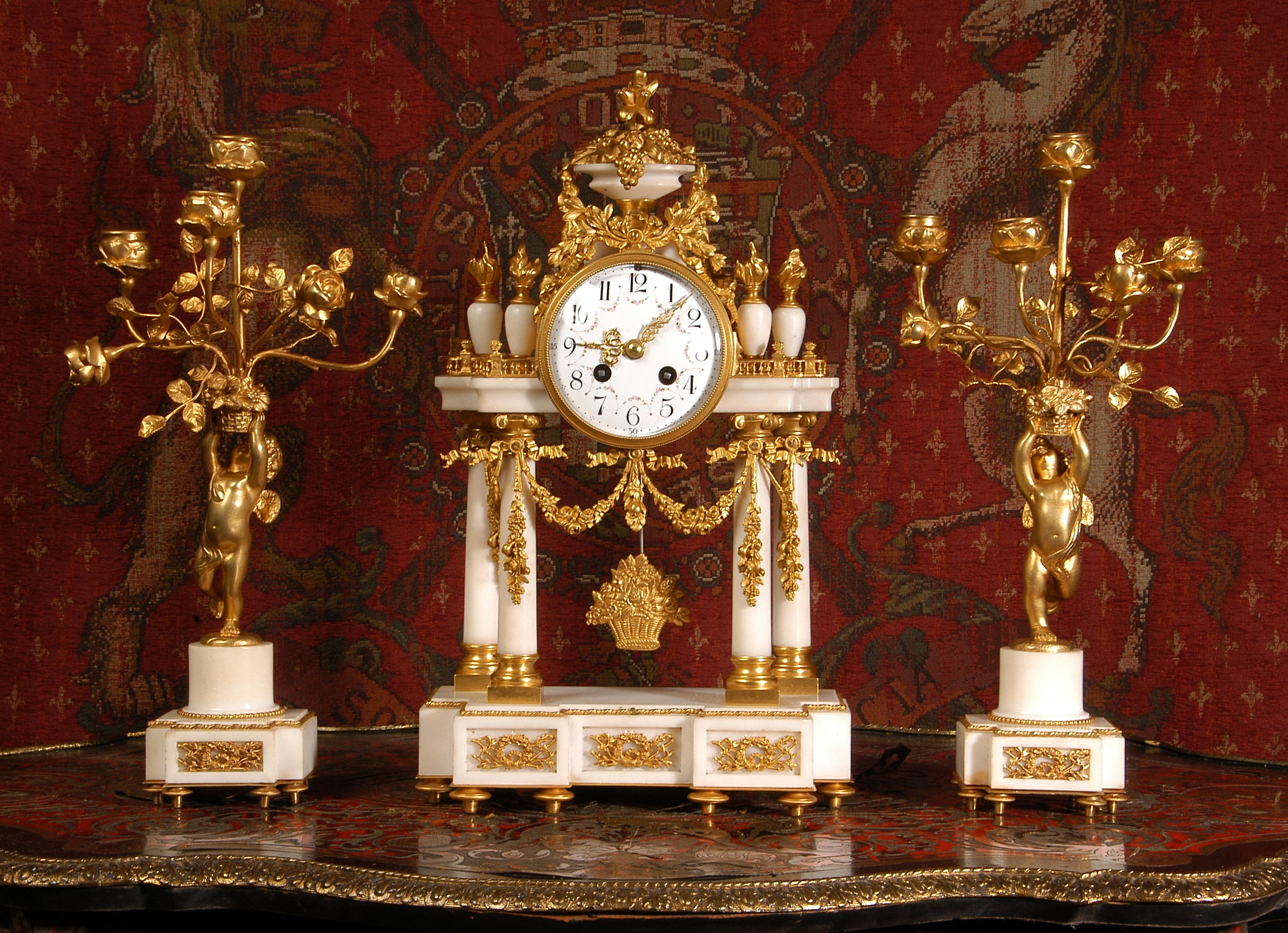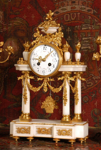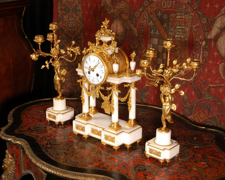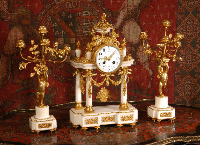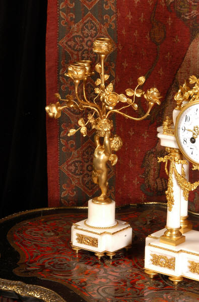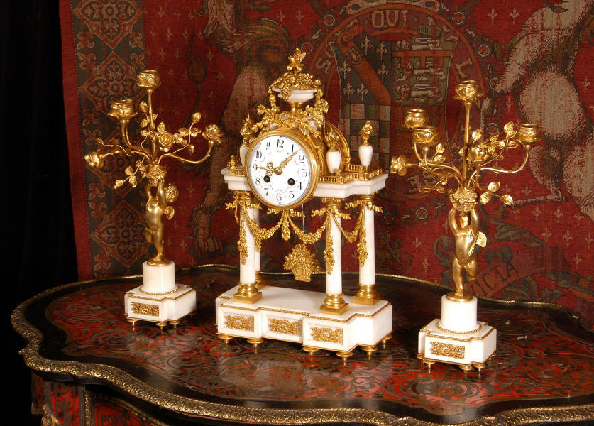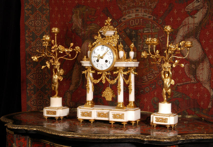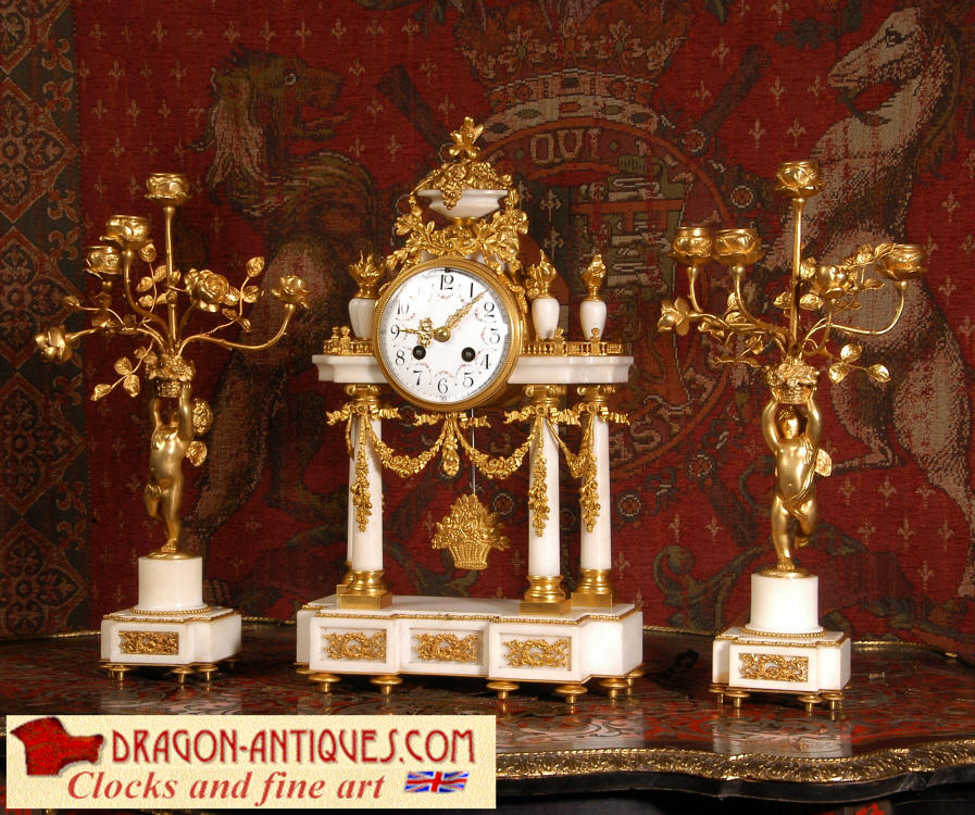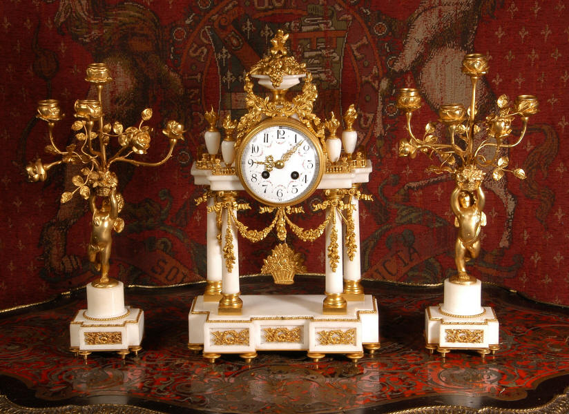 ~ French - Circa 1890 ~ ~~ Excellent condition ~~ A very beautiful original antique French portico clock set. It is finely modelled in the Neo-Classical taste, in white marble mounted with exquisitely detailed ormolu mounts. The top is surmounted by a marble 'urn of plenty' with ormolu fruit and flowers and columns have classical flaming finials and very finely chased floral swags and ribbons. The candelabra feature winged cherubs holding aloft baskets with rose stems forming the candelabra arms. These are naturalistically modelled with an asymmetric arrangement of rose buds and leaves, one candelabra has 3 lights and the other has 4. The clock movement is mounted in the upper part of the portico, allowing the pendulum, modelled in ormolu as a basket of flowers, to be seen gently swinging between the four columns. The pretty dial is enamel on copper decorated with delicate floral swags and is complete with original finely fretted gilt brass hands. The rear door is also glazed to allow the movement to be seen. The French movement is by Vincenti et Cie and has the clockmakers mark on the movement backplate. It is of high quality and is in excellent clean and running condition having been fully overhauled by our clockmaker. Pendulum is original. It runs for 8 days on one wind and strikes the hours and halves on a bell. Click the video clip below to hear the bell and watch the clock running! Condition of the case is