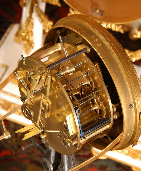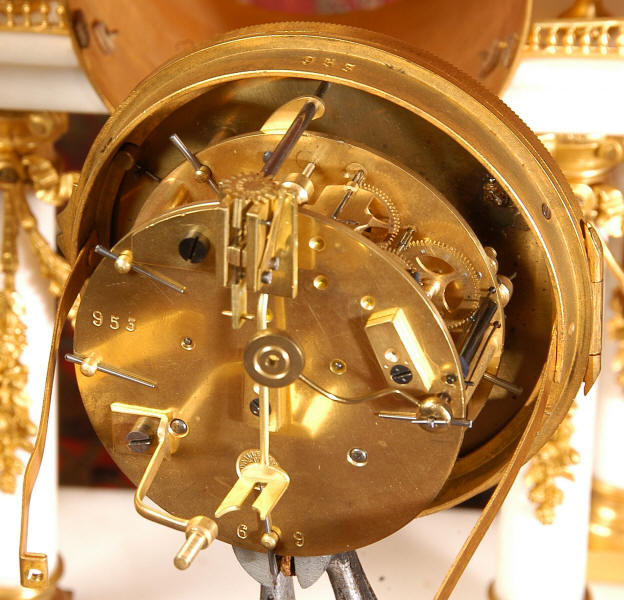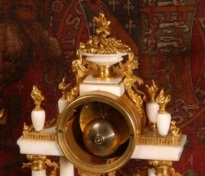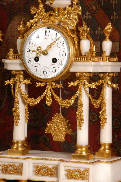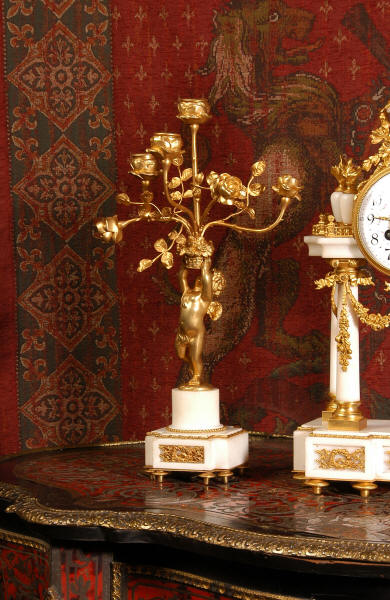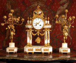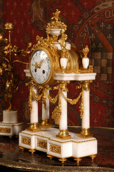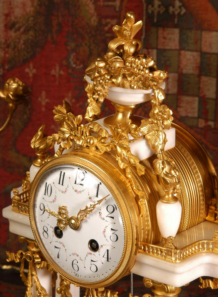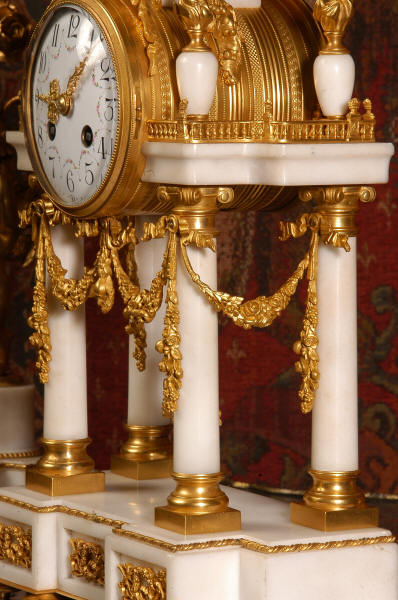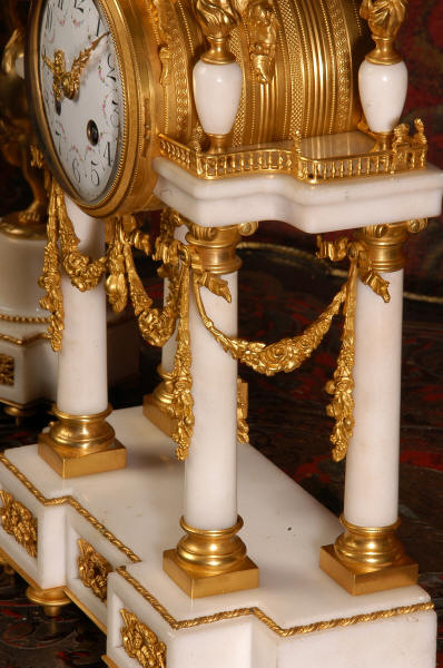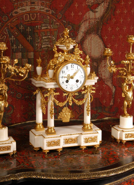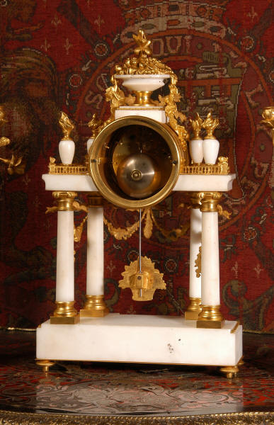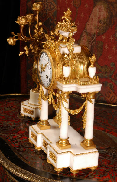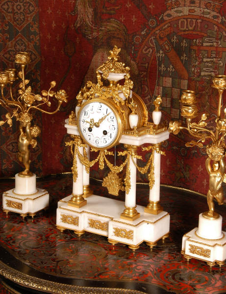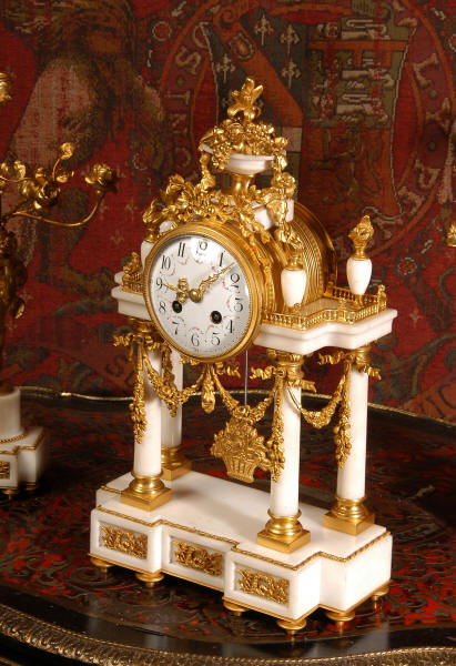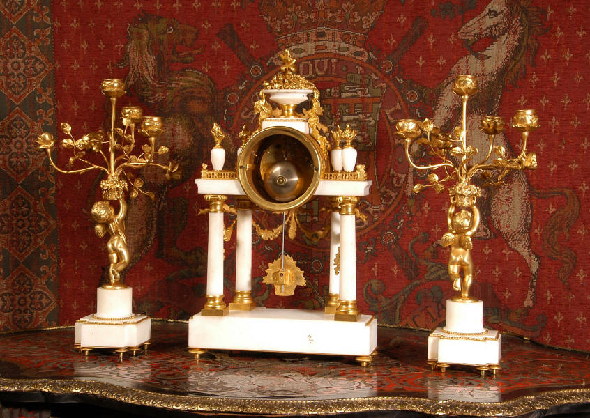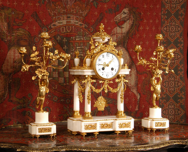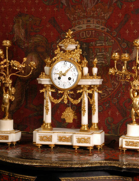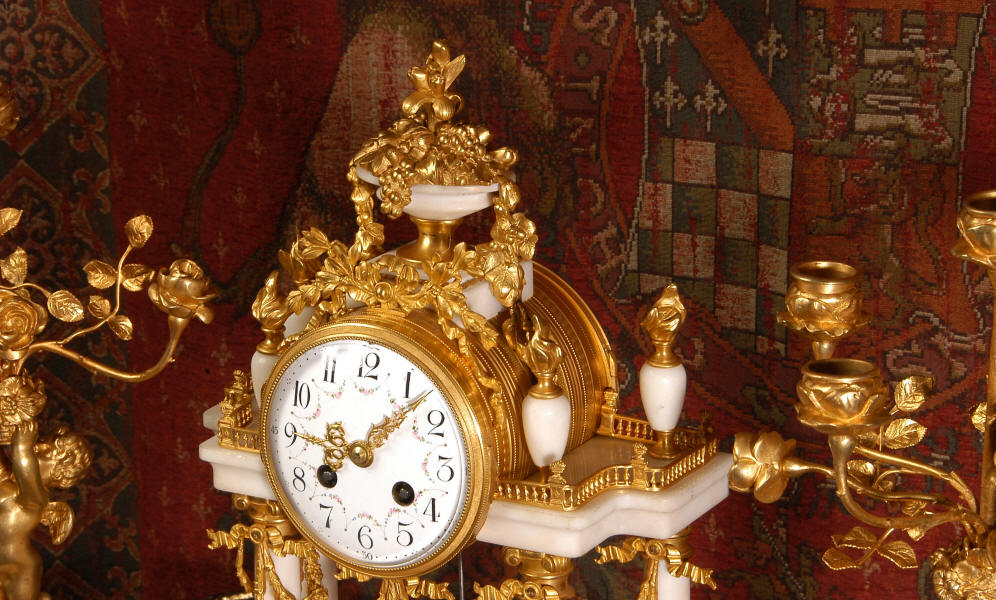 ~ French - Circa 1890 ~ ~~ Excellent condition ~~ A very beautiful original antique French portico clock set. It is finely modelled in the Neo-Classical taste, in white marble mounted with exquisitely detailed ormolu mounts. The top is surmounted by a marble 'urn of plenty' with ormolu fruit and flowers and columns have classical flaming finials and very finely chased floral swags and ribbons. The candelabra feature winged cherubs holding aloft baskets with rose stems forming the candelabra arms. These are naturalistically modelled with an asymmetric arrangement of rose buds and leaves, one candelabra has 3 lights and the other has 4. The clock movement is mounted in the upper part of the portico, allowing the pendulum, modelled in ormolu as a basket of flowers, to be seen gently swinging between the four columns. The pretty dial is enamel on copper decorated with delicate floral swags and is complete with original finely fretted gilt brass hands. The rear door is also glazed to allow the movement to be seen. The French movement is by Vincenti et Cie and has the clockmakers mark on the movement backplate. It is of high quality and is in excellent clean and running condition having been fully overhauled by our clockmaker. Pendulum is original. It runs for 8 days on one wind and strikes the hours and halves on a bell. Click the video clip below to hear the bell and watch the clock running! Condition of the case is