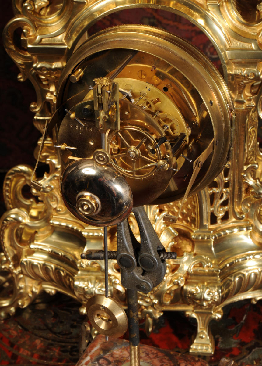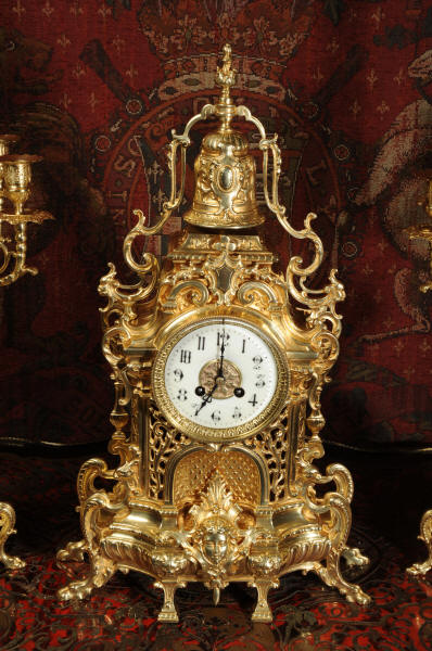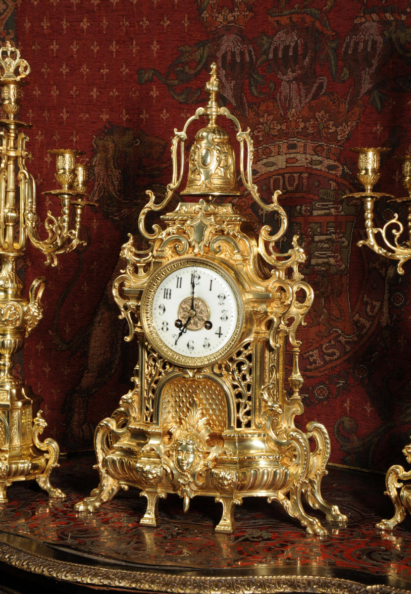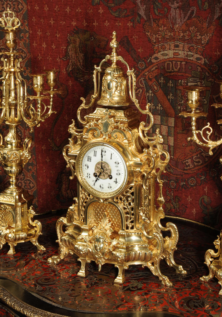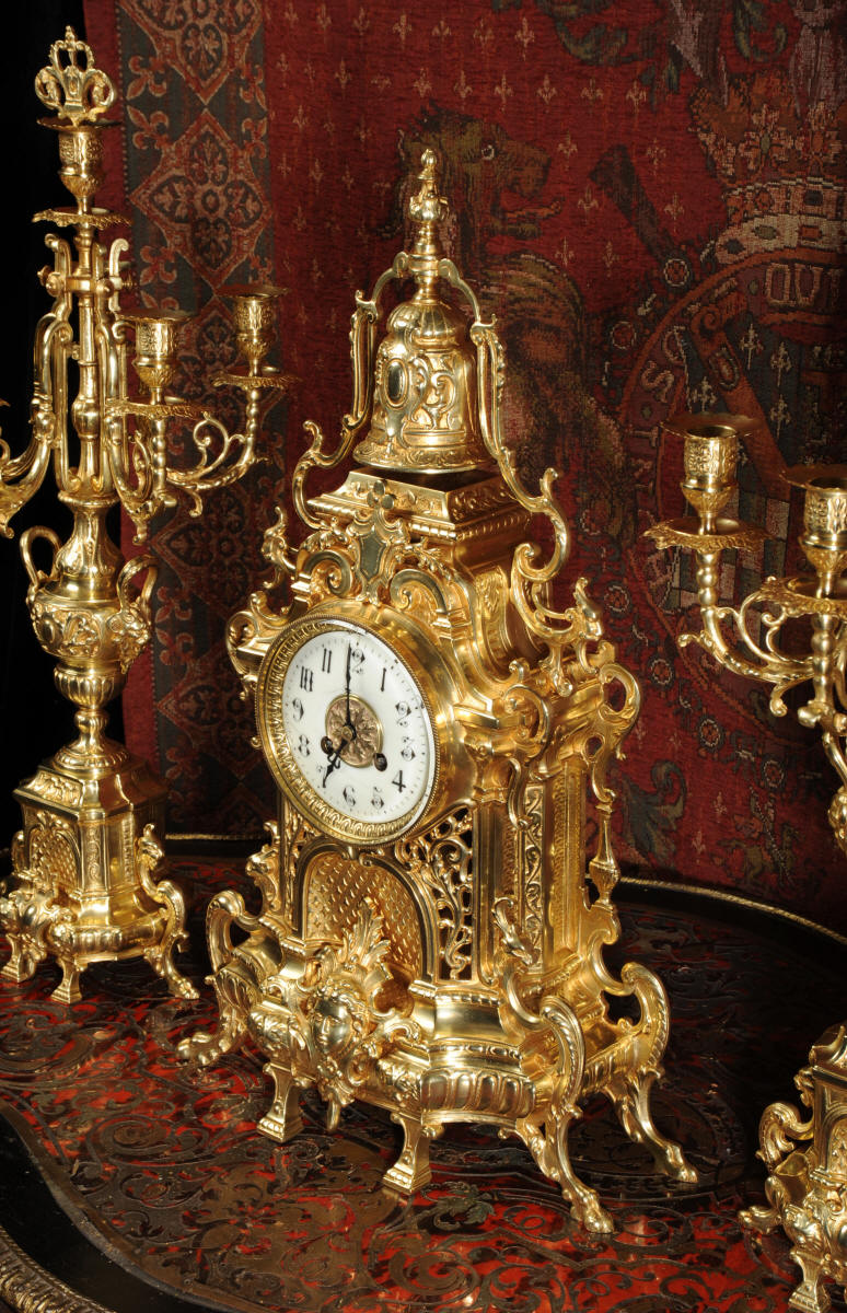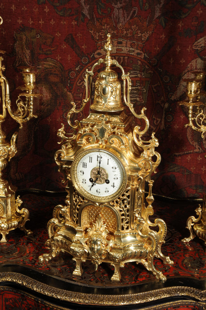 ~ French - Circa 1880 ~ ~~ Excellent condition, fully overhauled and running ~~ A Large and impressive original antique French Gothic clock set, beautifully made in gilt brass, very heavy and crisply modelled and with the original gilding remaining. The style is typically French Gothic, architecturally designed with lions masks, hairy paw feet, flowing foliage and surmounted by a bell. The body of the clock is fretted and modelled as a niche embedded in the overgrown foliage. The pendulum can be glimpsed swinging through the fretwork.