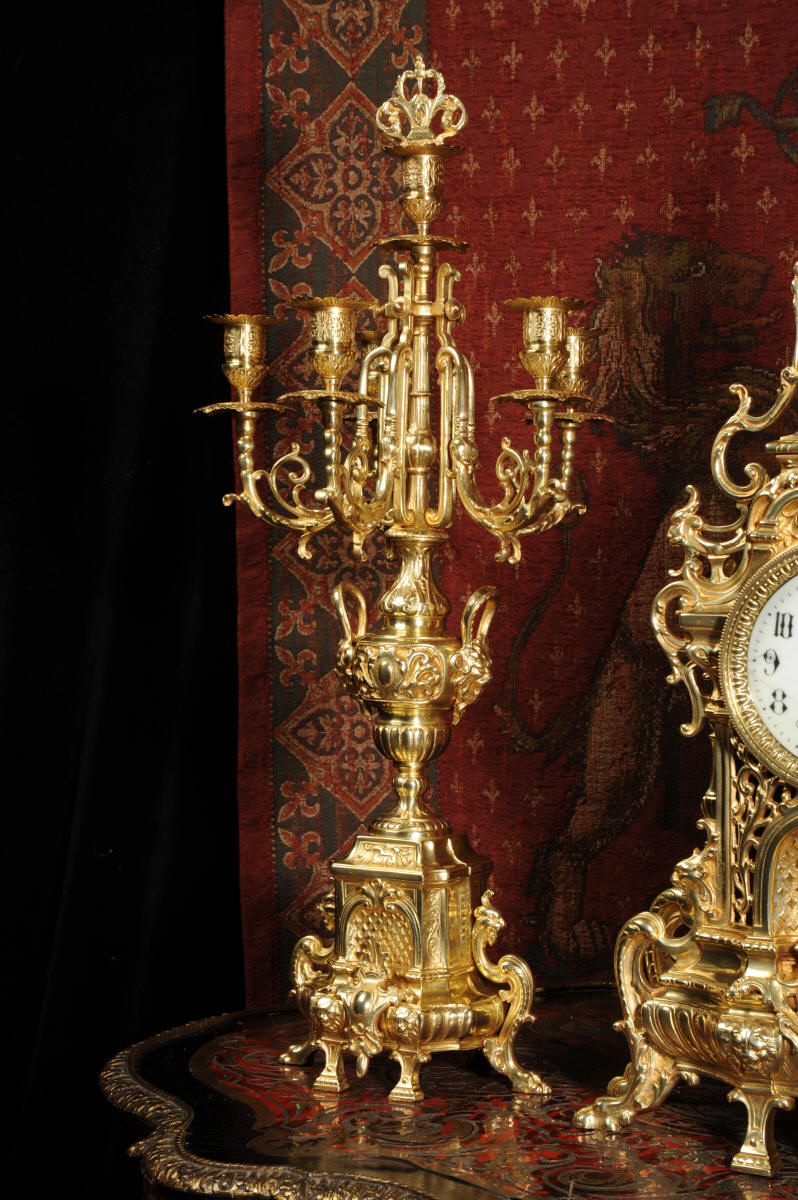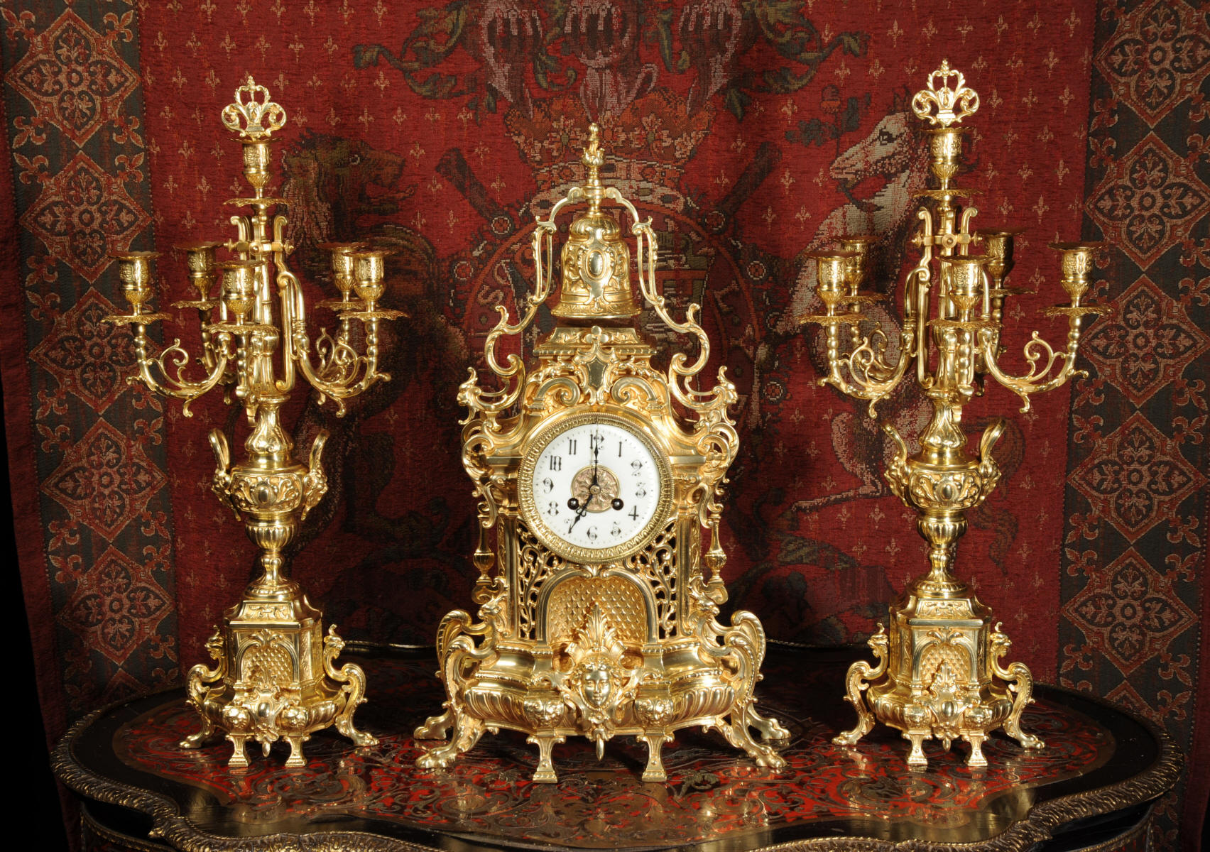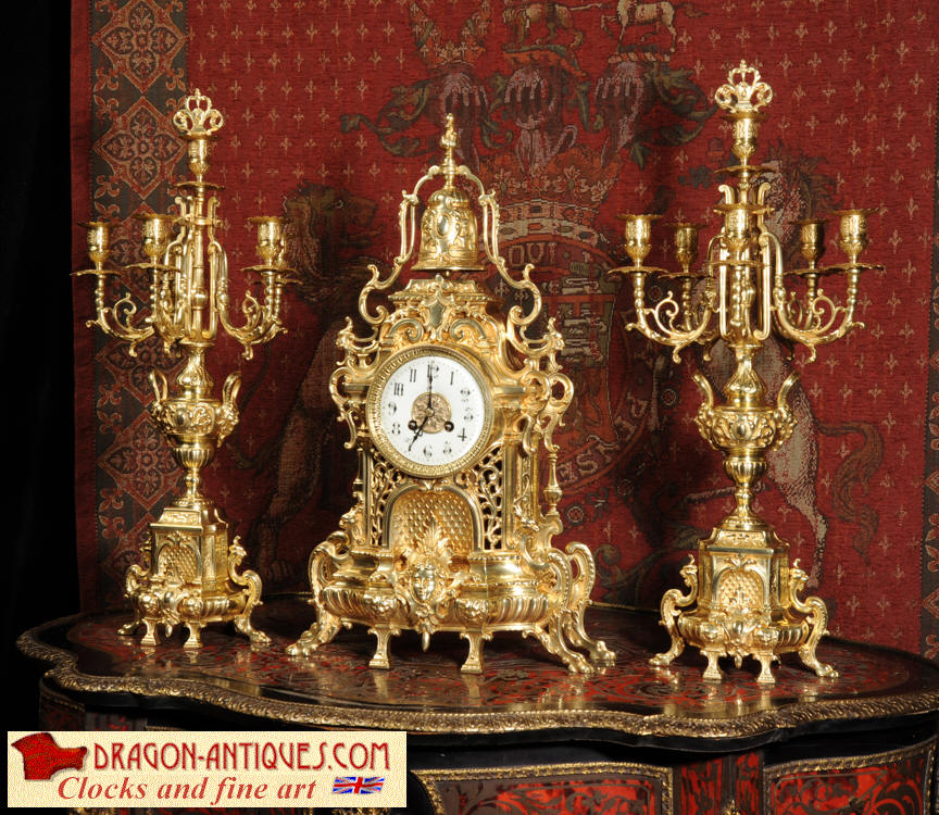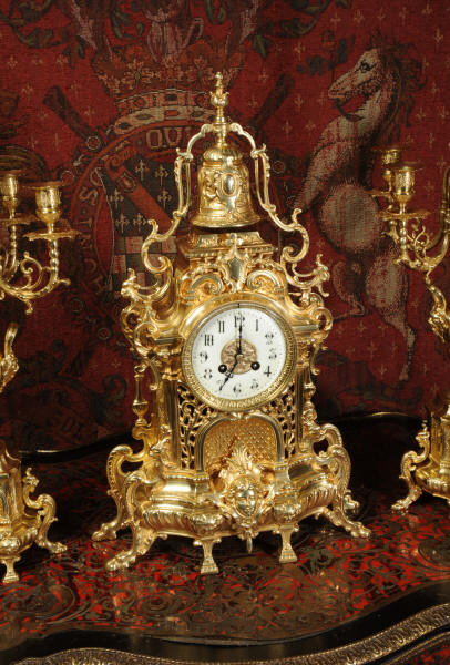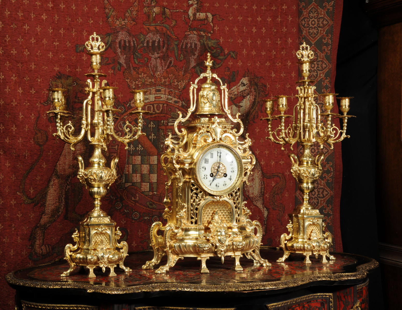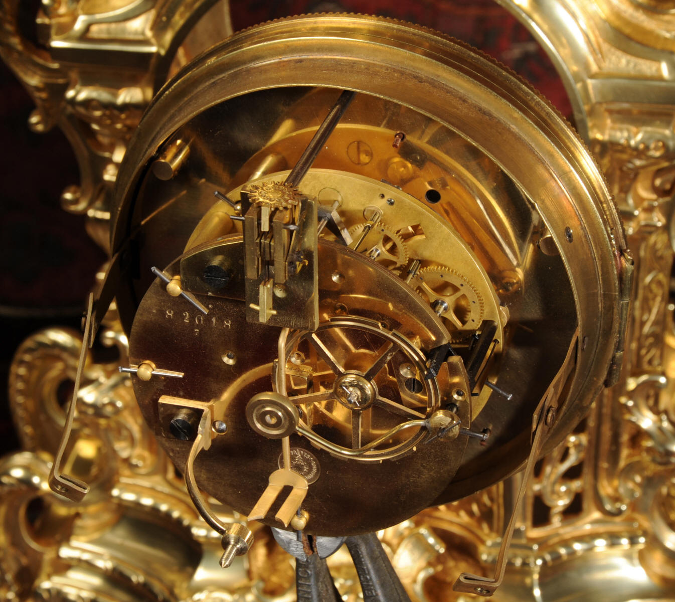 ~ French - Circa 1880 ~ ~~ Excellent condition, fully overhauled and running ~~ A Large and impressive original antique French Gothic clock set, beautifully made in gilt brass, very heavy and crisply modelled and with the original gilding remaining. The style is typically French Gothic, architecturally designed with lions masks, hairy paw feet, flowing foliage and surmounted by a bell. The body of the clock is fretted and modelled as a niche embedded in the overgrown foliage. The pendulum can be glimpsed swinging through the fretwork.