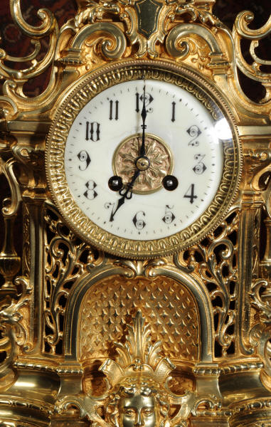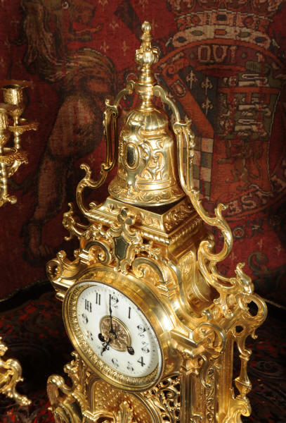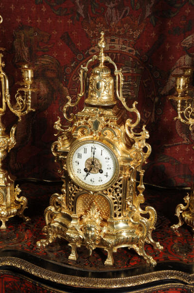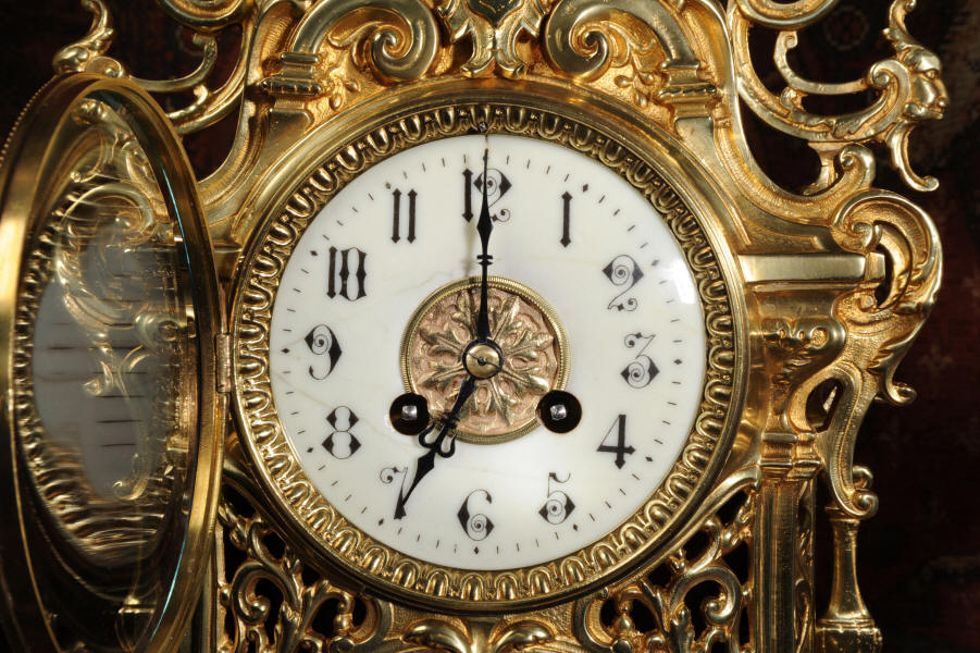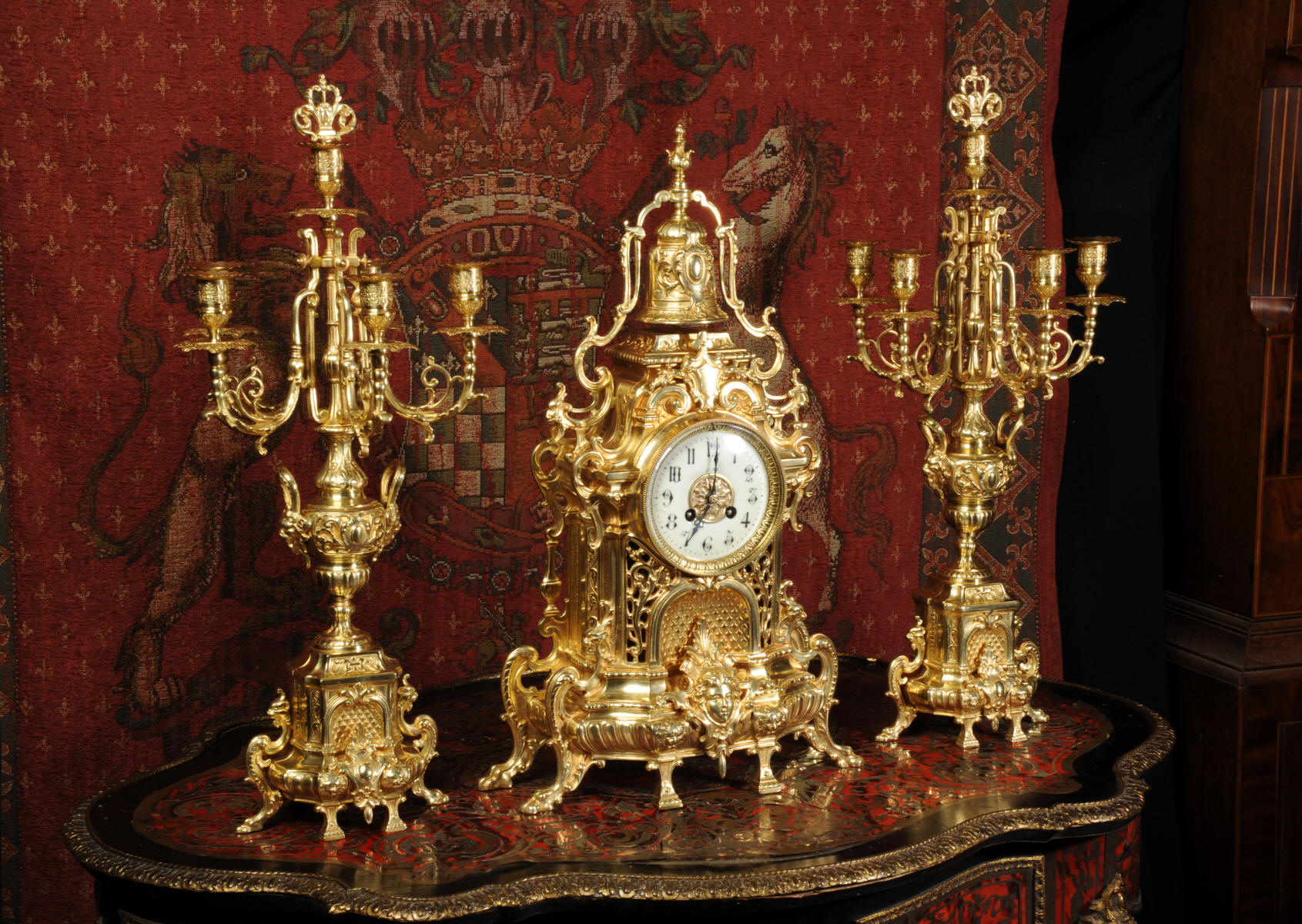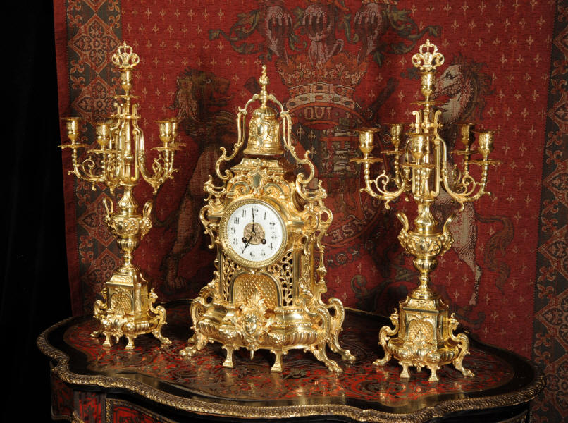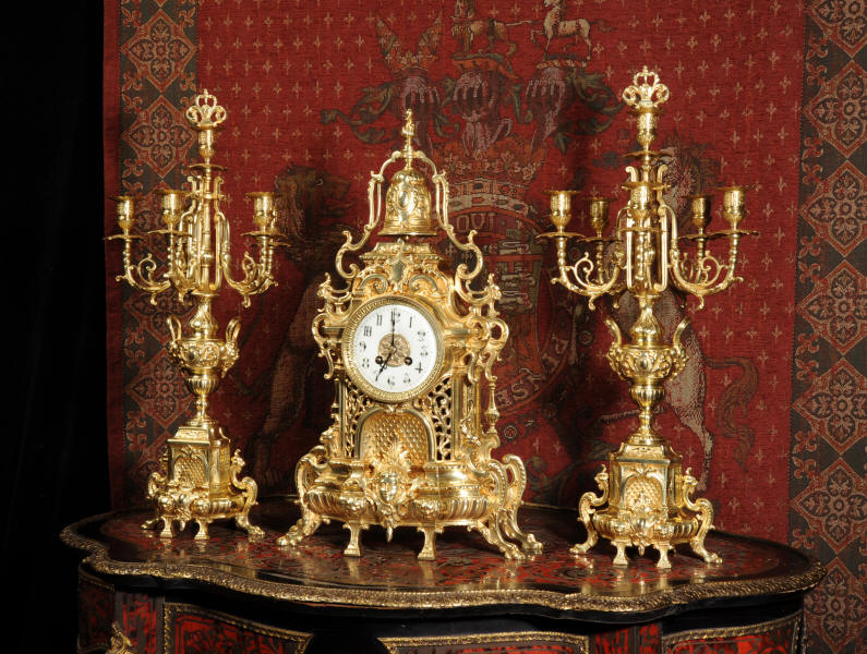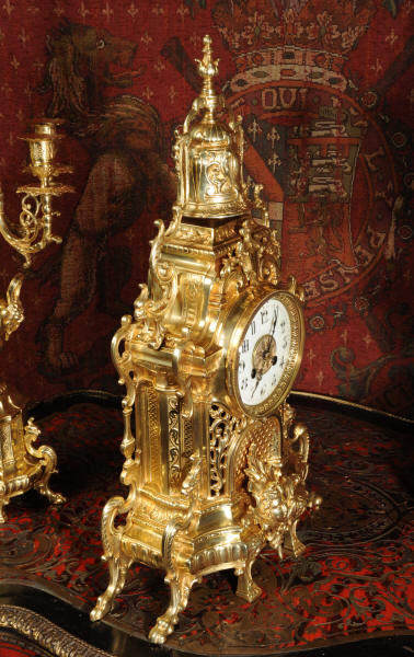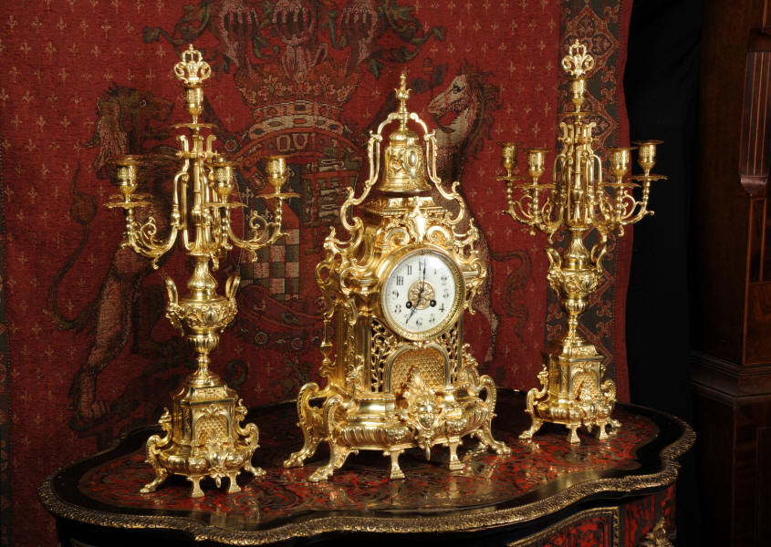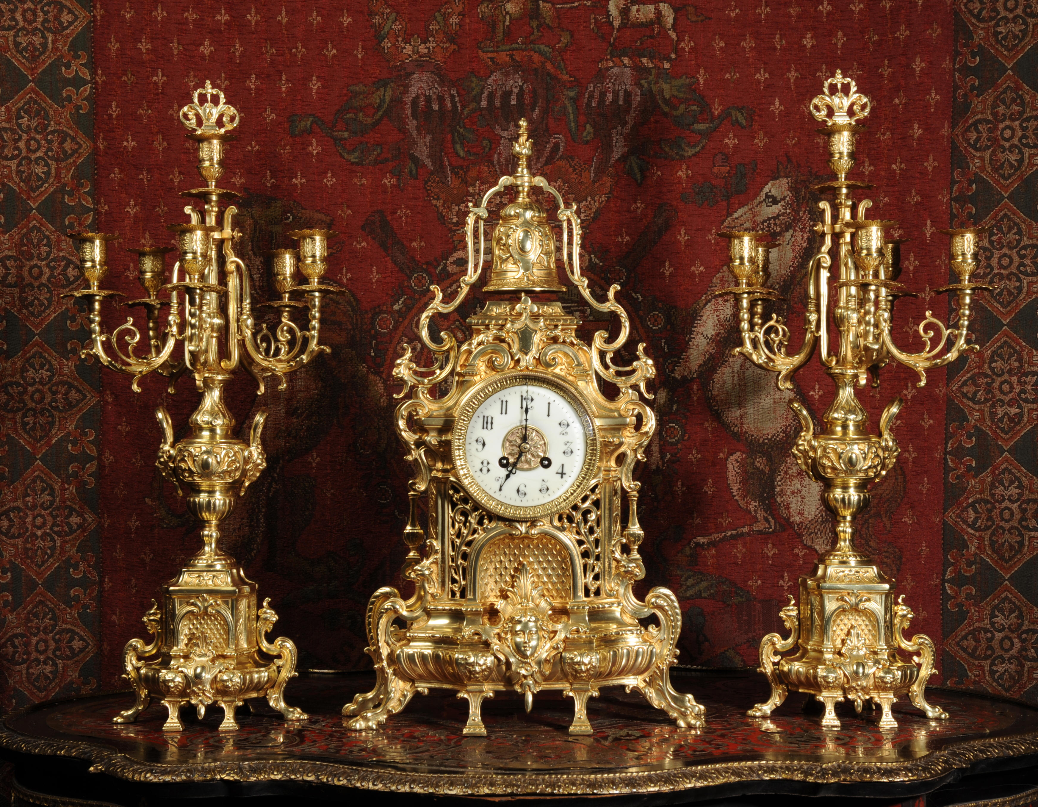 ~ French - Circa 1880 ~ ~~ Excellent condition, fully overhauled and running ~~ A Large and impressive original antique French Gothic clock set, beautifully made in gilt brass, very heavy and crisply modelled and with the original gilding remaining. The style is typically French Gothic, architecturally designed with lions masks, hairy paw feet, flowing foliage and surmounted by a bell. The body of the clock is fretted and modelled as a niche embedded in the overgrown foliage. The pendulum can be glimpsed swinging through the fretwork.