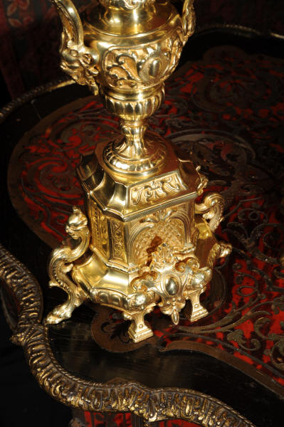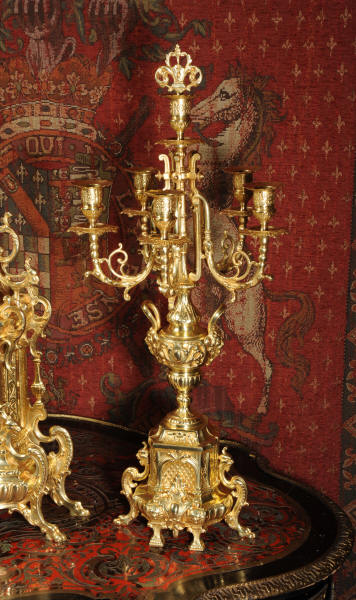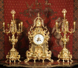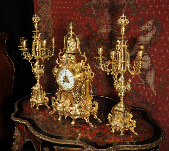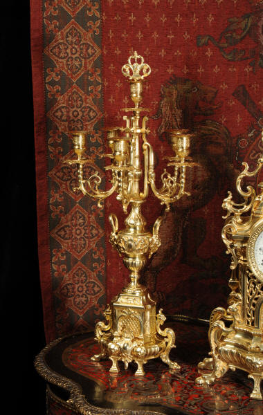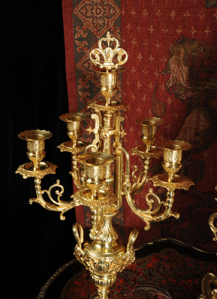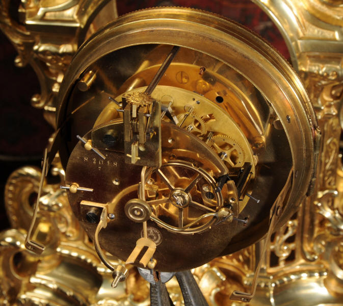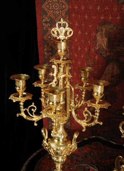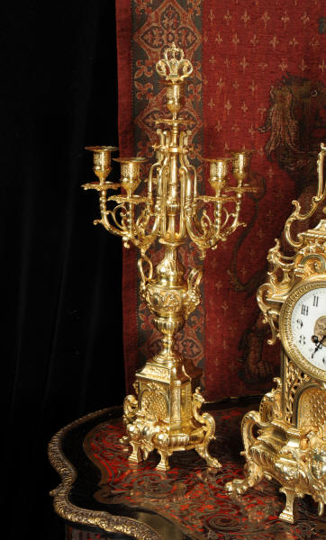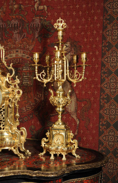 The matching candelabra are 6 light and the bases are modelled to compliment the design of the clock. Original snuffers sit in the central nozzles as finials when not in use. Dial is enamel on copper with a cast brass centre and blued steel hands. The egg and dart bezel is fitted with bevelled convex glass. Antique French movement is by Japy Freres and is of of excellent quality. It runs for 8 days on one wind and strikes half-hourly on a bell. It has been fully restored in our workshop and is on excellent clean and running condition. The pendulum is a replacement. Click the video clip below to see and hear the movement working! Condition of the case is excellent, gilding is bright