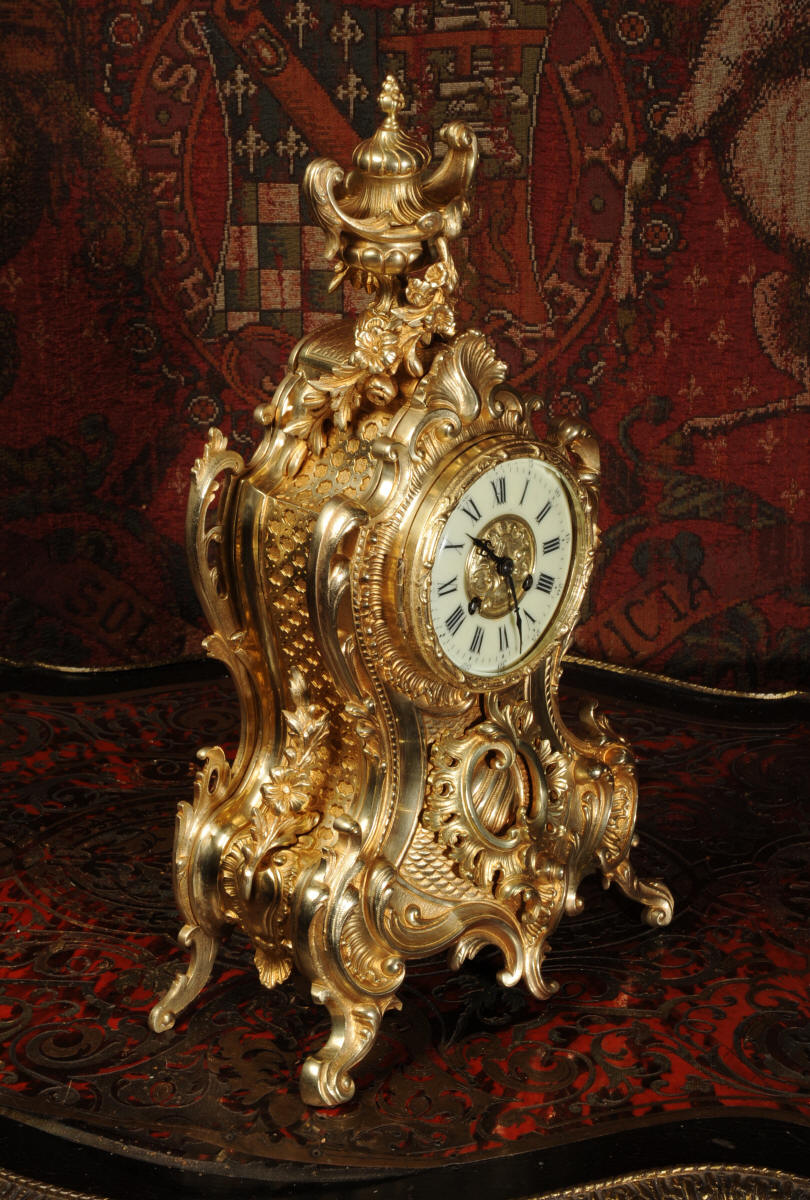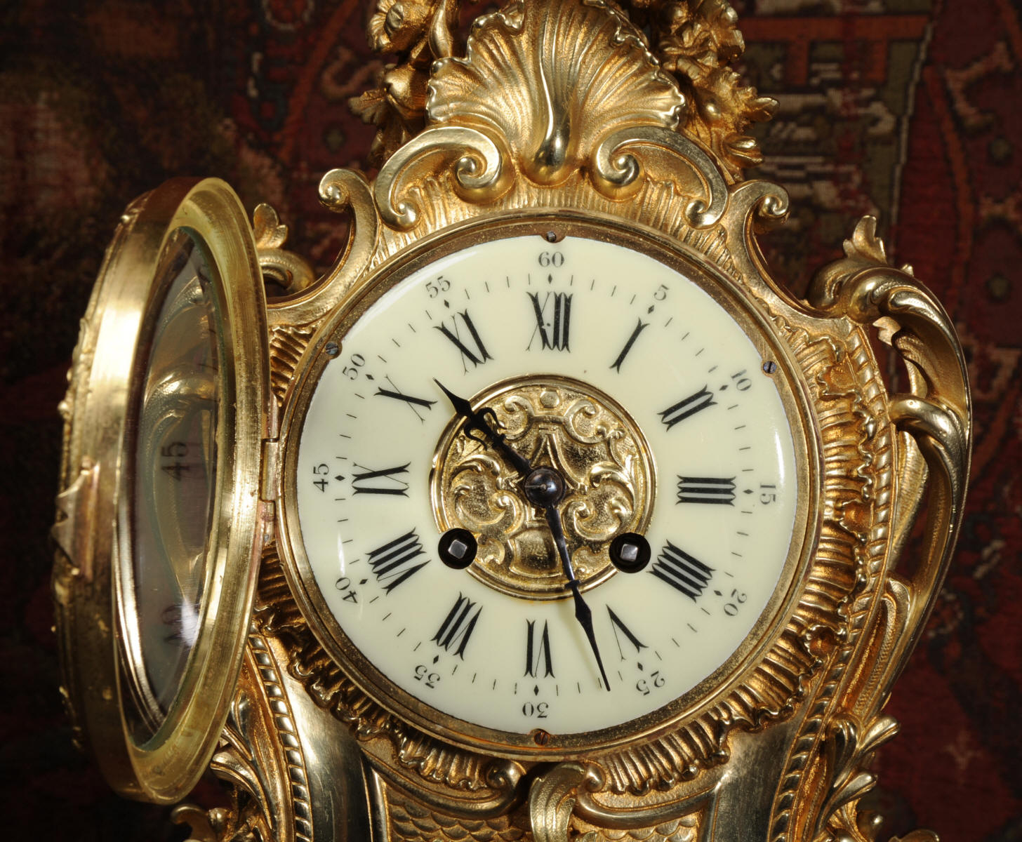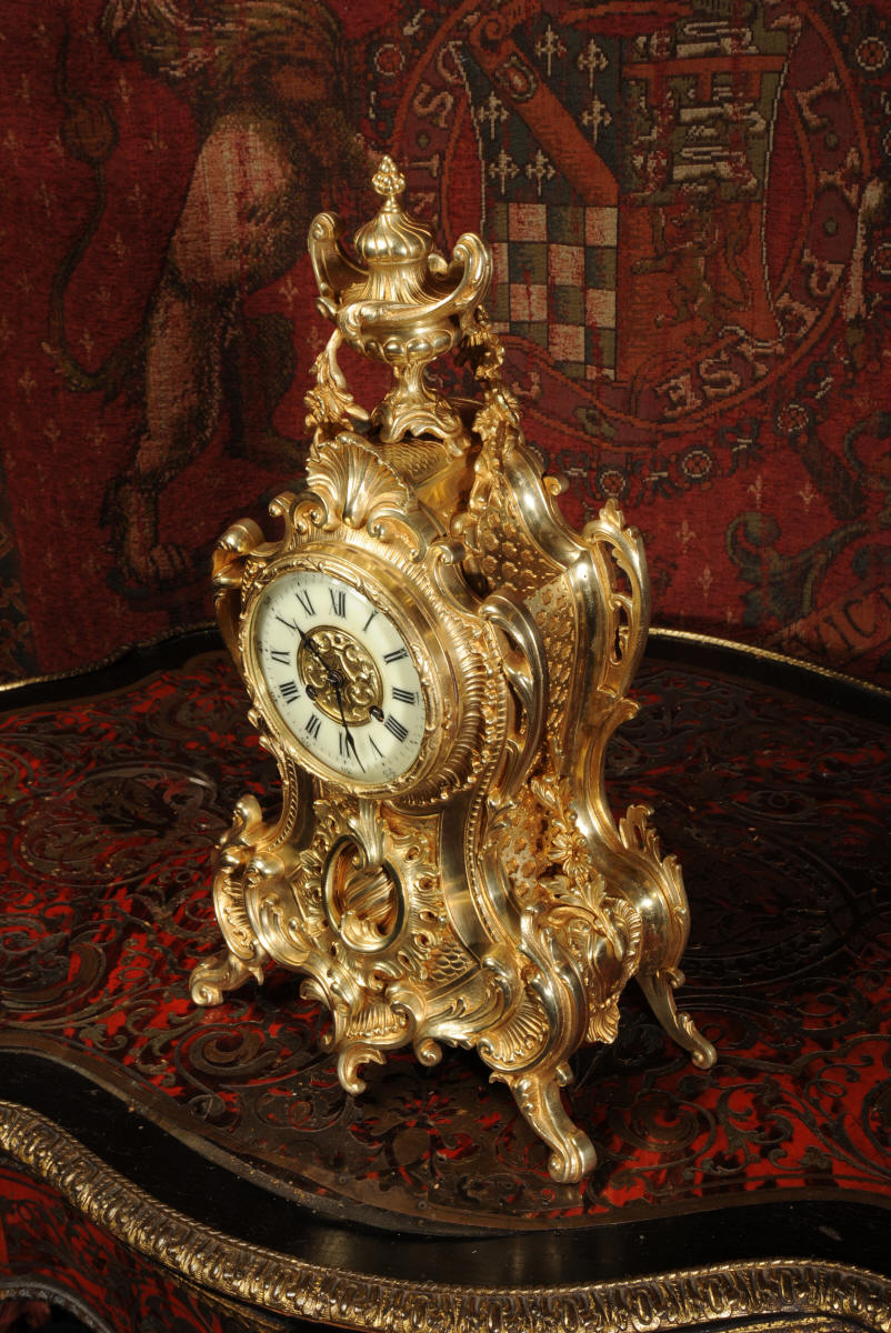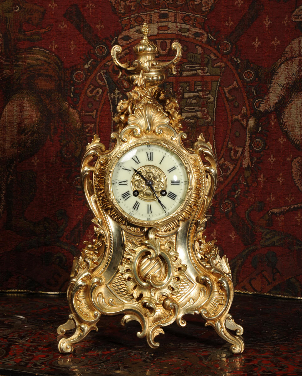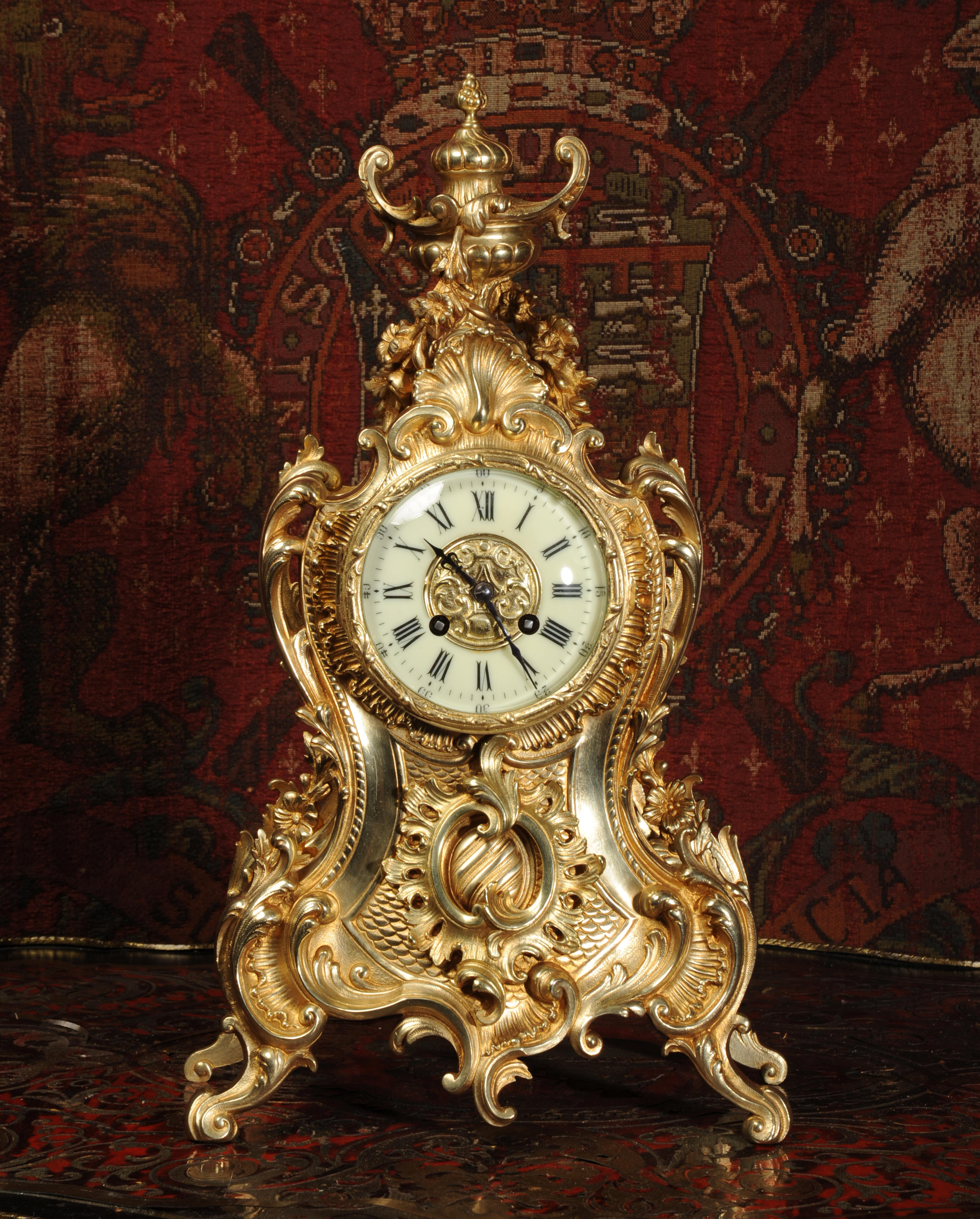~ French - Circa 1880 ~ ~~ Excellent condition, fully overhauled ~~ A stunning Rococo boudoir clock by the well known maker Japy Freres. It is very good quality and beautifully modelled in gilded brass with intricate and well chased detail. The beautiful waisted key hole shape is decorated with acanthus shoulders and bezel, 'C' scrolls and a shell motif. To the top is a large and elaborate urn with trailing foliage. The dial is enamel on copper and has a gilt brass centre and original blued steel hands. The acanthus bezel is fitted with convex bevelled glass. The rear door is glazed with frosted glass. The French movement is by Japy Freres and has the makers mark on the backplate. It is of Japy Freres' usual high quality and is in excellent clean and running condition having been fully overhauled by our clockmaker. Pendulum is a replacement. It runs for 8 days and strikes the hours and halves on a bell. Click the video clip below to hear the bell and watch the clock running! Condition of the case is excellent, the original gilding is beautifully clean and bright with hardly any wear or discolouration and there are no losses. The dial is also in excellent condition with no chips or scratches. There is a small chip to the edge of the original glass, this is hardly noticeable. Displays beautifully as you can see below!