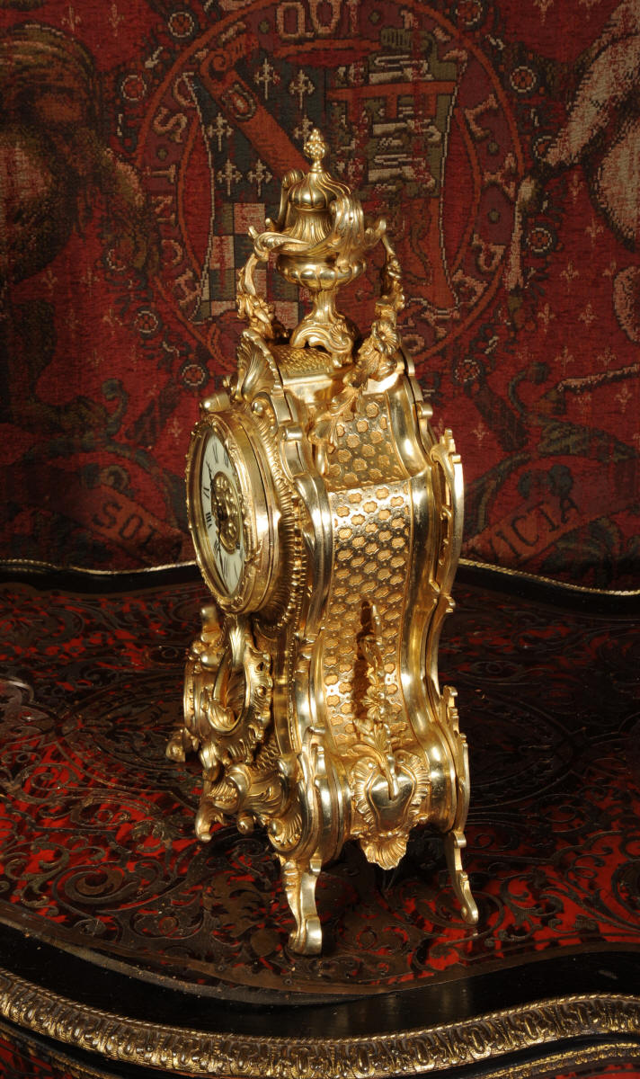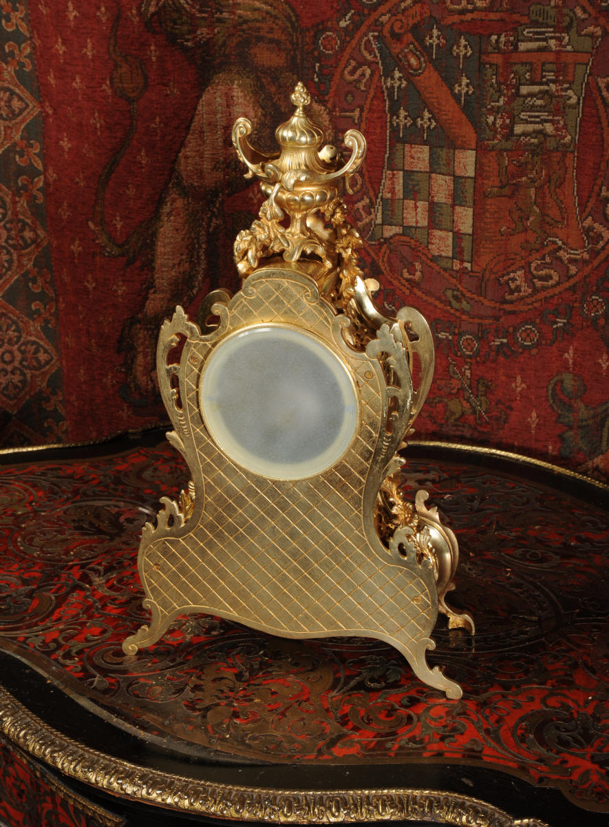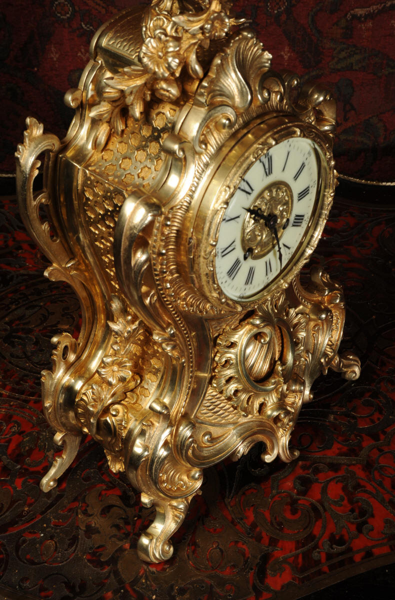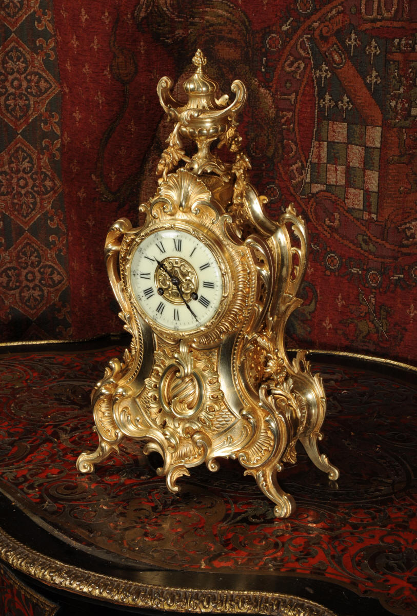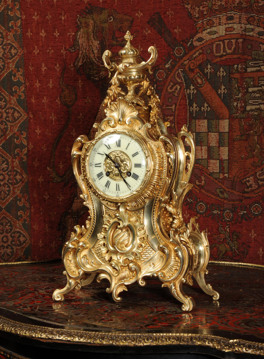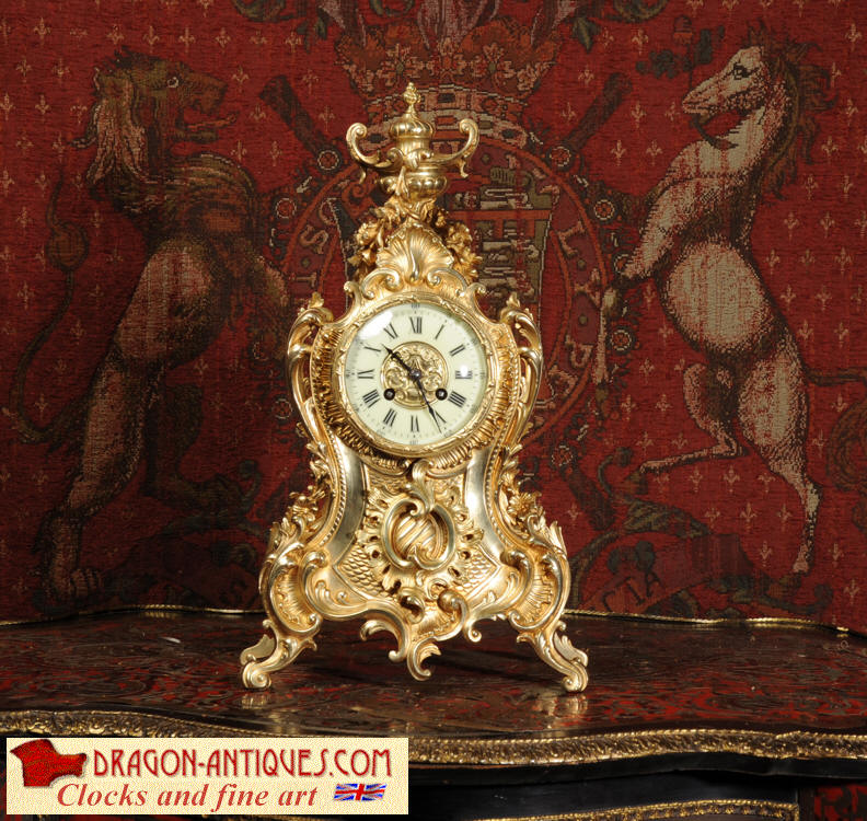 ~ French - Circa 1880 ~ ~~ Excellent condition, fully overhauled ~~ A stunning Rococo boudoir clock by the well known maker Japy Freres. It is very good quality and beautifully modelled in gilded brass with intricate and well chased detail. The beautiful waisted key hole shape is decorated with acanthus shoulders and bezel, 'C' scrolls and a shell motif. To the top is a large and elaborate urn with trailing foliage. The dial is enamel on copper and has a gilt brass centre and original blued steel hands. The acanthus bezel is fitted with convex bevelled glass. The rear door is glazed with frosted glass. The French movement is by Japy Freres and has the makers mark on the backplate. It is of Japy Freres' usual high quality and is in excellent clean and running condition having been fully overhauled by our clockmaker. Pendulum is a replacement. It runs for 8 days and strikes the hours and halves on a bell. Click the video clip below to hear the bell and watch the clock running! Condition of the case is excellent, the original gilding is beautifully clean and bright with hardly any wear or discolouration and there are no losses. The dial is also in excellent condition with no chips or scratches. There is a small chip to the edge of the original glass, this is hardly noticeable. Displays beautifully as you can see below!