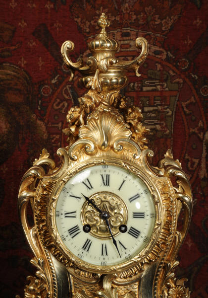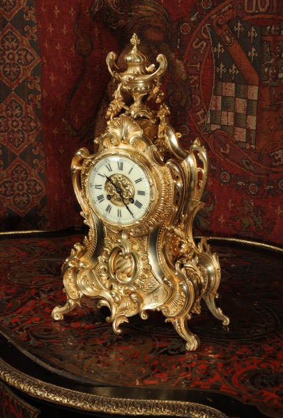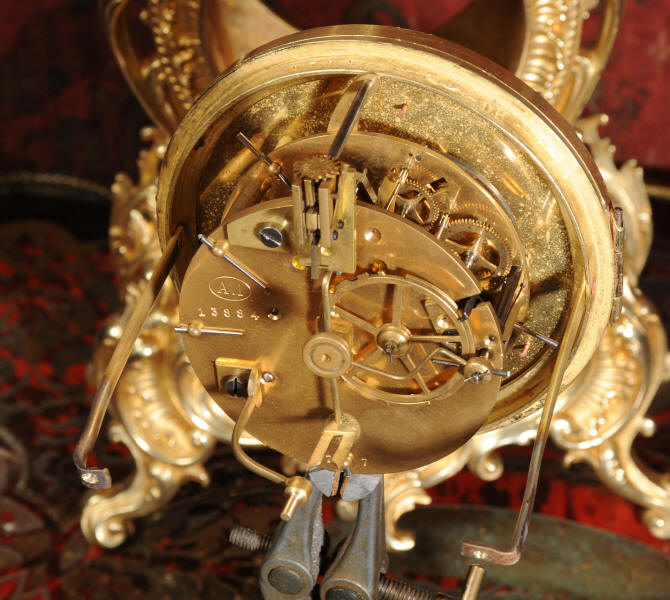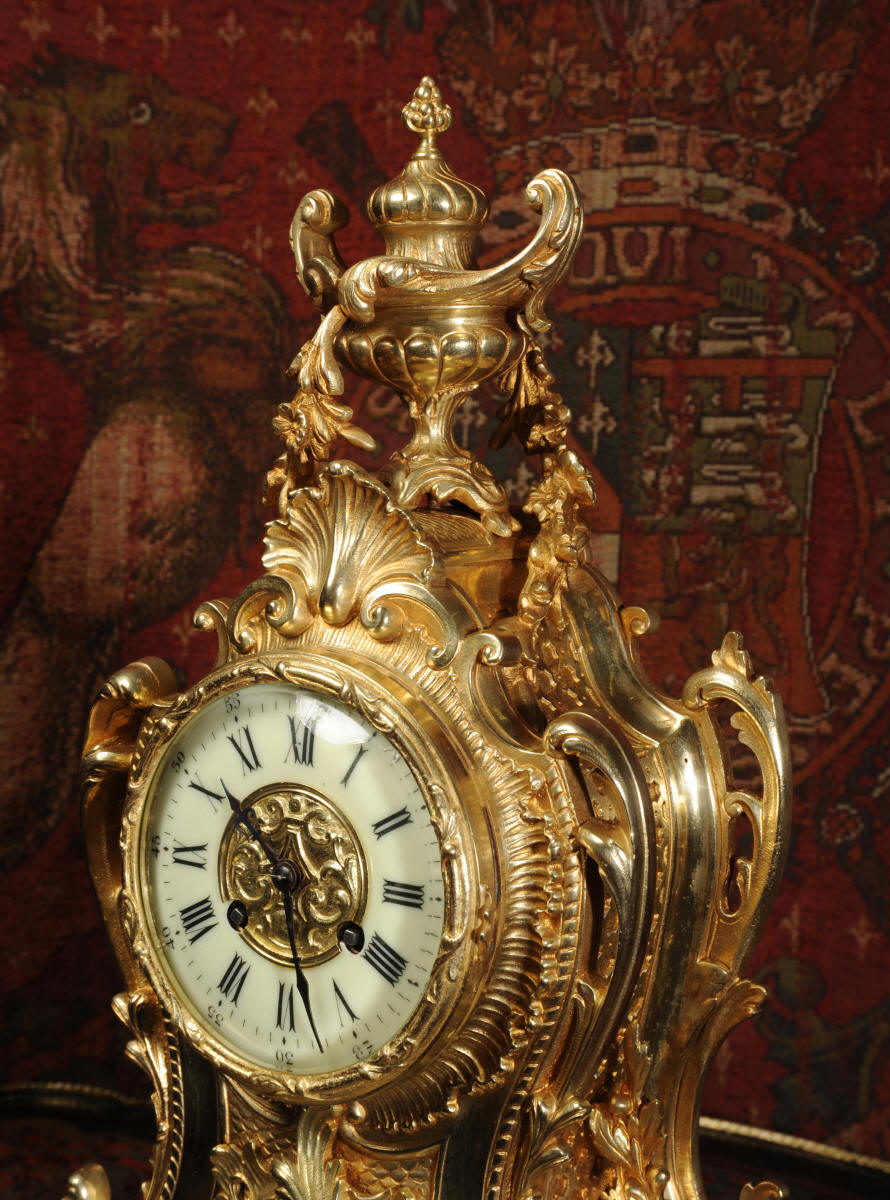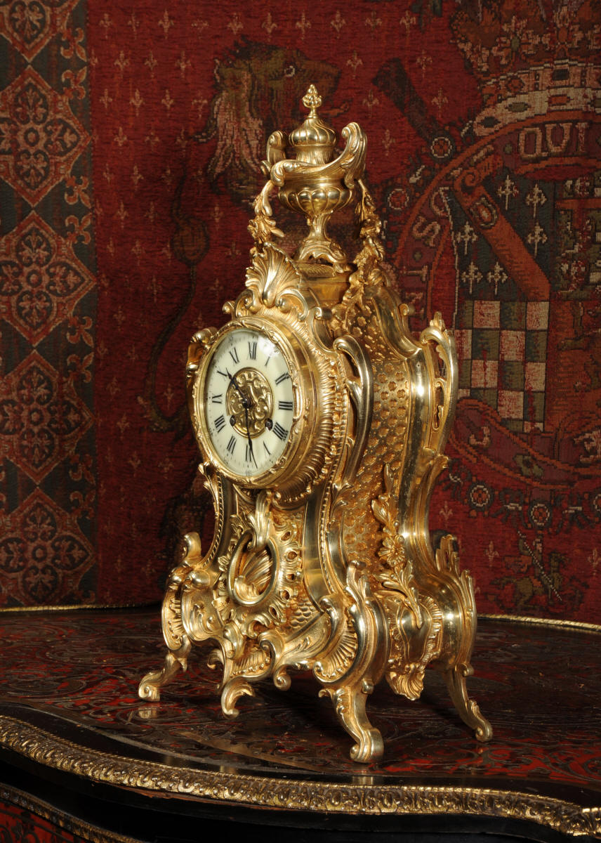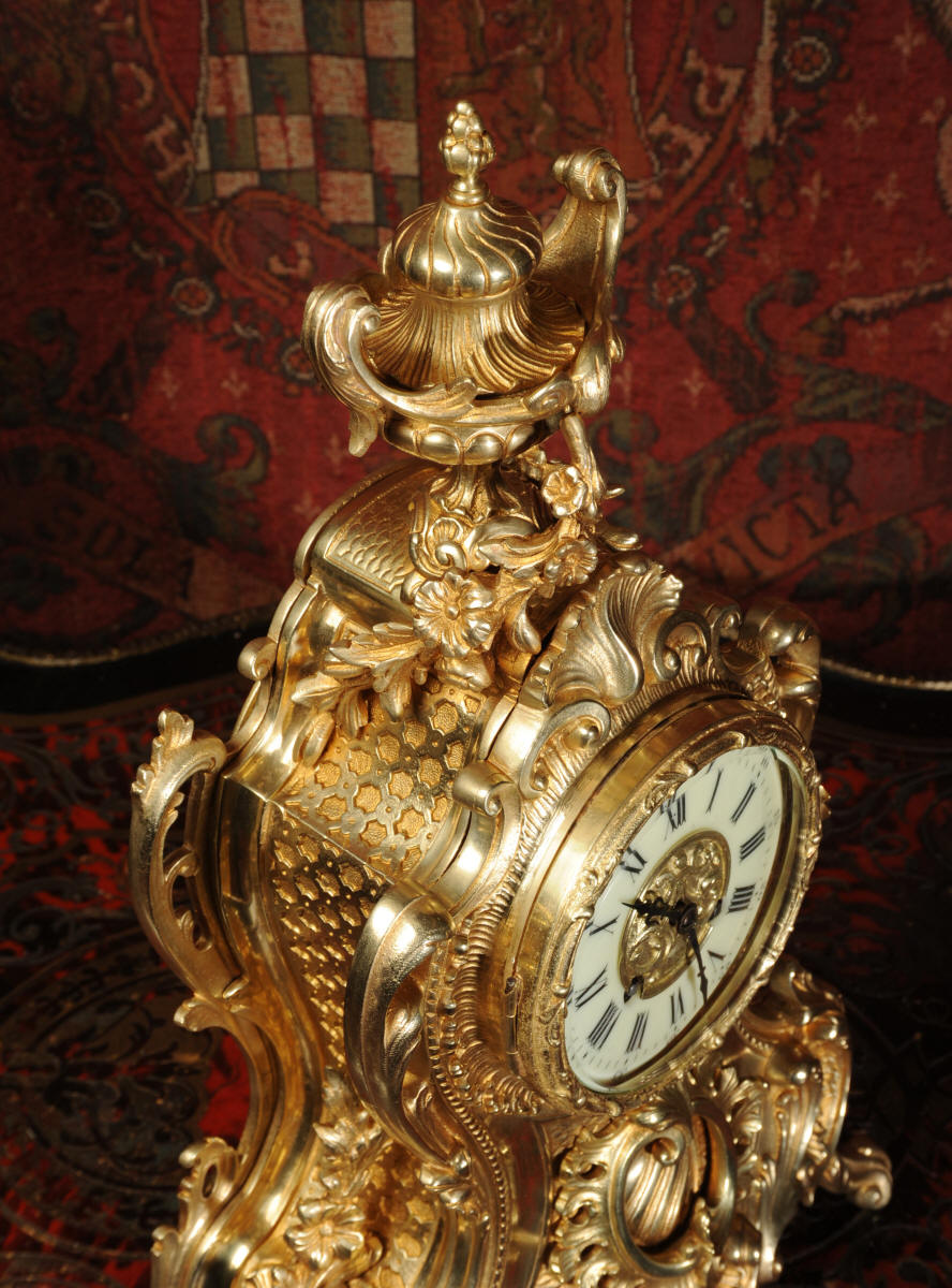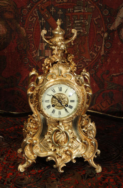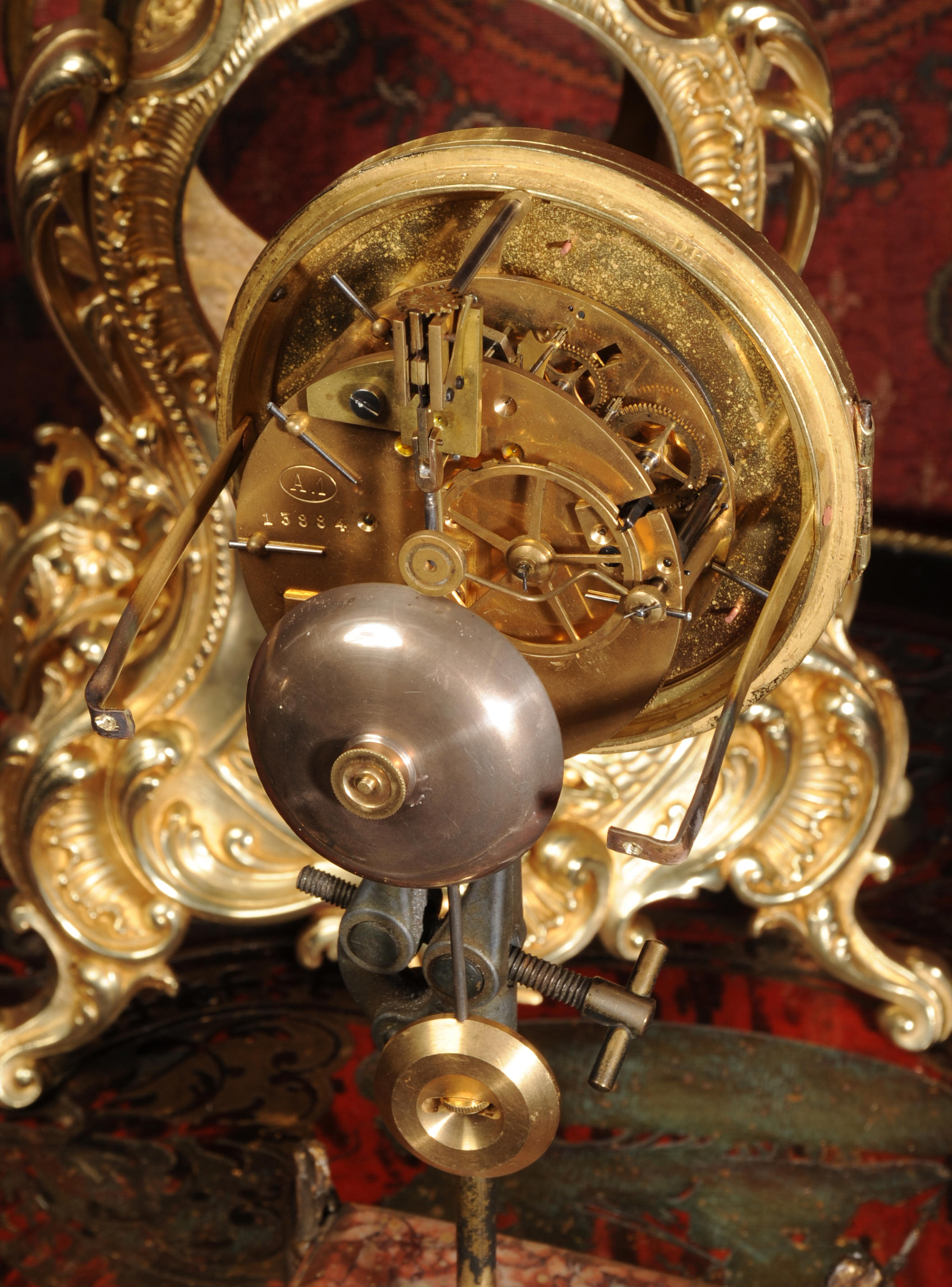 ~ French - Circa 1880 ~ ~~ Excellent condition, fully overhauled ~~ A stunning Rococo boudoir clock by the well known maker Japy Freres. It is very good quality and beautifully modelled in gilded brass with intricate and well chased detail. The beautiful waisted key hole shape is decorated with acanthus shoulders and bezel, 'C' scrolls and a shell motif. To the top is a large and elaborate urn with trailing foliage. The dial is enamel on copper and has a gilt brass centre and original blued steel hands. The acanthus bezel is fitted with convex bevelled glass. The rear door is glazed with frosted glass. The French movement is by Japy Freres and has the makers mark on the backplate. It is of Japy Freres' usual high quality and is in excellent clean and running condition having been fully overhauled by our clockmaker. Pendulum is a replacement. It runs for 8 days and strikes the hours and halves on a bell. Click the video clip below to hear the bell and watch the clock running! Condition of the case is excellent, the original gilding is beautifully clean and bright with hardly any wear or discolouration and there are no losses. The dial is also in excellent condition with no chips or scratches. There is a small chip to the edge of the original glass, this is hardly noticeable. Displays beautifully as you can see below!