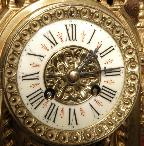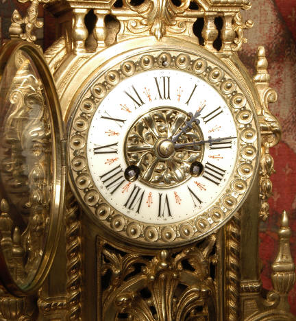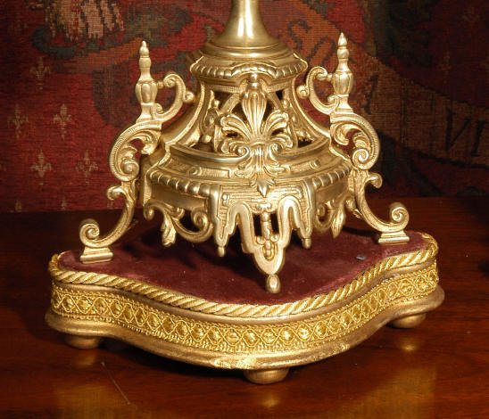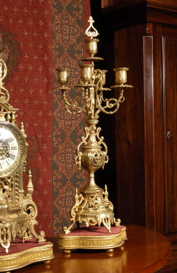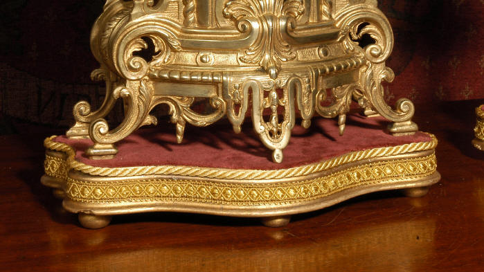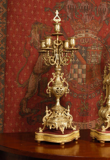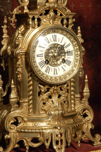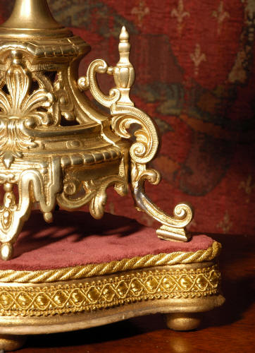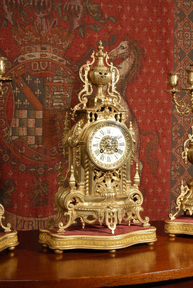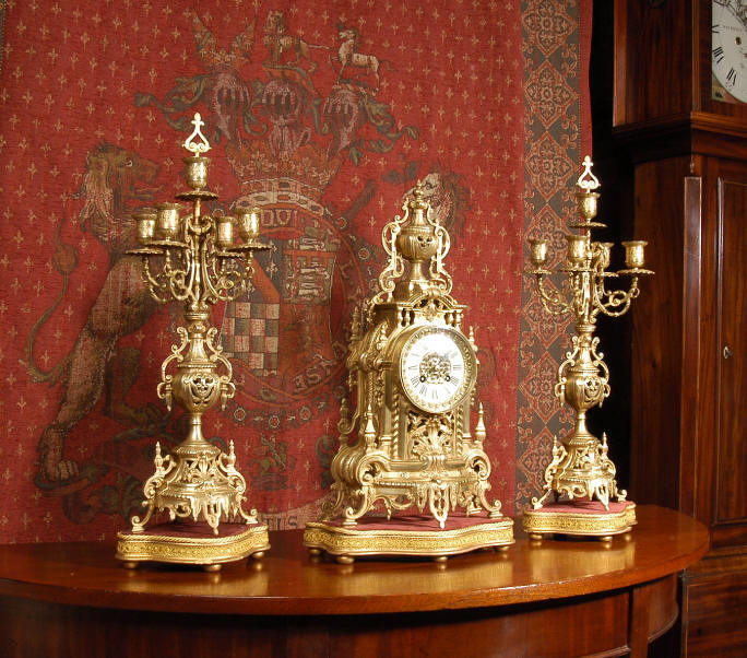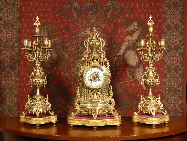 ~ French - Circa 1890 ~ ~~ Excellent condition ~~ A very decorative clock set complete with a suite of original bases. French gothic in style, the case is open fretwork, allowing the pendulum to be seen and is decorated with swags of foliage. The candelabra bases are also open fretwork and the arms are modelled as entangled foliage. They are complete with the original pair of snuffers. The finish of the brass is clean but not over bright. The dial is enamel on copper with original blued steel hands - it has red enamelled half hour markers and a cast brass centre. The high quality S Marti et Cie movement runs for 8 days and strikes on a bell. It is in excellent, clean and running condition. Clock is complete with original pendulum, bell and key. Click here to hear the bell strike! The retailers mark is on the underside of the bases and on the movement back plate, along with the S Marti et Cie makers mark. The finish of the brass is very good - bright and clean. There are some areas of wear or discoloration. Condition of the enamel dial is very good - just a few a light hairline through the 12 o'clock. Condition of the case is very good, no losses or damage except for an old repair to the legs of one candelabra. The candelabra stands correctly although the side legs are slightly distorted and the rear leg has an old repair. The candelabra arms are slightly distorted. We have recovered the bases with velvet and replaced the fabric trim. Dimensions of clock: Height 20 1/2", Width 11 1/2", Depth 5 1/2". Dimensions of candelabra: Height 23", Width 7 1/2", Depth 5 1/4". A very decorative clock set!