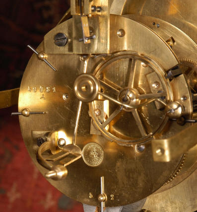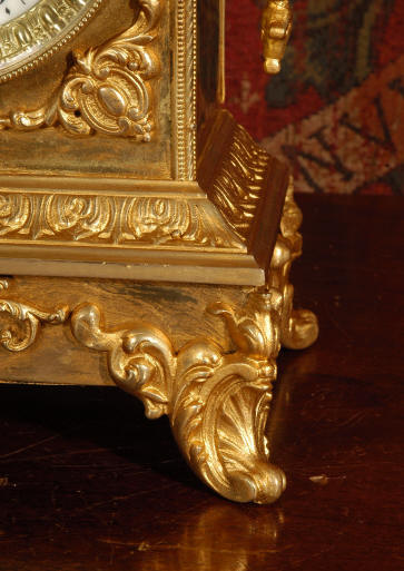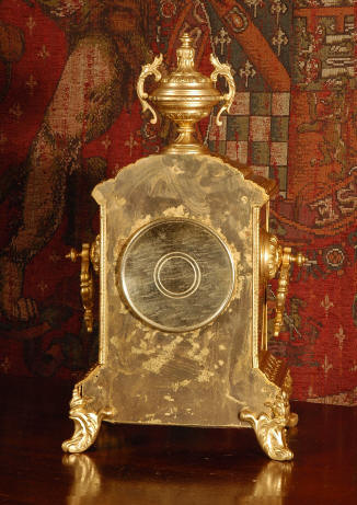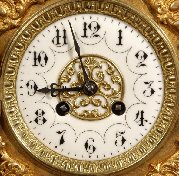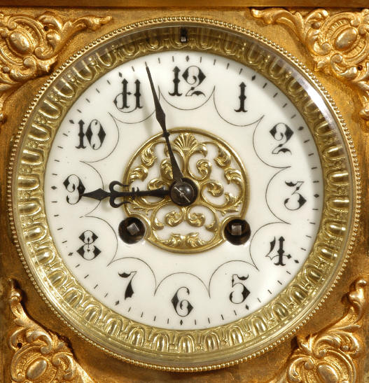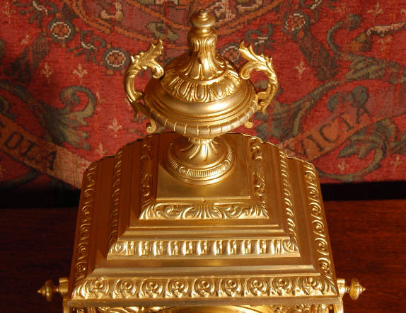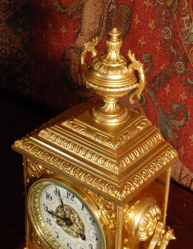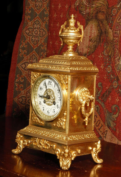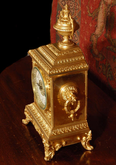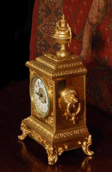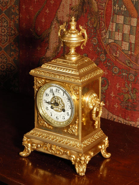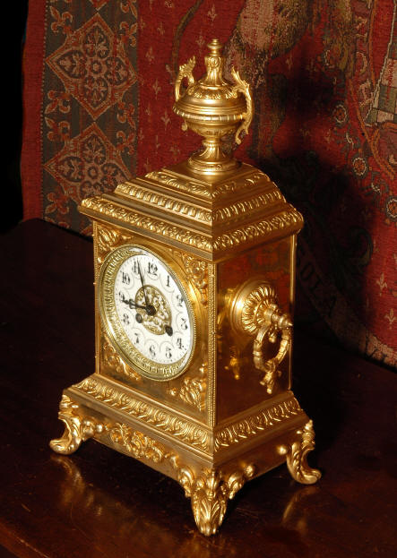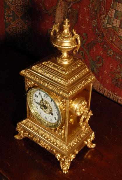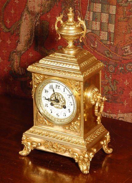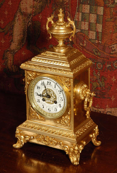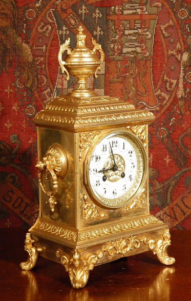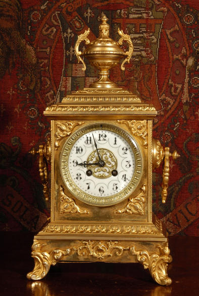 ~ French - Circa 1890 ~ ~~ Excellent condition ~~ A very decorative mantle or table clock by the famous maker Japy Freres. The clock is of classical style with drop handles and surmounted by an urn. The large dial is enamel on copper and has a fretted brass centre, it is complete with the original blued steel hands. The bezel is egg and dart pattern, fitted with bevelled glass. The French Japy Freres movement is of excellent quality and has the makers mark on the movement backplate. It runs for 8 days, strikes on a bell and is in excellent, clean and running condition - it is complete with the original pendulum and bell. it has been fully cleaned and serviced by our clockmaker - click the movie below to see and hear it run! Condition of the case is excellent - there are no losses and the finish of the brass is bright and clean; there is some minor discouloration, tarnish and wear. The enamel dial is in excellent condition with no chips or cracks. A lovely Japy Freres clock ready for your home! Dimensions of clock: Height 16 1/2", Width 8 1/4", Depth 6 1/4".